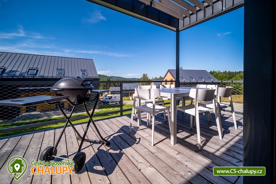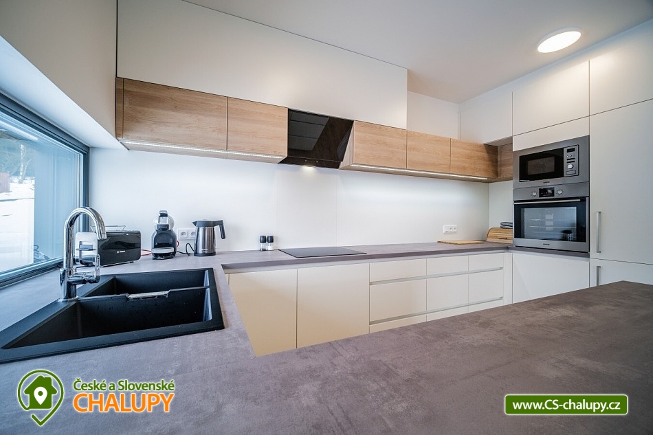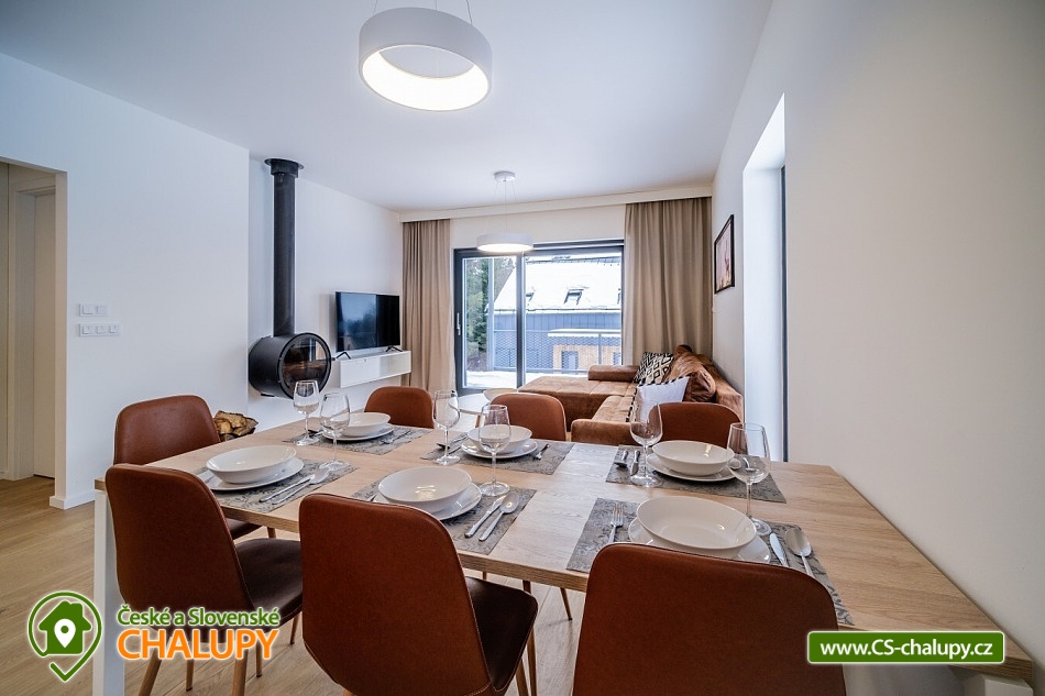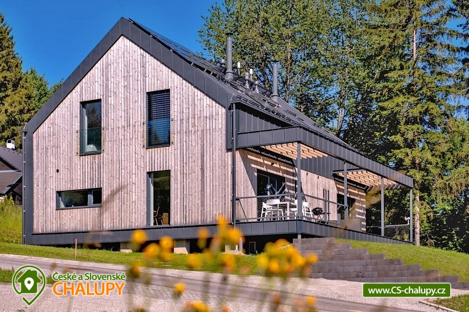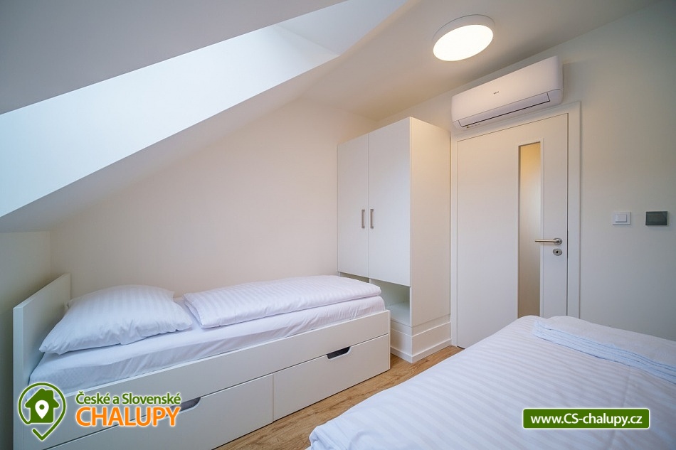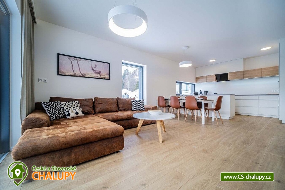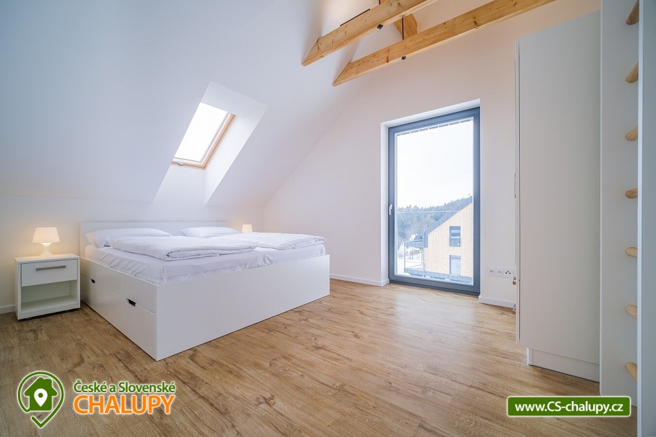 Apartment U Hájenky 429 (half of a semi-detached house) for rent is located in a new passive wooden semi-detached house, has an area of 130 m2 and 4+kk available. The apartment is suitable for 6 adults and up to 4 children on extra beds or with a travel cot for the little ones. Upstairs, three bedrooms are ready for sleeping - two with a double bed and extra beds in the form of pull-out drawers under the bed and one bedroom with two single beds. Downstairs in the living room there is a sofa bed that can serve as another 1.5 bed. If you want to come with a larger group of good friends, you can fit even more thanks to two extra sleeping floors in the upstairs bedrooms, which are suitable for adults and brave people because of the ladder :) Bathrooms and toilets are on each floor. Of course, there is a TV, internet, washing machine with dryer, fully equipped kitchen, but also air conditioning, underfloor heating and window blinds. There are two parking spaces and a storage room for skis and bicycles right next to the house, and you can also charge the electric ones here. The cottage is located near the forest, a minute's walk from the deer park, a 20-minute walk to the tourist center of Lipno nad Vltavou, and if you're not a fan of motoring, it's about a 20-minute walk to the train station. In the vicinity: Cycle paths in the Lipno area and around the water reservoir. Cross-country trails, walks through the forest, the kingdom of the forest for children's amusement and relaxation for parents, and a path through the treetops. Also, Lipno water park and Frymburk water park. They wrote about us - Google review: The house is beautiful and the location is great. If you have children, the top is the deer park practically behind the house. With a three-year capart, you can walk comfortably to the kingdom of the forest and to the trail. I praise the equipment of the kitchen, where there is absolutely everything, including glasses for wine and bubbles. The place is just perfect. I don't know what else I could wish for, the location, facilities and equipment were simply top notch. The children were enchanted by the deer in the nature reserve, which can be seen from the upper floors. The forest above the field is like something from a fairy tale. Access to the bike path around Lipno, but also along the contour to the cable car and bobovka, is absolutely optimal. And the shops like Chleba se soli or Povidloň confectionary are simply super goodies. With the children, we only had a half-hour walk to the path through the crowns of the trees and the kingdom of the forest, or to the cable car. We are very satisfied. Thank you!