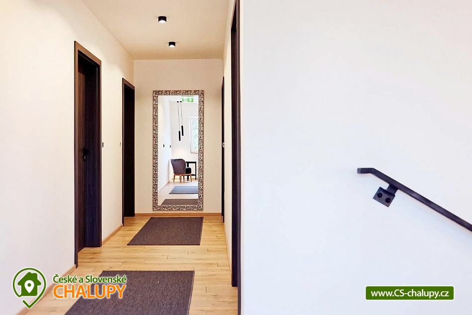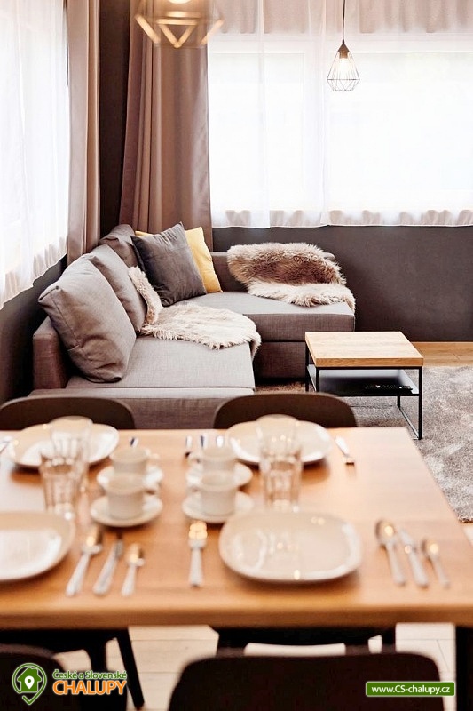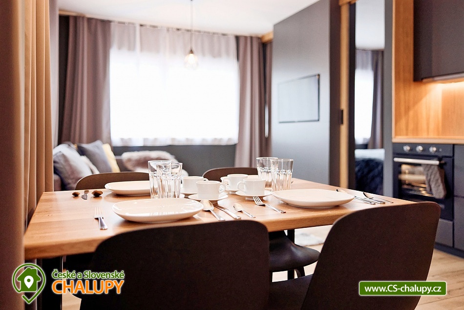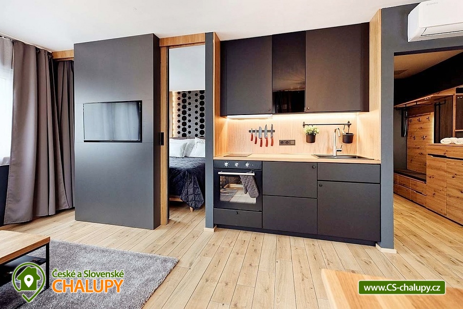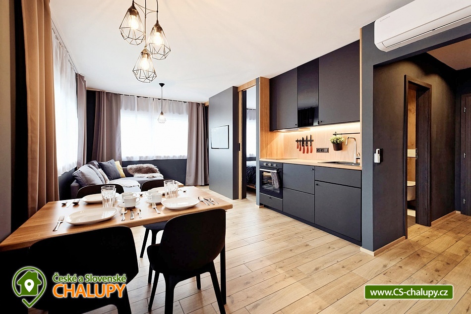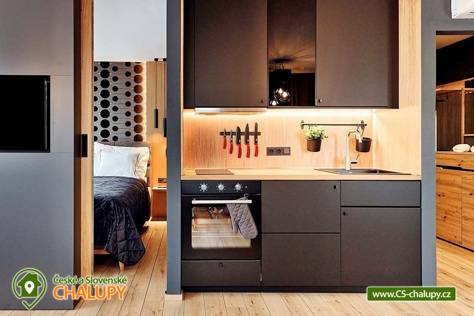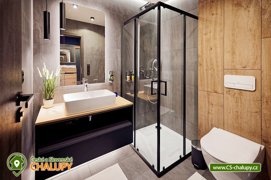 Luxury apartment Volavka with wellness - Hlinsko is located in the heart of Žďárské vrchy, near the center of Hlinsko. A modern apartment with a private wellness area and its own cinema is rented as a whole, always for one family or group of people in two apartment units. The total capacity of the apartment is 8 people. Each unit offers a double bedroom with a TV, a living room with a sofa bed for 2 people and a TV, an equipped kitchen (dishes, fridge, freezer, kettle, dishwasher, hob and oven) and a spacious bathroom with a sink, shower and toilet. Possibility to rent a baby cot. There is a private cinema room with an equipped bar and another bathroom with a shower and toilet, right in the apartment. Comfortable seats, a huge screen, a wide range of films of all genres and professional 7.1 Dolby Atmos sound. Before or after the screening, you can have refreshments in the adjacent equipped bar with a tap, a Nespresso coffee machine and also a professional popcorn machine. A private wellness center right in the apartment, just a few steps from your rooms, will ensure perfect relaxation. You can warm up in the Jacuzzi Sasha Finnish sauna or the steam bath, and then cool down pleasantly under the experience shower with several modes. After the sauna ceremonies, you can relax on a luxurious relaxation bed or perhaps in the Jacuzzi with a glass of something good. The entire building is air-conditioned and heated with underfloor heating. Wi-Fi connection available. Parking possible directly at the building for 2-4 cars. In front of the apartment there is a sitting area with a grill and a fireplace. The town of Hlinsko is the center of the Hlinecko microregion, which lies on the border of two protected landscape areas - Žďárské vrchy and Železná hory. Cycling, hiking, golf, tennis, skiing and swimming are available in the surrounding area. Tips for trips: Peklo Čertovina, open-air museum on Veselé Kopec, Nine Rocks, lookout tower Borůvka u Hluboká, Toulovcovy maštale, Vojtěchovská lookout tower, open-air museum Betlém, Municipal Museum and Hlinsko gallery. Swimming options: Biotope Hlinsko, Hlinsko pool, Srní quarry, Jasné Pole - Rybník Januš. Nearby ski resorts: Hlinsko, Trhová Kamenice, Hluboká and Svratka. We look forward to seeing you here.