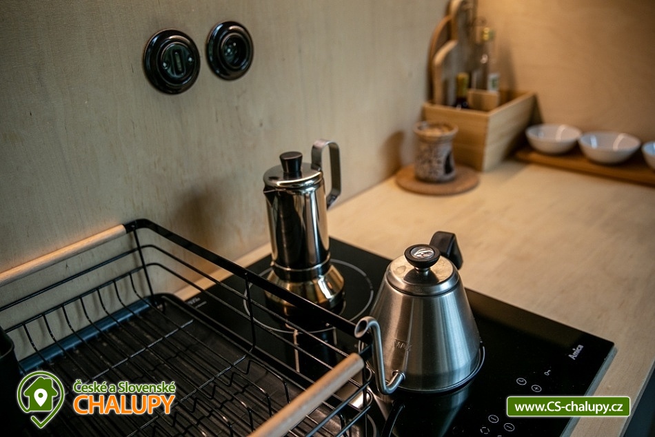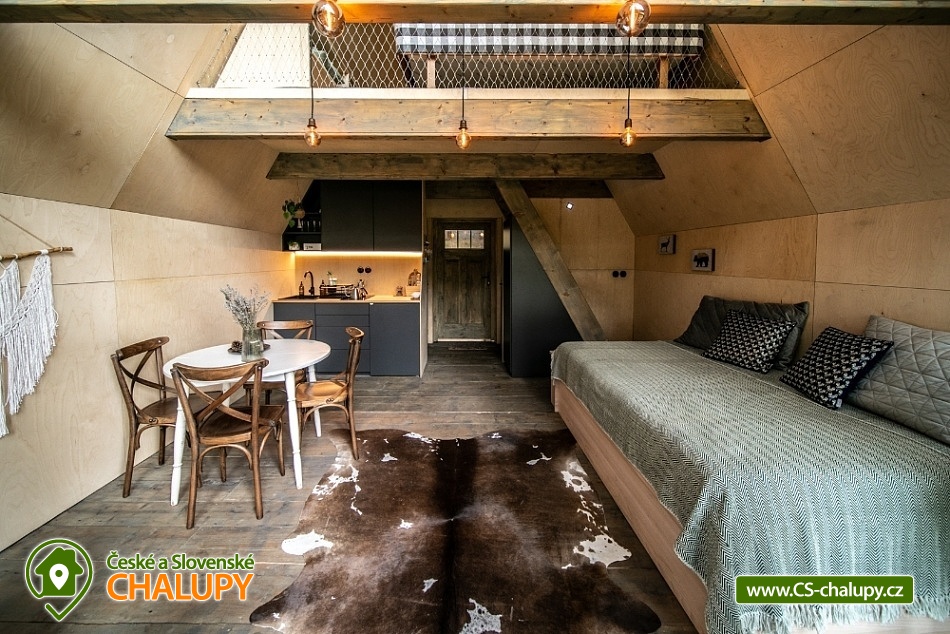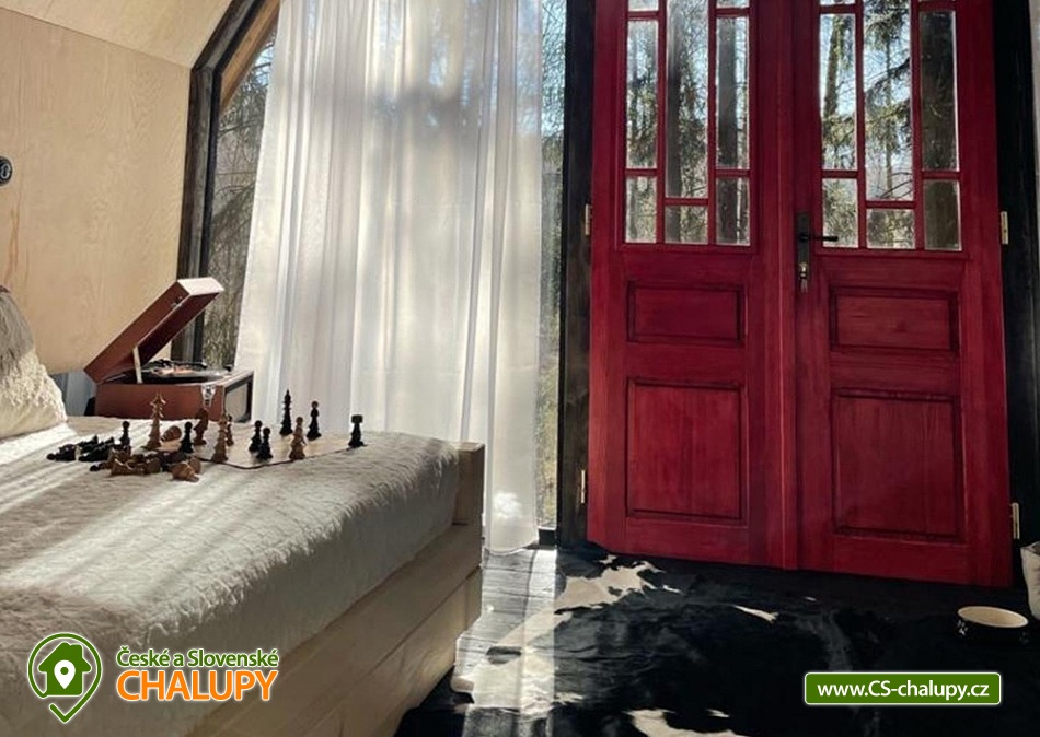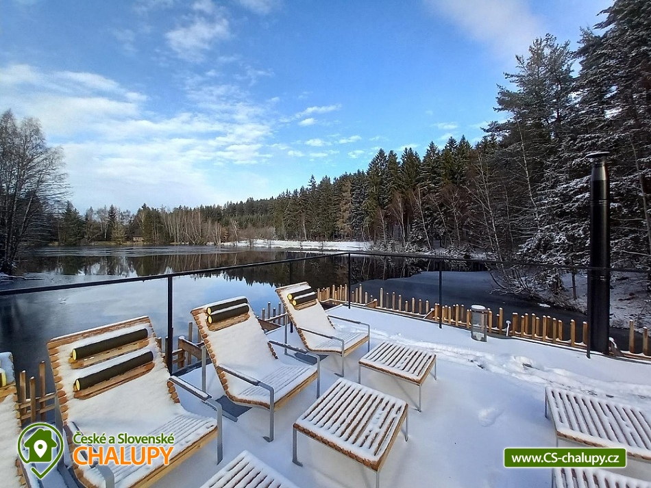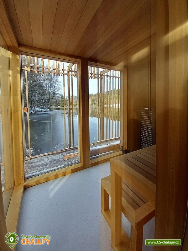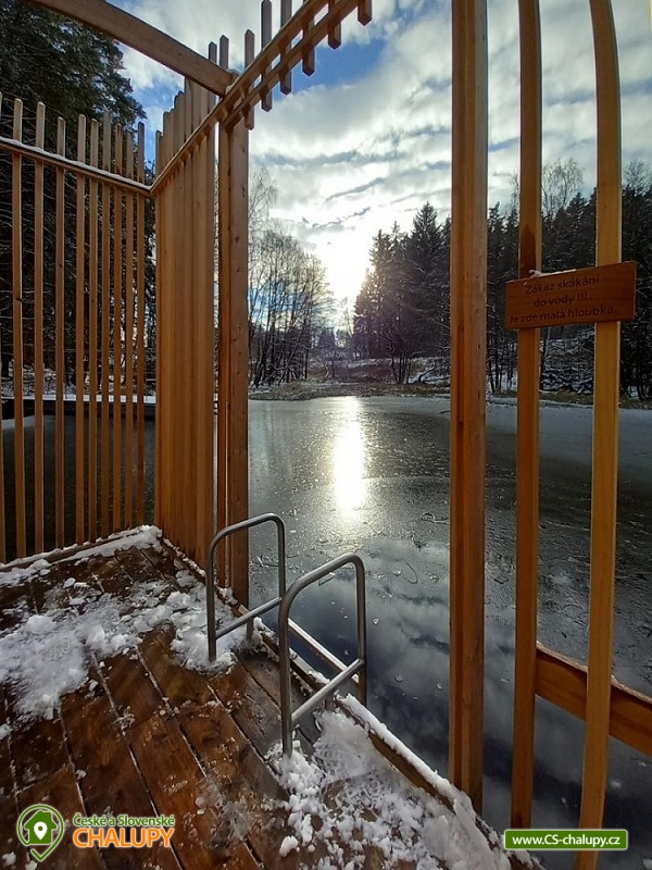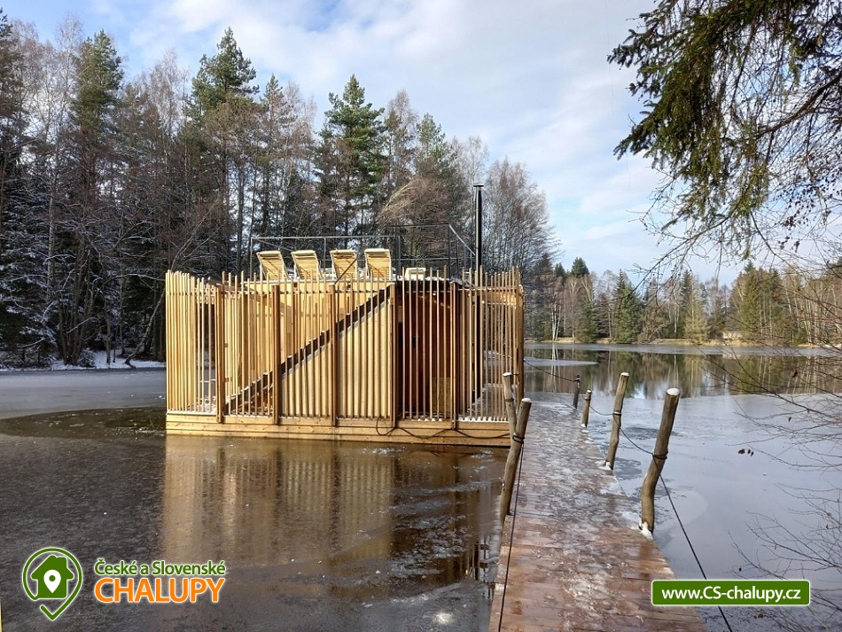Hygge and Lykke cottages - Hotel Kouty - Ledeč nad Sázavou - heated hot tub and sauna. In the middle of the woods, on the edge of the pond, under the picturesque peak of Melechov, there are 2 cabins for rent in the area of Hotel Kouty: Hygge and Lykke cabins. There are 4 beds available in each cabin: a Hastens double bed on the first floor, a private bathroom and a kitchenette on the ground floor. Each cabin is heated by direct heaters and in the bathroom by floor heating. The fireplace and crackling fire will warm the cottage and weary travelers in any weather. Stretch out on a cowhide, pour yourself a glass of wine or hot cocoa, read your favorite book and watch the snow fall through the large windows. The interior of the cottage was designed with love. One hundred and fifty-year-old floorboards give the atmosphere of old times, and the new perfect bed, on the other hand, will spoil you even in the middle of nature. Try to imagine yourself sitting by a roaring fire and looking up at the sky full of stars. If you'd rather not stargaze from the Cedar Bath Tub, each cabin has its own. In the cabin you will also find a record player and several gramophone records. We have prepared breakfast for you with delivery right to the cottage. Let yourself be pampered from the morning, we will bring you breakfast until bed. When you wake up, you will have a breakfast basket placed in front of the door, which we will fill with fresh and tasty dishes. The view of peaceful nature adds a spiritual charge to everything. Inspiration and energy fall directly on you. There are many options where to go in the vicinity. Our friendly staff will be happy to advise you. The cherry on top of the entire area is the cedar sauna right on the pond. Two tennis courts with an artificial surface, a children's playground, a trampoline, a beach volleyball court, a gym and ping-pong are fully available on the hotel grounds. A few hundred meters from the hotel, in the village of Kouty, there is a private fishing area - the Homole pond. Here you can catch trout, carp, pike perch or catfish.