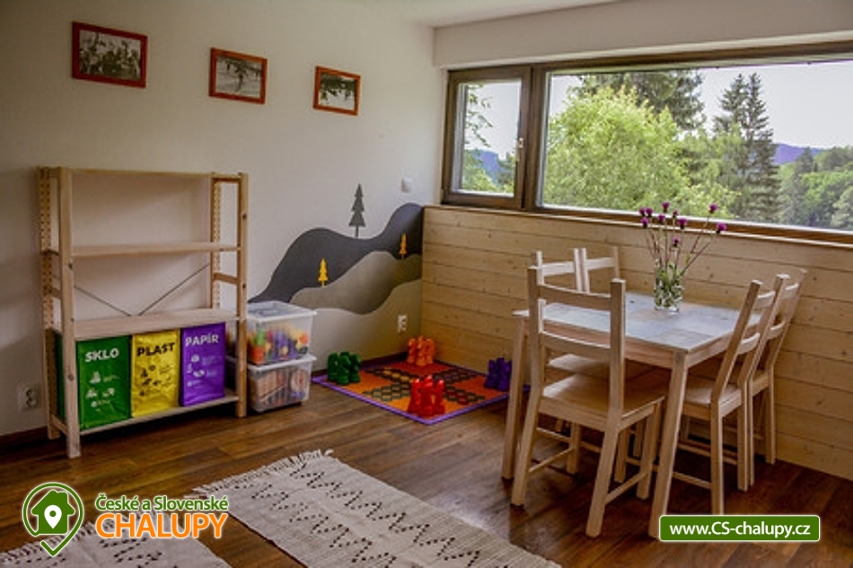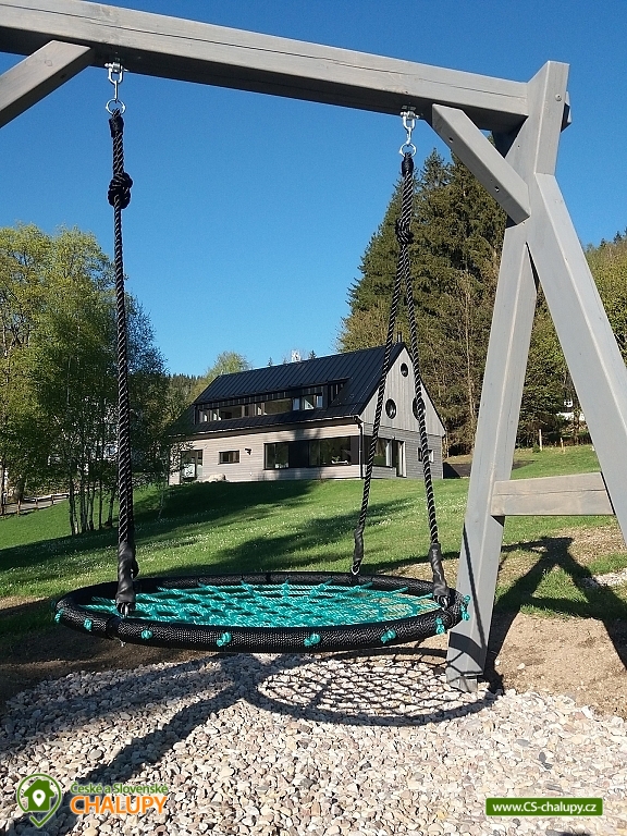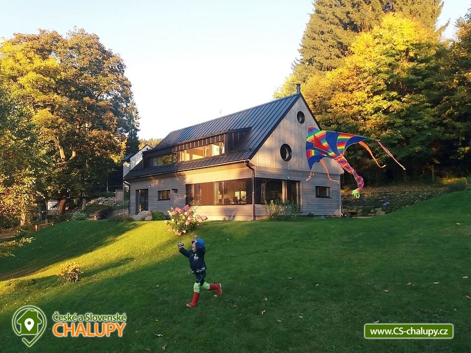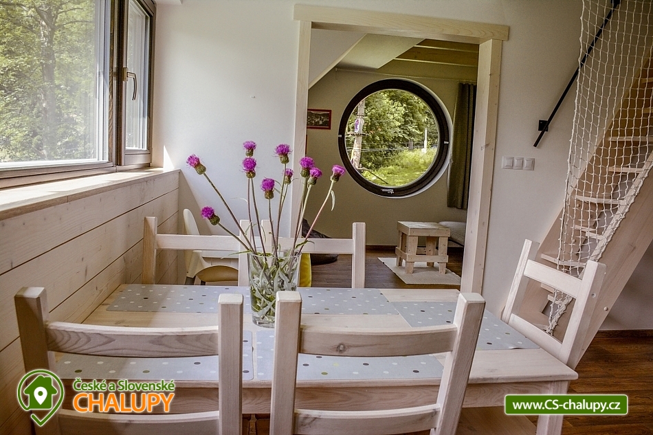 Dřevostavba v Jizerských horách v obci Janov nad Nisou na Malém Semerinku se nachází chalupa Jonáš. Dřevostavba je nepřehlédnutelná díky kulatým oknům. V moderním interiéru se nacházejí 2 apartmány, dětský koutek, sauna a lyžárna. Každý z apartmánů disponuje obývacím pokojem, oddělenou ložnicí, plně vybaveným kuchyňským koutem a koupelnou. Parkování přímo u domu. K dispozici je velká zahrada s vyžitím pro malé i velké. DOLNÍ APARTMÁN - kapacita až 6 osob: obývací pokoj s TV a rozkládací pohovkou, oddělený kuchyňský kout s jídelním stolem (myčka vč. mycích tablet, mikrovlnná trouba, indukční varná deska, trouba Remoska, lednice s mrazákem, rychlovarná konvice, kávovar na tablety Dolce Gusto, toastovač, sendvičovač a nádobí), samostatná ložnice, koupelna s WC a bezbariérovým sprchovým koutem, lůžkoviny, ručníky i utěrky jsou k dispozici, přímý vstup na zahradu, podlahové vytápění s vlastním termostatem, elektrické venkovní žaluzie. HORNÍ APARTMÁN - kapacita až 7 osob: obývací pokoj s TV a rozkládací pohovkou, oddělený kuchyňský kout s jídelním stolem (myčka vč. mycích tablet, mikrovlnná trouba, indukční varná deska, trouba Remoska, lednice s mrazákem, rychlovarná konvice, kávovar na tablety Dolce Gusto, toastovač, sendvičovač a nádobí), mezonetové uspořádání - ložnice v patře (schodiště zabezpečeno dveřmi), samostatný dětský koutek. Koupelna s WC a bezbariérovým sprchovým koutem. Lůžkoviny, ručníky i utěrky jsou k dispozici, podlahové vytápění s vlastním termostatem, elektrické venkovní žaluzie. Bezplatné wifi k dispozici v celém objektu. Pro chvíle odpočinku nejen v zimních měsících nabízíme finskou saunu s odpočívárnou pro až 4 osoby. Pro děti - dětský koutek s množstvím hraček a knížek. Dále dětská postýlka, jídelní židlička, dětské nádobí, nočník, stupátko, dětské záchodové prkénko, vanička, krosnička na záda - to vše vám rádi zapůjčíme zdarma. K dispozici lyžárna s vysoušeči bot přímo v domě. Pro běžkaře kopyto na úpravu lyží. Samostatná kolárna nabízí dostatek místa pro vaše kola a ostatní sportovní vybavení. Velká zahrada s pískovištěm, trampolínou, houpačkou, dětským dřevěným domečkem, plochou na fotbálek, odrážedly a dalším vyžitím pro malé i velké. K dispozici ohniště. V zimě bobování u domu. Boby i sáňky vám rádi zapůjčíme. Dům Jonáš se nachází v blízkosti hlavních turistických a cyklistických tras. V zimním období je možné sjezdové lyžování v nedalekém areálu Severák v Hraběticích, kde se i pro běžkaře nachází nástupní místo na Jizerskou magistrálu. V létě doporučujeme bobovou dráha v Janově nad Nisou, rozhlednu Královka a velké dětské hřiště, lanový park Bedřichov a horskou osadu Jizerka.