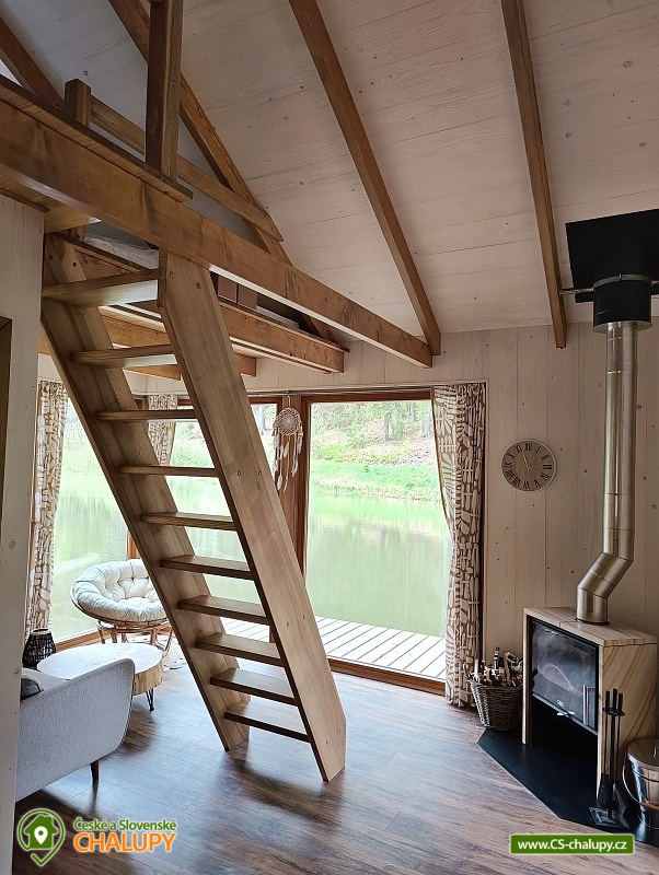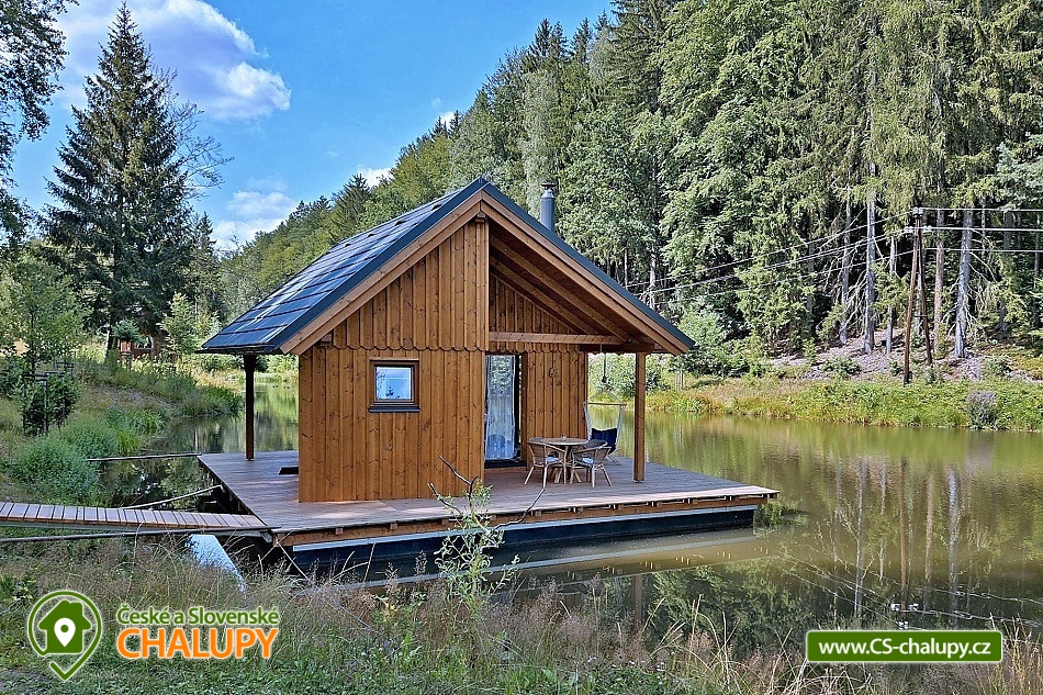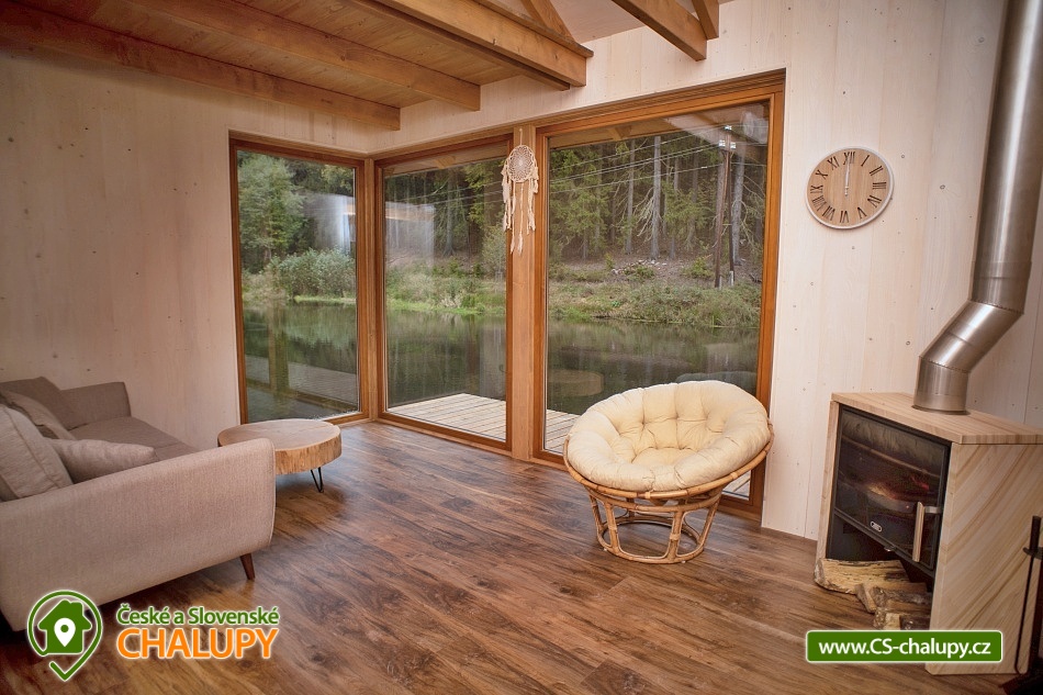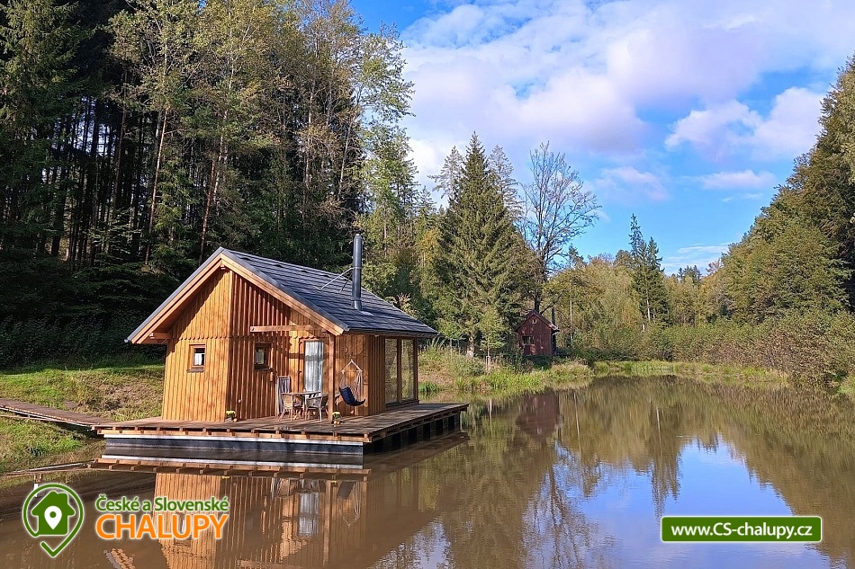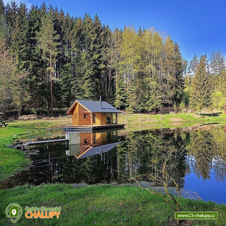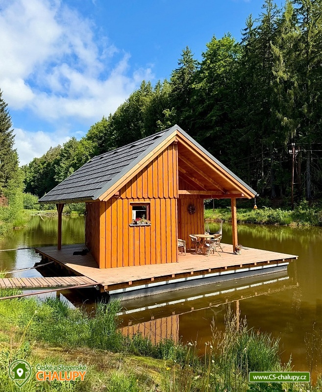 Glamping Cottage on the water surrounded by forest is located on the surface of a small pond in the small village of Štikov near the town of Nová Paka. The cottage is part of the Rybníčky Štikov area, where two other cottages are located - Chata Ztracenka (no. 7C-168) and Chata Pod bukem (no. 7C-170). In the nearby area, you can walk to the Novopacky waterfalls or visit the Pecka Castle. Catch and Release fishing is allowed throughout the stay. Chata Na vode (28 m²) offers comfortable glamping accommodation for 4 people, in total there is 1x double bed and 2x extra beds suitable for children due to their size (approx. up to 160 cm). In the ground floor of the cottage there is a living room with a fireplace, a sofa set, a dining table and a fully equipped kitchen (fridge, electric double cooker, microwave and kettle). Thanks to the panoramic windows, you can enjoy a beautiful view of the water surface and the surrounding nature. Stairs lead from the living room to the attic, where there is a large double bed and two extra beds for children. Bed linen is available. The social facilities include one separate bathroom with toilet. The water brought to the cabin is only useful. It is necessary to have your own towels and bath towels. Heating is provided by fireplace stoves. You can sit outside on the terrace adjoining the cottage. A hanging rocking chair is available for relaxation. The cabin also has its own fireplace. Roasting forks are ready to borrow. You can park directly in the area approx. 50 m from the cottage. In the vicinity of the building, hiking, cycling, swimming, mushroom picking, skiing and cross-country skiing are possible. There are tennis courts and a bowling alley nearby. Swimming options include, for example: Pecka swimming pool, Fařina - Nová Paka pond, Rumchalpa - Nová Paka quarry, Jahodnice water reservoir, Lužany - Marešák pond, Bělohrad Spa - Pardoubek pond, Hlíza pond, Šárovcova Lhota swimming pool, etc. ski resorts: Máchovka, Pecka or Karas - Mezihoří. Kumburk Castle, Jičín - the city of fairy tales, Prachovské skály, Les Králové Reservoir, Trosky Castle Ruins or ZOO Dvur Králové nad Labem are alluring for trips in the area. We look forward to seeing you here.