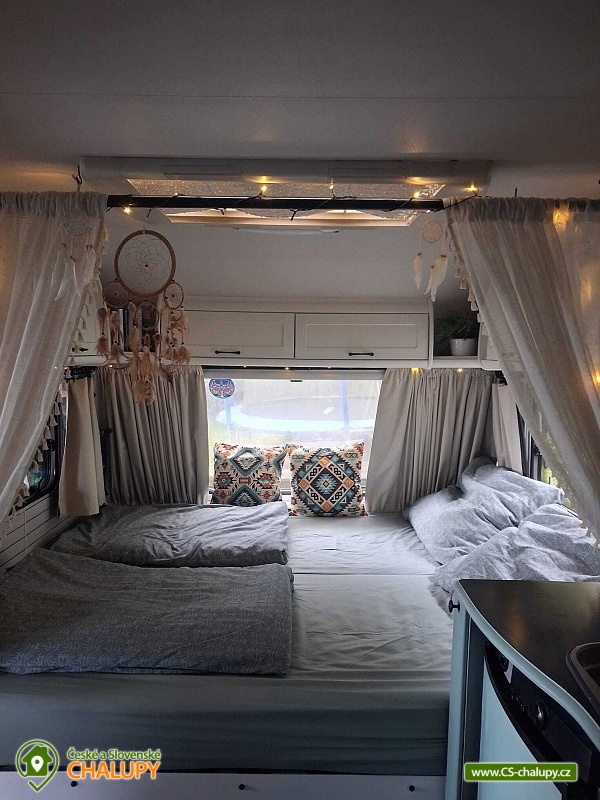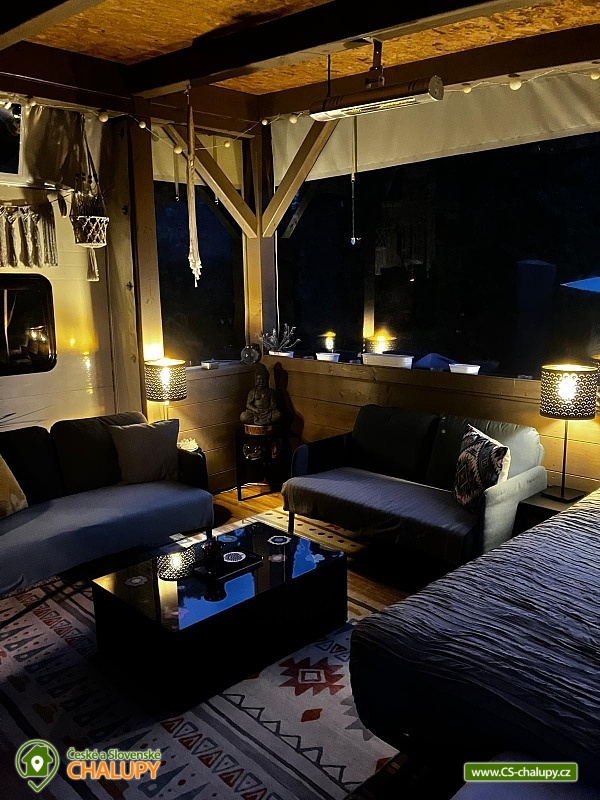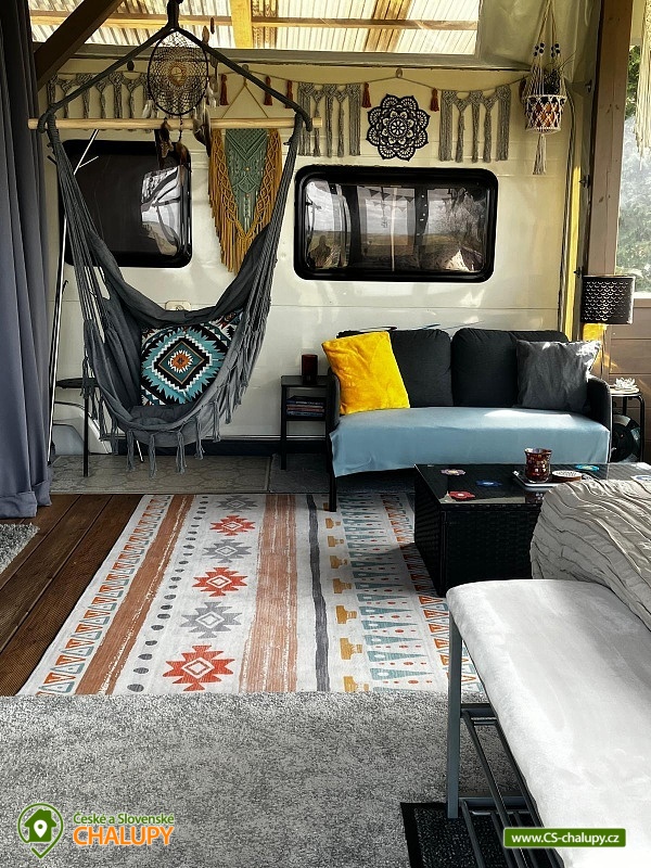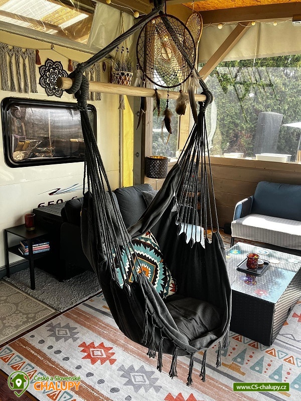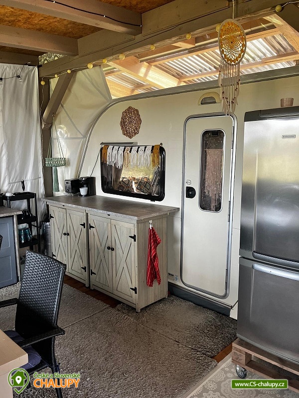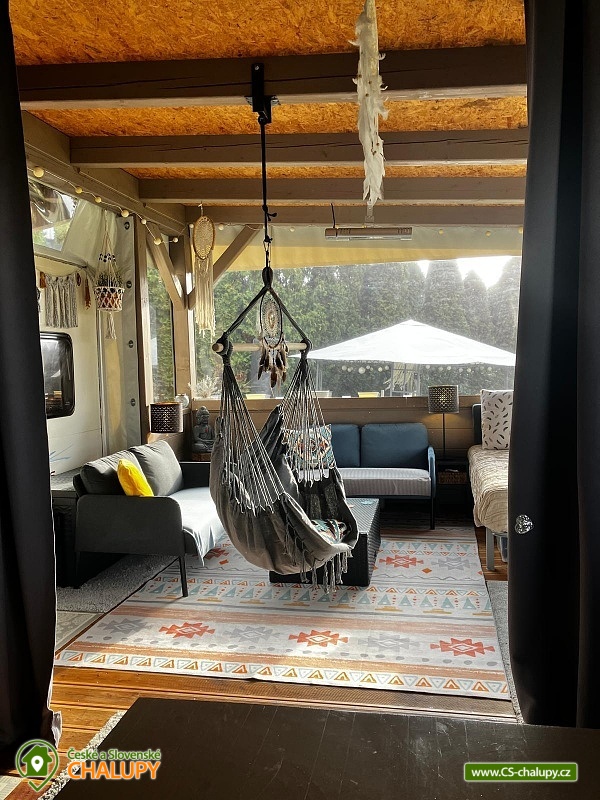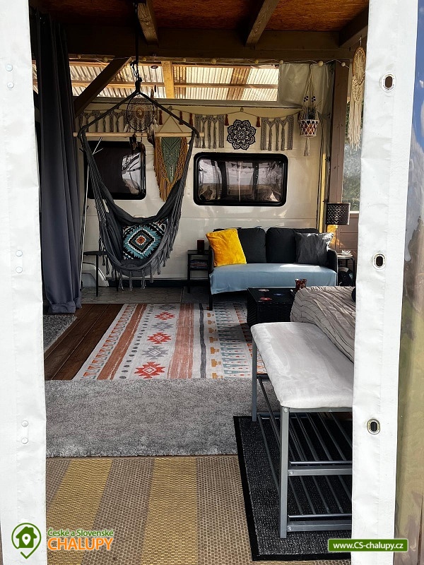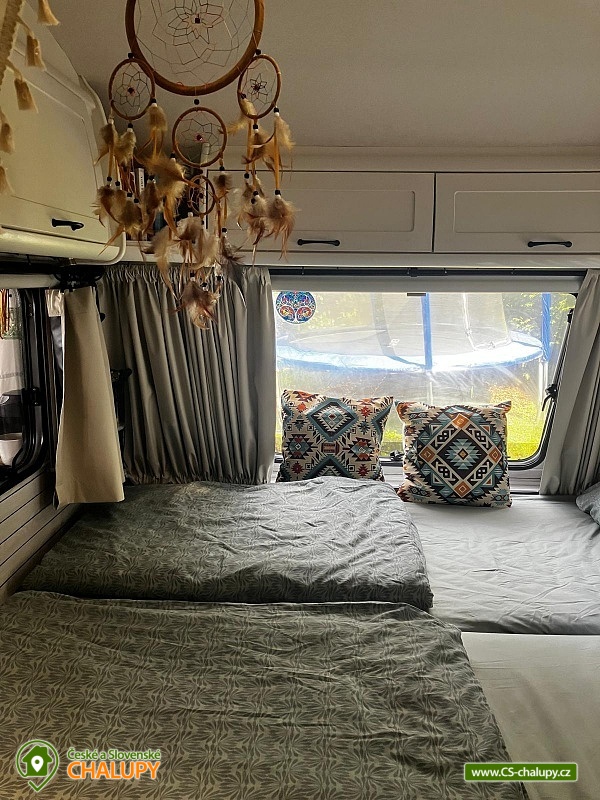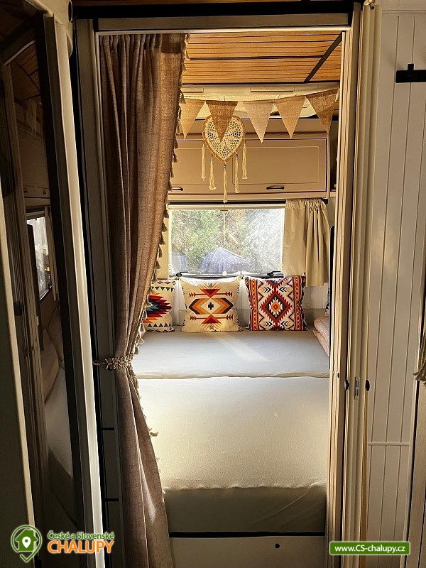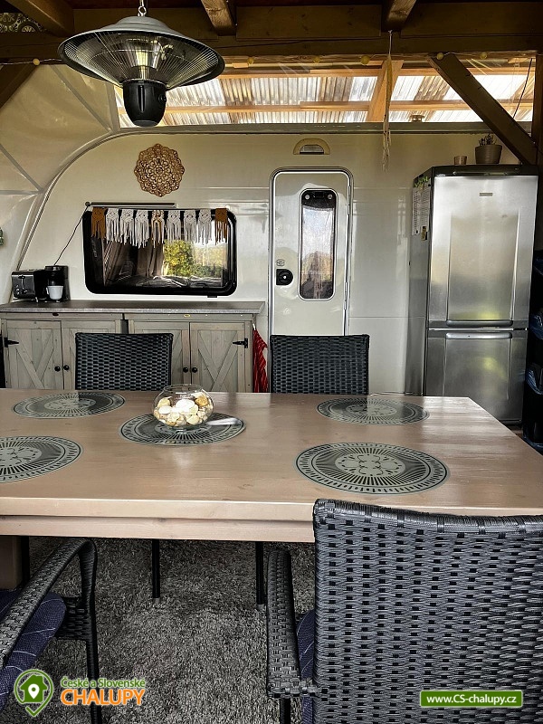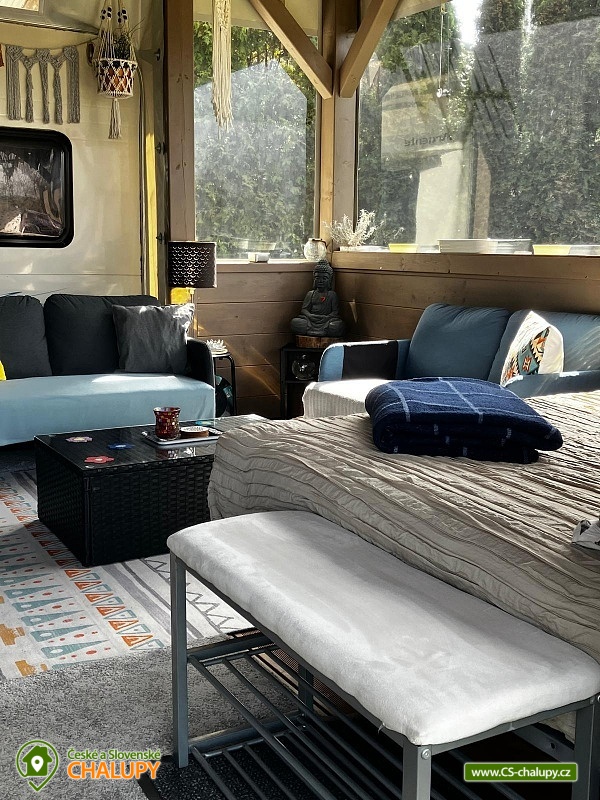 Glamping Karavan u Konopiště s obytnou pergolou se nachází na okraji malé obce Chrášťany u Benešova - Konopiště. Ubytování pro Vás je připraveno v osobitém stylu, jehož dominantou je obytná pergola. Pobyt u nás ocení ti klienti, kteří vyhledávají netradiční ubytování a nechtějí zažívat ruch v přeplněných kempech. V blízkém okolí je spousty typů na výlety, jak k pěší turistice, cyklistice, tak i pro vodáky řeka Sázava. V zimních měsících zde najdete i ski areály. Rádi bychom Vás informovali, že karavan stojí na oploceném soukromém pozemku, který sousedí se silnicí třetí třídy a přiléhá na ní již nefungující zemědělské družstvo, objekt pouze slouží jako úschovna pro krmivo a řemeslnický sklad. Druhou stranu pozemku obýváme my s rodinou a psy. Glamping nabízíme, abychom lidem ukázali netradiční ubytování a mohli zažít více propojení s přírodou a neobvyklé zážitky v tomto stylu. Okolo nás je mnoho krásných míst, možností se toulat přírodou, v přímé blízkosti se nachází lesík, kde se rádi scházejí zvířata a obdarují Vás svou přítomností, zvuky a pohledy. Na přilehlé louce se pasou koně, velmi přítulný a budete s nimi v přímém kontaktu. Rádi bychom, aby jste u nás zažili pohodu, klid, relax a věříme, že si u nás pobyt pozitivně užijete a budete se k nám rádi vracet. Ochotně Vám co nejvíce vyhovíme, poradíme a budeme o Vás pečovat :) Velmi se na Vás těšíme a jste u nás vítáni, zažít si "glamping kempování" nejen v letních měsících, ale i mimo sezonu v chladnějších dnech :) Karavan je pronajímán celoročně. Kapacita objektu je pro 4 hosty. Po domluvě je možno ubytovat i celkem 5 hostů. Ideální počet pro komfortnější spaní a vyžití je hostů 4 dospělý - děti jsou u nás samozřejmě též vítáni. K dispozici jsou dvě ložnice. Karavan slouží především jako zázemí spánku, hygieny a odpočinku. U nás doporučujeme přezůvky - vezměte s sebou :) - zvláště mimo letní sezonu. Po vstupu do karavanu se po levé straně nachází postel větších rozměrů pro dva lidí, slouží jak ke spánku tak pro relax a odpočinek, vedle postele je kuchyňská linka, která slouží spíše pro mytí nádobí a nebo si v troubě upéct nějakou dobrotu :), ale můžete si i v karavanu přímo uvařit. Jinak velký kuchyňský prostor se nachází přímo v pergole u karavanu, v které najdete veškeré potřebné vybavení pro gurmánství a tvořivost vaření. V další části se nachází sprchový kout - voda teče a i teplá :) Naproti je kazetové WC s přírodní bio "chemií" - o tento záchod se Vám budeme denně starat my. Druhá ložnice je v zadní části karavanu s velkou paletovou postelí, na které se též vyspí dvě osoby. Všude v karavanu najdete mnoho odkládacího prostoru a skříněk. Největší dominantou tohoto Glamping Karavanu je obytná - opláštěná - pergola, z které si opravdu užijete úžasné výhledy do okolí. Je o rozměrech 40m čtverečních, vytápěná je infrazářiči + plynová kamna Pohoda. Pergola slouží jak pro kuchyňské potřeby tak i pro odpočinek. Nachází se v ní velký jídelní stůl, komody, osvětlení, lednička. Vaří se na plynovém vařiči. Je rozdělena na dvě části závěsy/ v letních měsících není potřeba/ a to proto, aby Vám neutíkalo mnoho tepla do prostoru a nebo i jen proto, aby jste měli i více soukromý. V druhé části pergoly najdete odpočinkovou relaxační část, se sedací soupravou, paletovou postelí a houpačkou. Také jsme pro Vás vytvořili malý koutek, v kterém najdete vykládací Tarot karty, motivační karty, kameny, četbu a vonné tyčinky, věřím, že si své příznivce tento koutek najde :) Pokud by jste si chtěli při výhledu na západ slunce třeba zacvičit jógu, i karimatka je pro Vás připravena. Uvnitř karavanu i na pergole najdete mnoho motivačních knih. Samozřejmostí jsou i teplé deky, které Vás u pití čajíčku nebo kávy zahřejí a Vy si budete moci užívat ticha a výhledů - prostě rozjímat. V relaxační části pergoly je ratanová sedací souprava a odpočinková postel vyrobená z palet, na které můžete v letních teplých dnech i přespat :) Edita a Vítek s rodinou