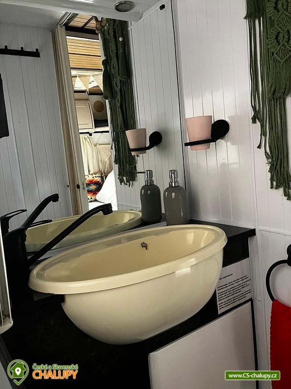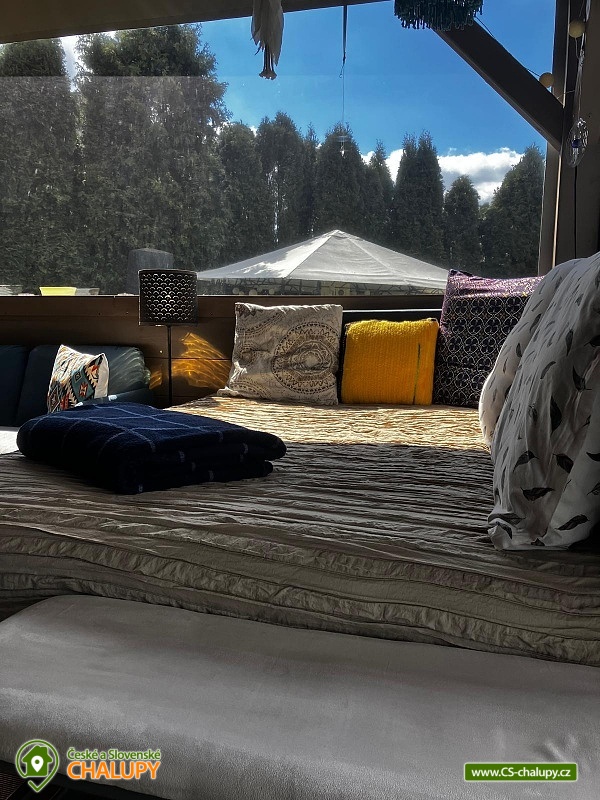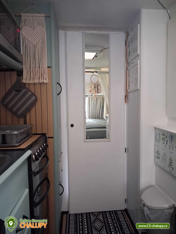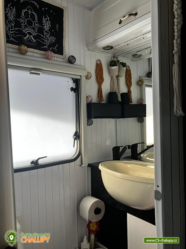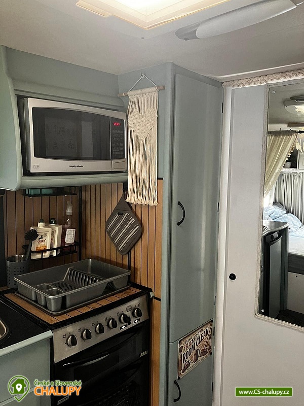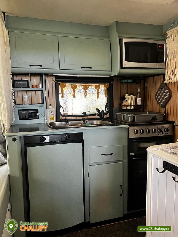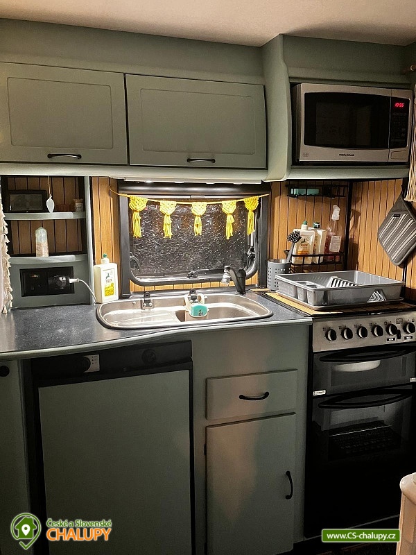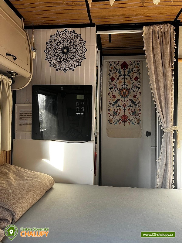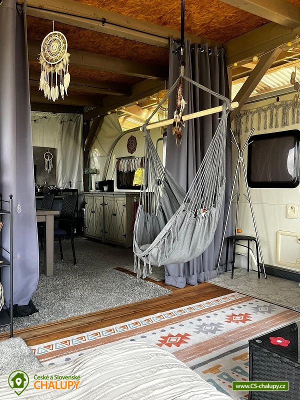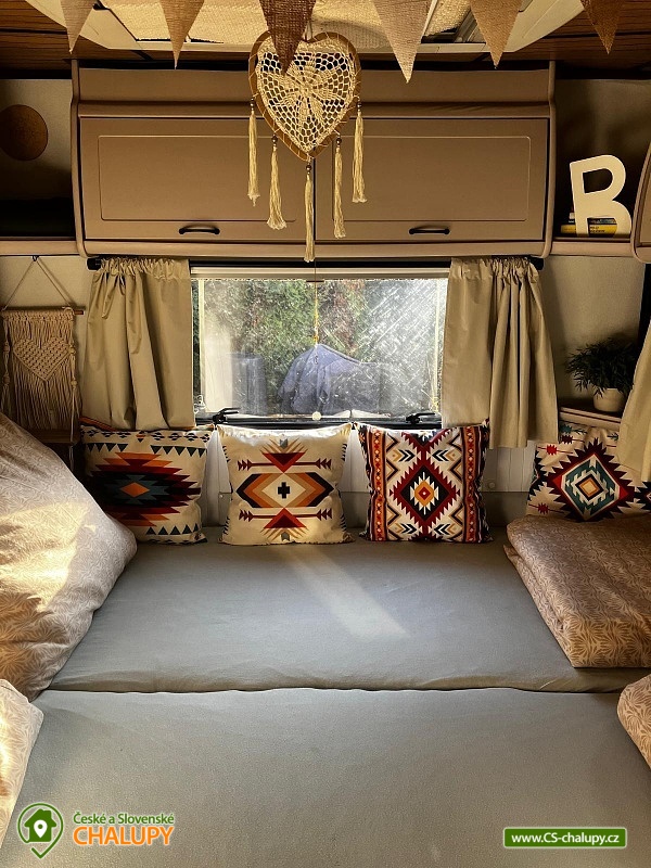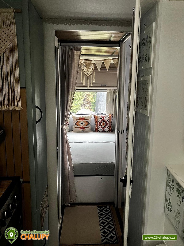 Glamping Karavan u Konopiště s obytnou pergolou se nachází na okraji malé obce Chrášťany u Benešova - Konopiště. Ubytování pro Vás je připraveno v osobitém stylu, jehož dominantou je obytná pergola. Pobyt u nás ocení ti klienti, kteří vyhledávají netradiční ubytování a nechtějí zažívat ruch v přeplněných kempech. V blízkém okolí je spousty typů na výlety, jak k pěší turistice, cyklistice, tak i pro vodáky řeka Sázava. V zimních měsících zde najdete i ski areály. Rádi bychom Vás informovali, že karavan stojí na oploceném soukromém pozemku, který sousedí se silnicí třetí třídy a přiléhá na ní již nefungující zemědělské družstvo, objekt pouze slouží jako úschovna pro krmivo a řemeslnický sklad. Druhou stranu pozemku obýváme my s rodinou a psy. Glamping nabízíme, abychom lidem ukázali netradiční ubytování a mohli zažít více propojení s přírodou a neobvyklé zážitky v tomto stylu. Okolo nás je mnoho krásných míst, možností se toulat přírodou, v přímé blízkosti se nachází lesík, kde se rádi scházejí zvířata a obdarují Vás svou přítomností, zvuky a pohledy. Na přilehlé louce se pasou koně, velmi přítulný a budete s nimi v přímém kontaktu. Rádi bychom, aby jste u nás zažili pohodu, klid, relax a věříme, že si u nás pobyt pozitivně užijete a budete se k nám rádi vracet. Ochotně Vám co nejvíce vyhovíme, poradíme a budeme o Vás pečovat :) Velmi se na Vás těšíme a jste u nás vítáni, zažít si "glamping kempování" nejen v letních měsících, ale i mimo sezonu v chladnějších dnech :) Karavan je pronajímán celoročně. Kapacita objektu je pro 4 hosty. Po domluvě je možno ubytovat i celkem 5 hostů. Ideální počet pro komfortnější spaní a vyžití je hostů 4 dospělý - děti jsou u nás samozřejmě též vítáni. K dispozici jsou dvě ložnice. Karavan slouží především jako zázemí spánku, hygieny a odpočinku. U nás doporučujeme přezůvky - vezměte s sebou :) - zvláště mimo letní sezonu. Po vstupu do karavanu se po levé straně nachází postel větších rozměrů pro dva lidí, slouží jak ke spánku tak pro relax a odpočinek, vedle postele je kuchyňská linka, která slouží spíše pro mytí nádobí a nebo si v troubě upéct nějakou dobrotu :), ale můžete si i v karavanu přímo uvařit. Jinak velký kuchyňský prostor se nachází přímo v pergole u karavanu, v které najdete veškeré potřebné vybavení pro gurmánství a tvořivost vaření. V další části se nachází sprchový kout - voda teče a i teplá :) Naproti je kazetové WC s přírodní bio "chemií" - o tento záchod se Vám budeme denně starat my. Druhá ložnice je v zadní části karavanu s velkou paletovou postelí, na které se též vyspí dvě osoby. Všude v karavanu najdete mnoho odkládacího prostoru a skříněk. Největší dominantou tohoto Glamping Karavanu je obytná - opláštěná - pergola, z které si opravdu užijete úžasné výhledy do okolí. Je o rozměrech 40m čtverečních, vytápěná je infrazářiči + plynová kamna Pohoda. Pergola slouží jak pro kuchyňské potřeby tak i pro odpočinek. Nachází se v ní velký jídelní stůl, komody, osvětlení, lednička. Vaří se na plynovém vařiči. Je rozdělena na dvě části závěsy/ v letních měsících není potřeba/ a to proto, aby Vám neutíkalo mnoho tepla do prostoru a nebo i jen proto, aby jste měli i více soukromý. V druhé části pergoly najdete odpočinkovou relaxační část, se sedací soupravou, paletovou postelí a houpačkou. Také jsme pro Vás vytvořili malý koutek, v kterém najdete vykládací Tarot karty, motivační karty, kameny, četbu a vonné tyčinky, věřím, že si své příznivce tento koutek najde :) Pokud by jste si chtěli při výhledu na západ slunce třeba zacvičit jógu, i karimatka je pro Vás připravena. Uvnitř karavanu i na pergole najdete mnoho motivačních knih. Samozřejmostí jsou i teplé deky, které Vás u pití čajíčku nebo kávy zahřejí a Vy si budete moci užívat ticha a výhledů - prostě rozjímat. V relaxační části pergoly je ratanová sedací souprava a odpočinková postel vyrobená z palet, na které můžete v letních teplých dnech i přespat :) Edita a Vítek s rodinou