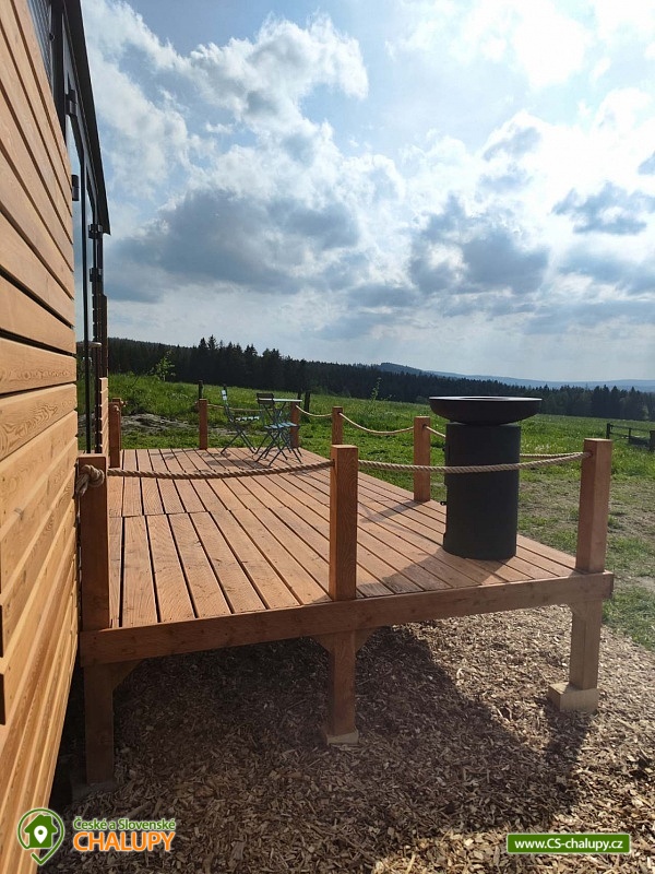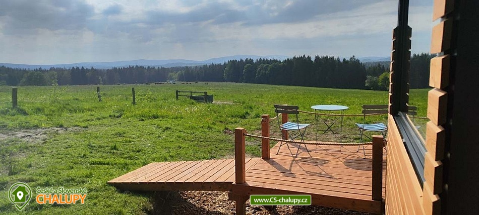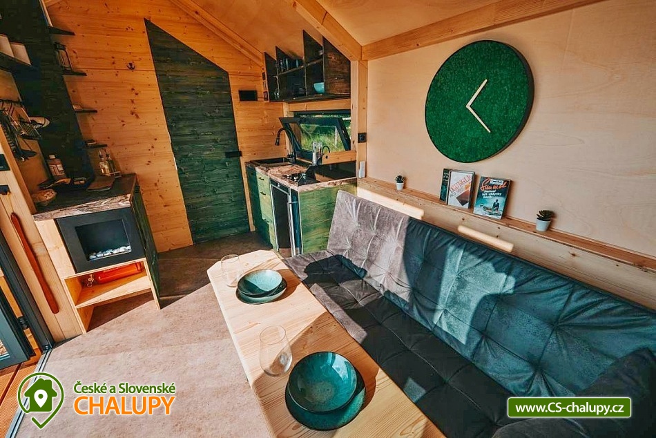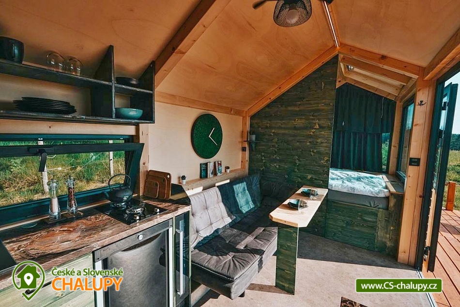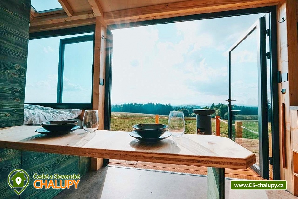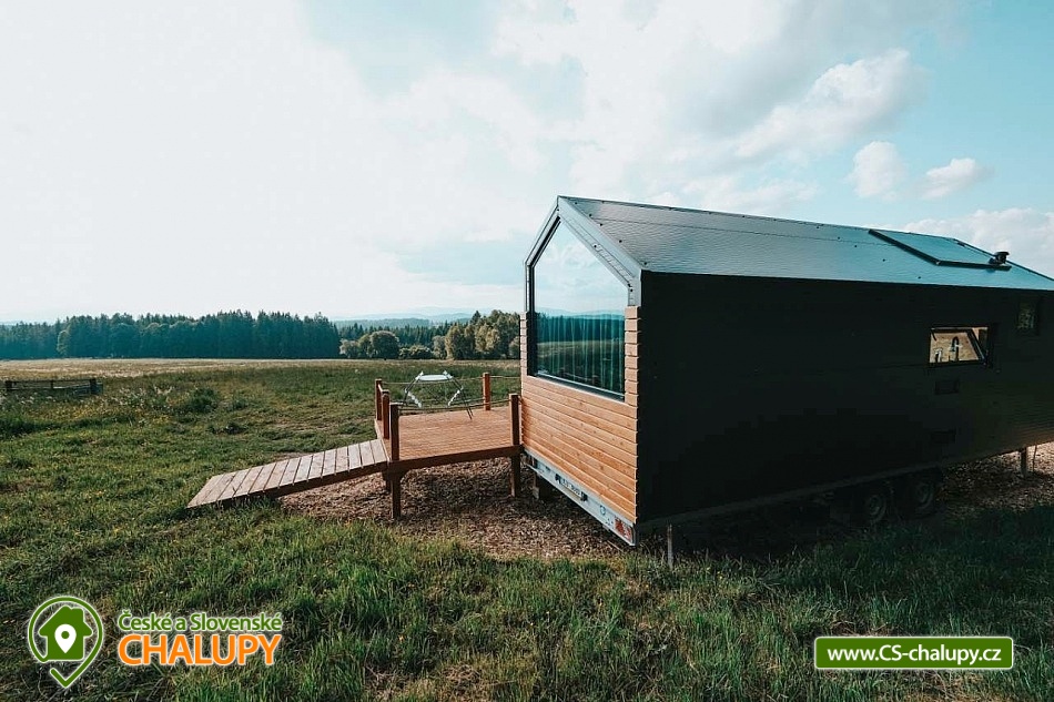 Glamping Lipno nedaleko Stezky v korunách stromů - Tiny House se nachází na samotě u obce Světlík v krásné přírodě jižních Čech u lesa uprostřed pastvin a luk. Nedaleko k výletům láká přehrada Lipno nebo turisticky oblíbené město Český Krumlov. Dominantou chaty je krásná terasa s grilem, ze které si lze užívat y nejhezčí západy slunce, kde se slunce ztrácí až za dalekým horizontem. Těšit se můžete na veškerý komfort od sprchy s teplou vodou, přes lednici, vinotéku, vařič, topení až po stropní ventilátor. Tiny House s krásnými přírodními motivy nabízí ubytování pro 4 osoby, k dispozici je jedna manželská postel a dvě přistýlky řešené rozkládací pohovkou. Ložní prádlo a ručníky jsou k zapůjčení. Součástí domku je jídelní stolek a vybavený kuchyňský kout (lednice, nádobí, plotýnka na vaření, varná konvice a základní potřeby na vaření). Sociální zařízení zahrnuje jednu stylovou koupelnu se sprchovým koutem a WC. Vytápění je řešeno ústředním topením. Venku lze posedět na terase s grilem. Parkovat lze přímo u objektu. V okolí domku možnost turistiky, cykloturistiky, koupání, houbaření, rybaření a lyžování. Mezi možnosti koupání patří např.: vodní nádrž Lipno, aquapark Frymburk, aquapark Lipno, koupaliště Větřní , Hornobranský rybník, bazén Český Krumlov, rybník Olšina, koupaliště Kaplice, koupaliště Velešín, požární nádrž koupaliště Třísov atd. V zimním období jsou k dispozici blízká lyžařská střediska Lipno - Kramolín a Frymburk. Lipenská oblast nabízí spoustu možností pro výlety - Stezka korunami stromů s výhledem na Lipno, Mini zoo Lipno, Hopsárium, gotický Hrad Rožmberk, Plešné jezero nebo Boubínský prales, Bobová dráha Slideland a Aquaworld Lipno. Dále láká Český Krumlov pro svou proslulou architekturu s malebnými uličkami a romantickou atmosférou a svým hradem a zámkem nebo obec Frymburk s unikátní expozicí Svět pod hladinou s více jak 30 akvárii. Těšíme se na Vás u nás.