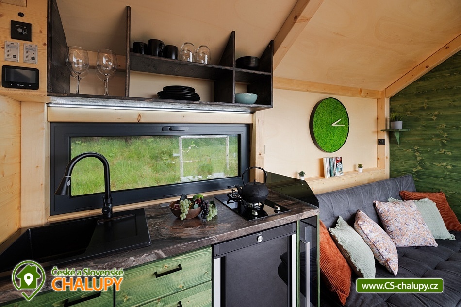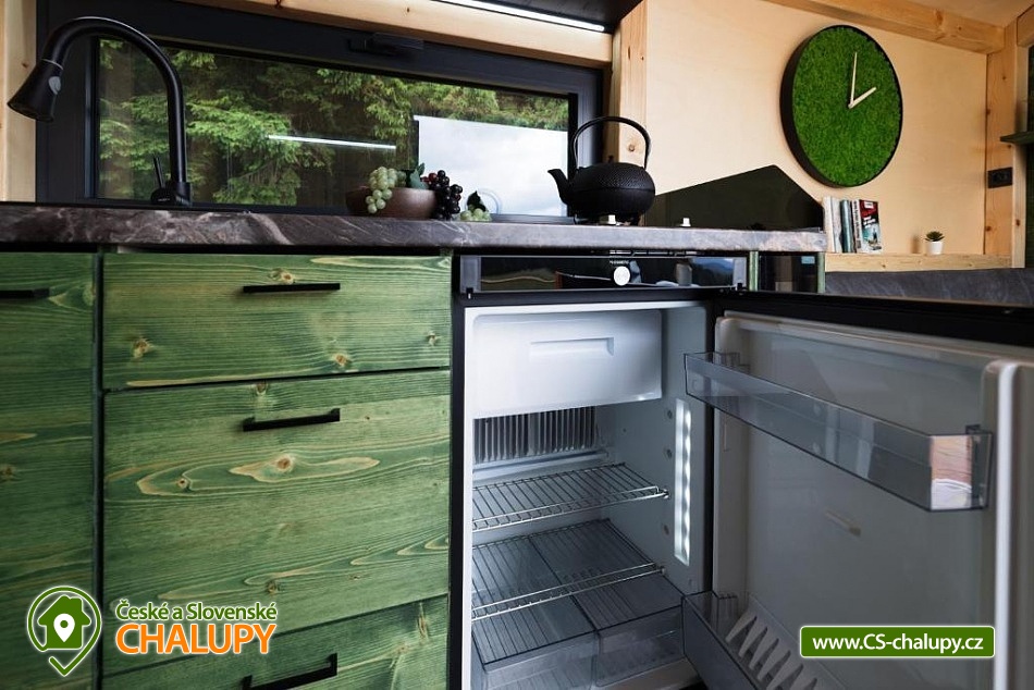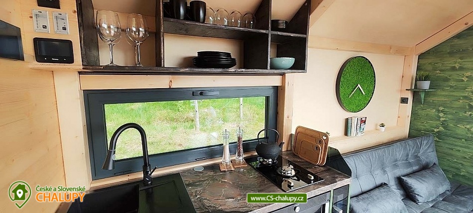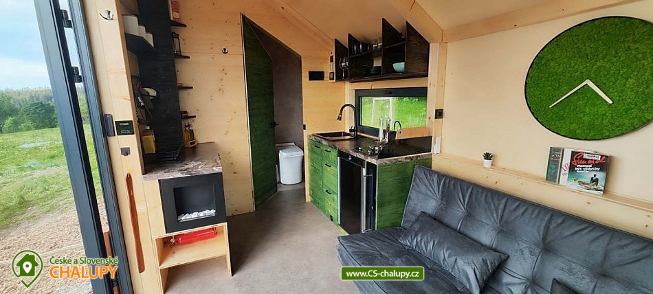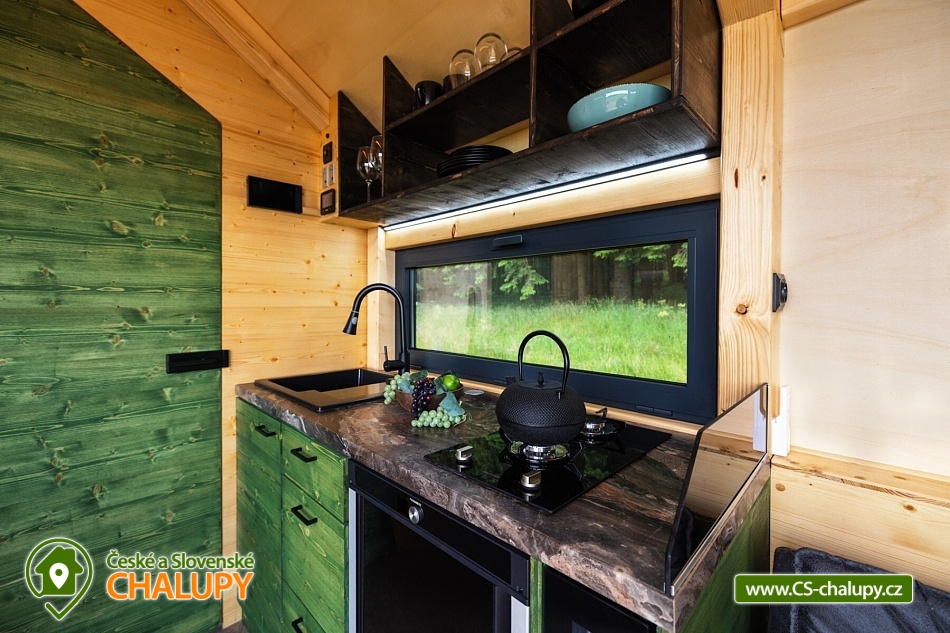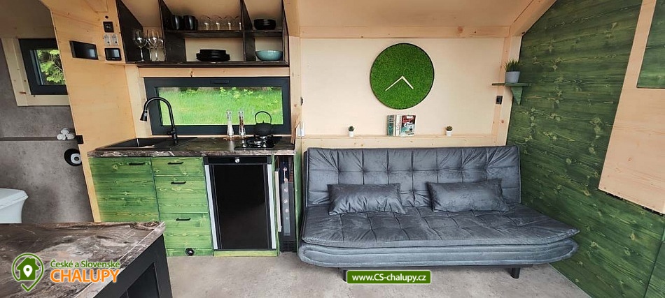 Glamping Lipno nedaleko Stezky v korunách stromů - Tiny House se nachází na samotě u obce Světlík v krásné přírodě jižních Čech u lesa uprostřed pastvin a luk. Nedaleko k výletům láká přehrada Lipno nebo turisticky oblíbené město Český Krumlov. Dominantou chaty je krásná terasa s grilem, ze které si lze užívat y nejhezčí západy slunce, kde se slunce ztrácí až za dalekým horizontem. Těšit se můžete na veškerý komfort od sprchy s teplou vodou, přes lednici, vinotéku, vařič, topení až po stropní ventilátor. Tiny House s krásnými přírodními motivy nabízí ubytování pro 4 osoby, k dispozici je jedna manželská postel a dvě přistýlky řešené rozkládací pohovkou. Ložní prádlo a ručníky jsou k zapůjčení. Součástí domku je jídelní stolek a vybavený kuchyňský kout (lednice, nádobí, plotýnka na vaření, varná konvice a základní potřeby na vaření). Sociální zařízení zahrnuje jednu stylovou koupelnu se sprchovým koutem a WC. Vytápění je řešeno ústředním topením. Venku lze posedět na terase s grilem. Parkovat lze přímo u objektu. V okolí domku možnost turistiky, cykloturistiky, koupání, houbaření, rybaření a lyžování. Mezi možnosti koupání patří např.: vodní nádrž Lipno, aquapark Frymburk, aquapark Lipno, koupaliště Větřní , Hornobranský rybník, bazén Český Krumlov, rybník Olšina, koupaliště Kaplice, koupaliště Velešín, požární nádrž koupaliště Třísov atd. V zimním období jsou k dispozici blízká lyžařská střediska Lipno - Kramolín a Frymburk. Lipenská oblast nabízí spoustu možností pro výlety - Stezka korunami stromů s výhledem na Lipno, Mini zoo Lipno, Hopsárium, gotický Hrad Rožmberk, Plešné jezero nebo Boubínský prales, Bobová dráha Slideland a Aquaworld Lipno. Dále láká Český Krumlov pro svou proslulou architekturu s malebnými uličkami a romantickou atmosférou a svým hradem a zámkem nebo obec Frymburk s unikátní expozicí Svět pod hladinou s více jak 30 akvárii. Těšíme se na Vás u nás.