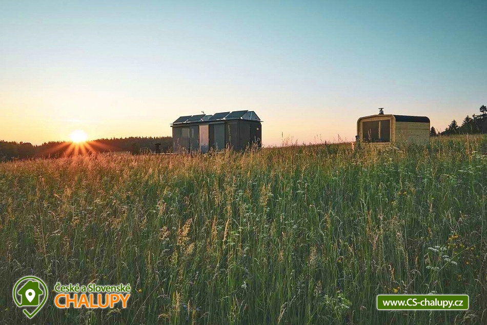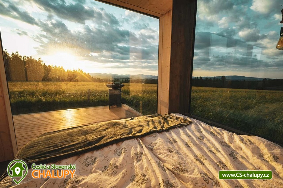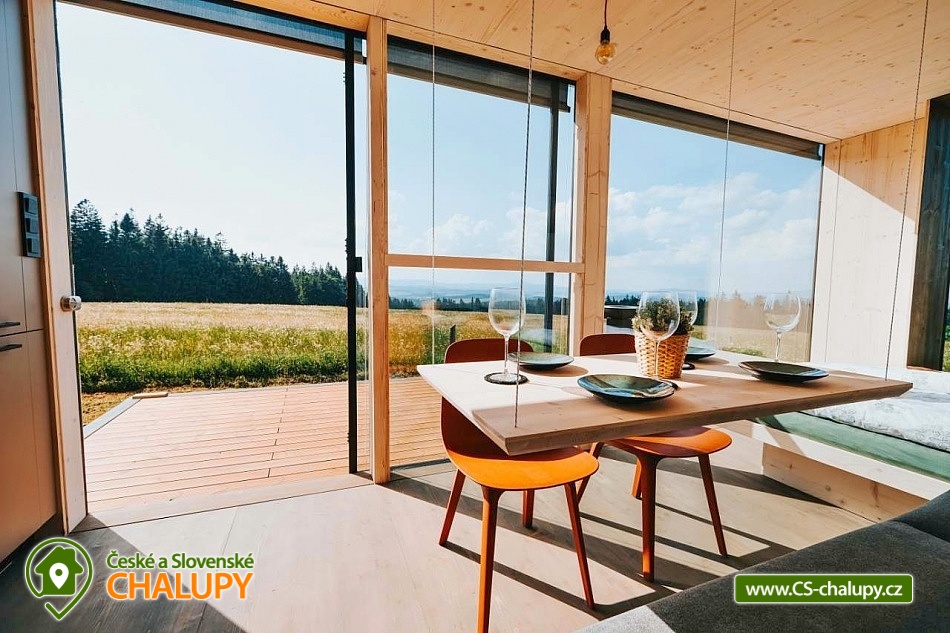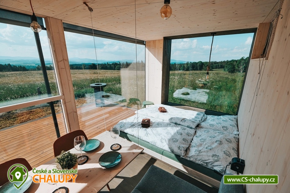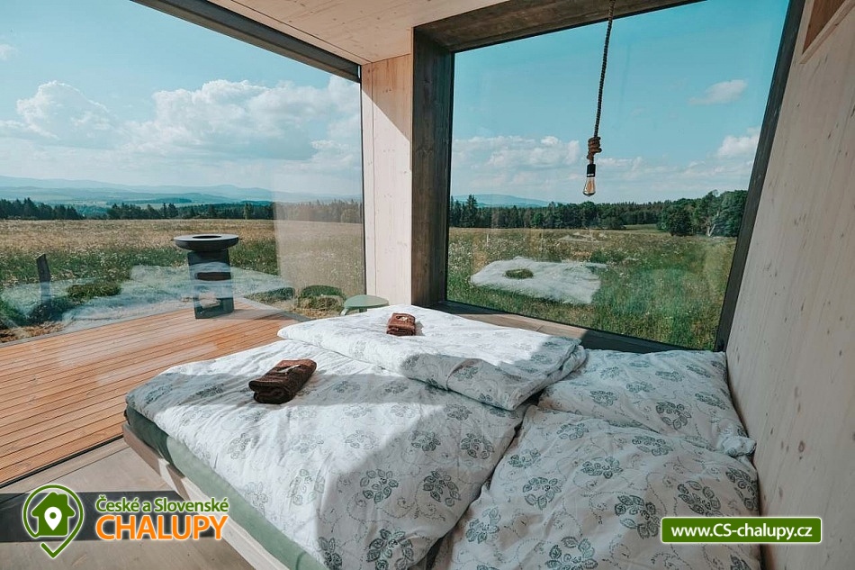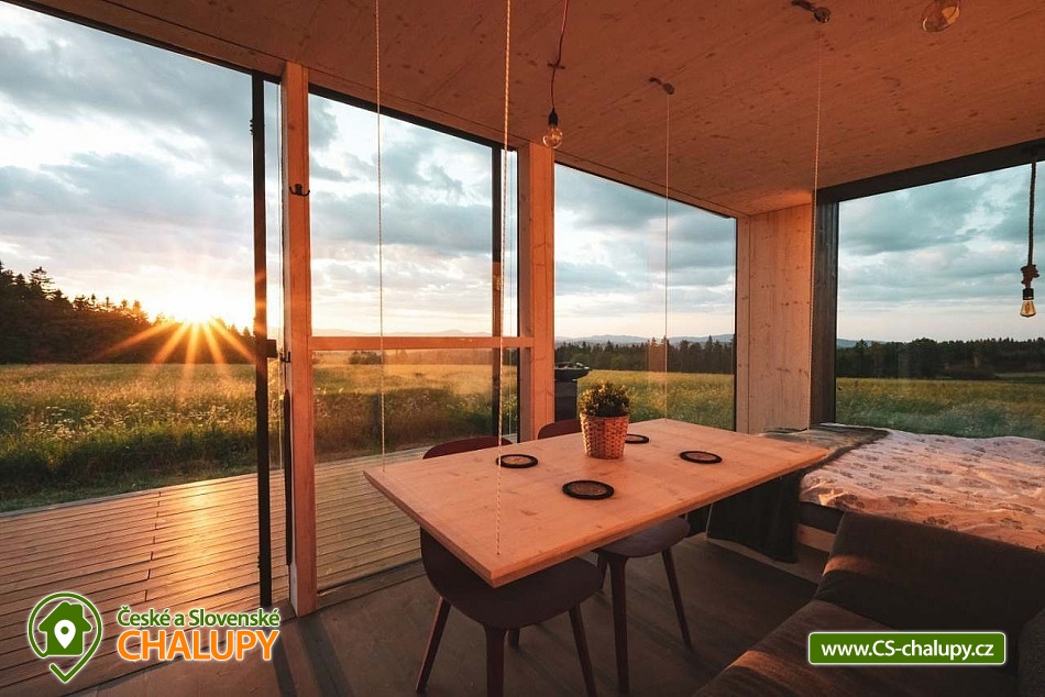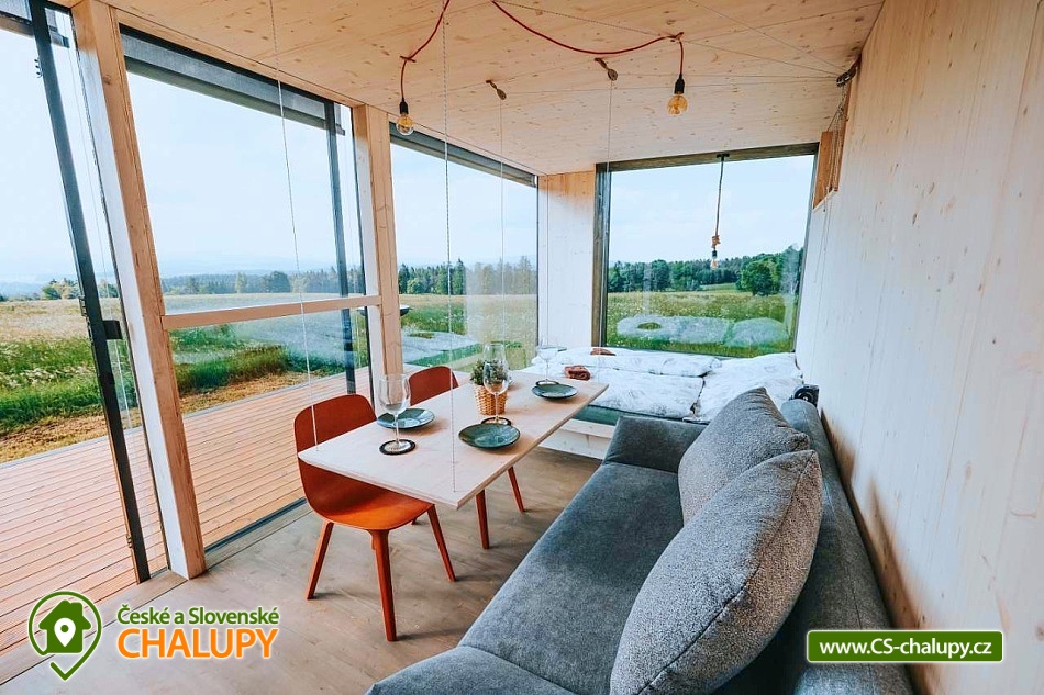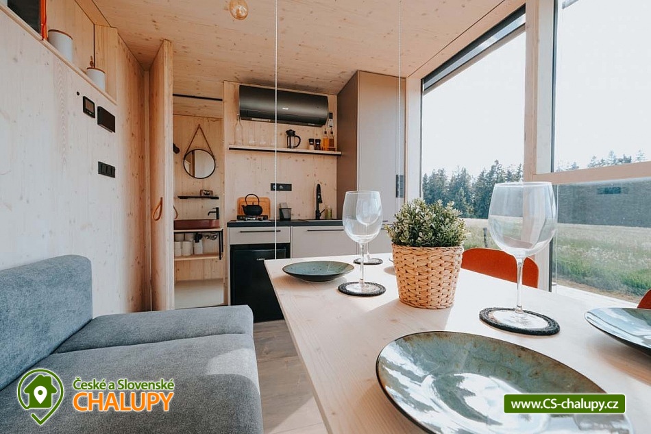 Glamping Lipno se saunou - Tiny House se nachází u obce Světlík v krásné přírodě jižních Čech u lesa uprostřed pastvin a luk, lokalita obcí Malším a Frymburk u Lipenského jezera. K výletům láká přehrada Lipno nebo turisticky oblíbené město Český Krumlov. Těšit se můžete na dostatek soukromí, úžasné výhledy do okolní krajiny, komfortní vybavení domku s kuchyňským koutem a vlastní koupelnou a na relax v dřevěné sauně s ochlazovacím sudem. Tiny House s celodřevěným interiérem nabízí ubytování pro 4 osoby, k dispozici je jedna manželská postel a dvě přistýlky řešené rozkládací pohovkou. K dispozici je ložní povlečení a ručníky. Součástí domku je unikátní posezení u „létajícího stolu“. Z postele nebo při posezení u stolu si lze užívat krásné výhledy ven přes panoramatická okna domu. Naopak před světlem vás schovají venkovní rolety a chytré osvětlení se na určitých místech rozsvítí pouze dle potřeby. V domku nechybí vybavený kuchyňský kout (lednice, nádobí, plotýnka na vaření, varná konvice, French press a základní potřeby na vaření). Sociální zařízení zahrnuje plně vybavenou koupelnu se sprchovým koutem a WC. Teplá sprcha je samozřejmostí. Vytápění je řešeno centrálním vytápěním s klimatizací. Venku lze posedět na terase s grilem. Odpočívat lze v sauně. K dispozici je suché dřevo se sekyrkou. Parkovat lze přímo u objektu. V okolí domku možnost turistiky, cykloturistiky, koupání, houbaření, rybaření a lyžování. Mezi možnosti koupání patří např.: vodní nádrž Lipno, aquapark Frymburk, aquapark Lipno, koupaliště Větřní , Hornobranský rybník, bazén Český Krumlov, rybník Olšina, koupaliště Kaplice, koupaliště Velešín, požární nádrž koupaliště Třísov atd. V zimním období jsou k dispozici blízká lyžařská střediska Lipno - Kramolín a Frymburk. Lipenská oblast nabízí spoustu možností pro výlety - Stezka korunami stromů s výhledem na Lipno, Mini zoo Lipno, gotický Hrad Rožmberk, Plešné jezero nebo Boubínský prales, Bobová dráha Slideland a Aquaworld Lipno. Dále láká Český Krumlov pro svou proslulou architekturu s malebnými uličkami a romantickou atmosférou a svým hradem a zámkem nebo obec Frymburk s unikátní expozicí Svět pod hladinou s více jak 30 akvárii. Těšíme se na Vás u nás.