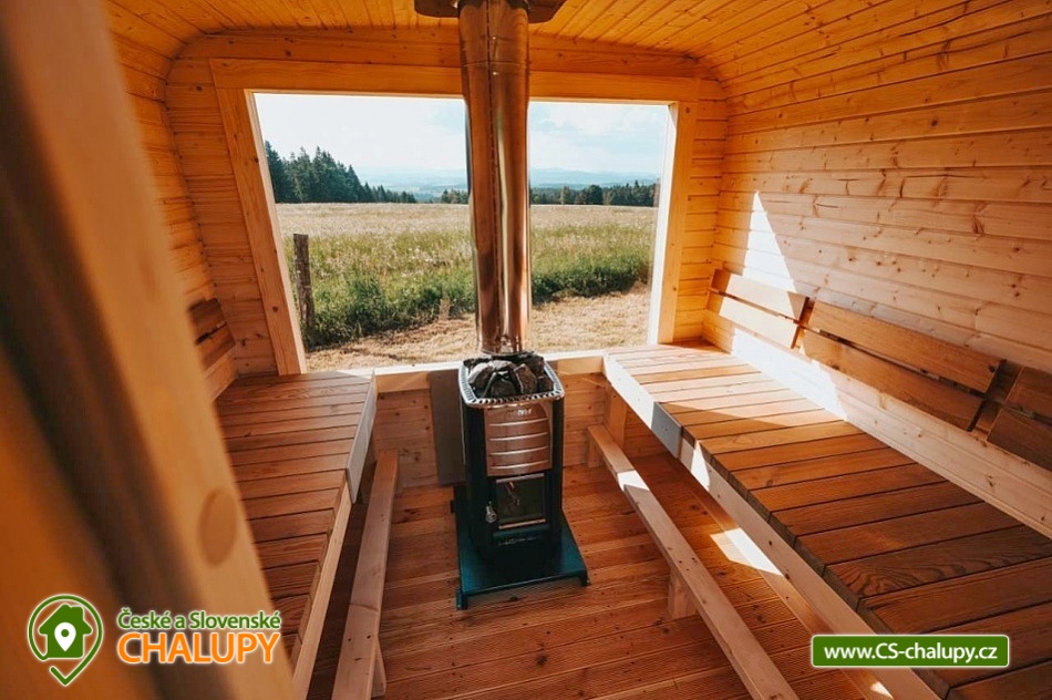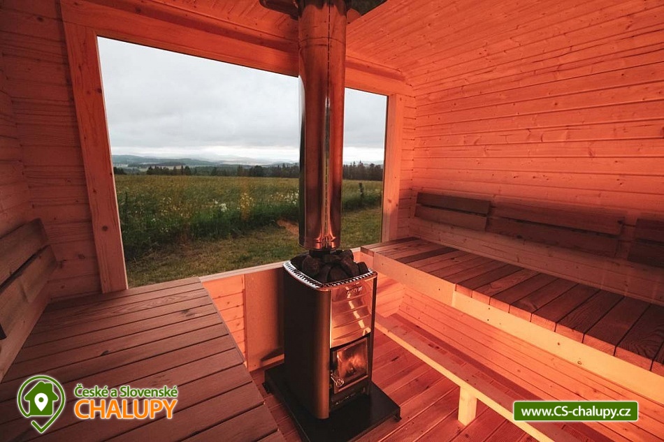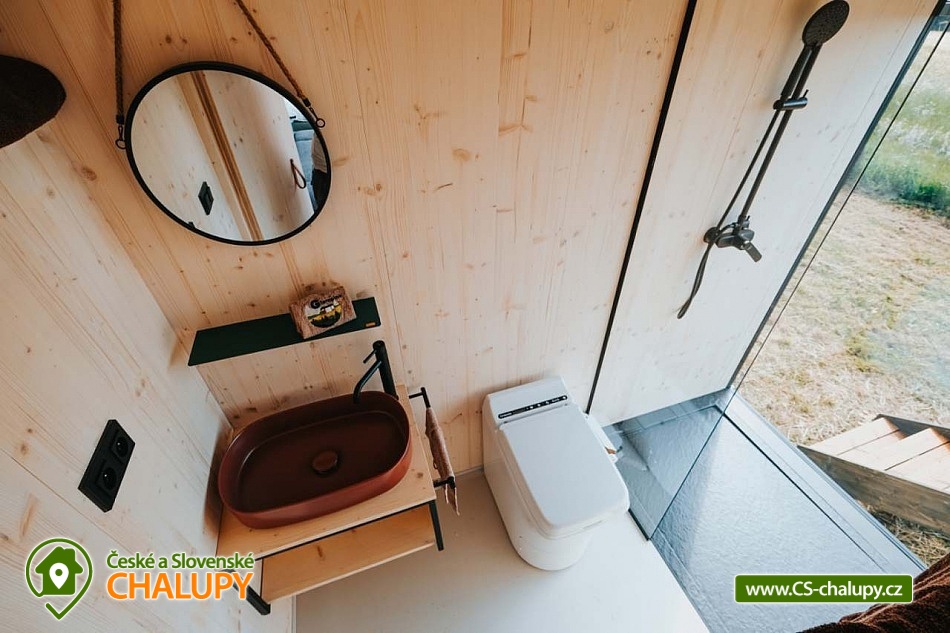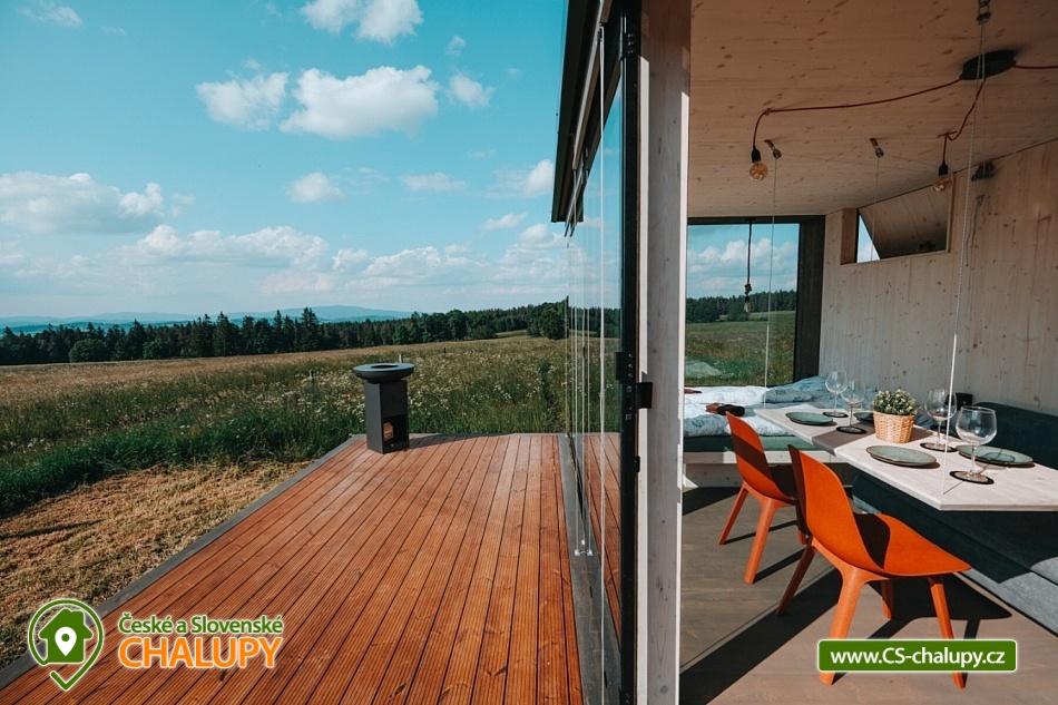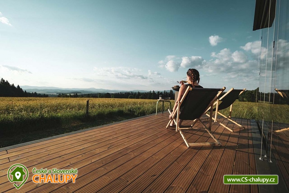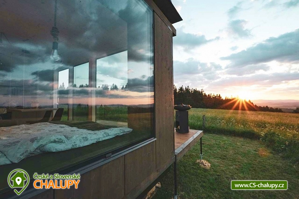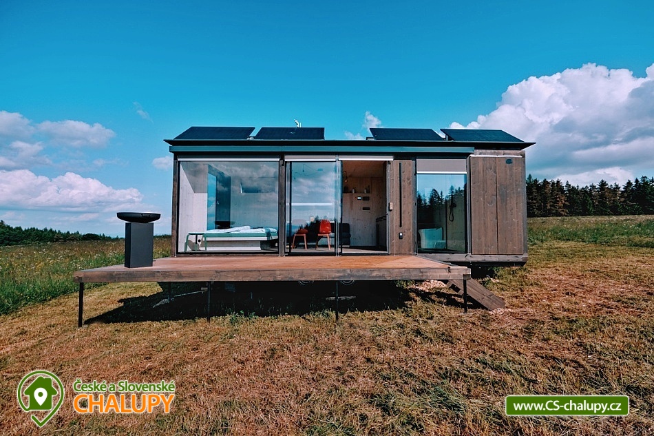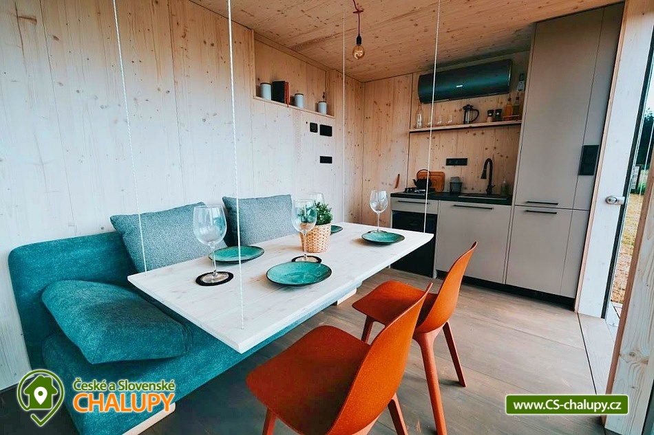 Glamping Lipno se saunou - Tiny House se nachází u obce Světlík v krásné přírodě jižních Čech u lesa uprostřed pastvin a luk, lokalita obcí Malším a Frymburk u Lipenského jezera. K výletům láká přehrada Lipno nebo turisticky oblíbené město Český Krumlov. Těšit se můžete na dostatek soukromí, úžasné výhledy do okolní krajiny, komfortní vybavení domku s kuchyňským koutem a vlastní koupelnou a na relax v dřevěné sauně s ochlazovacím sudem. Tiny House s celodřevěným interiérem nabízí ubytování pro 4 osoby, k dispozici je jedna manželská postel a dvě přistýlky řešené rozkládací pohovkou. K dispozici je ložní povlečení a ručníky. Součástí domku je unikátní posezení u „létajícího stolu“. Z postele nebo při posezení u stolu si lze užívat krásné výhledy ven přes panoramatická okna domu. Naopak před světlem vás schovají venkovní rolety a chytré osvětlení se na určitých místech rozsvítí pouze dle potřeby. V domku nechybí vybavený kuchyňský kout (lednice, nádobí, plotýnka na vaření, varná konvice, French press a základní potřeby na vaření). Sociální zařízení zahrnuje plně vybavenou koupelnu se sprchovým koutem a WC. Teplá sprcha je samozřejmostí. Vytápění je řešeno centrálním vytápěním s klimatizací. Venku lze posedět na terase s grilem. Odpočívat lze v sauně. K dispozici je suché dřevo se sekyrkou. Parkovat lze přímo u objektu. V okolí domku možnost turistiky, cykloturistiky, koupání, houbaření, rybaření a lyžování. Mezi možnosti koupání patří např.: vodní nádrž Lipno, aquapark Frymburk, aquapark Lipno, koupaliště Větřní , Hornobranský rybník, bazén Český Krumlov, rybník Olšina, koupaliště Kaplice, koupaliště Velešín, požární nádrž koupaliště Třísov atd. V zimním období jsou k dispozici blízká lyžařská střediska Lipno - Kramolín a Frymburk. Lipenská oblast nabízí spoustu možností pro výlety - Stezka korunami stromů s výhledem na Lipno, Mini zoo Lipno, gotický Hrad Rožmberk, Plešné jezero nebo Boubínský prales, Bobová dráha Slideland a Aquaworld Lipno. Dále láká Český Krumlov pro svou proslulou architekturu s malebnými uličkami a romantickou atmosférou a svým hradem a zámkem nebo obec Frymburk s unikátní expozicí Svět pod hladinou s více jak 30 akvárii. Těšíme se na Vás u nás.