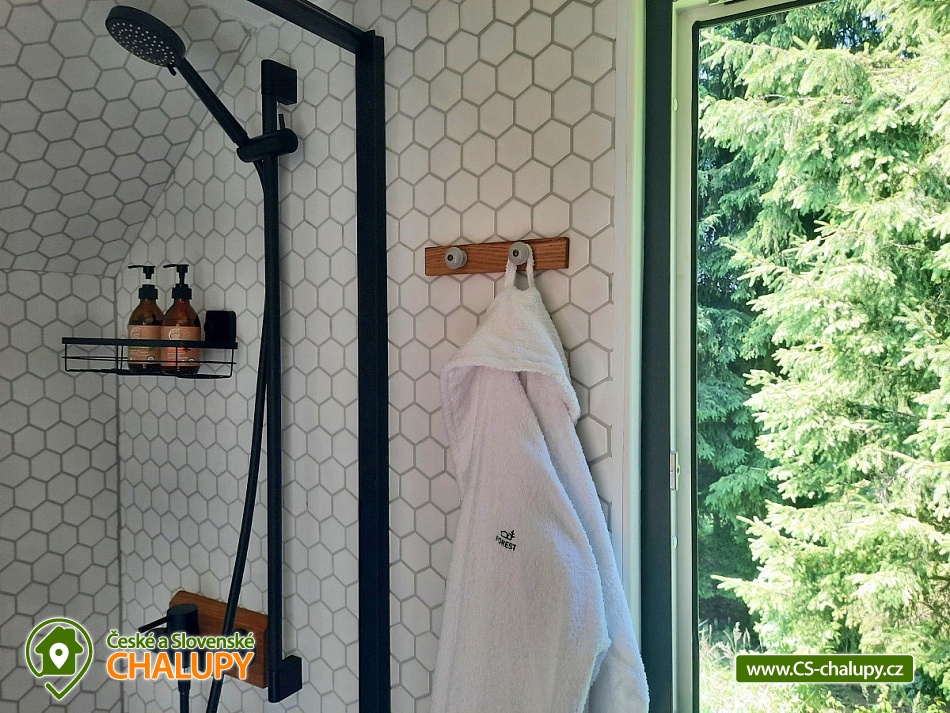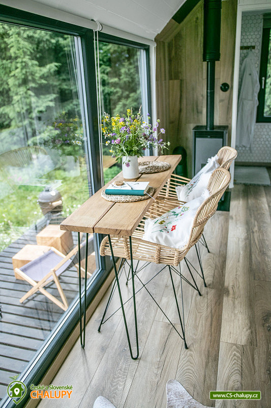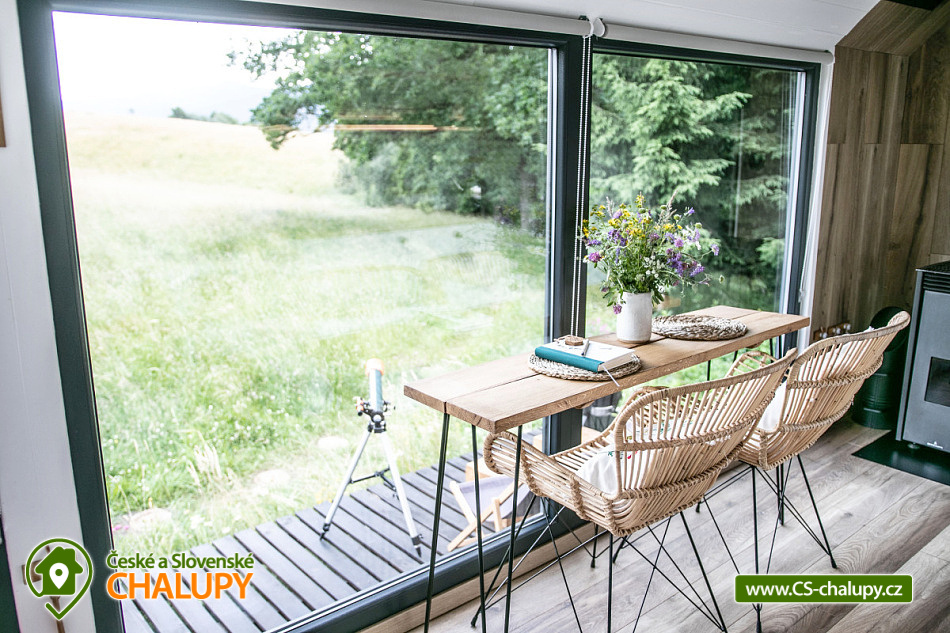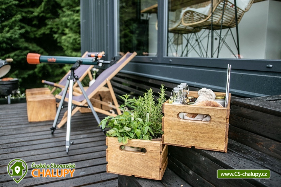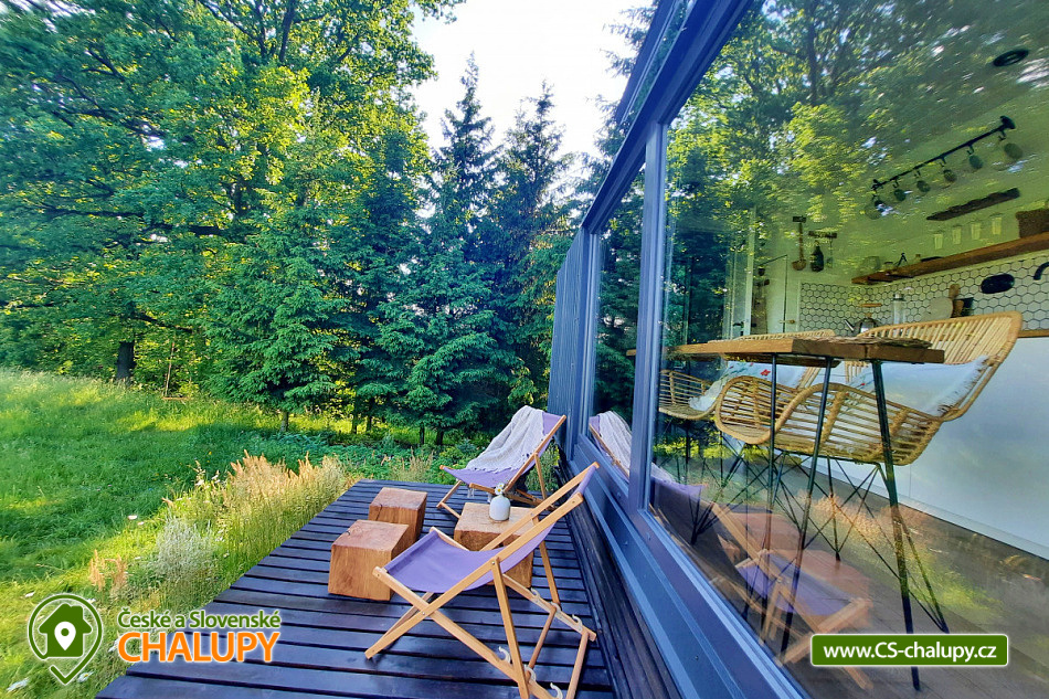 Glamping Pozorovatelna Forest se nachází v podhůří Jizerských hor nedaleko Liberce, u obce Chrastava v soukromí na louce u lesa. Přesná GPS poloha domku bude ubytovaným sdělena až po rezervaci. Jedná se o moderně a komfortně vybavený domek tvořený z velké části panoramatickými okny, přes které si můžete užívat krásné výhledy do okolní přírody a to i z postele. Těšit se můžete na klid, výhled na Ještědský hřbet, vůni stromů a lučního kvítí, pozorování lesní zvěře nebo na ptačí zpěv. Potěší vás, že ve Forestu je kladený důraz na udržitelný design a maximální využití recyklovaného materiálu. Forest nabízí ubytování se snídaní pro 3 osoby nebo po domluvě pro dvě dospělé osoby a dvě menší děti. Celkem je k dispozici jedna dvoulůžková postel s vysoce komfortní hypoalergenní matrací z paměťové pěny a přistýlka řešená rozkládací pohovkou. K dispozici jsou lůžkoviny z ovčí vlny. Dále je součástí domku jídelní stůl a plně vybavená kuchyň (lednice s mrazáčkem, plynová varná deska, varná konvice, moka konvice, nádobí, hrnce, příbory, kvalitní zrnková káva, sypané bylinné čaje, kakao, mouka, cukr, olej, ocet, koření atd.). Dominantou kuchyně je ručně vyráběná keramika z dílny Petry Hauznerové z Jizerských hor a nádobí české značky Fabini, které obohatí Váš zážitek z vaření. K dispozici je 6 litrů pitné vody. Pro volné chvíle jsou zde připravené knihy, deskové hry, cvrnkací kuličky, hlavolamy, karty, kostky nebo pexeso. Sociální zařízení v domku zahrnuje jeden sprchový kout a separační toaletu. K dispozici jsou ručníky, osušky, župany, toaletní a hygienické potřeby, lékárnička a přírodní kosmetika (šampon, sprchový gel a mýdlo). Nechybí ani bačkůrky z ovčí vlny. Vytápění je řešeno peletovými kamny, které jsou součástí domku. K dispozici je teplá a studená voda. Elektrická energie je zajištěna z fotovoltaické elektrárny. U domku lze posedět na terase s venkovním posezením a keramickým grilem včetně příslušenství (brikety, podpalovač, grilovací nářadí). Pro pozorování večerní oblohy je připravený hvězdářský dalekohled. Pro relax jsou k dispozici lehátka nebo houpačka. V okolí objektu možnost turistiky, cykloturistiky, koupání, houbaření, lyžování a běžkování. Nedaleko se nachází také golfové hřiště. Mezi možnosti koupání patří např.: jezero Hrádek nad Nisou Kristýna, koupaliště Kryštofovo Údolí, vodní nádrž Fojtka, Heřmanické vodní nádrže, plavecký bazén Liberec, aquapark Centrum Babylon - Liberec, Lesní koupaliště Liberec, přehrada Harcov, přehrada Bedřichov, atd. V zimním období je k dispozici blízké lyžařské středisko Ještěd. K výletům v okolí láká krajské město Liberec - Zoo, Zábavní centrum Babylon s aquaparkem, IQ Landia a další, Kryštofovo Údolí, Grabštejn, Rozhledna Liberecká výšina, Ještěd nebo Zámek a Hrad Frýdlant. Těšíme se na Vás u nás.