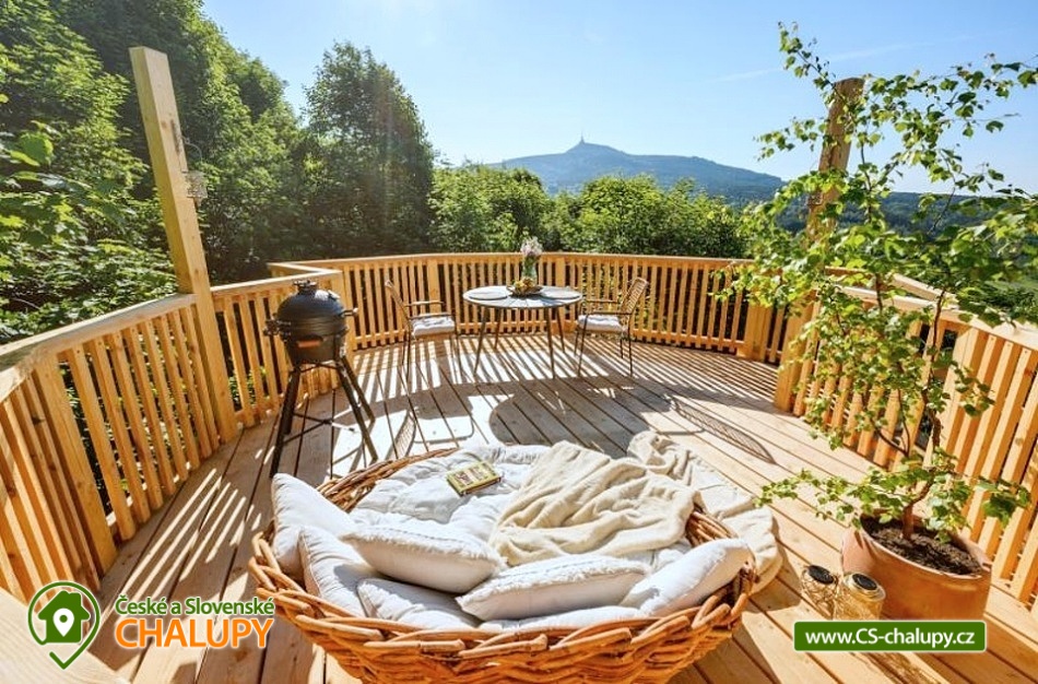 Unikátní glamping s venkovní saunou na samotě v lese. Originální ubytování u vrcholků stromů s obytným patrem a panoramatickou terasou na střeše. Užívat si můžete omamné šumění lesa a uvidíte nádherná panoramata s dominantou hory Ještěd. Glampingu dominují přírodní materiály, od postele z masivu až po dekorace na stěnách, všude je cítit vůně dřeva a samotného lesa. Glamping poskytuje ubytování se snídaní pro 2 dospělé osoby. V prvním patře chaty je připravený útulný obytný prostor, kde je k dispozici malá kuchyňka, posezení, kamínka na vytápění, toaleta, umyvadlo a především velká postel. Druhé patro s terasou slouží pro grilování a nekonečné kochání se místní přírodou. Vybavení zahrnuje střešní terasu, keramický gril, privátní saunu, plnohodnotnou lednici, vařič na kávu a čaj a luxusní chodící spací pytle pro pobyt na střešní terase. Součástí kuchyňského koutku je také káva, čaj, cukr, mléko do kávy a pitná voda. Osprchovat se tu můžete přímo pod korunami stromů ve venkovní sprše (voda ve venkovní teplotě). K dispozici jsou 2 toalety, jedna přímo v ubytování a druhá venku. Obě jsou suché a splachují se unikátně pilinami. Vytápění zajišťuje litinový automatický krb. Objekt nemá k dispozici wifi připojení a elektřinu. Tu pravou atmosféru si lze vytvořit světlem svíček nebo si užívat hvězdy nad hlavou. Na střešní terase nechybí luxusní venkovní postel, protože není nadto se po grilovačce natáhnout a koukat přímo na hvězdy. Na pozorování cvrkotu na Ještědu je připravený dalekohled. Gurmánské zážitky podtrhne portugalský porcelán. Voňavoučké peřiny nejvyšší třídy se značkovým saténovým povlečením Vás zahřejí i v chladnějších dnech. A atmosféru dotváří i živé květiny. Parkovat lze 650 m od objektu. V okolí možnost turistiky, cykloturistiky, koupání, houbaření a lyžování. V blízkosti je také in – line stezka a golfové hřiště. Mezi možnosti koupání patří např.: vodní nádrž Hamr na Jezeře, koupaliště Kryštofovo Údolí, aquapark Centrum Babylon - Liberec, plavecký bazén Liberec, Vesecký rybník - Tajch, přehrada Harcov, koupaliště Obří sud - Javorník, vodní nádrž Horka - Stráž pod Ralskem. V zimním období blízká lyžařská střediska patří: Ještěd, Světlá pod Ještědem, Dolní Pláně, Vesec a Obří sud - Javorník. K výletům láká příroda Jizerských hor, Ještěd, ZOO a Botanická zahrada Liberec, Kryštofovo údolí, Kouzelné Lázně Kundratice, Zámek Nový Děvín či Zámek Nový Falkenburk. Těšíme se na Vás u nás.