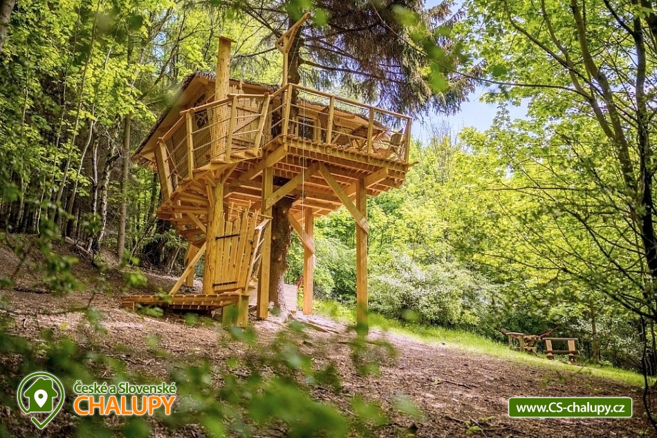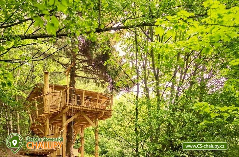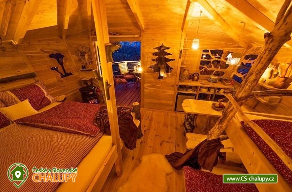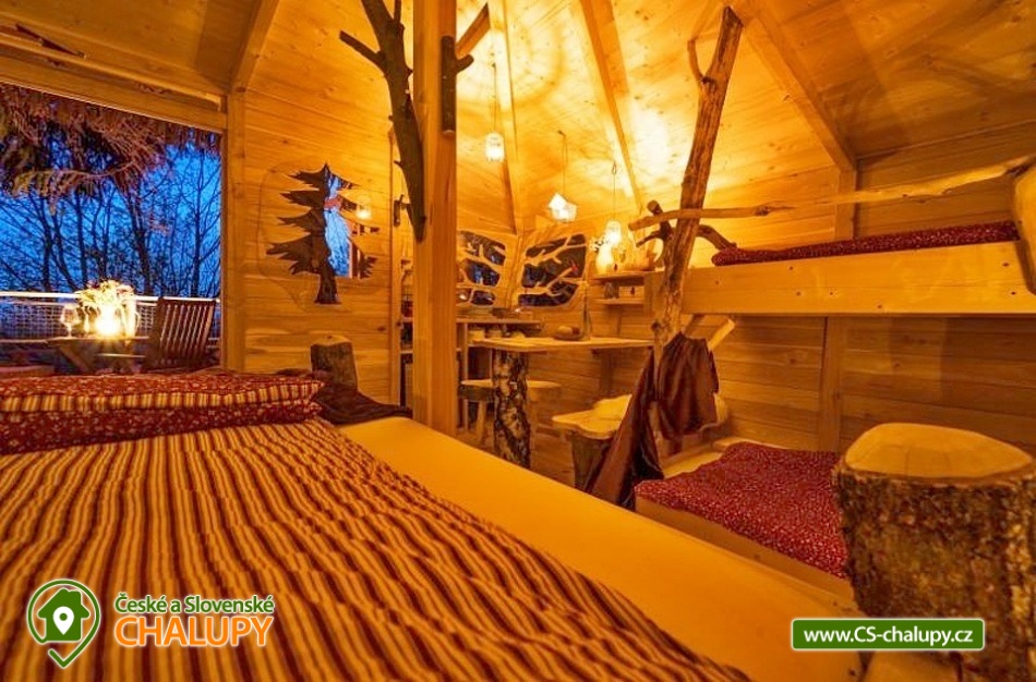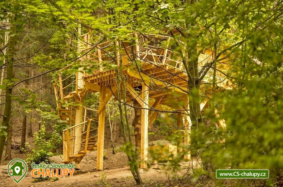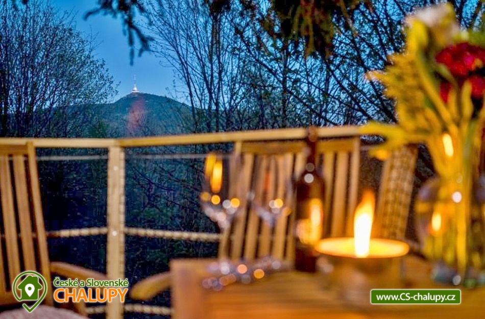 Glamping v lese - Treehouse a sauna - výhled na Ještěd. Treehouse nabízí unikátní typ trávení dovolené vysoko v koruně majestátního smrku, s úžasným průhledem z prostorné terasy na dominantu hory Ještěd a do ševelících listů stromů hustého lesa. Užívat si můžete také venkovní saunu. Treehouse je bez elektrické energie, přesto luxusně vybaven. Je postavený v dokonalém souladu s okolní hornatou přírodou a připravený poskytnout maximální komfort tak, abyste byli ze zážitkového ubytování skutečně "na větvi". Prostor poskytuje příjemné ubytování se snídaní pro až 4 osoby (z toho max. 3 dospělí) – celkem pro 2 osoby na manželském lůžku s výhledem do korun stromů přímo z postele, a 2 osoby na útulné patrové posteli. Treehouse je vybavený kuchyňským koutem s jednoplotýnkovým vařičem, malou lednicí, kompletní sadou nádobí a jídelním stolkem s lavicí. Po domluvě lze naplnit lednici vyzrálým naloženým masem, grilovací zeleninou nebo marinované sýry na gril s rajčátky. Ráno pro vás může být připravena snídaně (čerstvé pečivo, sýry a uzeniny, poctivý jogurt s cereáliemi nebo míchaná vejce s cibulí a slaninkou a k tomu domácí čaj nebo vynikající káva). Zatopit si můžete ve stylovém litinovém krbu s automatickou funkcí, který večer dokreslí útulnou atmosféru a spolehlivě vyhřeje treehouse v chladnějších nocích. Objekt není napojen na elektřinu ani vodu, přesto si večer lze posvítit led svítidly a vykoupat se můžete v přírodní lesní sprše se studenou vodou nedaleko vyhlídkového posedu. Voda do přírodní sprchy je čerpána z pramene přímo na pozemku. Zásoba pitné vody je samozřejmostí. V korunách stromů, se také nachází ekologické WC. Tradiční kadibudka v soukromí lesa se nachází nedaleko. Během ubytování je k dispozici káva, čaj, cukr, sůl, koření, smetana, ručníky, osušky, vymazlené chodící spací pytle (pohodlné posezení na terase i za chladnějších nocí), svíčky, pepo, zapalovače a knihovnička. Wellness v srdci přírody si lze užívat v privátní sudové sauně s kamny na dřevo. Venkovní posezení na stylovém lesním nábytku je doplněno o ohniště a grilovací mříž. Dřevo si můžete naštípat sami. Sekyrka a pilka je k dispozici. K prozkoumávání okolí poslouží dalekohled, kterým dohlédnete až na vrchol Ještědu. K pozorování si můžete udělat výbornou kávu, kterou si připravíte v moka konvičce. Večer si můžete zpříjemnit s některou ze zábavných stolních her nebo můžete skočit do luxusních spacích pytlů a se sklenkou pozorovat noční Ještěd i při chladnějších dnech. Vyzkoušet můžete i svůj balanc na Slackline, nebo svoji pevnou ruku při lukostřelbě. Parkovat lze 800 m od Treehousu. V okolí Treehousu možnost turistiky, cykloturistiky, koupání, houbaření, rybaření a lyžování. V blízkosti je také jízdárna, golfové hřiště a in -line stezka. Nedaleko Treehousu se nachází Lesopark Horka - volnočasový areál pro celou rodinu. Po domluvě lze zajistit vyhlídkový let anebo jízdu na koloběžkách z Ještědu, kolem treehousu až do Kryštofova údolí. Napojení na turistickou Ještědskou hřebenovku je vzdálené necelých 150m lesní pěšinou. Z ní vedou nepřeberné cesty Ještědským přírodním parkem. Mezi možnosti koupání patří např.: vodní nádrž Hamr na Jezeře, koupaliště Kryštofovo Údolí, aquapark Centrum Babylon - Liberec, plavecký bazén Liberec, Vesecký rybník - Tajch, přehrada Harcov, koupaliště Obří sud - Javorník, vodní nádrž Horka - Stráž pod Ralskem, atd. V zimním období blízká lyžařská střediska: Ještěd, Světlá pod Ještědem, Dolní Pláně, Vesec, Obří sud - Javorník. K výletům láká příroda Jizerských hor, Ještěd, ZOO a Botanická zahrada Liberec, Kryštofovo údolí, Kouzelné Lázně Kundratice, Zámek Nový Děvín či Zámek Nový Falkenburk. Přijeďte si odpočinout od shonu všedního života, nabrat síly a zažít něco nevšedního. Těšíme se na Vás u nás.
