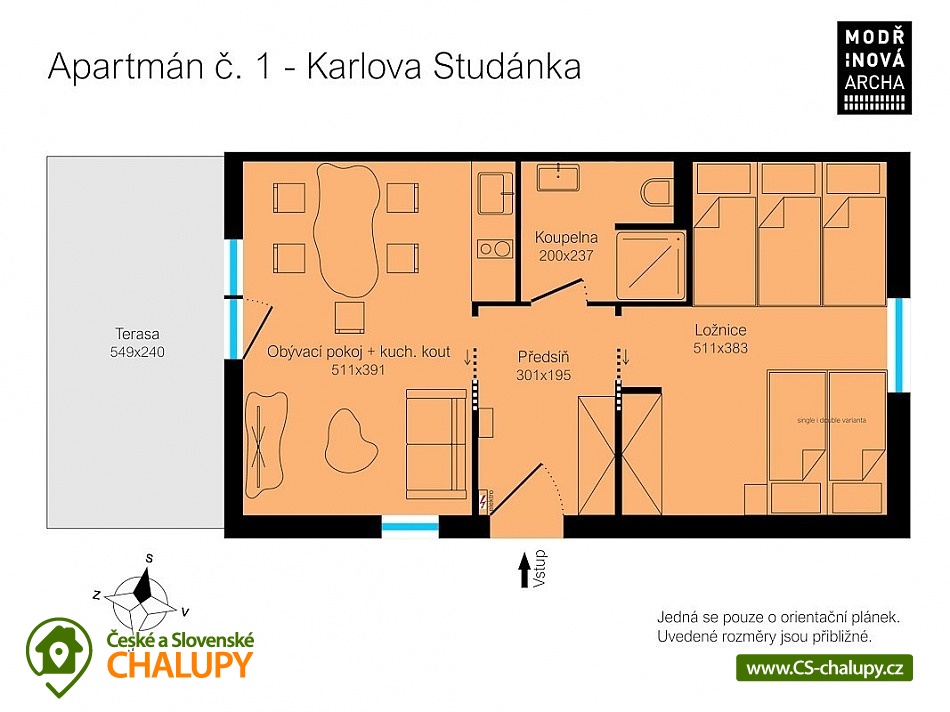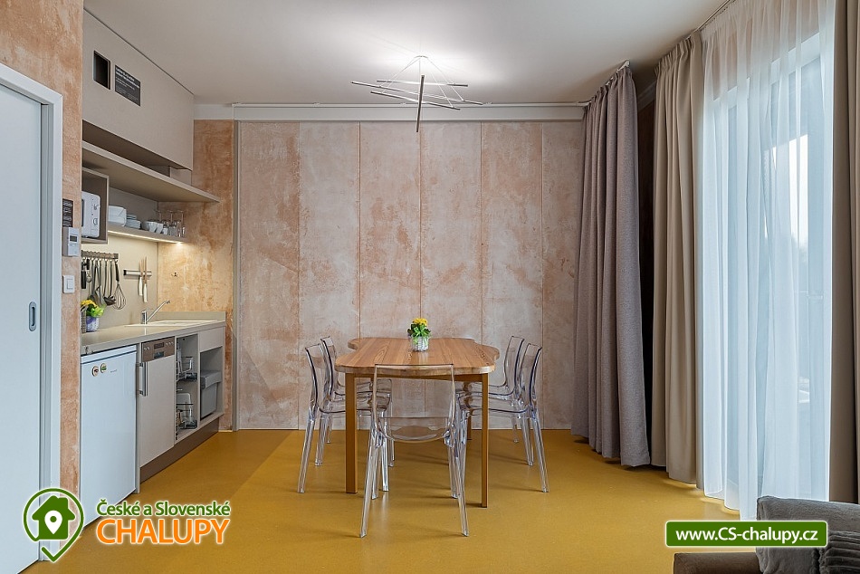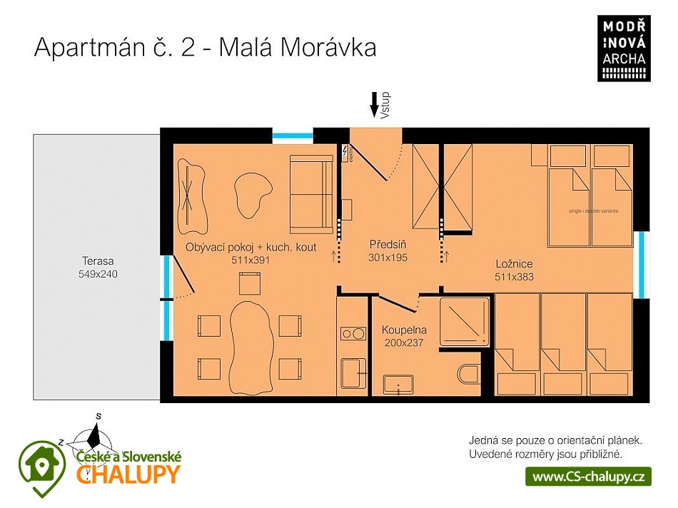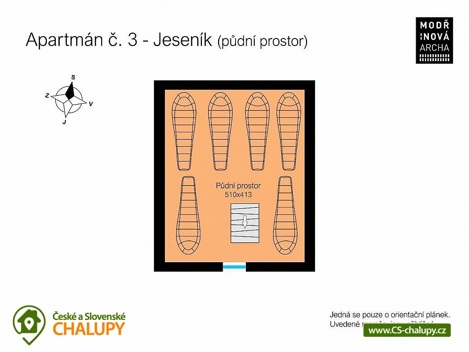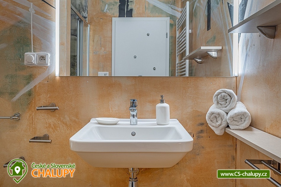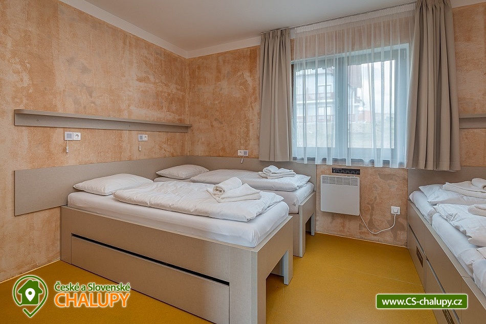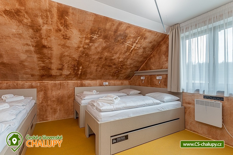 Horská chata se saunou - Zveme vás na nezapomenutelný pobyt v srdci Jeseníků, kde se pojí moderní pohodlí s nádhernou přírodou. Horská chata - Modřínová Archa pro až 36 osob s finskou saunou. Chata na krásném místě - Horní Václavov u Bruntálu - v centrální části Hrubého Jeseníku, poblíž Malé Morávky, Kopřivné a Karlova. Chata leží u lesa, na jihozápadním svahu, s krásnými výhledy do údolí Moravice a na protilehlé svahy v okolí Nové Vsi. Svůj název získala chata díky modřínovému obložení, které jí dodává charakteristický vzhled. Chata je dvoupodlažní budova a je ekologickou dřevostavbou s vysokým koeficientem zateplení. Chata poskytuje komfortní ubytování i pro větší skupiny. Plná kapacita objetu je 28 osob (+8 osob s možností spaní v podkrovním prostoru ve vlastním spacáku). Kryté terasy jsou přirozenou součástí všech apartmánů. Mají posezení, osvětlení a elektrickou zásuvku a je tak možné na terase vařit i grilovat. Nádherné výhledy do údolí Moravice a protilehlé stráně jsou jak z life stylového magazínu a jen umocní pohodovou atmosféru Vaší dovolené. Apartmány v 1. patře jsou dostupné po venkovním osvětleném dřevěném schodišti. Součástí zádveří apartmánů je zátěžový koberec, úložné prostory na oblečení (včetně ramínek), praktické plastové odkapávače na boty a malým dětem nedostupný uzavřený prostor s technickými a úklidovými pomůckami. V apartmánech v 1. patře jsou dřevěné točité schůdky do podkroví. Naproti vchodu do apartmánu je vstup do koupelny, po stranách jsou pak vstupy posuvnými dveřmi do obývacího pokoje a ložnice. Ložnice všech apartmánů mají velké útulné třílůžkové "letiště" a dvě samostatně stojící postele s možností uspořádání twin/double. Všechny postele mají samostatnou elektrickou zásuvku, noční světlo a mobilní bodové světlo pro čtení. V kombinaci s WiFi je to ideální stav pro ničím nerušené večery, kdy se děti zabaví na dlouhé hodiny a když usnou, tak se nic neděje. Ve všech postelích jsou 22 cm vysoké pohodlné matrace vyšší tvrdosti. Povlečení je Vám k dispozici během pobytu, jeho složení je z 80% bavlna a z 20% polyester. Každé ze tří lůžek letiště má šířku 90 cm, dvě samostatné postele pak mají šířku každá 80 cm. Apartmány v 1. patře mají přidanou hodnotu v podobě podkroví, které je dostupné z apartmánu o dřevěných točitých schůdcích. Podkrovní prostor přímo pod střechou může být přes den místo, kam se rády zašijí děti, přes noc pak může sloužit jako další ložnice. Vzhledem k omezeným možnostem přístupu je prostor vybaven pouze kobercem, osvětlením a radiátorem; přespat zde může až šest osob s vlastními spacáky. V každé koupelně je k dispozici velký sprchový kout, WC a umyvadlo. Kromě podlahového topení je za dveřmi také široký žebříkový radiátor se závěsy na usušení prádla. Kromě běžného osvětlení má koupelna automaticky spínané tlumené noční světlo. Jsou Vám k dispozici příjemné bílé froté ručníky a osušky ze stoprocentní bavlny s vysokou gramáží. Koupelna je vybavena dále fénem, praktickými poličkami a odpadkovým košem. Budova Modřínové Archy je nadstandardně zateplena, vytápění zajišťují přímotopy řízené centrálním termostatem s možností manuálního nastavení každého radiátoru samostatně. Vzhledem ke klimatickým podmínkám není klimatizace potřebná. Okna všech apartmánů jsou v letním a podzimním období osazena sítěmi proti hmyzu. Každý apartmán má vlastní parkovací místo přímo u budovy Modřínové Archy. Parkování je zdarma. Obývací pokoje všech apartmánů jsou orientovány na jihozápad a díky velkým francouzským oknům na terasu jsou většinu dne prosluněné. Součástí pokojů je kuchyňský kout vybavený základními spotřebiči pro přípravu vlastních jídel – chladničkou s malým mrazákem, dvěma jednoplotýnkovými indukčními deskami, mikrovlnnou troubou, rychlovarnou konvicí a topinkovačem. Vařit a ohřívat jídlo můžete ve třech hrncích různé velikosti nebo pánvi, základní kuchyňské náčiní je Vám k dispozici: sítko, struhadlo, cedník na těstoviny a zeleninu, naběračka, obracečky, metlička, nože, nůžky, otvírák na láhve, na konzervy a lis na česnek. K ruce máte utěrky a zásobníky na tříděný odpad. Pro servírování využijete jídelní sety zahrnující talířky, příbory, větší šálky na čaj a menší na espreso, skleničky na vodu a na víno. Venkovní prostory poskytují ohniště s možností zakoupení nachystaného dřeva za drobný poplatek. Hostům chaty je k dispozici soukromá sauna pro až 8 osob. Objekt sauny se nachází hned vedle Modřínové Archy. Sauna má odpovídající zázemí, k dispozici je Vám sprcha, toaleta a odpočívárna s hvězdnou oblohou. Sauna má velkoformátová okna s polopropustným sklem. Ve dne není zvenku dovnitř sauny vidět. Pro pohodovou relaxaci si nastavíte oblíbenou barvu a intenzitu osvětlení. Prožijte nezapomenutelné chvíle s přáteli či rodinou, relaxujte v sauně po dni stráveném v horách a užijte si krásy místní přírody. Ať už jde o aktivní dovolenou, relax či výlety do okolí, naše chata vám poskytne ideální podmínky. Rezervujte si svůj termín a přijďte si užít pohostinnost Jeseníků v moderním stylu. Těšíme se na Vás!