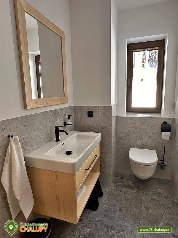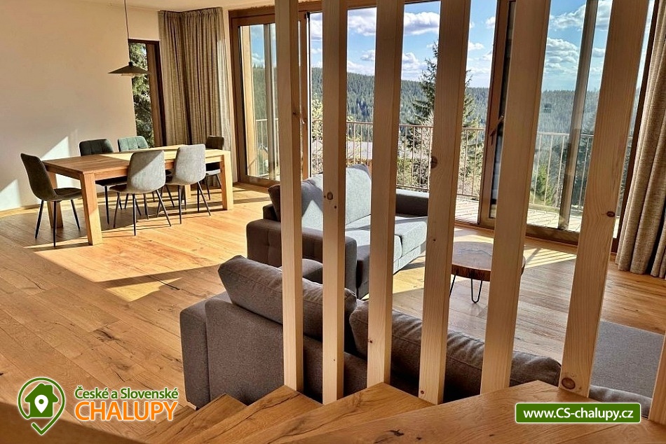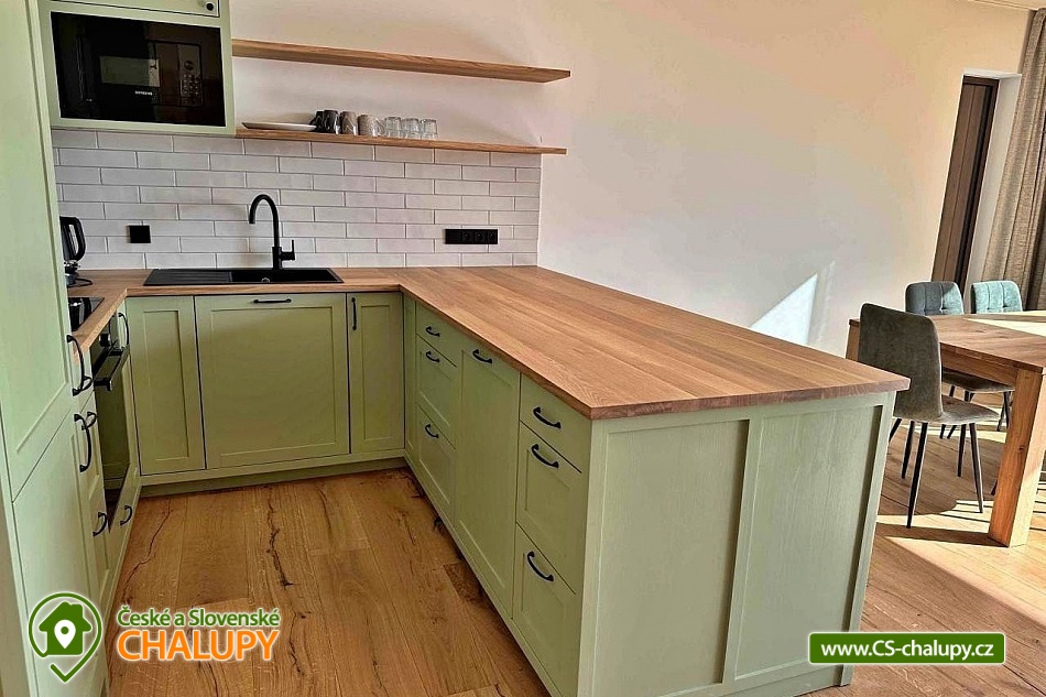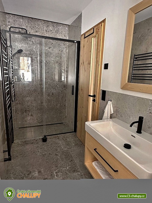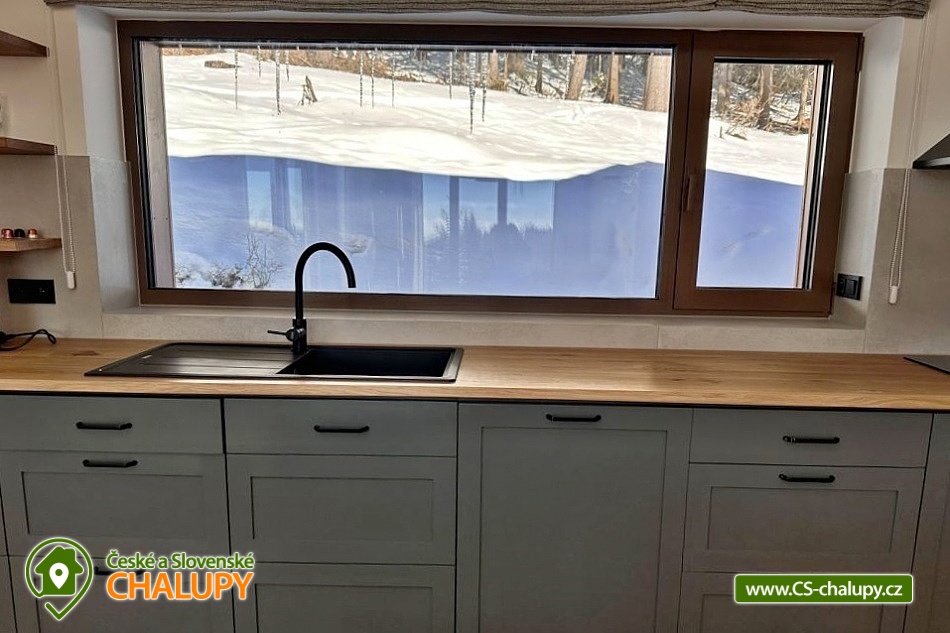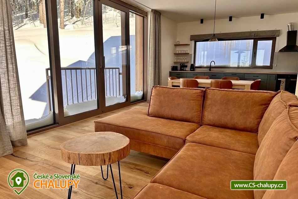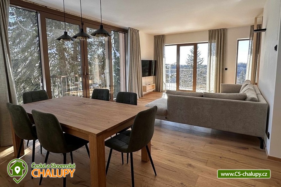 Mountain chalet with sauna by the road to Zlaté návrší in the Krkonoše Mountains - Horní Mísečky - Vítkovice - Špindlerův Mlýn. Chalet with 3 apartments (each apartment is for 5 people and has 2 separate bedrooms). The total capacity of the chalet for rent is up to 18 people - it is possible to book either individual apartments (3x 5 people) or book the entire building including a room for 3 people. Generous and stylishly furnished spaces with a unique view are illuminated by French windows and a balcony. DESCRIPTION of the apartments: Duplex apartments for 5 people with an area of 80 m2 with two bedrooms, a living room with a fully equipped kitchen and two toilets. Master bedroom - king size bed 180x200 cm and a separate single bed. Second bedroom - 2x single beds. Additionally, a room for max. 3 people can be ordered for the apartment by arrangement (if you have, for example, more children or teenagers and are looking for more privacy) - this separate room with a shower has an area of 9 m2. Sanitary facilities: Each apartment has a bathroom with a toilet and one day toilet. Another 2 day toilets are in the public areas of the building. Heating: Underfloor heating. Building equipment: Fully equipped kitchen for cooking and baking - large dining table, Nespresso coffee maker, electric kettle, oven, dishwasher, refrigerator and freezer. Also TV, sauna, ski room with boot dryer, laundry room, children's climbing wall, ping pong. Non-smoking cottage. Pets are not allowed. SURROUNDINGS: Swimming options - Špindlerův Mlýn aquapark, Labská dam, Vrchlabí aquacentre and Jilemnice swimming pool. Horní Mísečky is part of the Špindlerův Mlýn ski area with 27 km of slopes divided into the centers of Horní Mísečky, Medvědín, Svatý Petr and Hromovka. Horní Mísečky is an ideal place for those looking for peace and skiing on gentler and wider slopes. A newly built four-seater chairlift leads to its peak, Medvědín. In the upper part there is a fun trek with bumps, waves and banked turns, and in the middle part there is a Burton snowpark for skiers and snowboarders, served by a separate lift. In the lower part of the slope you will find a ski and snowboard school and a winter sports equipment rental. Skiing, Alpine skiing, Cross-country skiing trails. Hiking, Mountain biking. Zlaté návrší, Pramen Elbe, Pančavský vodopád, Elbe hut, Sněžné jámy. We look forward to seeing you there.