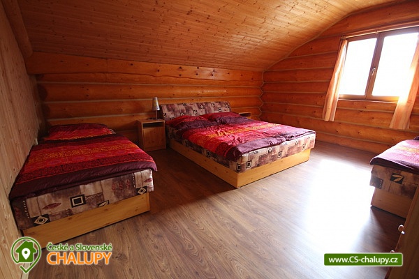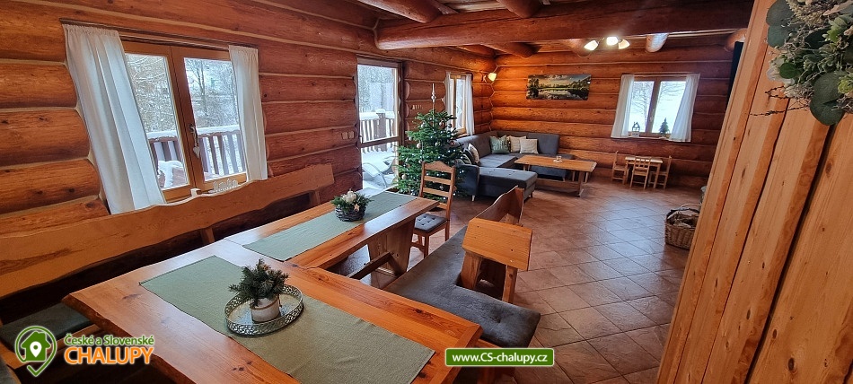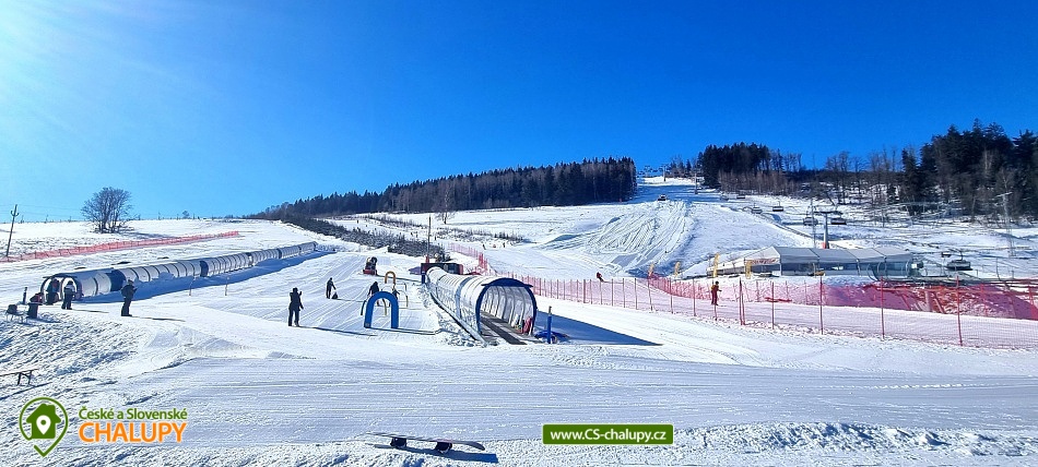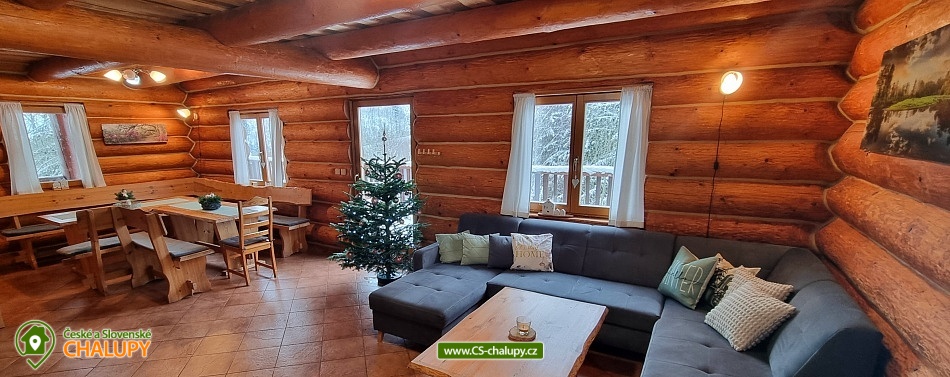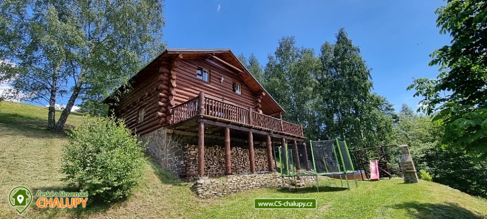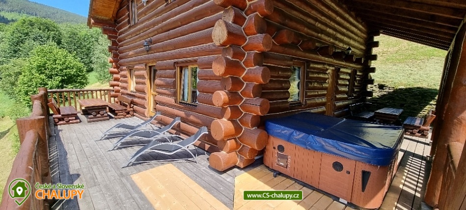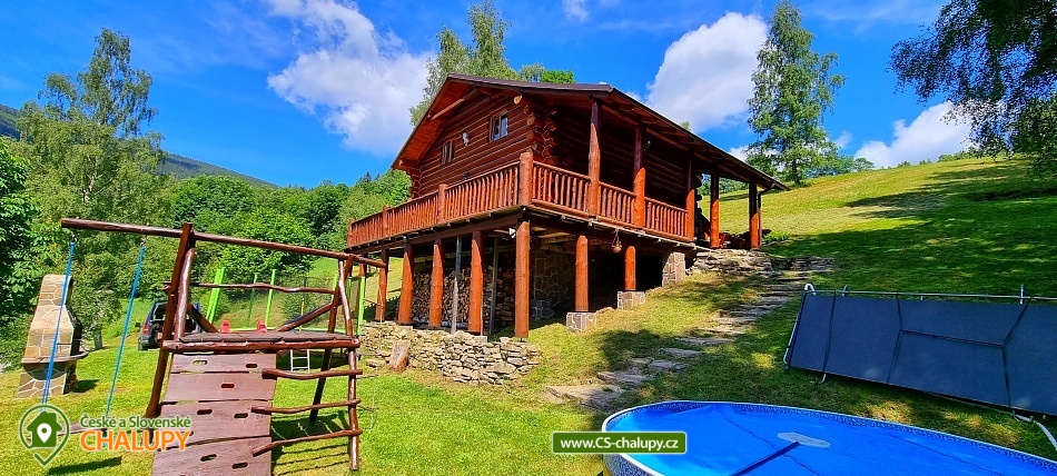 Horský kanadský srub Stříbrnice - cottage for rent Jeseníky. Our comfortable Stříbrnice Canadian Mountain Lodge is located near the ski slope 800 m long and the mountain stream at the foot of Králický Sněžník in the small village Stříbrnice, 3 km from the Old Town under Sneznik. Inside the cabin is a fully equipped kitchenette (ceramic hob, dishwasher, electric oven, fridge, microwave), large living room, fireplace, TV and SAT. There are 3 bedrooms on the floor of the cabin (each with 4 beds, 2 extra beds in the common room on the sofa bed that is on the ground floor). On each floor there are 2 bathrooms with shower hydromassage box and toilet. On cold days a wood fireplace with a hot-air exchanger can be used. At the cottage there is an open veranda with loungers and view of the surroundings, fireplace with sitting, grill, swing, garden furniture, terrace, outdoor trampoline diameter 4 m, outdoor heated pool (diameter 3.6m x 1.1m). There is a storage room for bikes and skis. On the terrace of the cabin is a heated whirlpool with lighting and a number of massage jets for up to 6 people.