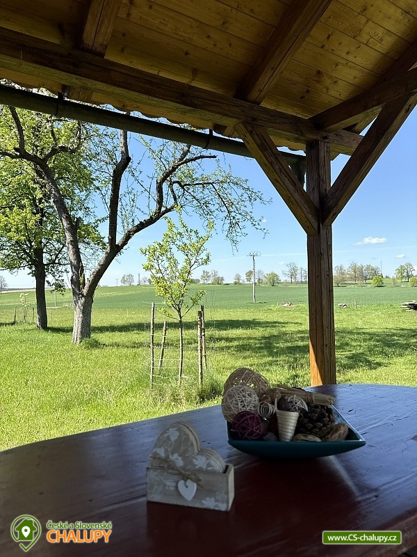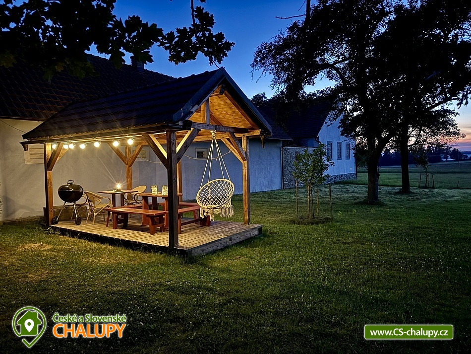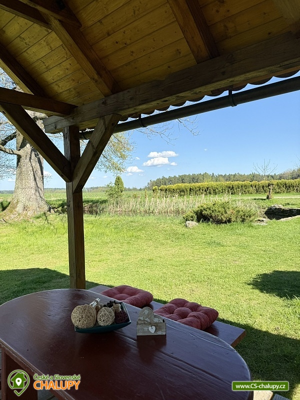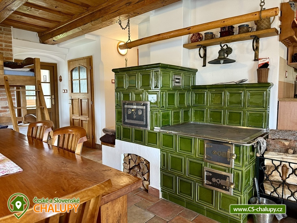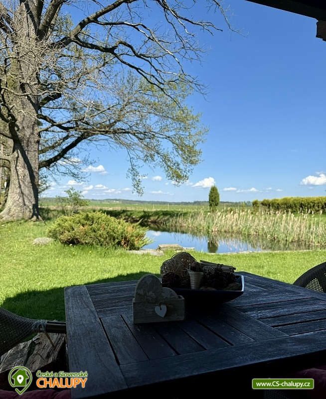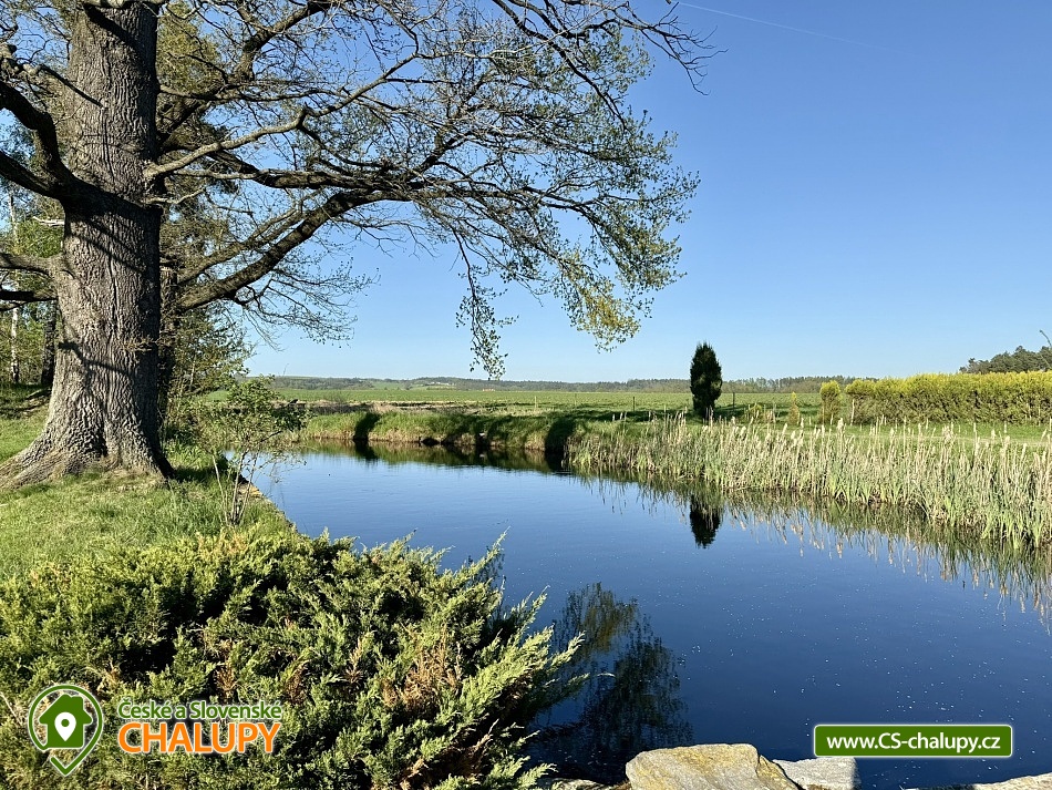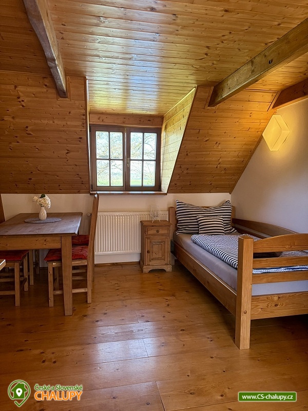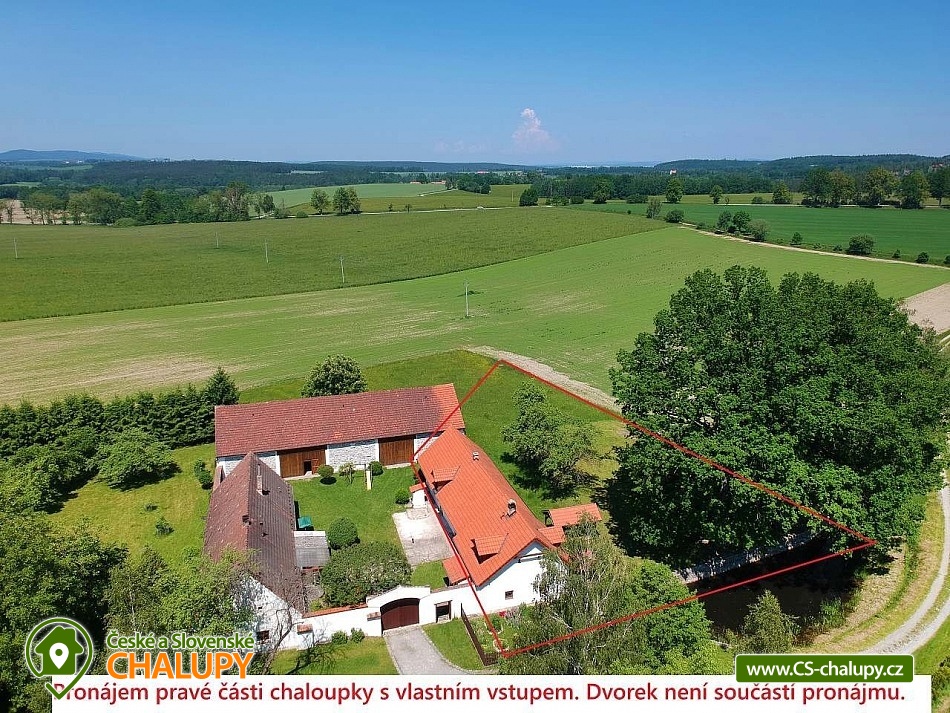 The stylishly furnished Chalupa Větrník is located secluded by the forest in the small village of Dolní Stropnice, in a quiet part of the village of Římov in South Bohemia. You can look forward to accommodation in a beautiful country style providing relaxation in the heart of picturesque nature with a forest, a pond and a spacious garden. In the surrounding picturesque countryside, you will appreciate the many opportunities for cycling and nature walks. Admirers of historical monuments, of which there are innumerable in the vicinity, will also get their money's worth. Chalet Větrník offers accommodation for 6 people. A separate right part of the cottage with its own entrance is available to guests. The left wing is not for rent for temporary use by family members. Guest privacy is maintained. The dominant feature of the cottage is the living room with a beautiful tiled stove. There is a bunk bed in the living room, which can be used for up to 3 people by arrangement. The room also includes a dining table, a radio and a fully equipped kitchen (electric oven, induction hob, microwave oven, kettle, fridge, toaster, etc.). In the attic there is a spacious triple bedroom (2 x single beds) with a sitting area, dining table and TV. The social facilities include one ground floor bathroom with shower and toilet and 1 separate toilet in the attic. There is a hair dryer, toiletries and cosmetics, towels and bath towels. Heating is provided by a tiled stove with distribution to the entire living area. From the living room there is direct access to the outdoor terrace and garden with a large grassy area and a small pond. There is also a pergola with seating, a fire pit and a grill. You can park directly at the building. Cycling, hiking, mushroom picking, fishing and swimming are available nearby. Swimming options include, for example: Štilec pond, Velešín swimming pool, Borovany - Lazna swimming pool, Besednice swimming pool, Velký pond Trhové Sviny, Quarry Trhové Sviny, Dobrá Voda near České Budějovice, Na Hlíně pond, Třísov swimming pool, České Budějovice - swimming stadium, swimming pool České Budějovice, etc. The secluded cottage near the forest is located in a great location for trips. In the vicinity, you can visit the Pilgrimage Site of Římov, the Zlatá Koruna Monastery, the ruins of the Pořešín Castle, Dívčí Kamen, Dvorec ZOO or the monument to Jan Žižka from Trocnov. The nearby cities of České Budějovice, Hluboká nad Vltavou, Český Krumlov, Lipno nad Vltavou and Třeboň are also attractive. We look forward to seeing you here.