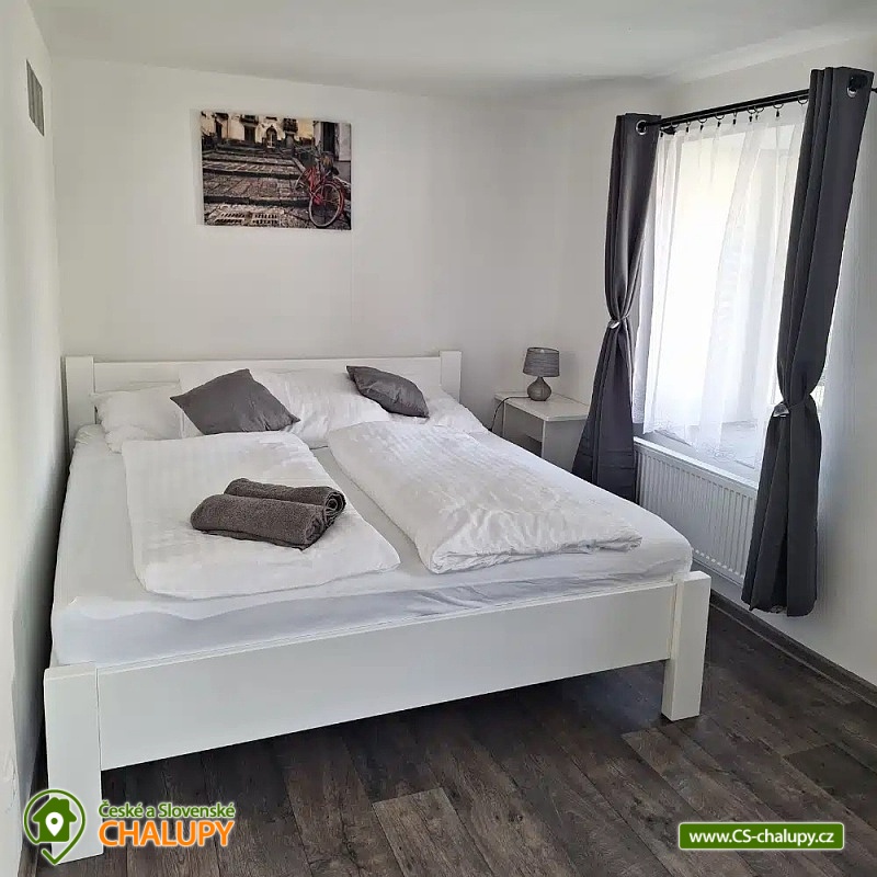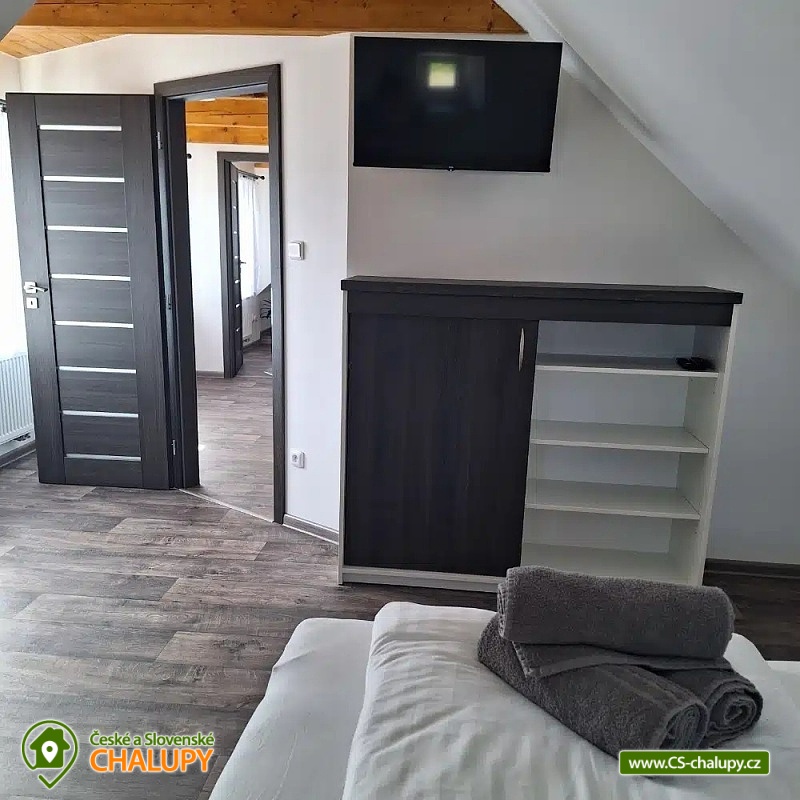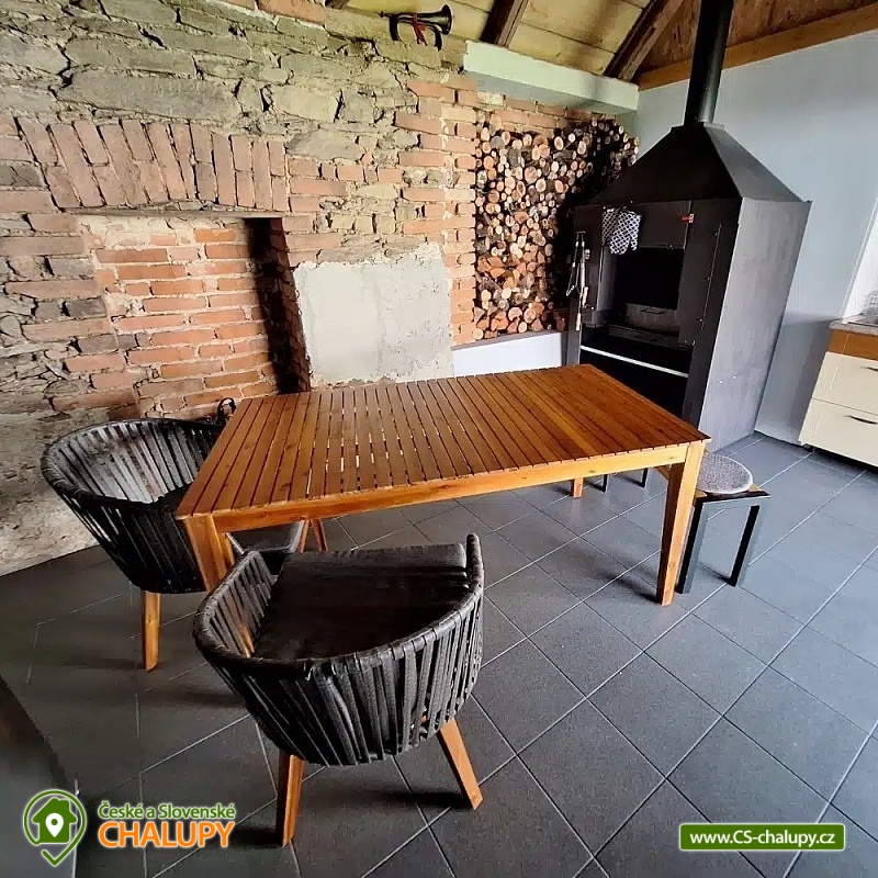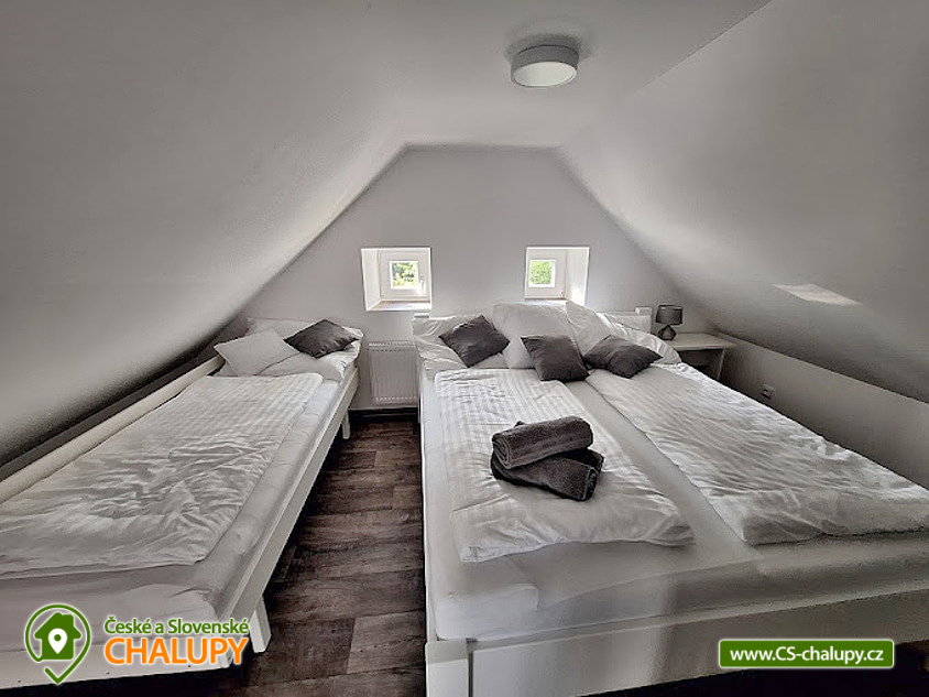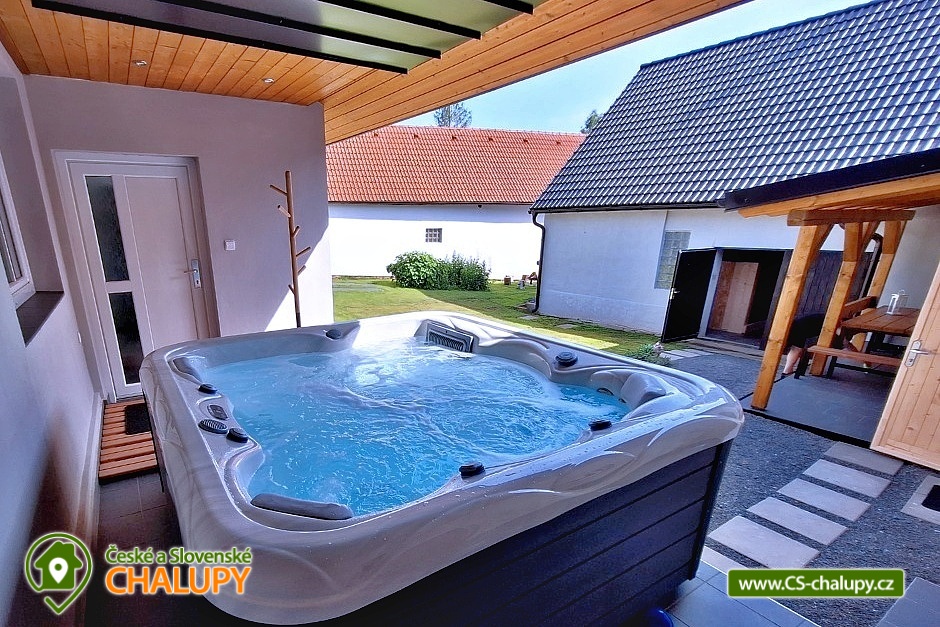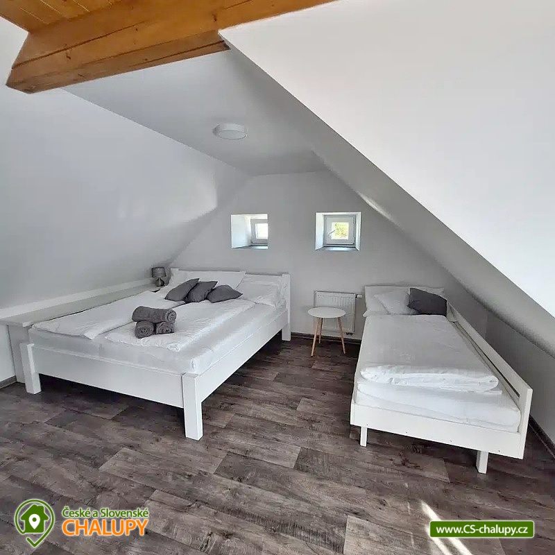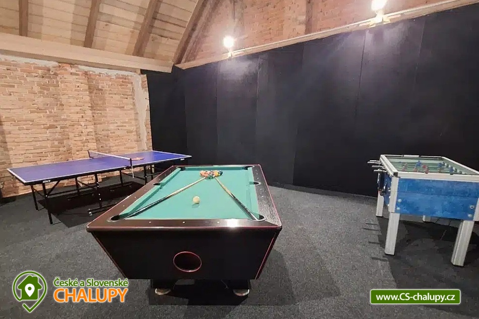 The stylishly furnished renovated Chalupa Jedlany is located by the pond in the small village of the same name near the popular tourist town of Tábor in South Bohemia. You can look forward to the complete privacy of the fenced garden, where you can enjoy the hot tub and sauna, game room, barbecue and outdoor seating. Chalupa Jedlany offers accommodation for 10 people in three bedrooms, a total of 8 fixed beds and two extra beds are available with a sofa bed and its size is more suitable for children under 12 years of age. On the ground floor there is a double bedroom (1x double bed). There are two more bedrooms in the attic, one of them has three beds (1x double bed and 1x single bed) and the other has five beds (1x double bed, 1x single bed and 1x sofa bed for 2 children). Towels and bed linen are provided. All bedrooms have a TV with SAT. On the ground floor, you enter the entrance hall, from which you can enter the walk-through fully equipped kitchen (glass ceramic hob, electric oven, fridge with freezer, dishwasher, press, electric kettle, washing machine, table, 4 chairs and 3 bar stools). . From the kitchen you enter the living room with a comfortable sofa set, TV+SAT and radio (gramophone). The social facilities include two bathrooms. One is on the ground floor with a shower, sink and toilet, and the other is in the attic with a bath, sink and toilet. Heating is provided by a heat pump and a fireplace stove. WIFI internet connection is available throughout the building. Around the cottage is a fenced garden (300 m2) providing a great relaxing environment. There is an acrylic hot tub for 5 people, a pergola with outdoor seating and a portable fire pit. In the former barn you will find the so-called barbecue room - a sitting room with a built-in grill and a garden kitchen (fridge with freezer, electric kettle and cold water), which is followed by a spacious games room with billiards, table tennis and table football. From the pergola you also enter the sauna area, where, in addition to the Finnish sauna itself for 4 people, there is a shower, a sink and a toilet. An above-ground circular pool (diameter 3.6 m, depth 0.8 m) is also available in the summer months. You can park directly at the building. In the surroundings of the cottage, hiking, cycling, swimming, fishing, mushroom picking, cross-country skiing and skiing are possible. Children will appreciate that there is a municipal playground just 50 m from the cottage. There are tennis courts nearby. Swimming options include, for example: Tábor pool, Košín I water reservoir, Šebor pond, Mladá Vožice swimming pool, Jordán water reservoir, Tábor swimming pool, Knížecí pond, Pohoda swimming pool, Jistebnice pond, Smolík pond, Nový pond Jistebnice, Pilský pond Jetřichovice, etc. In in winter, the nearby ski resort - Horní Kouty - Radvánov is available. The historical center of the town of Tábor, the ruins of Šelmberk Castle, the ruins of Borotín Castle, the Chotoviny Museum of Historic Vehicles and Motorcycles, the historical center of Bechyně, the Choustník Castle, the Chýnové Caves, the Stádlecký chain bridge or the Monínec sports and recreation area are alluring for trips in the area. We look forward to seeing you here.