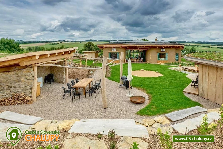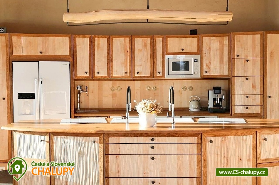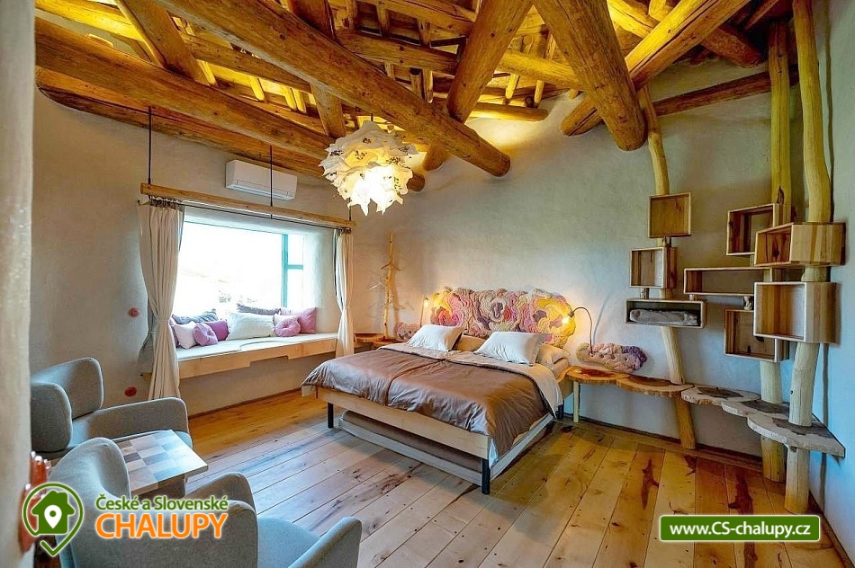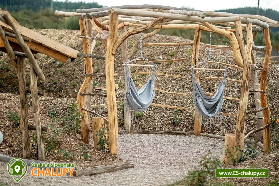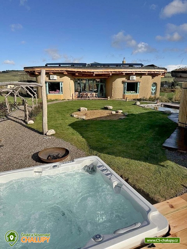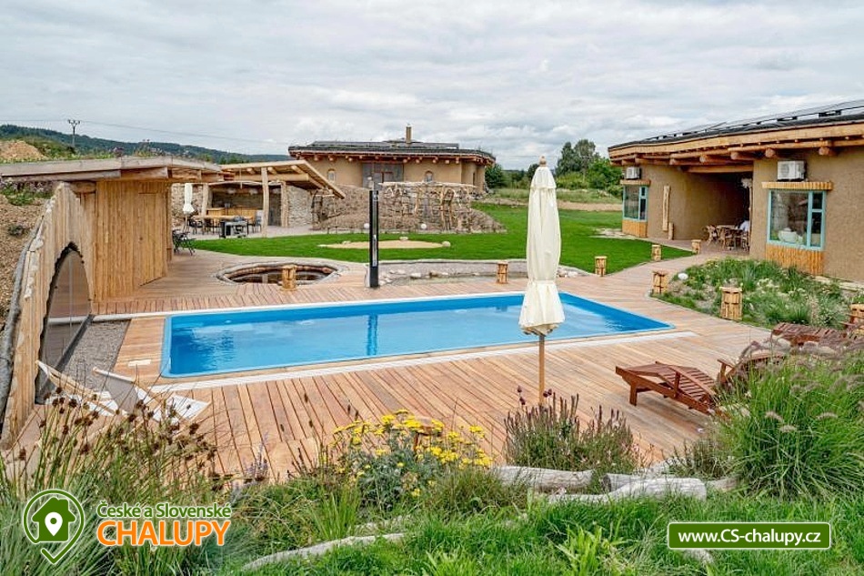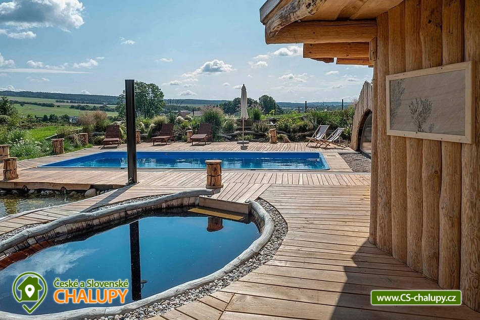 Luxury log cabin with wellness and swimming pool (outdoor heated saltwater pool with roof, Finnish sauna, infrared sauna and jacuzzi) near Orlické Podhůří and Potštejn Castle - beautiful nature of the Podorlické region near the towns of Ústí nad Orlicí and Letohrad. The capacity of the building is for up to 15 people in 5 bedrooms. You can look forward to original architecture reflecting the shapes of the surrounding landscape and an unconventional design from massive materials to fine textiles to functional details ensuring maximum comfort. The heart of the house is a spacious common room with a massive round table in the middle of the room, which is illuminated by a large round skylight with a view of the sky. The eastern alcove of the room invites you to lounge on the sofas and the southern one invites you to sit by the fireplace. Large glass entrances, a skylight and two roofed terraces - a sunny southern and a romantic western - connect the interior with the surrounding garden and pool, so you can enjoy nature all day long. The room includes a large, fully equipped kitchen (two dishwashers, a convection oven, a microwave, a kettle, a coffee maker, a tap with the possibility of tapping a keg of beer or lemonade, an American fridge + another fridge in the utility room). The island with two sinks and two hobs is oriented so that you can enjoy the view of the garden while cooking and still be part of the action in the room. You can make the evening more pleasant with a home cinema. The entire room can be adapted for social events and a dance floor. The dominant features of the log cabin are three stylish double bedrooms - the moss bedroom with a view to the east will enchant you with tones of green, the grassy bedroom facing west offers views of meadows and pastures, and the pink bedroom with romantic elements inside and outside the window has a view of the rose garden. In the grassy and pink bedrooms, you can also laze in the window niche. The moss and grass bedroom includes one smaller double bedroom (so-called “den”), which is suitable for children due to its size. The den is separated from the bedroom by a sliding door, which ensures privacy for both children and parents. A cot is available for rent. Each of the three bedrooms has its own bathroom with a shower and toilet. The cabin also has a washing machine, dryer, and wine cellar. Heating is provided by central wall heating, and in the common room by a fireplace. Each room has air conditioning and there is underfloor heating in the bathrooms. WIFI internet access is available throughout the building. Outside, a garden full of flowers, benches, and pleasant views stretches around the cabin. There is a relaxation area with hammocks. There are two terraces for sitting. There is a covered seating area, a grill, a fireplace, an outdoor kitchen, and a bike shed. The outdoor areas attract with their private wellness with a heated pool, sauna and infrared sauna with a relaxation area or a jacuzzi. A popular attraction, not only for children, is the natural paddling pool made of stones, which can be rearranged according to your wishes and enjoy various water features. Parking is available directly at the property. In the vicinity of the log cabin, there is the possibility of hiking, cycling, swimming, skiing, cross-country skiing and mushroom picking. There are tennis courts and a riding stable nearby. Swimming options include: Aquapark Ústí nad Orlicí, Swimming pool Ústí nad Orlicí, Swimming pool Brandýs nad Orlicí, Swimming pool Písečná, Swimming pool Letohrad, Aquapark Žamberk, etc. There are nearby ski resorts: Na Dlouhých Honech - Dlouhoňovice, Přívrat, Kunčice u Letohradu - Umbule and others. For trips in the surrounding area, you can visit Letohrad Castle, the Ruins of Kyšperk Castle, Potštejn Castle and Castle, the Vamberk Lace Museum, the Andrlův Chlum Lookout Tower, the Brandýs nad Orlicí Nature Maze or Litomyšl Castle. We look forward to seeing you there.