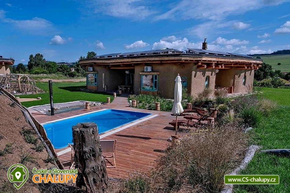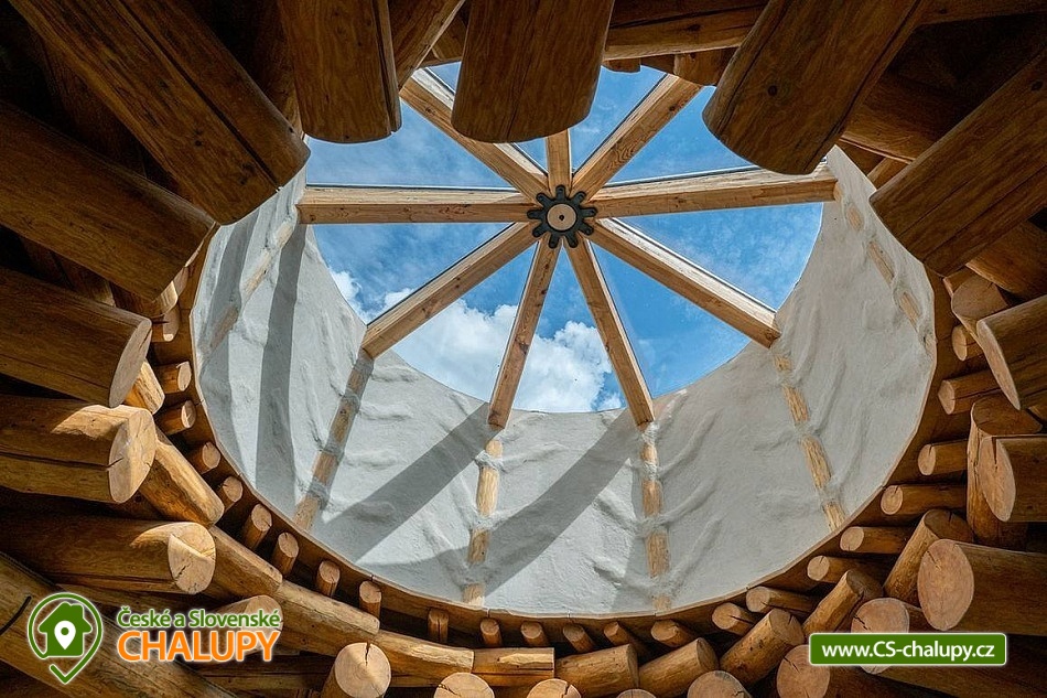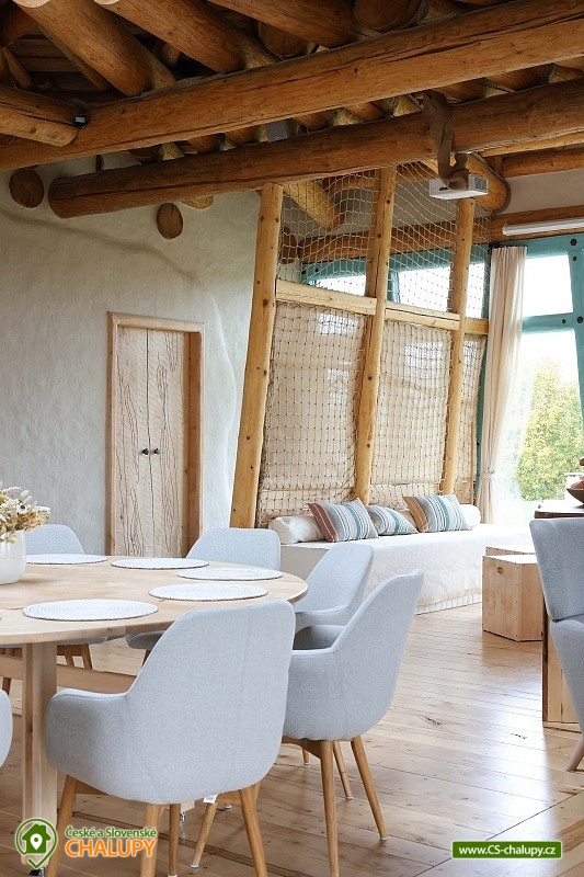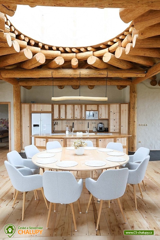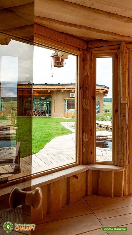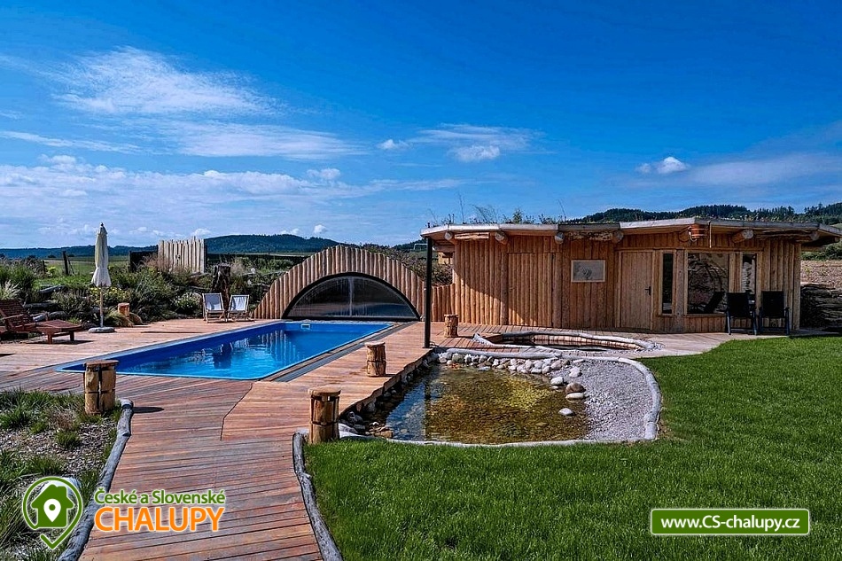 Luxury log cabin with wellness and swimming pool (outdoor heated saltwater pool with roof, Finnish sauna, infrared sauna and jacuzzi) near Orlické Podhůří and Potštejn Castle - beautiful nature of the Podorlické region near the towns of Ústí nad Orlicí and Letohrad. The capacity of the building is for up to 15 people in 5 bedrooms. You can look forward to original architecture reflecting the shapes of the surrounding landscape and an unconventional design from massive materials to fine textiles to functional details ensuring maximum comfort. The heart of the house is a spacious common room with a massive round table in the middle of the room, which is illuminated by a large round skylight with a view of the sky. The eastern alcove of the room invites you to lounge on the sofas and the southern one invites you to sit by the fireplace. Large glass entrances, a skylight and two roofed terraces - a sunny southern and a romantic western - connect the interior with the surrounding garden and pool, so you can enjoy nature all day long. The room includes a large, fully equipped kitchen (two dishwashers, a convection oven, a microwave, a kettle, a coffee maker, a tap with the possibility of tapping a keg of beer or lemonade, an American fridge + another fridge in the utility room). The island with two sinks and two hobs is oriented so that you can enjoy the view of the garden while cooking and still be part of the action in the room. You can make the evening more pleasant with a home cinema. The entire room can be adapted for social events and a dance floor. The dominant features of the log cabin are three stylish double bedrooms - the moss bedroom with a view to the east will enchant you with tones of green, the grassy bedroom facing west offers views of meadows and pastures, and the pink bedroom with romantic elements inside and outside the window has a view of the rose garden. In the grassy and pink bedrooms, you can also laze in the window niche. The moss and grass bedroom includes one smaller double bedroom (so-called “den”), which is suitable for children due to its size. The den is separated from the bedroom by a sliding door, which ensures privacy for both children and parents. A cot is available for rent. Each of the three bedrooms has its own bathroom with a shower and toilet. The cabin also has a washing machine, dryer, and wine cellar. Heating is provided by central wall heating, and in the common room by a fireplace. Each room has air conditioning and there is underfloor heating in the bathrooms. WIFI internet access is available throughout the building. Outside, a garden full of flowers, benches, and pleasant views stretches around the cabin. There is a relaxation area with hammocks. There are two terraces for sitting. There is a covered seating area, a grill, a fireplace, an outdoor kitchen, and a bike shed. The outdoor areas attract with their private wellness with a heated pool, sauna and infrared sauna with a relaxation area or a jacuzzi. A popular attraction, not only for children, is the natural paddling pool made of stones, which can be rearranged according to your wishes and enjoy various water features. Parking is available directly at the property. In the vicinity of the log cabin, there is the possibility of hiking, cycling, swimming, skiing, cross-country skiing and mushroom picking. There are tennis courts and a riding stable nearby. Swimming options include: Aquapark Ústí nad Orlicí, Swimming pool Ústí nad Orlicí, Swimming pool Brandýs nad Orlicí, Swimming pool Písečná, Swimming pool Letohrad, Aquapark Žamberk, etc. There are nearby ski resorts: Na Dlouhých Honech - Dlouhoňovice, Přívrat, Kunčice u Letohradu - Umbule and others. For trips in the surrounding area, you can visit Letohrad Castle, the Ruins of Kyšperk Castle, Potštejn Castle and Castle, the Vamberk Lace Museum, the Andrlův Chlum Lookout Tower, the Brandýs nad Orlicí Nature Maze or Litomyšl Castle. We look forward to seeing you there.