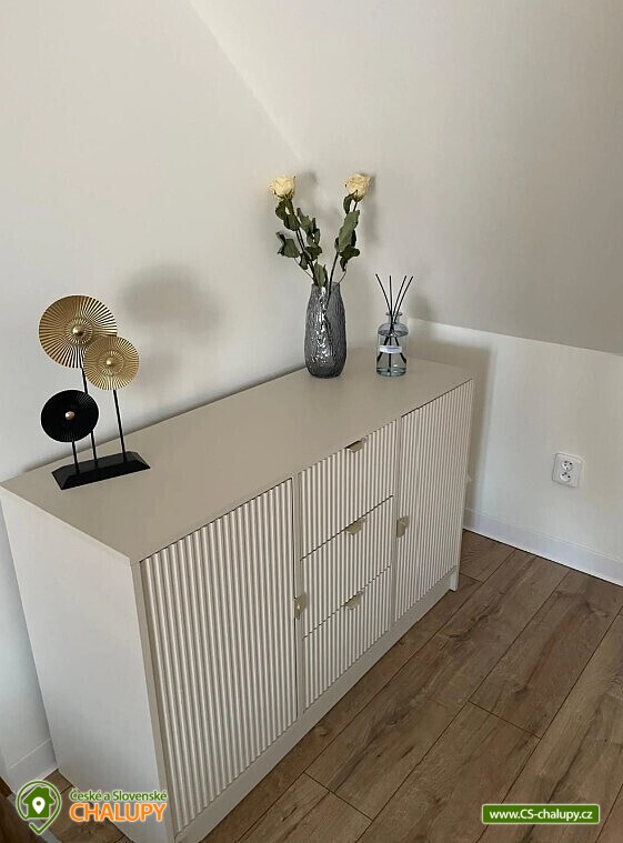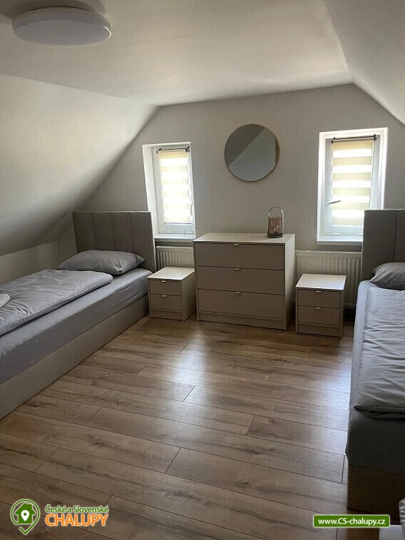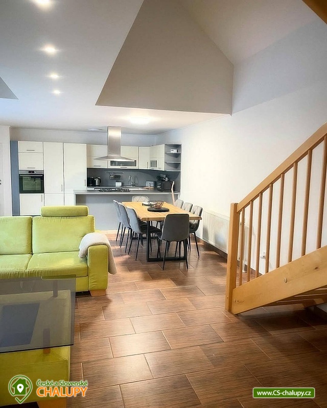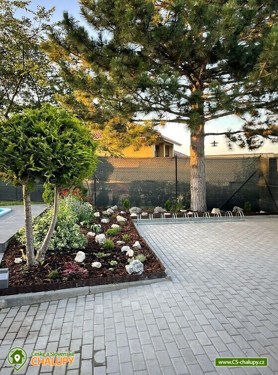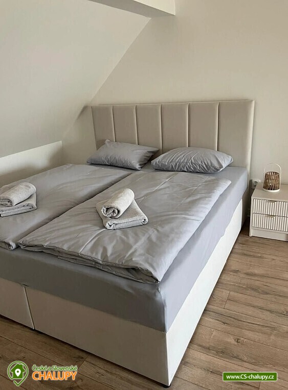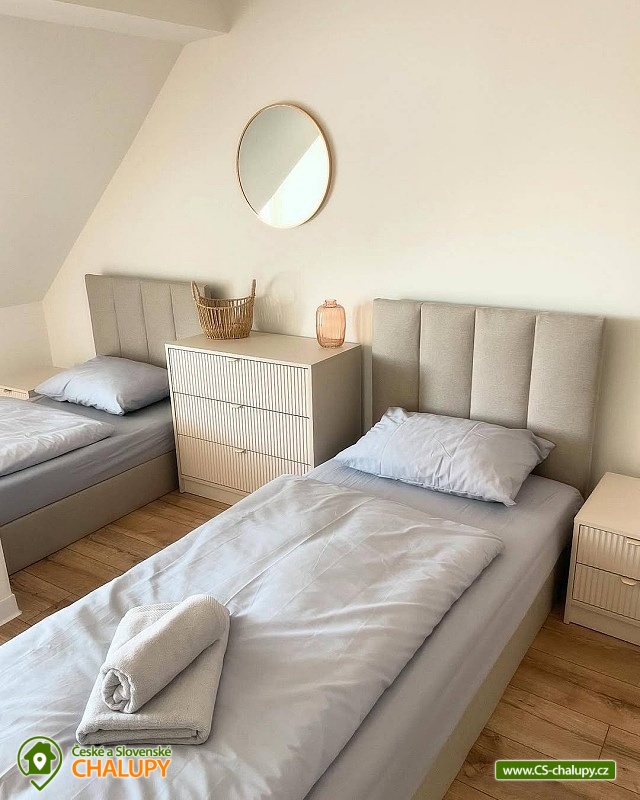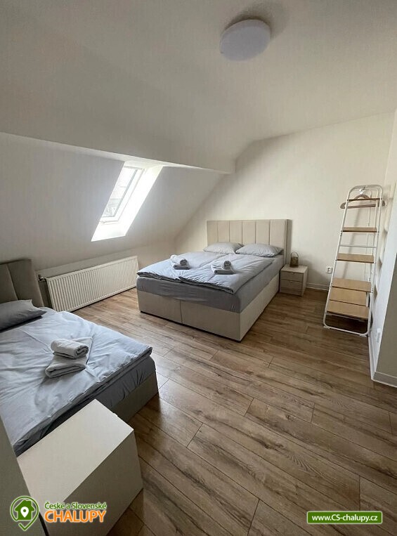 The modern holiday home with a swimming pool is located in the picturesque village of Pavlov in South Moravia. Its location makes it an ideal place for a well-deserved rest, cycling trips, hiking and visits to wine regions. The accommodation is suitable for family holidays, stays with friends and corporate events. The house provides accommodation for 18 people in 5 bedrooms: 1x double room (1x double bed), 1x triple room (1x double bed, 1x single bed), 1x quadruple room (4x single beds), 2x quadruple rooms (1x double bed, 2x single beds) and 1x extra bed in the form of a fold-out bed for two person in the hallway. The property has a fully equipped kitchen (electric oven, gas stove, microwave, kettle, fridge, freezer, toaster, dishwasher and dishes) with a dining area and a living area with a seating area, TV and direct access to the terrace. The sanitary facilities include 1 bathroom with a bathtub, toilet, sink and hairdryer and 1 bathroom with a shower, toilet and sink. The cottage is heated by gas heating and underfloor heating in the living area. The property offers free WI-FI internet access. The house is surrounded by a fenced garden with parking directly at the property (max. 2 cars). The garden includes a swimming pool, a terrace with outdoor seating and a grill. Hiking, cycling, swimming, fishing and mushroom picking are possible in the area. Swimming options include, for example: the Nové Mlýny water reservoir, the Mariánský mlýn quarry, the Pasohlávky aquapark, the Mikulov swimming pool or the Šutrák pond. Trips in the area include: the Pálava Hills, the ruins of the Děvičky castle, the Mušovská lakes, the Pálava Protected Landscape Area, the historic town of Mikulov or the Lednice-valtice area. We look forward to seeing you.