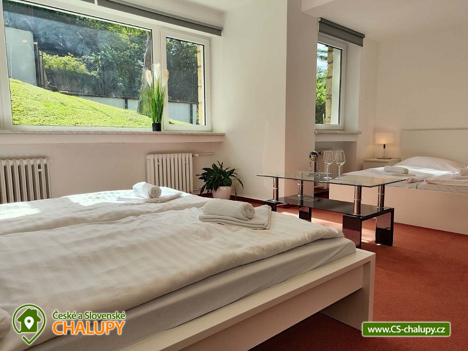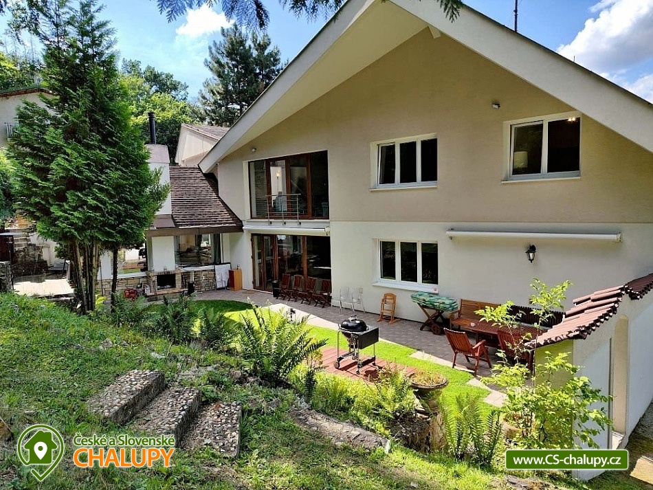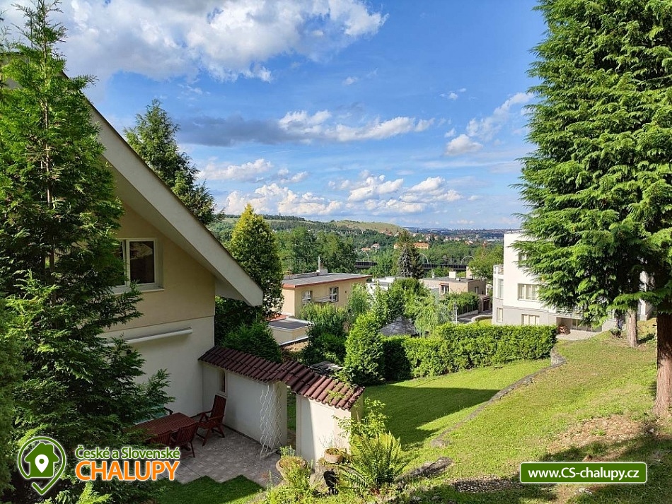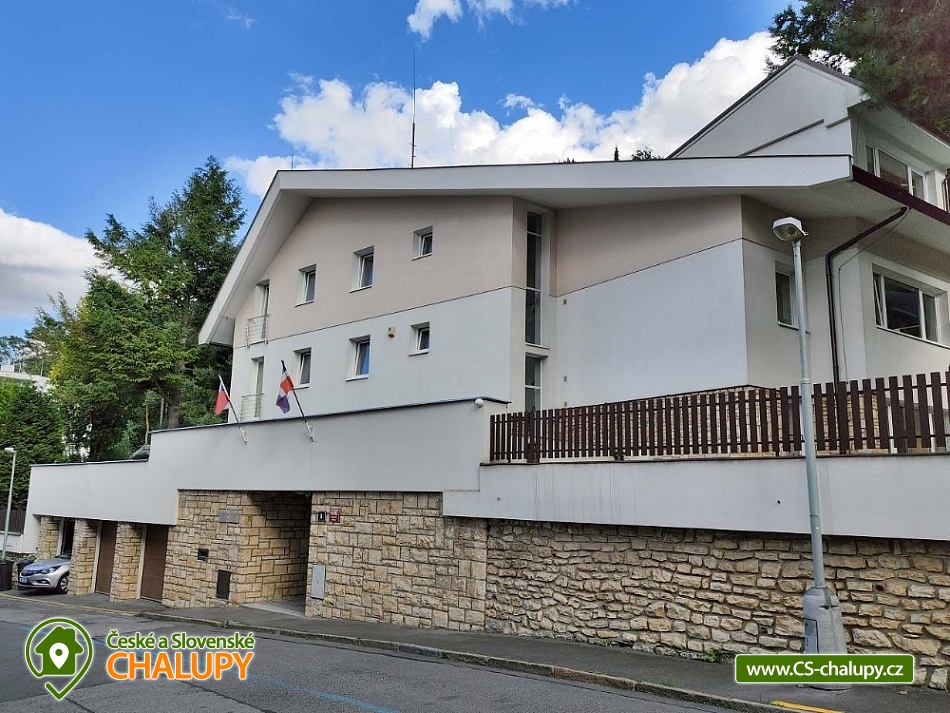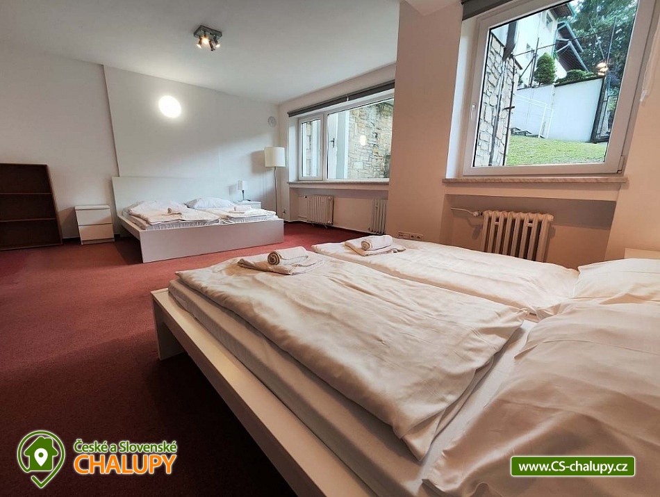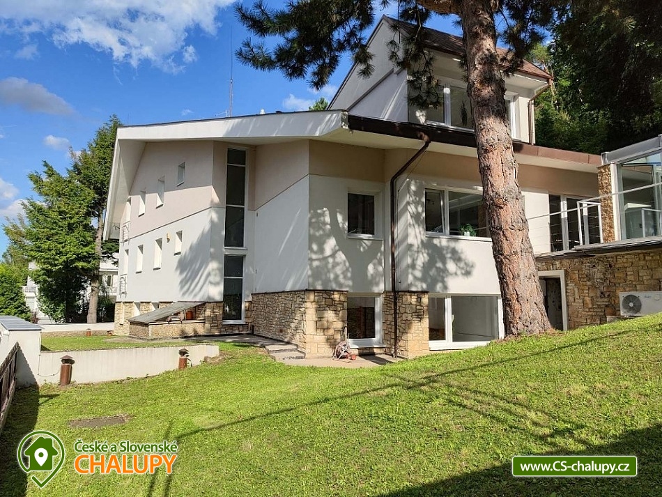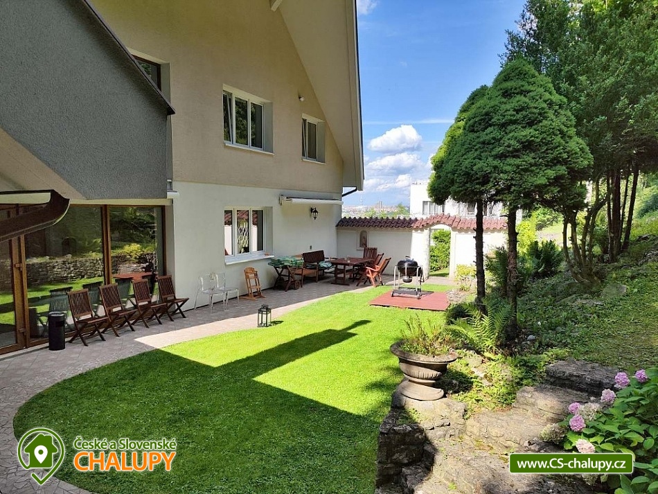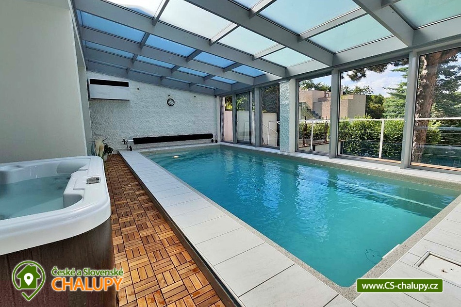 Villa Prag - Prague Hlubočepy - indoor pool and jacuzzi. We offer a comfortable villa for rent in a quiet location for up to 32 people in a total of 11 bedrooms. Villa Prag can be found in the capital city of Prague in the Hlubočepy district, just 3.8 km from Vyšehrad and 600 m from the Barrandov Film Studios. The building has a spacious living room with a TV and a view of the garden. The fully equipped kitchen includes a dishwasher. The building has 6 x 2-bed bedrooms and 5 x 4-bed bedrooms. There are a total of 3 bathrooms with toilets in the villa. Parking at the building is private and free of charge. Vila Prag is located at the end of the dead-end street Pod Habrovou in a very quiet part of Barrandovo. There is a private saltwater pool, a hot tub and a garden with a barbecue. The sun terrace for sitting is very nice. The villa is surrounded by a forest that provides complete peace and privacy. At the same time, you can reach the center on Národní třída in ten minutes by car and in 20 minutes by public transport. In the summer, it is possible to sit in complete privacy in the atrium by the outdoor fireplace and enjoy the view of the large forest park-style garden measuring 3,000 m2. The villa is suitable for accommodating managers, organizing events, but also for accommodating groups of foreign tourists or for family vacations. The capital city of Prague offers activities, attractions and trips. For golf lovers, the Hodkovičky Golf & Country Club is only 3 kilometers away. In this area you will also find tennis courts and other sports activities. The most important Prague monuments, such as the Charles Bridge or the National Museum, are only 6 km from our villa.