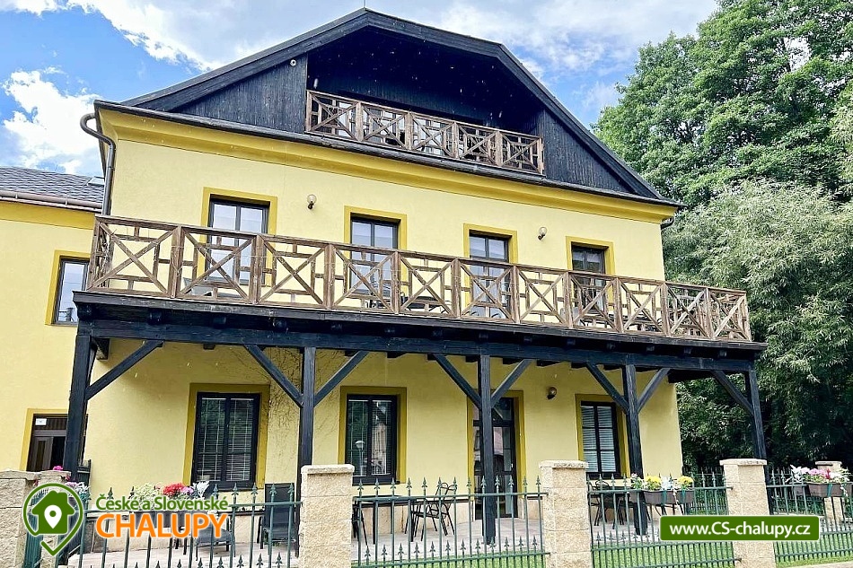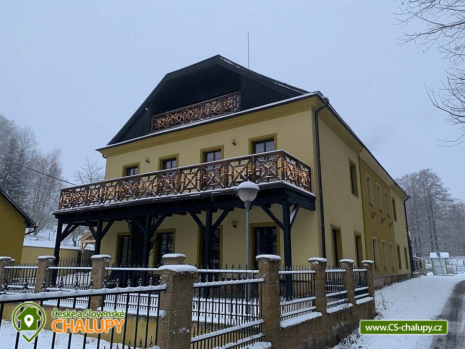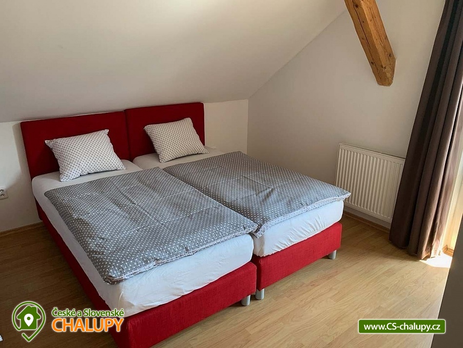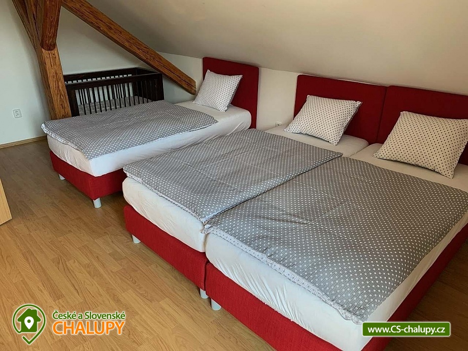The holiday home is located in the Podkrkonoší Mountains, near the town of Dvůr Králové nad Labem, in the village of Horní Brusnice. Here you can look forward to a wine cellar (available for rent) with wine tasting from the Trávník winery (Mutěnice). The property offers accommodation for 32 people in six separate apartments with an area of 35 to 170 m². There are always 2 apartments on each floor, each with its own entrance. It is possible to rent both individual apartments and the entire property. All apartments have their own terrace or balcony, fully equipped kitchens (fridge with freezer, ceramic hob with oven, microwave, electric kettle, Dolce Gusto capsule coffee machine, toaster, electric contact grill, dishwasher and dishes) and bathrooms with sanitary facilities. There is a children's corner in each apartment. A cot is also available for rent. DESCRIPTION: APARTMENT No. 1 with a covered terrace (6 beds): 3 bedrooms, 1 living room with fireplace and kitchenette, 3 bathrooms with toilet. APARTMENT No. 2 with a partially covered terrace (4 beds): 2 bedrooms, 1 living room with kitchenette, 1 bathroom with bathtub, shower and toilet. The bathroom is equipped with grab bars, making it accessible to people with reduced mobility or the elderly. The terrace is fenced and equipped with garden furniture. APARTMENT No. 3 with a terrace (6 beds): 3 bedrooms, 1 living room with fireplace and kitchenette, 2 bathrooms with toilet. One is equipped with a bathtub and a shower with toilet, the other has a shower and toilet. The terrace is equipped with garden furniture (dining table, chairs and deck chairs). APARTMENT No. 4 with terrace (5 beds + 2 extra beds): 2 bedrooms, 1 living room with kitchenette, 2 bathrooms with toilet. One is equipped with a bathtub and shower with toilet, the other has a shower and toilet. The terrace is equipped with garden furniture (dining table, chairs and deck chairs). Attic APARTMENT No. 5 with loggia (4 beds): 2 bedrooms, 1 living room with fireplace and kitchenette, 1 bathroom with shower and toilet. The apartment has a covered loggia equipped with garden furniture (table and chairs). Attic APARTMENT No. 6 with loggia (3 beds + 2 extra beds): 1 bedroom, 1 living room with kitchenette, 1 bathroom with shower and toilet. There is a sofa bed in the living room. All living rooms are equipped with a TV, DVD player and Bluetooth speaker. There is also a billiard table. The entire building has a high-speed Wi-Fi connection. The building is heated by central heating with the possibility of using fireplaces in apartments 1, 3 and 5. There is a children's playground and private parking for 9 cars on the fenced plot. Possibility of storing bicycles/skis. In the vicinity of the building there are opportunities for hiking, cycling, swimming, mushroom picking, cross-country skiing and skiing. Swimming options include, for example: Pecka swimming pool and campsite, Tyršovo swimming pool Dvůr Králové nad Labem, Nová Paka indoor swimming pool, Mostek natural swimming pool or Hostinné swimming pool. In winter, nearby ski resorts are an advantage, for example: Janské Lázně or Pec pod Sněžkou. Trips in the surrounding area include: ZOO/Safari Dvůr Králové, Pecka castle, Les Království dam, Zvičina or Hospital KUKS. We look forward to seeing you.