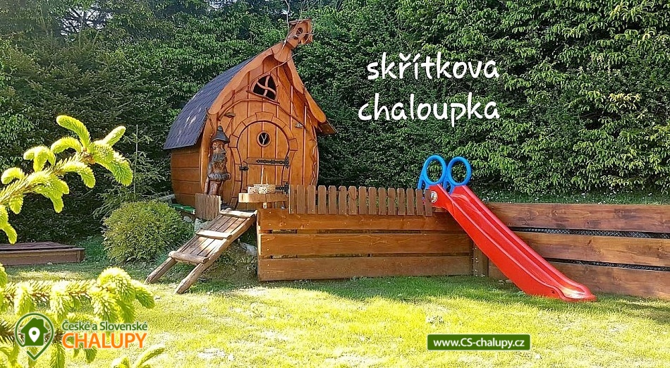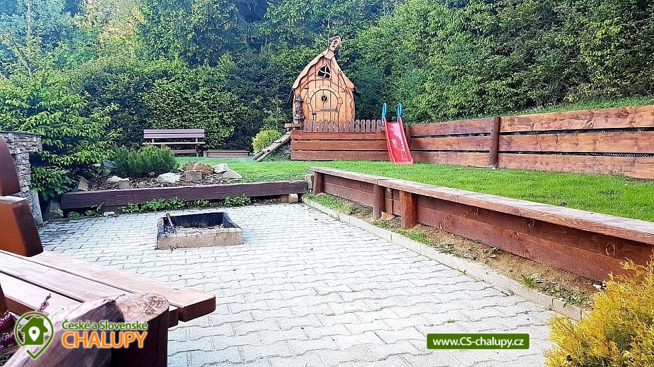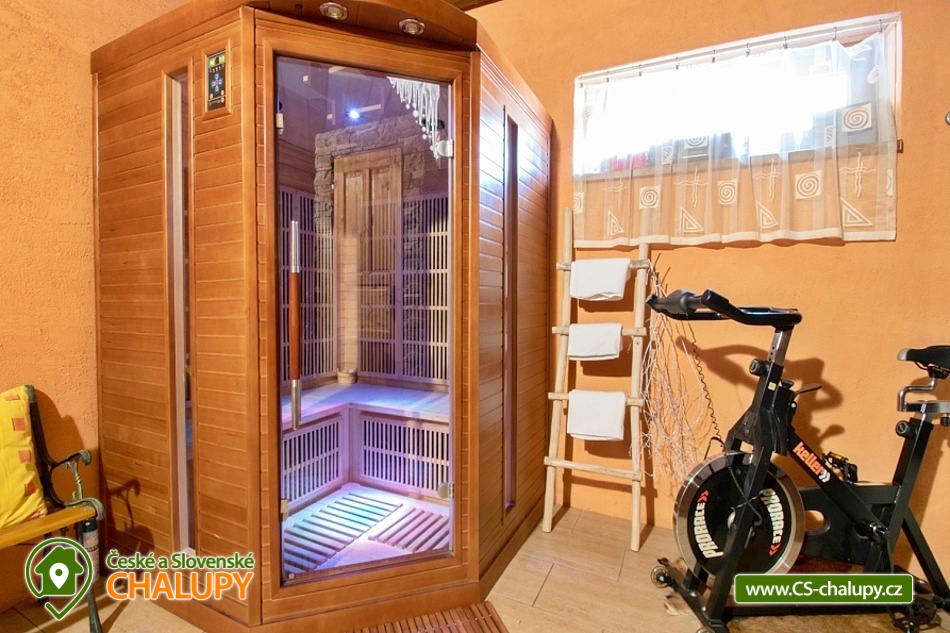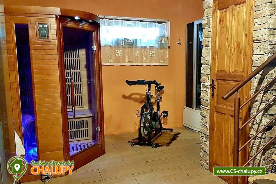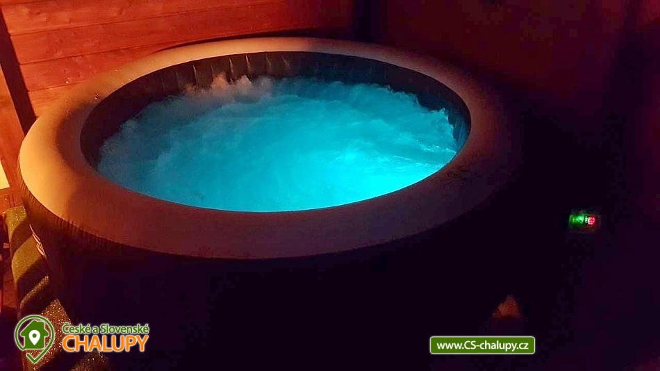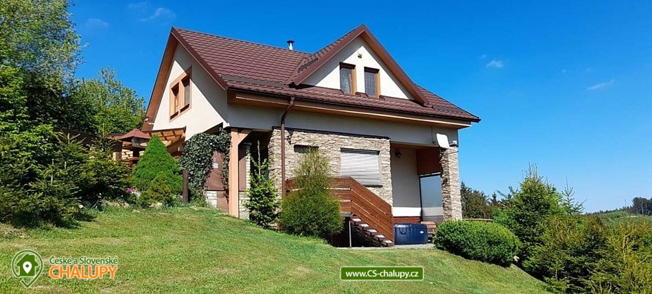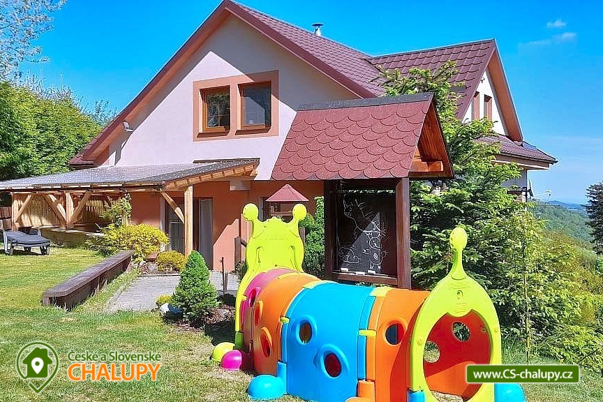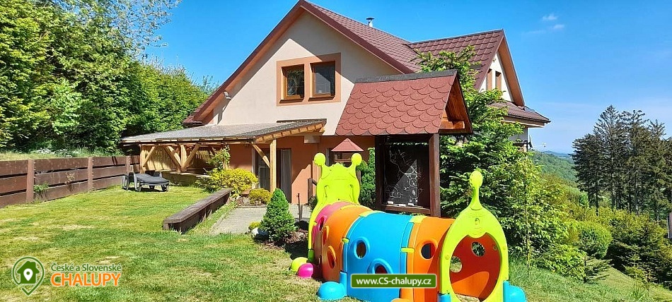 Wellness cottage Vápenice - PLA Bílé Karpaty. The cottage with a hot tub and infrared sauna is located in the beautiful nature of the White Carpathians. It is located in the village of Vápenice, on the southern slope below Mikulčíný vrch, with a view of the Slovak side, Velký Lopeník and Bošácká Dolina. Not far from the cottage (150 m) is our second cottage Andělka for rent (object 1M-307). The cottage offers accommodation for 8 people in three bedrooms (2x double bedrooms and 1x four-bed bedroom). All bedrooms always have double beds. On the ground floor there is a living room with a sofa, TV, fireplace and a fully equipped kitchen with a dining table (dishes, refrigerator, freezer, electric stove with hob, kettle, microwave, coffee maker, toaster and toaster). Furthermore, on the ground floor you will find a double bedroom with a private bathroom with a shower and toilet, an infrared sauna, a massage box with a shower, toilet and a fitness machine. In the attic there is a four-bed bedroom, a spacious living room with a sofa, TV, table football and a double bed. Furthermore, there is a bathroom with a shower, toilet and a fully equipped kitchen (dishes, refrigerator, two-burner induction hob, oven and kettle). There are plenty of board games, toys for children and Wi-Fi connection. The building is heated by electricity - direct heaters, fireplaces or air conditioning. Parking is possible directly at the building. The cottage has two terraces. One terrace can be accessed from the living room on the ground floor. There is a seating area, fireplace, outdoor fireplace and jacuzzi. Another covered terrace is on the other side of the building. There is a children's playground with an outdoor fairy-tale house full of toys, various outdoor games, a sandpit, darts, a trampoline and table tennis. In the vicinity of the cottage there is the possibility of hiking, cycling, mushroom picking, tennis, horse riding. Tips for trips: Velký Lopeník lookout tower, museum of the last Žitkov goddess, lookout tower on Skalka, city museum Slavičín, ruins of Brumov castle, zoo in Lešná u Zlína. Swimming options: Nivnická riviéra swimming pool, Starý Hrozenkov swimming pool, Delfín aquapark in Uherský Brod, Vlčnov swimming pool, Luhačovice swimming pool. Nearby ski resorts: Mikulčin Vrch - here is also the starting point for ski trails. We look forward to seeing you.
