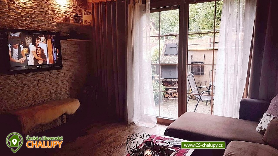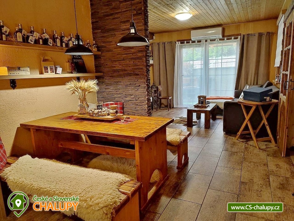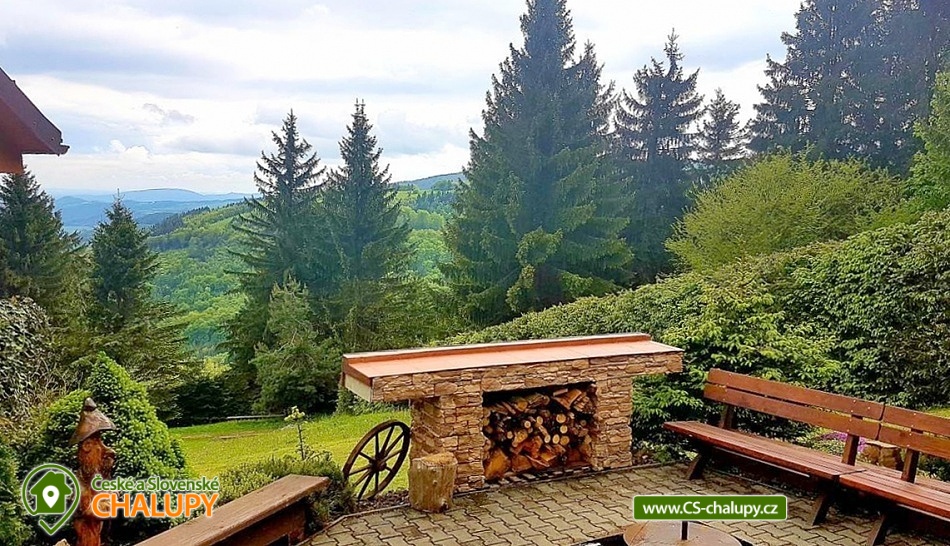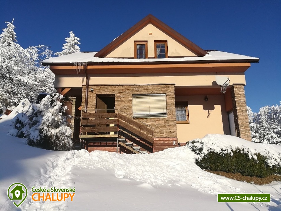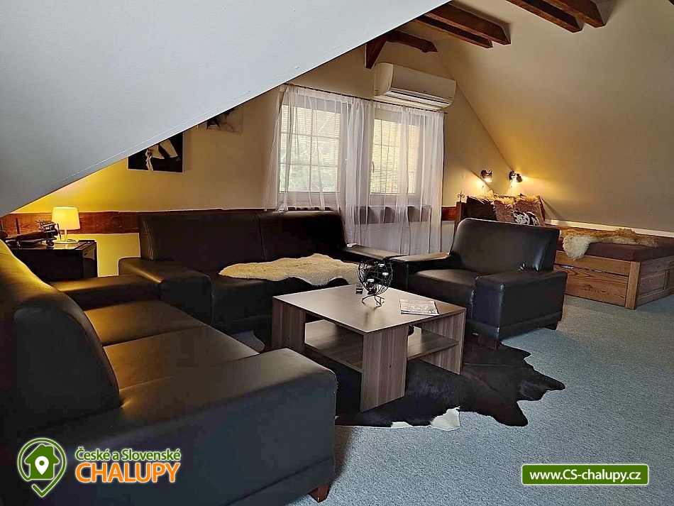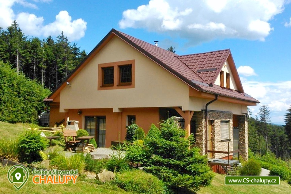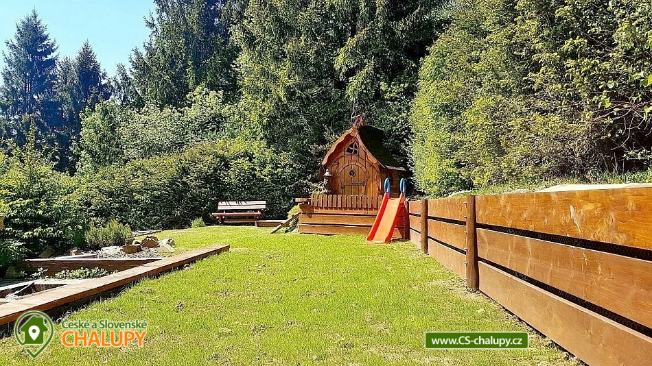 Wellness cottage Vápenice - PLA Bílé Karpaty. The cottage with a hot tub and infrared sauna is located in the beautiful nature of the White Carpathians. It is located in the village of Vápenice, on the southern slope below Mikulčíný vrch, with a view of the Slovak side, Velký Lopeník and Bošácká Dolina. Not far from the cottage (150 m) is our second cottage Andělka for rent (object 1M-307). The cottage offers accommodation for 8 people in three bedrooms (2x double bedrooms and 1x four-bed bedroom). All bedrooms always have double beds. On the ground floor there is a living room with a sofa, TV, fireplace and a fully equipped kitchen with a dining table (dishes, refrigerator, freezer, electric stove with hob, kettle, microwave, coffee maker, toaster and toaster). Furthermore, on the ground floor you will find a double bedroom with a private bathroom with a shower and toilet, an infrared sauna, a massage box with a shower, toilet and a fitness machine. In the attic there is a four-bed bedroom, a spacious living room with a sofa, TV, table football and a double bed. Furthermore, there is a bathroom with a shower, toilet and a fully equipped kitchen (dishes, refrigerator, two-burner induction hob, oven and kettle). There are plenty of board games, toys for children and Wi-Fi connection. The building is heated by electricity - direct heaters, fireplaces or air conditioning. Parking is possible directly at the building. The cottage has two terraces. One terrace can be accessed from the living room on the ground floor. There is a seating area, fireplace, outdoor fireplace and jacuzzi. Another covered terrace is on the other side of the building. There is a children's playground with an outdoor fairy-tale house full of toys, various outdoor games, a sandpit, darts, a trampoline and table tennis. In the vicinity of the cottage there is the possibility of hiking, cycling, mushroom picking, tennis, horse riding. Tips for trips: Velký Lopeník lookout tower, museum of the last Žitkov goddess, lookout tower on Skalka, city museum Slavičín, ruins of Brumov castle, zoo in Lešná u Zlína. Swimming options: Nivnická riviéra swimming pool, Starý Hrozenkov swimming pool, Delfín aquapark in Uherský Brod, Vlčnov swimming pool, Luhačovice swimming pool. Nearby ski resorts: Mikulčin Vrch - here is also the starting point for ski trails. We look forward to seeing you.