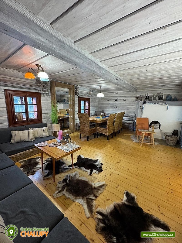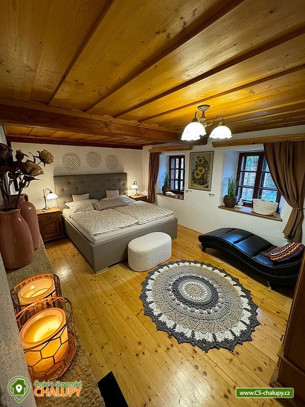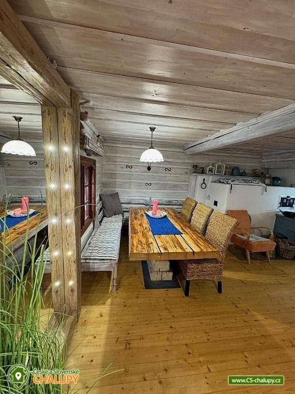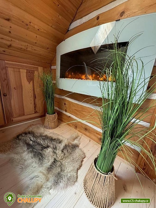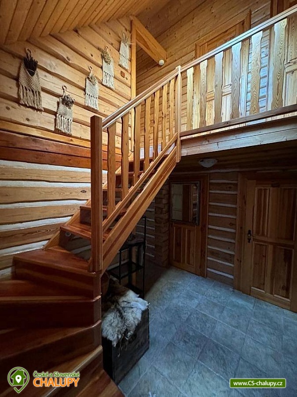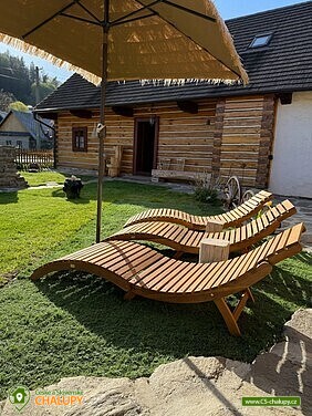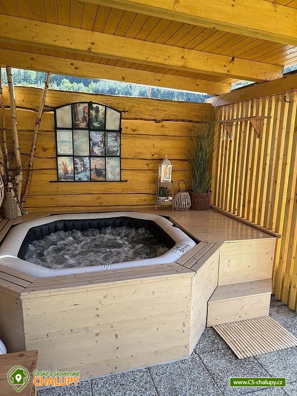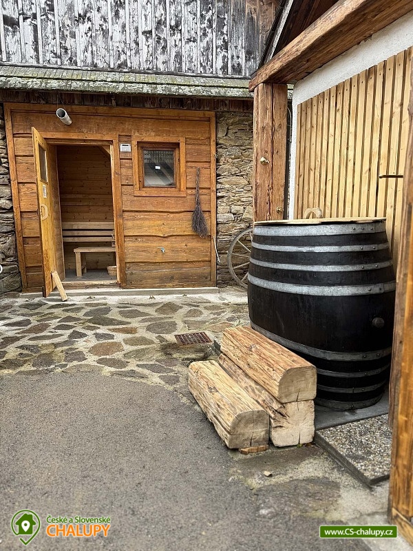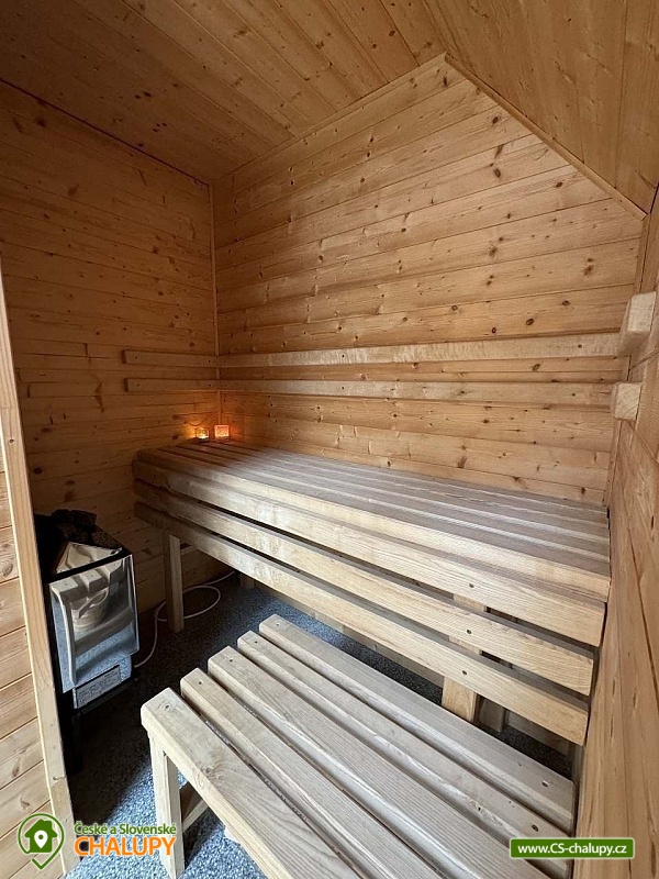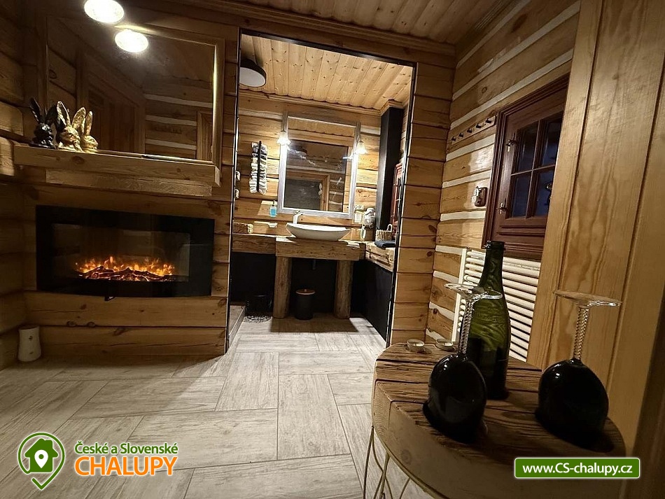 A cozy log cabin, combining historical character with modern comfort, is located in the picturesque valley of the Svratka River, just outside Brno. This place will offer you absolute privacy and peace and create a perfect oasis for relaxation and recharging your batteries. You can look forward to a Finnish sauna with an outdoor shower or a saltwater jacuzzi for outdoor relaxation. The cottage provides accommodation for 9 people in three bedrooms. On the ground floor you will find a 3-bed bedroom (1x double bed, 1x separate single bed) with a fireplace, in the attic a 2-bed bedroom (1x double bed) with a fireplace and a 4-bed bedroom (1x extra large bed for 4 people). A cot is also available (for a small fee). On the ground floor there is also a main living room with a large dining table connected to a fully equipped kitchen (fridge with freezer, microwave, toaster, coffee maker, electric kettle, thermomix with recipe book, dishwasher, hob and dishes). A stylish tiled stove with stove creates the unmistakable charm of a log cabin. There is a TV and hi-fi equipment with a wireless Bluetooth music receiver. The sanitary facilities include a large bathroom on the ground floor with a toilet and a whirlpool bath with light therapy with a view of the electric fireplace. Upstairs there is a separate toilet and a separate bathroom with a bath. Heating is provided by a gas boiler with comfortable underfloor heating. To complete the atmosphere, there is the option of heating in a tiled stove. The cottage also has two electric fireplaces (bathroom, bedroom). On the ground floor in the bedroom you will also find a classic solid fuel fireplace. Free Wi-Fi internet access is available throughout the property. Possibility of storing bicycles/skis. Parking is free and is right next to the property (max. 4 cars). The cottage is located on a fenced plot with a grassy garden. In the garden you will find a pergola with seating and a grill. You can also use the fireplace. There is also an outdoor terrace heater for sitting in the winter months. There is also a wine cellar, which completes the atmosphere of comfort and relaxation. Wellness lovers will appreciate the Finnish sauna, which is complemented by an outdoor shower. In the winter months, a large, unconventional oval barrel is used to cool down. You can also use the outdoor hot tub with salt water under the pergola, which is operated seasonally from March to October. The little ones will certainly appreciate the children's slide. In the vicinity of the property there is the possibility of hiking, cycling, swimming, mushroom picking, cross-country skiing and skiing. For the more adventurous, there are via ferratas. The Svratka River is frequently visited by fishermen looking for quality trout waters. Swimming options include: Olešnice Swimming Pool, Bystřice nad Pernštejnem Swimming Pool or the Nové Město na Moravě City Spa. In winter, nearby ski resorts are an advantage, for example: Nové Město na Moravě - Ski snowpark Harusův kopec or Skiareál Olešnice na Moravě. Trips in the surrounding area are attractive: Vír reservoir, ruins of the Pyšolec, Zubštejn, Aušperk castles or the biathlon area in Nové Město na Moravě. Possibility to arrange a horse-drawn carriage ride (reservation required in advance). For children, there is fun in the form of searching for lost treasure with a sweet reward, while adults can look forward to a bottle of sparkling wine or prosecco as a welcome gift. We look forward to seeing you.
