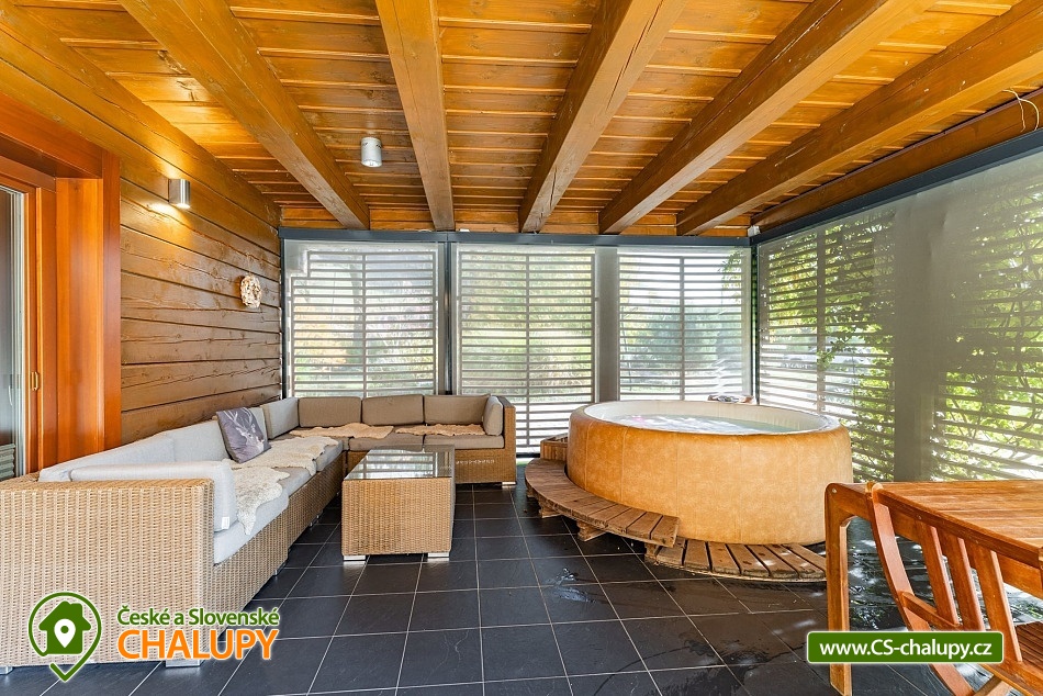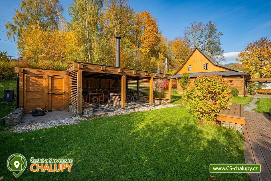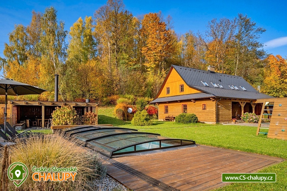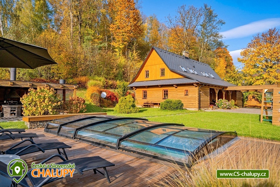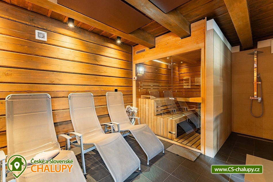 Roubenka Oliver with wellness is located in the beautiful nature of the Jeseníky Nature Reserve in the village of Loučná nad Desnou - part of Rejhotice. The location of the log house is ideal for the close proximity of the Ski Area and Bike Park Kareš and the Ski Area, Bike Park and Balanc Park Kouty. Roubenka Oliver offers accommodation for 16 people, a total of six bedrooms are available in two separately rented eight-bed apartments. The interior of the log house is divided into two separate, private, equal-sized parts - the right and left apartments. Each has its own entrance from the outdoor terrace and both apartments are identical, only mirrored. Both apartments have two double bedrooms (double bed) and one of the bedrooms is connected to the third four-bed bedroom in the attic (4 x single beds). A cot is available. On the ground floor of the apartments (1st above-ground floor) there is an entrance hall, a bathroom with a toilet, a sink and a shower. There is also a common room with a built-in fireplace, a sofa bed for 2 people with a quality mattress designed for permanent sleeping (it can be used as an extra bed by arrangement), armchairs, a TV with satellite receiver and a micro tower with a CD and DVD player. Part of this room is a spacious and fully equipped kitchen (fridge, microwave oven, convection oven, ceramic hob, hood, dishwasher, coffee machine, toaster and kettle). In II. on the upper floor there is a second spacious bathroom with a large shower, sink, toilet and bidet. There is also a built-in wardrobe with storage space and two bedrooms. From one of the bedrooms, the miller's stairs lead to the open attic bedroom. In both apartments, there is a children's corner, toys, cots, dining chairs, a potty and a bathtub for children. Heating in the apartments is provided by a fireplace stove and a central electric boiler providing floor heating on the ground floor and heating elements and floor heating in the bathroom on the first floor. WIFI internet connection is available throughout the building. All accommodation can look forward to relaxing in the Finnish sauna or hot tub. Outside, you can sit in a large covered pergola with seating, a fireplace with the possibility of grilling, or you can sit under the shelter by the log cabin. In the summer you can cool off in the pool. For moments of fun, you can use the volleyball court, basketball hoop, table tennis or trampoline. Children will enjoy the children's playground with a sandpit and swings. There are also two outdoor rooms available, in one there is a boiler room and in the other a storage room for bikes, skis and strollers. Scooters can be rented by arrangement. You can park right next to the building. In the vicinity of the log house, cycling, swimming, mushroom picking, fishing, cross-country skiing and skiing are possible. There is a riding school nearby. Swimming options include, for example: Velké Losiny thermal swimming pool, Velké Losiny - thermal baths, Rapotín swimming pool, Domašov - Bělá pod Pradědem pool, Krásné dam, Karlova Studánka pool, Hynčice pod Sušinou - Úžas pond, Šumperk - Bratrušák swimming pool, Šumperk - Aquacentrum pool , etc. In winter, nearby ski resorts are available: Kouty nad Desnou, Kareš - Kouty nad Desnou, OAZA - Loučná nad Desnou, Kocián - Loučná nad Desnou, Přemyslov, Vernířovice-Brněnka, Červenohorské sedlo and others. The Dlouhé Stráně pumping station, Karlova Studánka, Praděd or the city of Šumperk are alluring for trips in the surrounding area. We look forward to seeing you here.