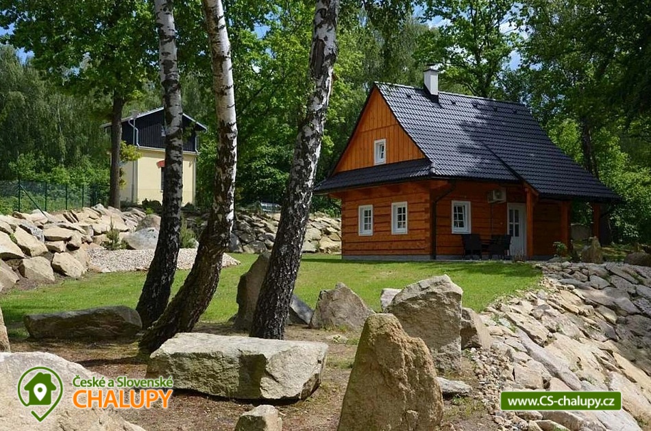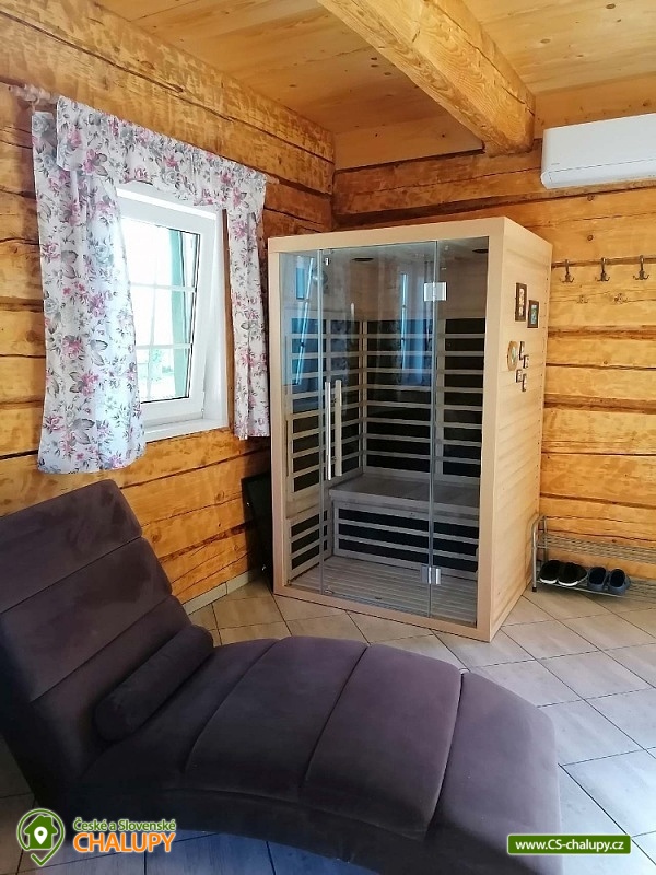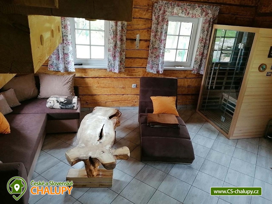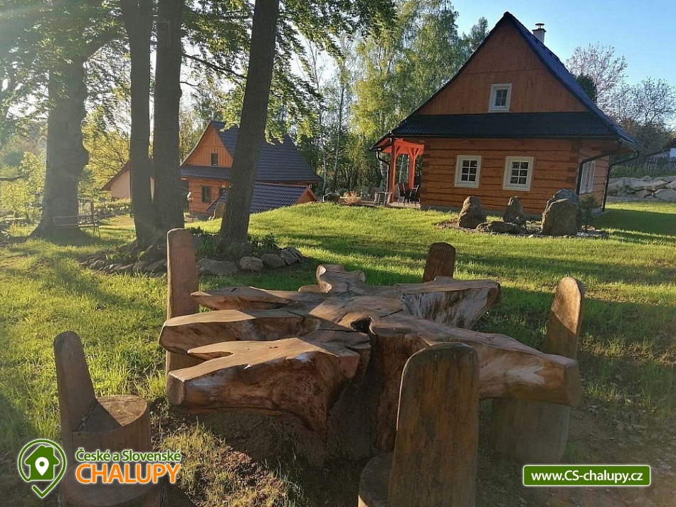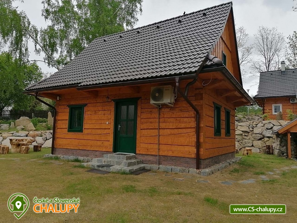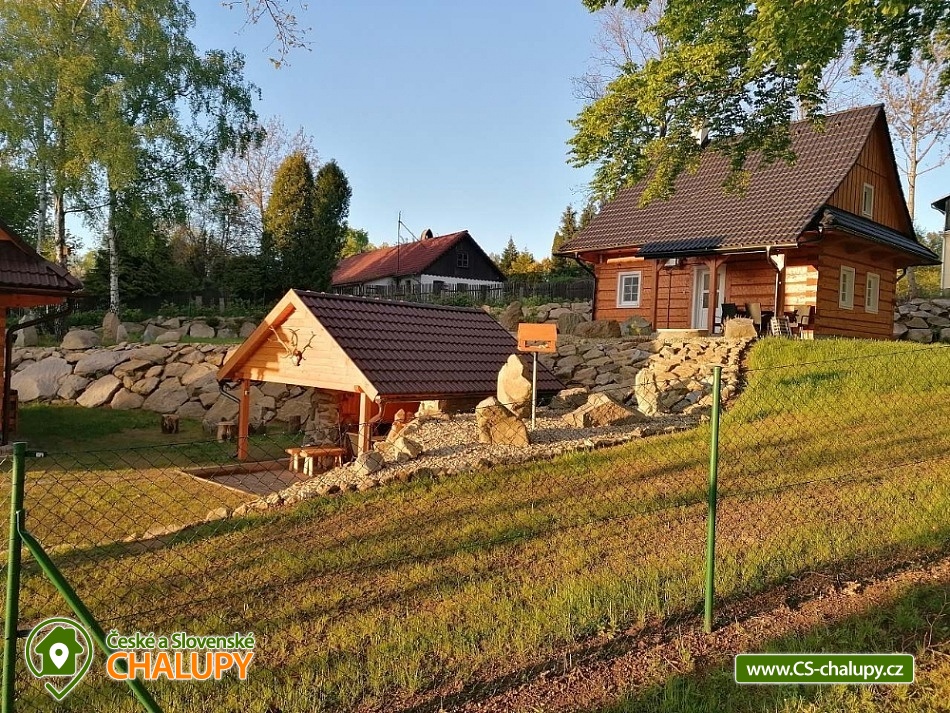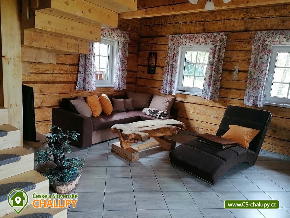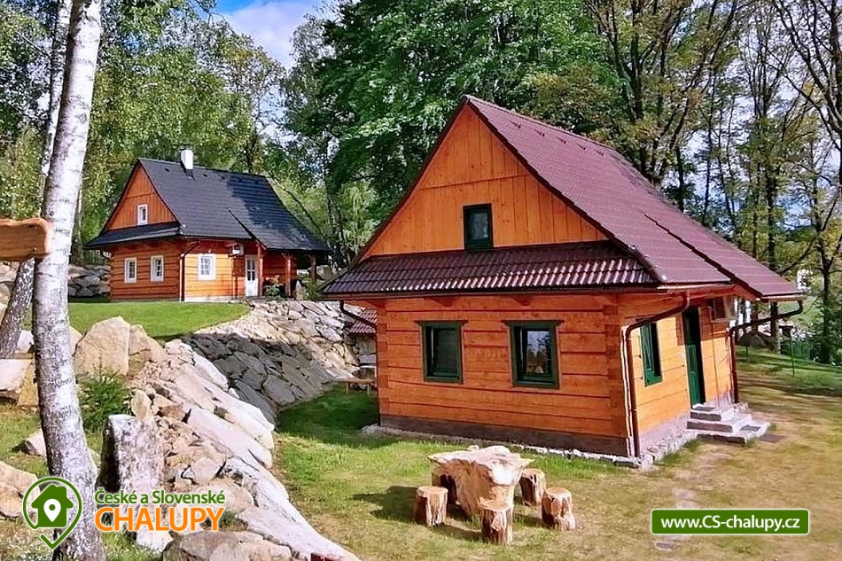Roubenky U veverky - Lomy - accommodation Czech Canada. Roubenky U veverky is located in the beautiful, tourist-admired village of Lomy, surrounded by a small forest near the village Kunžak in Czech Canada. The cottage offers accommodation for up to 6 people in two 3-bed bedrooms. It is possible to rent a second log cabin with a capacity of another 6 people, building No. 2C-136. On the ground floor of the log cabin there is a living room with a kitchenette and a bathroom. A large comfortable staircase leads to the attic, where there are 2 separate bedrooms. There are 3 beds in each. Living room - infrasauna, sofa bed, coffee table, dining table with six chairs, chaise longue, LG Smart TV (internet, YouTube, Skylink), Wi-Fi, board games and badminton. A high chair can be borrowed free of charge. The bathroom is equipped with a shower box with bath and toilet, large mirror and sink with cabinet and cosmetic magnifying mirror, hair dryer. The log cabin is heated by air conditioning, which will be used in the hot summer months to cool the rooms. Parking is possible directly at the building. Garden - fireplace, wooden benches, table with six chairs, children's sandpit, swing for small and large, outdoor lounger, 2x reclining lounger, terrace with garden furniture, electric grill, grill on open fire, cast iron kettle, 6 toasting forks and outdoor lighting. Possibility of bicycle storage. Swimming or fishing is possible in a nearby pond (approx. 200 m). 200m from the chalet there is a train station for a narrow-gauge railway - the last in the Czech Republic. So you can't miss a steam locomotive ride through the charming region of Czech Canada. Possibility of horseback riding for children and adults, for beginners and advanced even the smallest on ponies in a nearby riding school (300m). In the vicinity of walking trips to the surroundings and cycling, lookout tower at Jakub, Markův kámen, Landštejn castle, a bison farm with a restaurant in Rožnov.