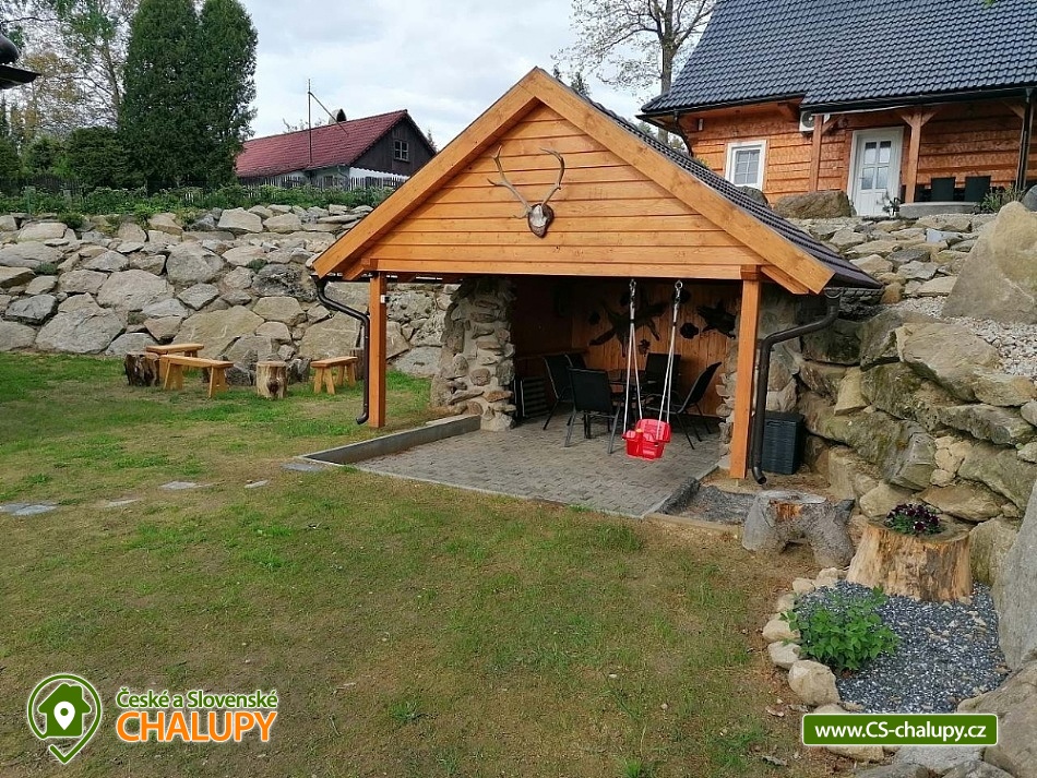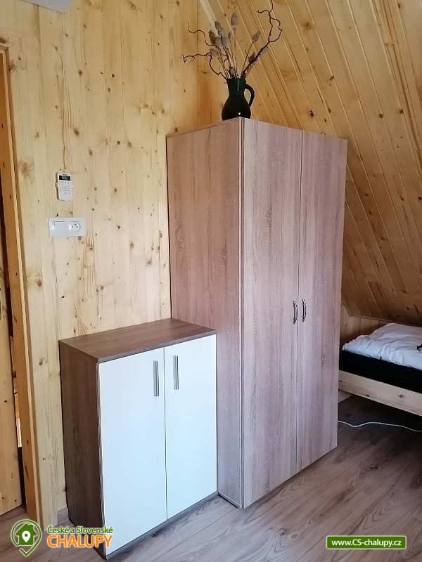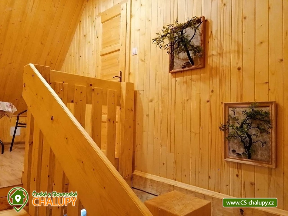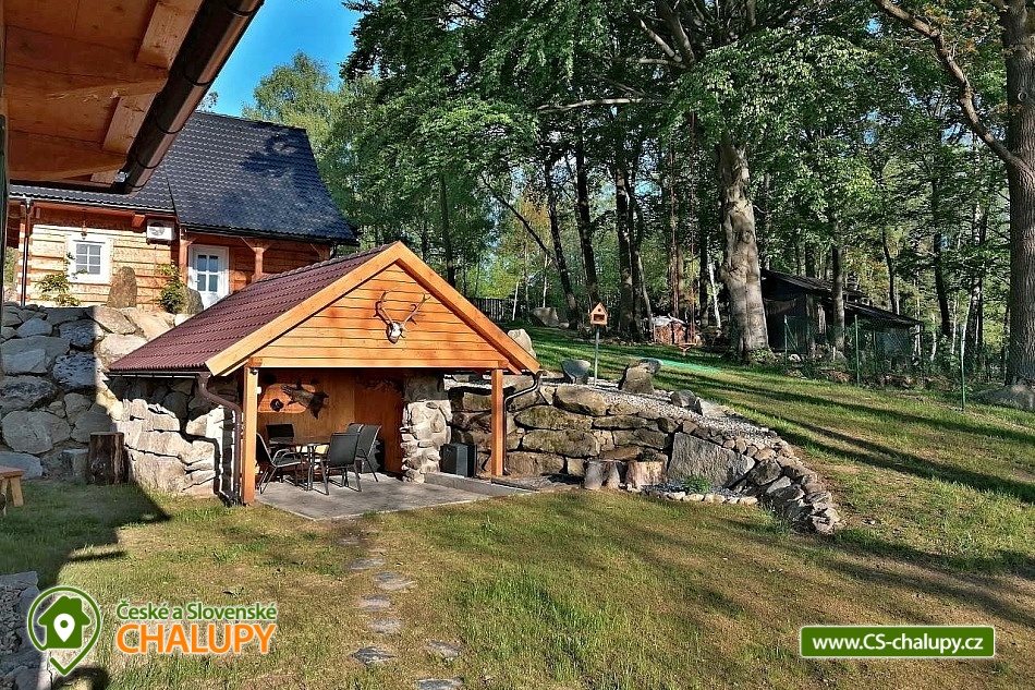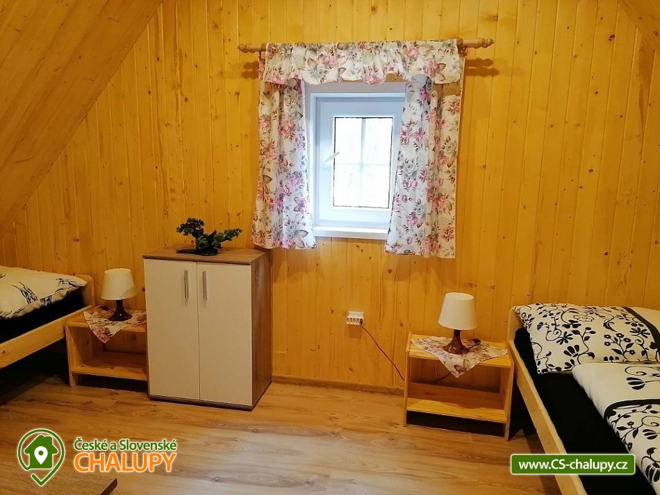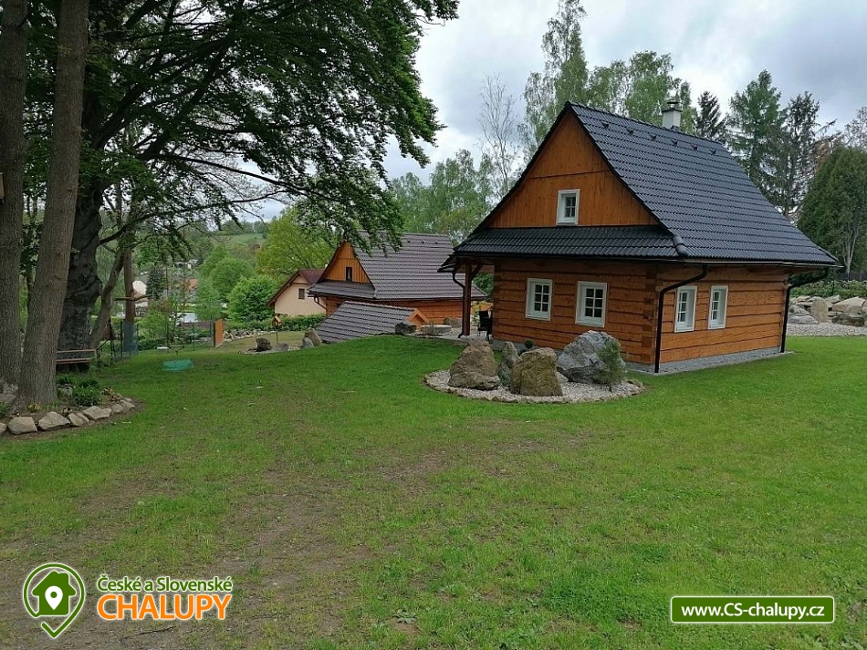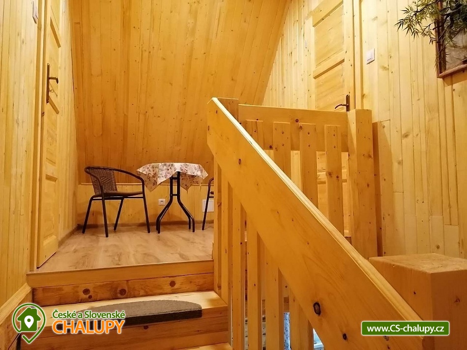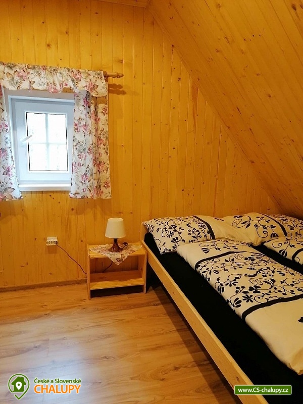 Roubenky U veverky - Lomy - accommodation Czech Canada. Roubenky U veverky is located in the beautiful, tourist-admired village of Lomy, surrounded by a small forest near the village Kunžak in Czech Canada. The cottage offers accommodation for up to 6 people in two 3-bed bedrooms. It is possible to rent a second log cabin with a capacity of another 6 people, building No. 2C-136. On the ground floor of the log cabin there is a living room with a kitchenette and a bathroom. A large comfortable staircase leads to the attic, where there are 2 separate bedrooms. There are 3 beds in each. Living room - infrasauna, sofa bed, coffee table, dining table with six chairs, chaise longue, LG Smart TV (internet, YouTube, Skylink), Wi-Fi, board games and badminton. A high chair can be borrowed free of charge. The bathroom is equipped with a shower box with bath and toilet, large mirror and sink with cabinet and cosmetic magnifying mirror, hair dryer. The log cabin is heated by air conditioning, which will be used in the hot summer months to cool the rooms. Parking is possible directly at the building. Garden - fireplace, wooden benches, table with six chairs, children's sandpit, swing for small and large, outdoor lounger, 2x reclining lounger, terrace with garden furniture, electric grill, grill on open fire, cast iron kettle, 6 toasting forks and outdoor lighting. Possibility of bicycle storage. Swimming or fishing is possible in a nearby pond (approx. 200 m). 200m from the chalet there is a train station for a narrow-gauge railway - the last in the Czech Republic. So you can't miss a steam locomotive ride through the charming region of Czech Canada. Possibility of horseback riding for children and adults, for beginners and advanced even the smallest on ponies in a nearby riding school (300m). In the vicinity of walking trips to the surroundings and cycling, lookout tower at Jakub, Markův kámen, Landštejn castle, a bison farm with a restaurant in Rožnov.