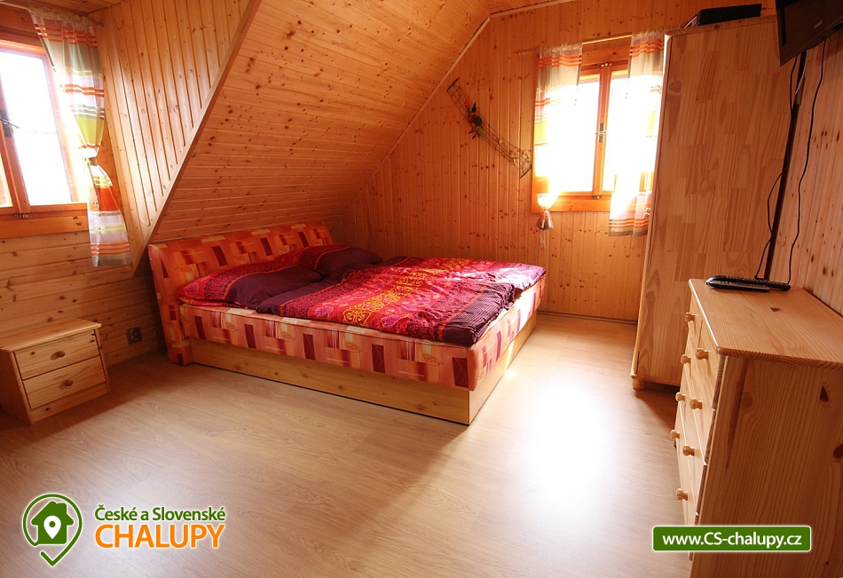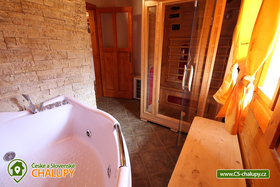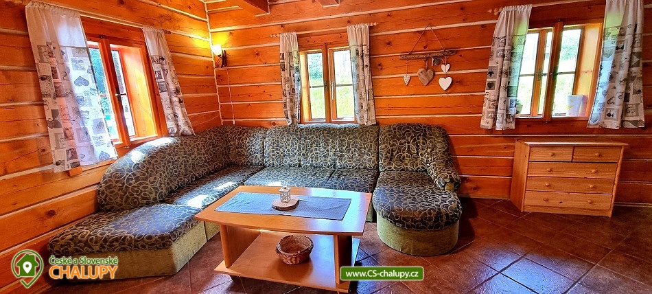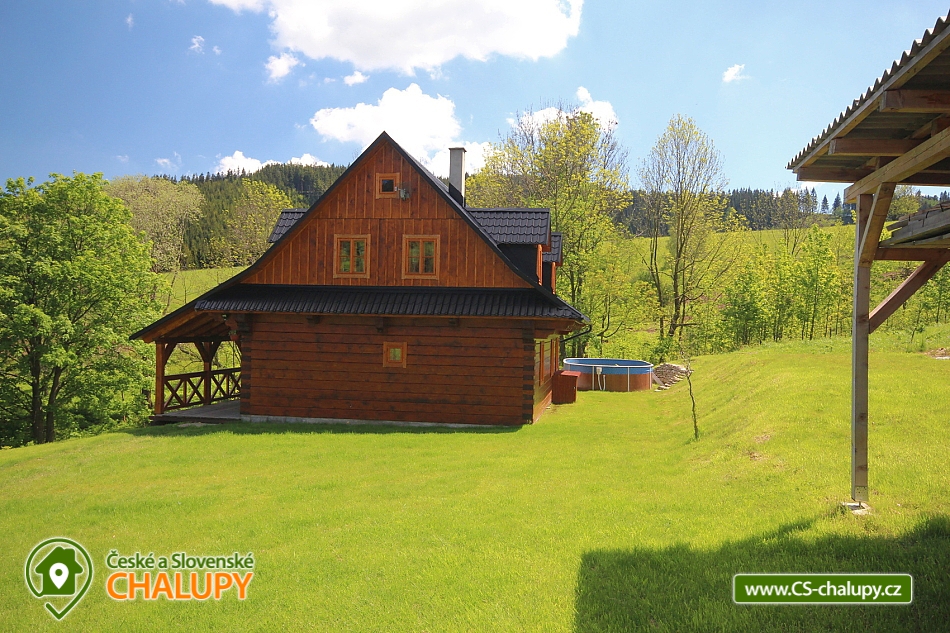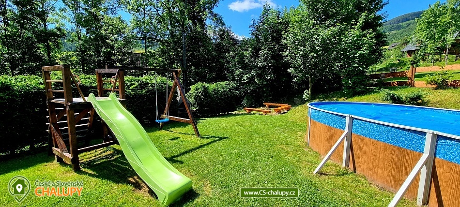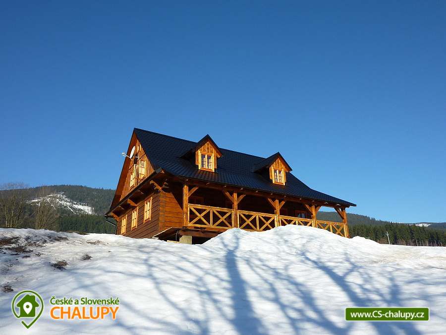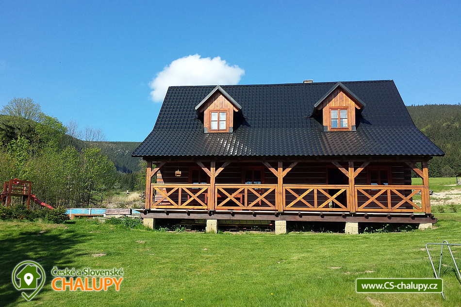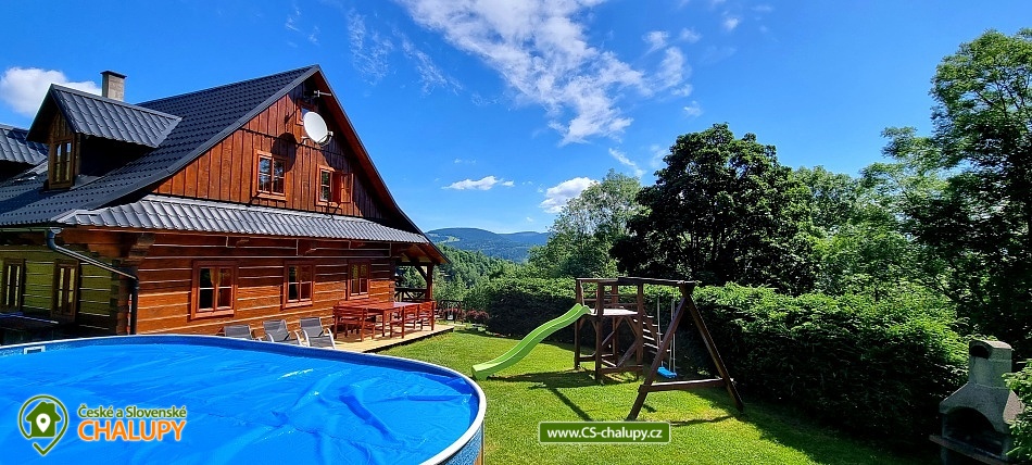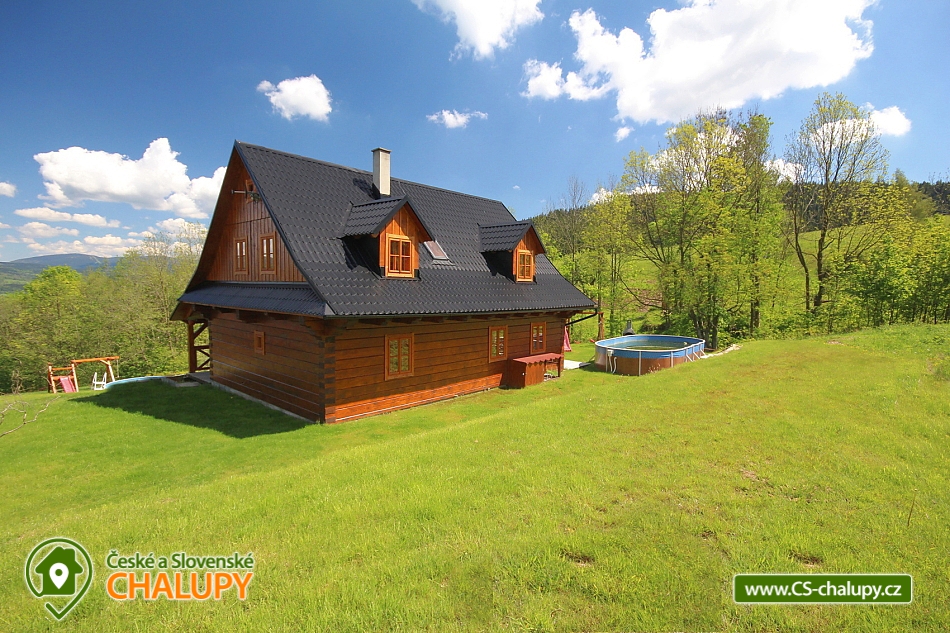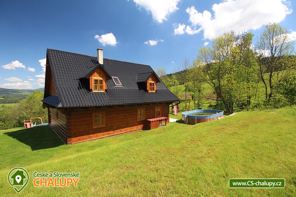 Mountain cottage Stříbrnice - cottage rental. Roubenka located in the immediate vicinity of the ski slope 800 m long and mountain stream at the foot of Králický Sněžník in the small village Stříbrnice, 3 km from the Old Town under Sneznik. On the ground floor above-standard equipped cottages is fully equipped kitchen (sitting, ceramic hob, electric oven, microwave oven, fridge, coffee maker, dishwasher, kettle and freezer) connected with large common room with tiled stove, Extra beds) and a large LCD satellite TV. On the ground floor there is also a relaxation room with a sauna and a large hydromassage bath for 2 people, a technical room with the possibility of storage of skis and bikes and a bathroom with hydromassage shower box and toilet. Upstairs there are 3 bedrooms, each with 4 beds and an LCD TV with satellite. Sanitary facilities on the upper floor include a large bathroom with a corner bath, toilet and 2x washbasin. The heating is a tiled stove, it heats the whole building, available directly. At the cottage there is an 8 x 4 m above sea level pool, 1.2 m deep with solar heating, grill, sandbox, swings, fireplace and outdoor seating on the roofed terrace. Parking by the house, in the winter months on a 150 m away car park.