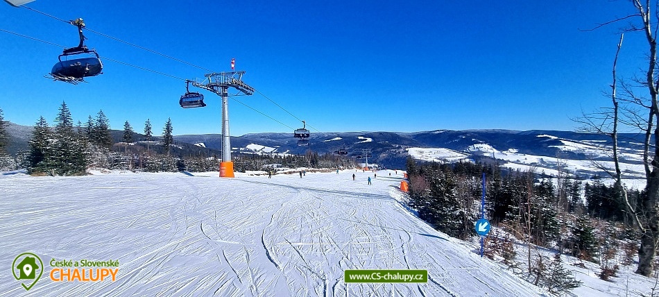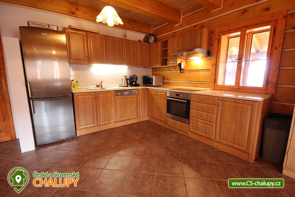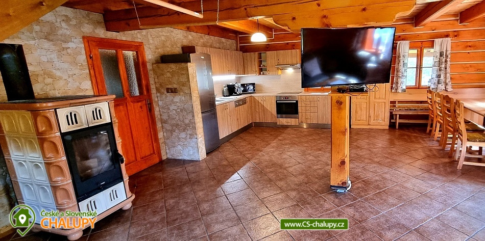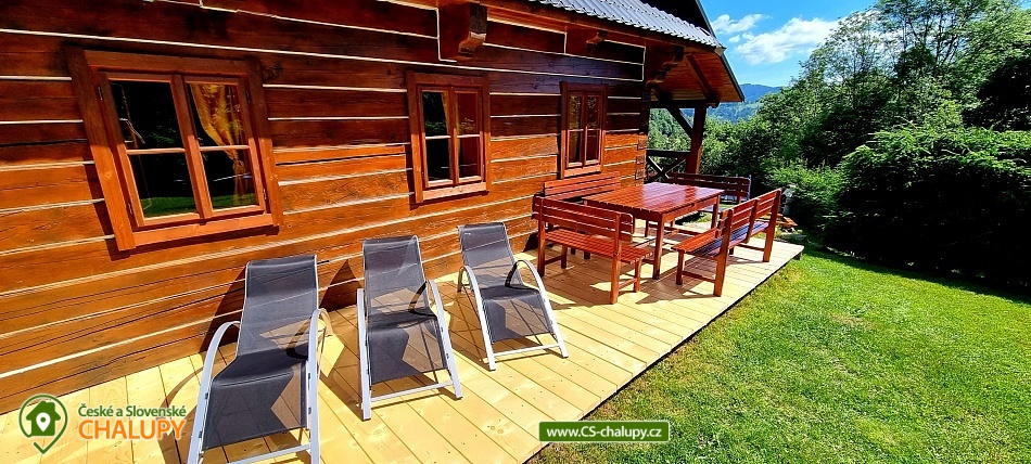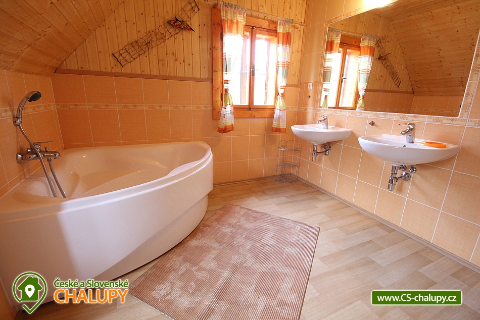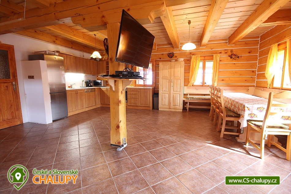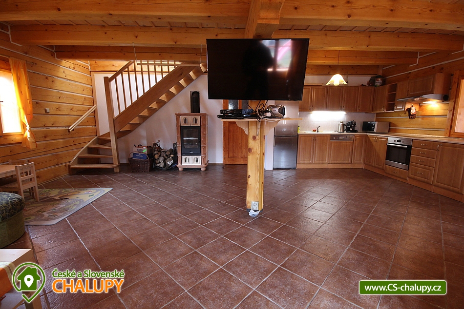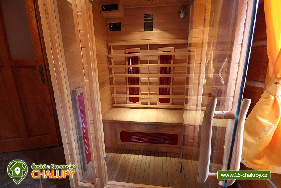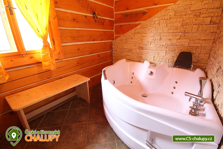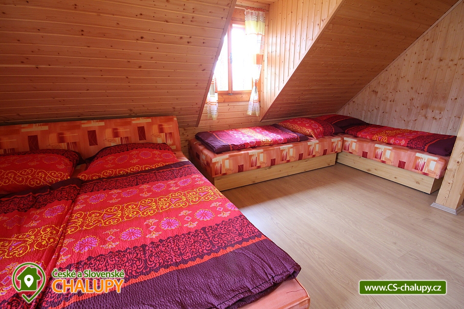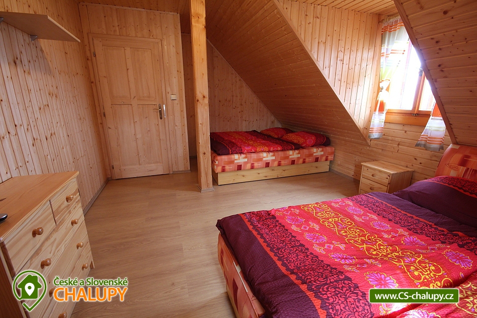 Mountain cottage Stříbrnice - cottage rental. Roubenka located in the immediate vicinity of the ski slope 800 m long and mountain stream at the foot of Králický Sněžník in the small village Stříbrnice, 3 km from the Old Town under Sneznik. On the ground floor above-standard equipped cottages is fully equipped kitchen (sitting, ceramic hob, electric oven, microwave oven, fridge, coffee maker, dishwasher, kettle and freezer) connected with large common room with tiled stove, Extra beds) and a large LCD satellite TV. On the ground floor there is also a relaxation room with a sauna and a large hydromassage bath for 2 people, a technical room with the possibility of storage of skis and bikes and a bathroom with hydromassage shower box and toilet. Upstairs there are 3 bedrooms, each with 4 beds and an LCD TV with satellite. Sanitary facilities on the upper floor include a large bathroom with a corner bath, toilet and 2x washbasin. The heating is a tiled stove, it heats the whole building, available directly. At the cottage there is an 8 x 4 m above sea level pool, 1.2 m deep with solar heating, grill, sandbox, swings, fireplace and outdoor seating on the roofed terrace. Parking by the house, in the winter months on a 150 m away car park.