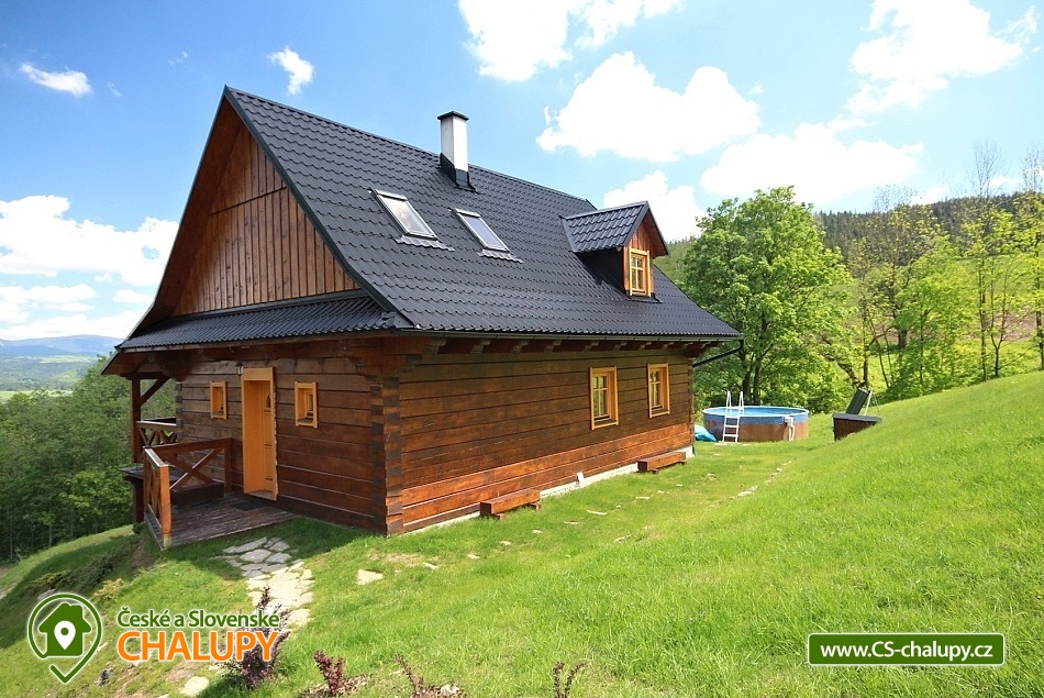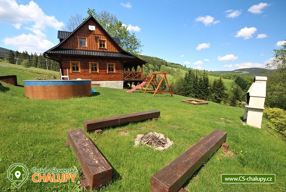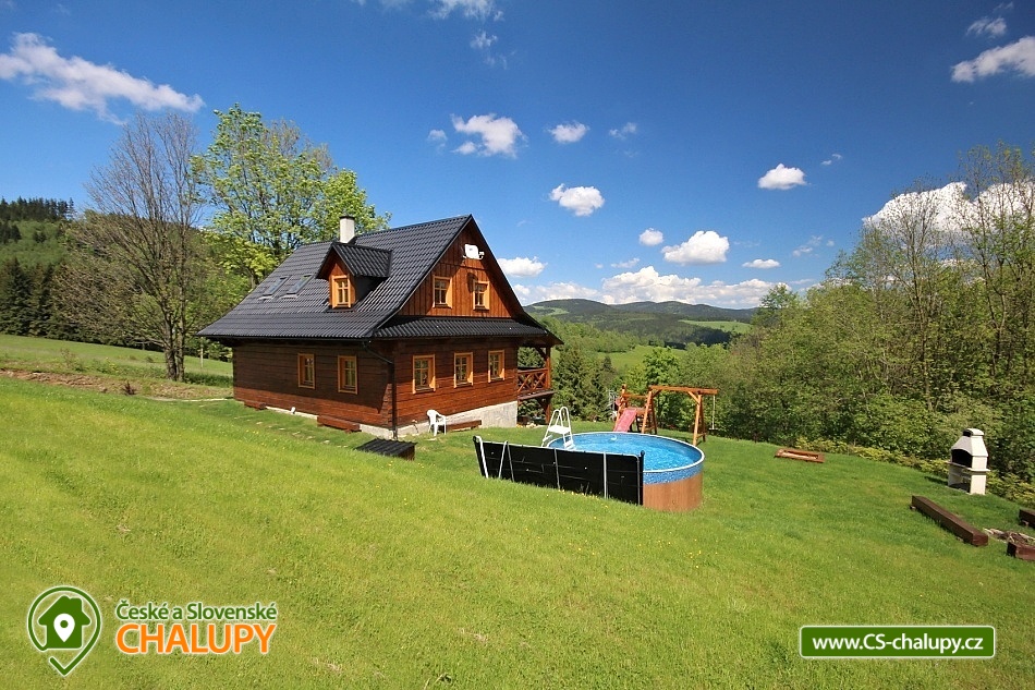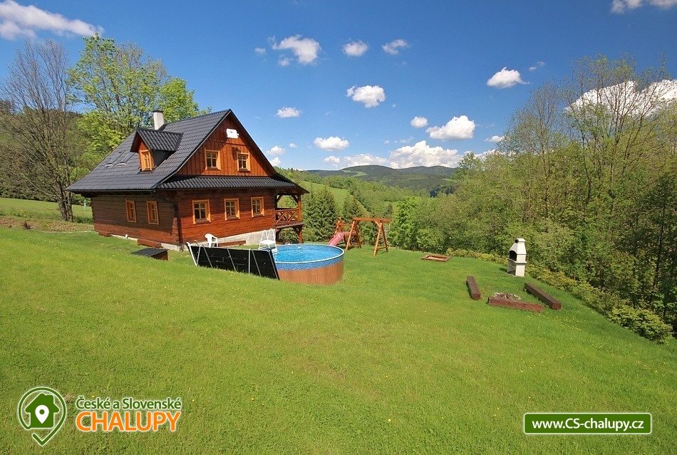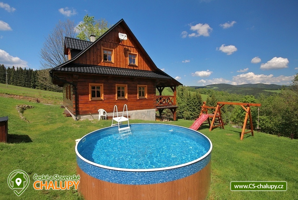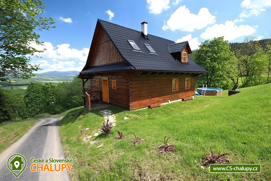 Roubenka Stříbrnice - cottage rental. Cottage for rent - a newly built timber house is located in the immediate vicinity of the ski slope 800 m long and a mountain stream at the foot of Králický Sněžník in the small village Stříbrnice, 3 km from the Old Town under Sneznik. Only mountain meadows and forests are surrounded by the house. On the ground floor there is a fully equipped kitchen with a wooden corner seating connected to a common room with a sofa set (2 extra beds) and a large LCD TV with satellite. On the ground floor there is also a technical room with the possibility of ski or bicycle storage and a bathroom with hydromassage shower box and toilet. Upstairs there are 3 bedrooms, each with 4 beds. Upstairs there is a bathroom with corner bath and toilet. The heating can be made of tile stoves for wood and electric. Heaters. In the summer, the pool is 3.6 x 1.2 m with sand filtration, solar heating and outdoor seating on the roofed terrace. Parking is available directly at the timetable.