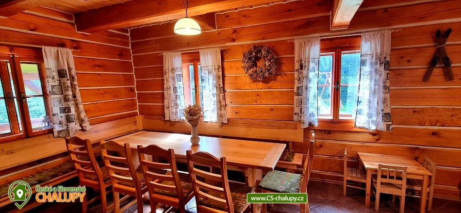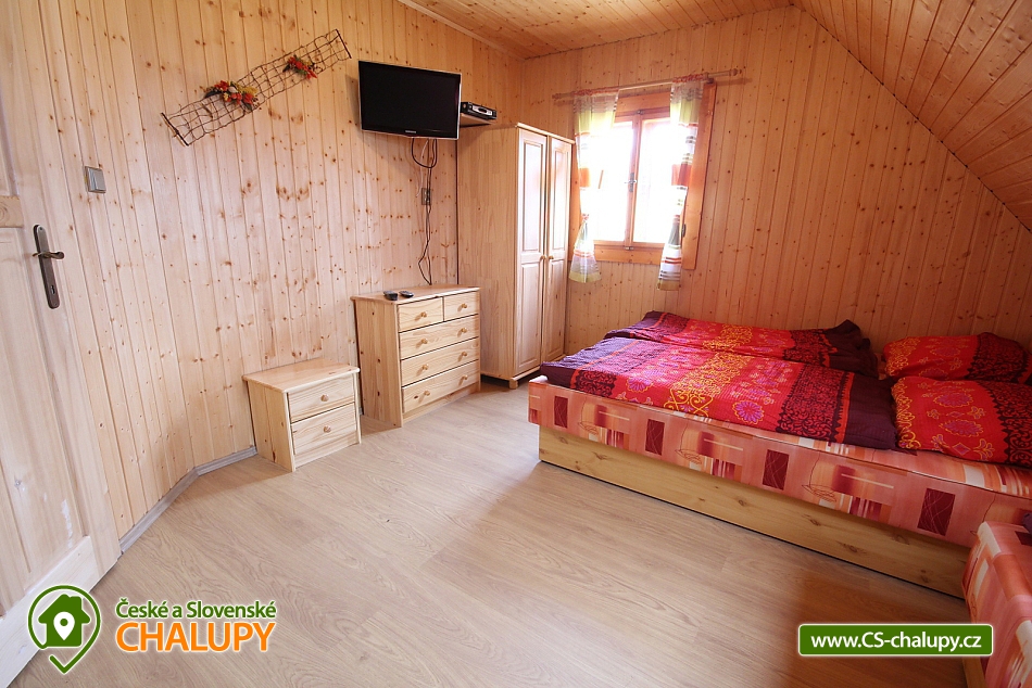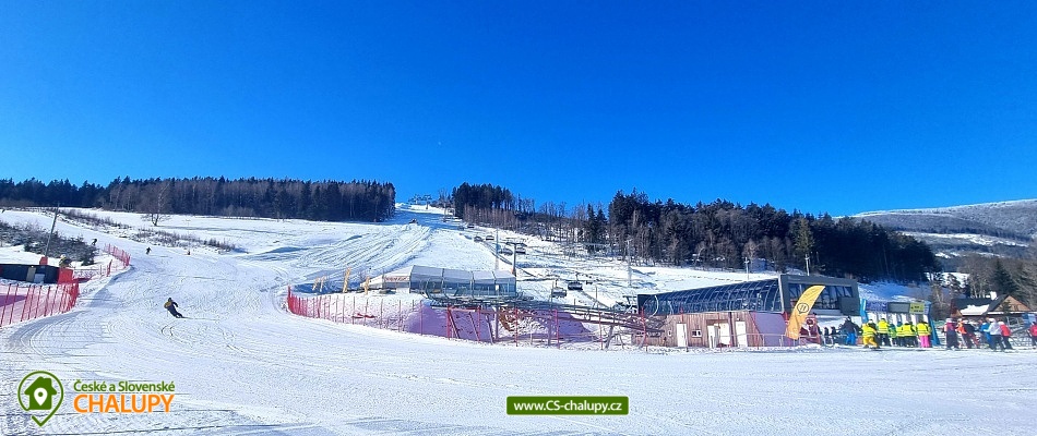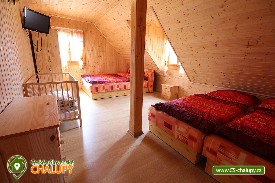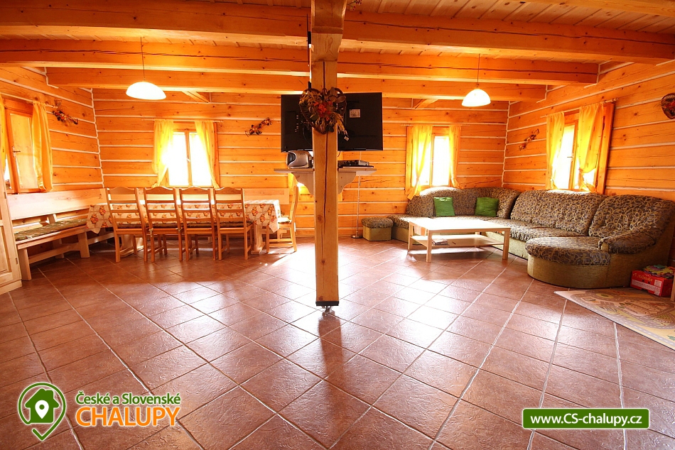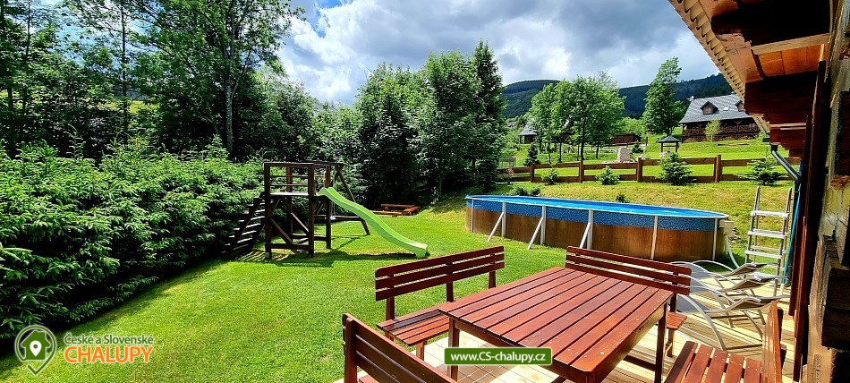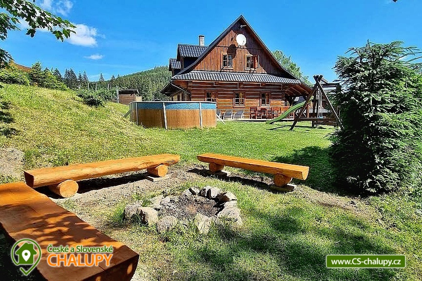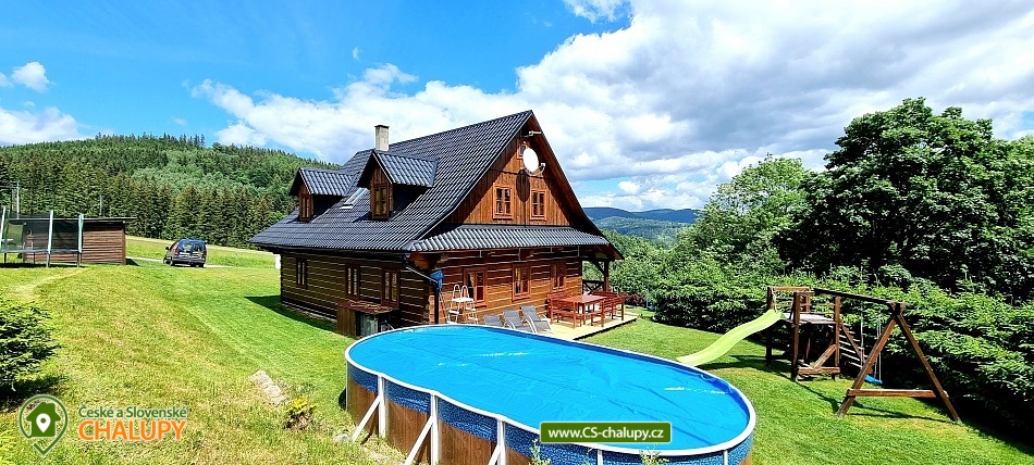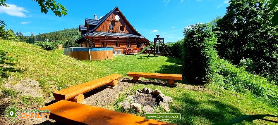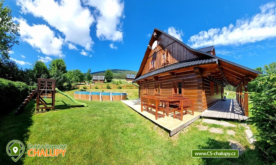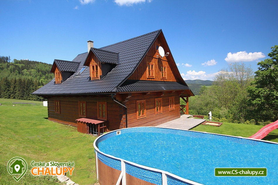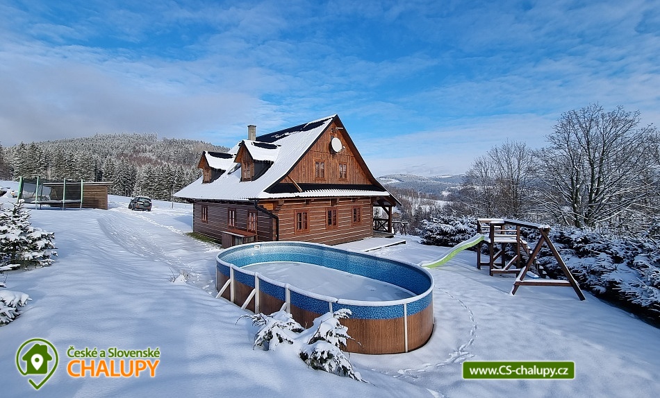 Mountain cottage Stříbrnice - cottage rental. Roubenka located in the immediate vicinity of the ski slope 800 m long and mountain stream at the foot of Králický Sněžník in the small village Stříbrnice, 3 km from the Old Town under Sneznik. On the ground floor above-standard equipped cottages is fully equipped kitchen (sitting, ceramic hob, electric oven, microwave oven, fridge, coffee maker, dishwasher, kettle and freezer) connected with large common room with tiled stove, Extra beds) and a large LCD satellite TV. On the ground floor there is also a relaxation room with a sauna and a large hydromassage bath for 2 people, a technical room with the possibility of storage of skis and bikes and a bathroom with hydromassage shower box and toilet. Upstairs there are 3 bedrooms, each with 4 beds and an LCD TV with satellite. Sanitary facilities on the upper floor include a large bathroom with a corner bath, toilet and 2x washbasin. The heating is a tiled stove, it heats the whole building, available directly. At the cottage there is an 8 x 4 m above sea level pool, 1.2 m deep with solar heating, grill, sandbox, swings, fireplace and outdoor seating on the roofed terrace. Parking by the house, in the winter months on a 150 m away car park.