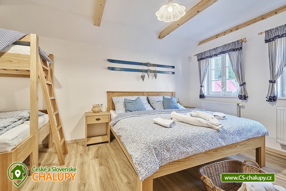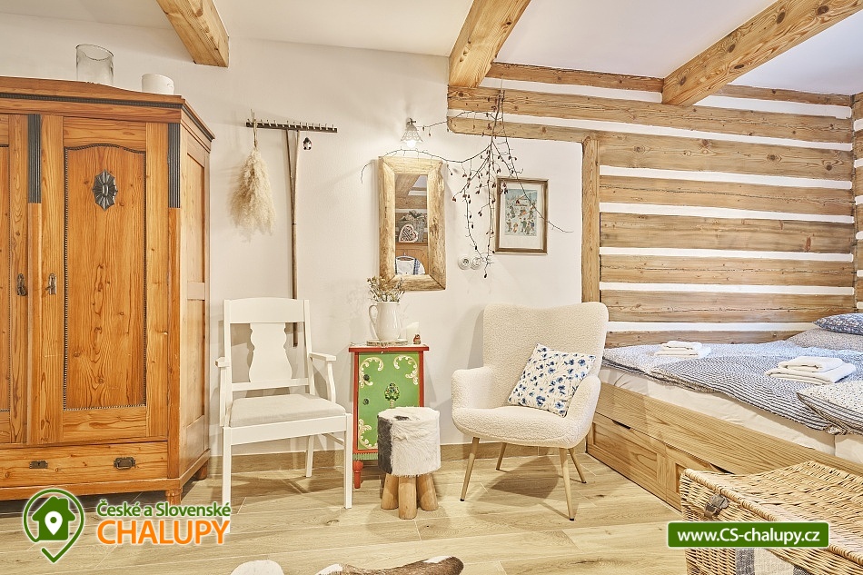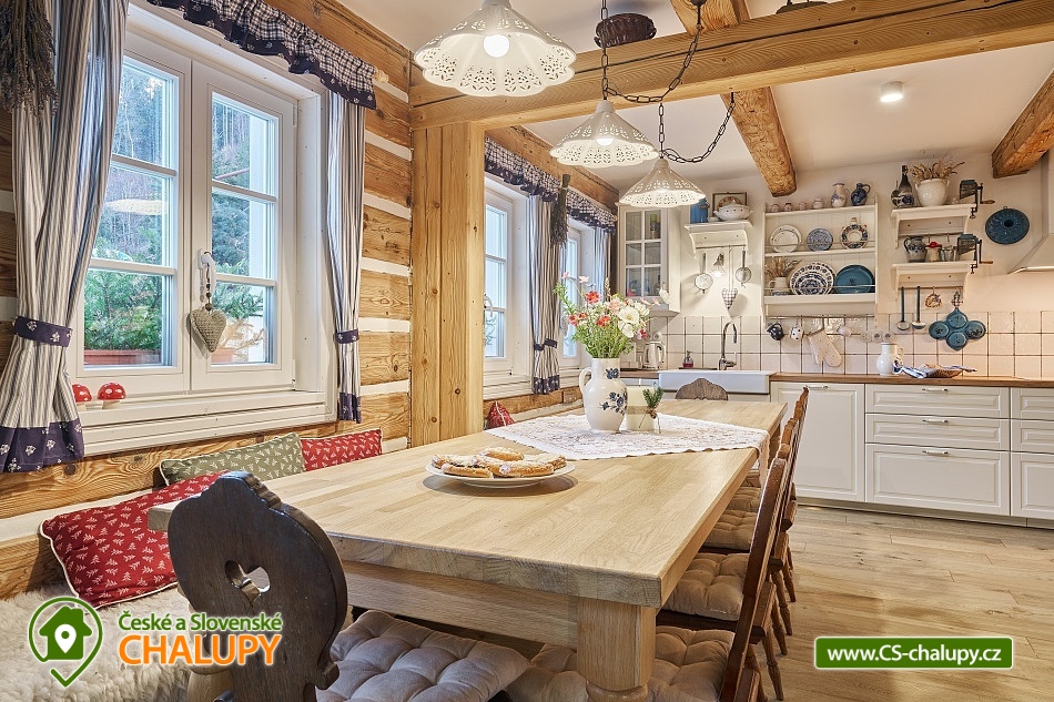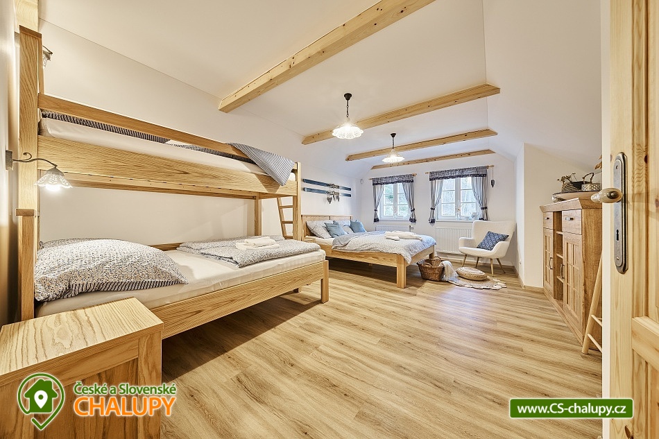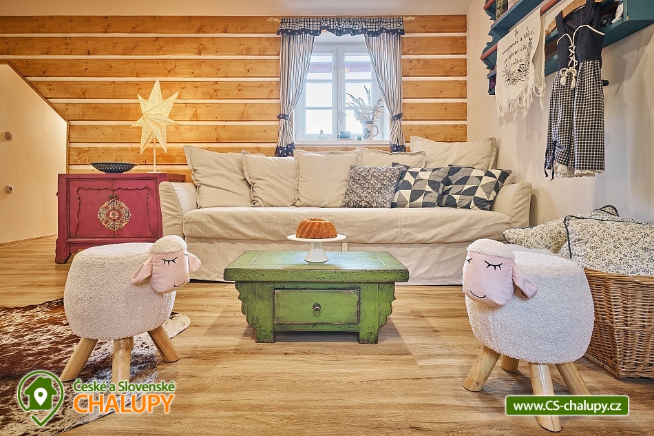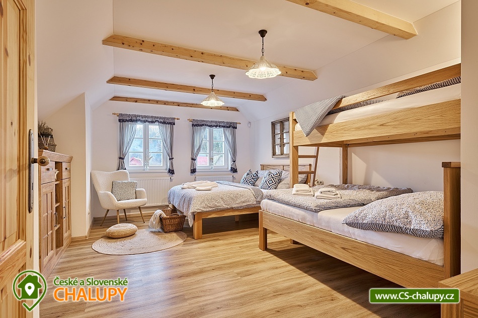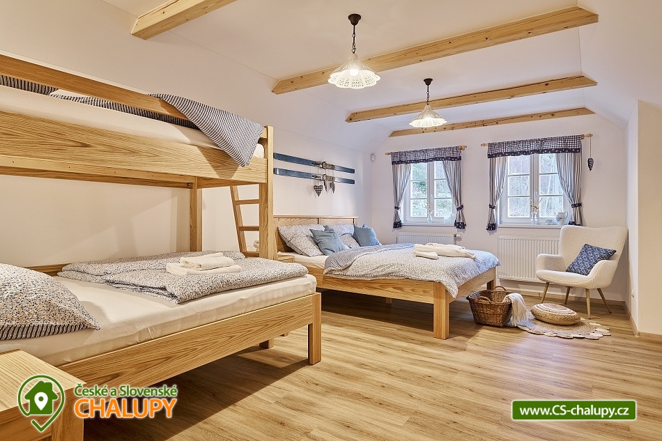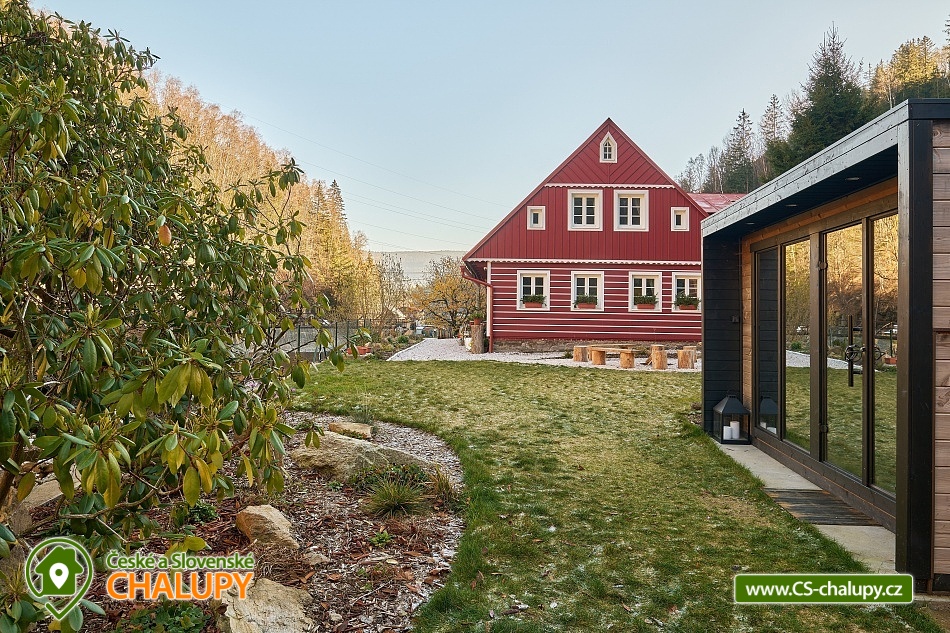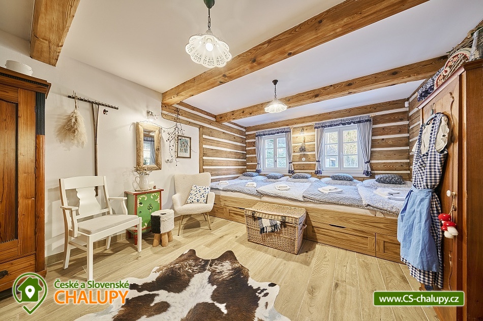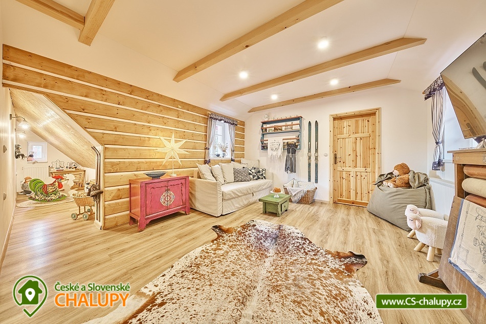 Comfortable log cabin with sauna and tiled stove Horní Maršov - Temný Důl. Rent a luxurious newly renovated cottage for up to 18 people located in the village of Horní Maršov - Temný Důl. The cottage has a fully equipped kitchen: oven, dishwasher, 4-burner ceramic hob, toaster, kettle, microwave, freezer and electric coffee maker. The living room has a TV with a tiled stove and a dining (social) table. On the ground floor there is also a room with 5 beds and a room with 1 double bed and 1 sofa bed. On the upper floor there is an open living room with TV, a room with 2 bunk beds, 1 French bed and 1 double bed. Furthermore, a room with 2 bunk beds, 1 French bed and 1 double bed. There is also a washing machine, dryer, high chair for children, cot and Wi-Fi internet. There are a total of 4 toilets and 2 bathrooms in the log cabin. There is a sauna with a cooling pool, outdoor seating and a fireplace at the cottage. In the area we recommend: SUMMER - Sněžka Cable Car - Pec pod Sněžkou, Černá hora Cable Car - Janské Lázně (hiking, scooters, children's amusement park), Relaxpark - Pec pod Sněžkou (bob-sledding track, Monkey park, slides, trampolines, pulley ride), Treetop Trail in Janské Lázně, Mladé Buky - family area for families with children, Dvůr Králové nad Labem ZOO, Adršpach and Teplice Rocks. WINTER - The largest ski area in the Czech Republic: Černá hora (+ sledding route) - Pec pod Sněžkou (+ bobsledding track) - Velká Úpa - Černý důl - Svoboda n. Úpa. Horní Malá Úpa (ice rink), Mladé Buky (bob-sled track) and the Krkonoše ski route for cross-country skiing enthusiasts. We look forward to seeing you at our place.
