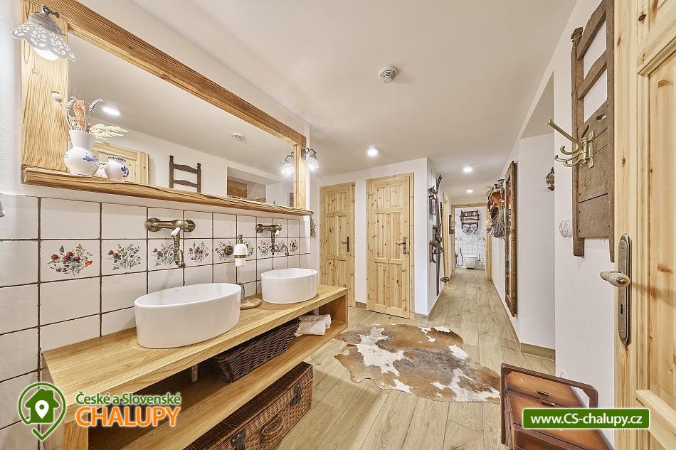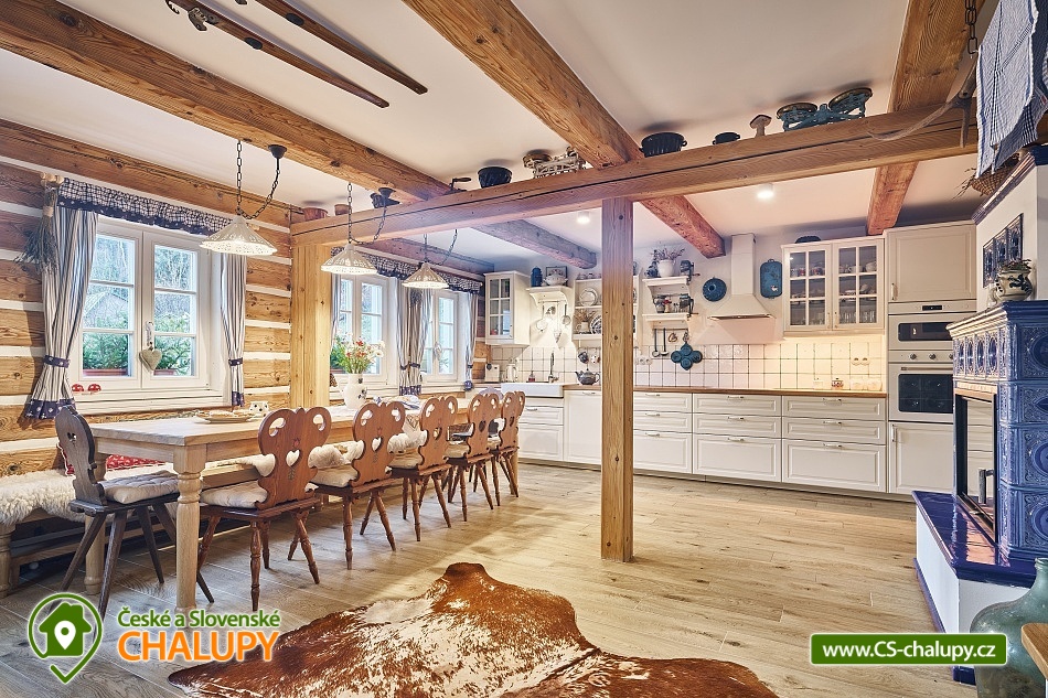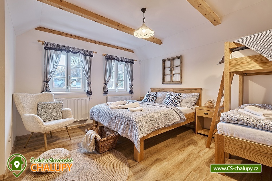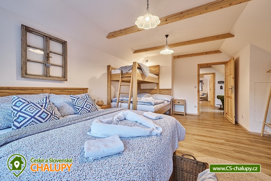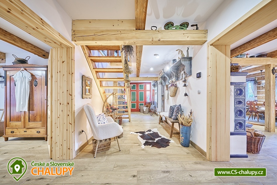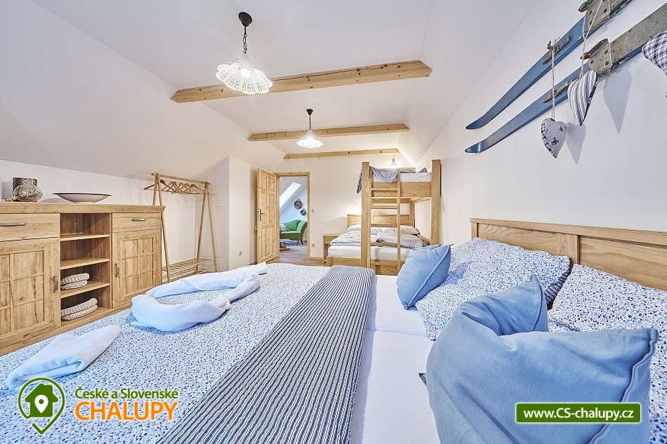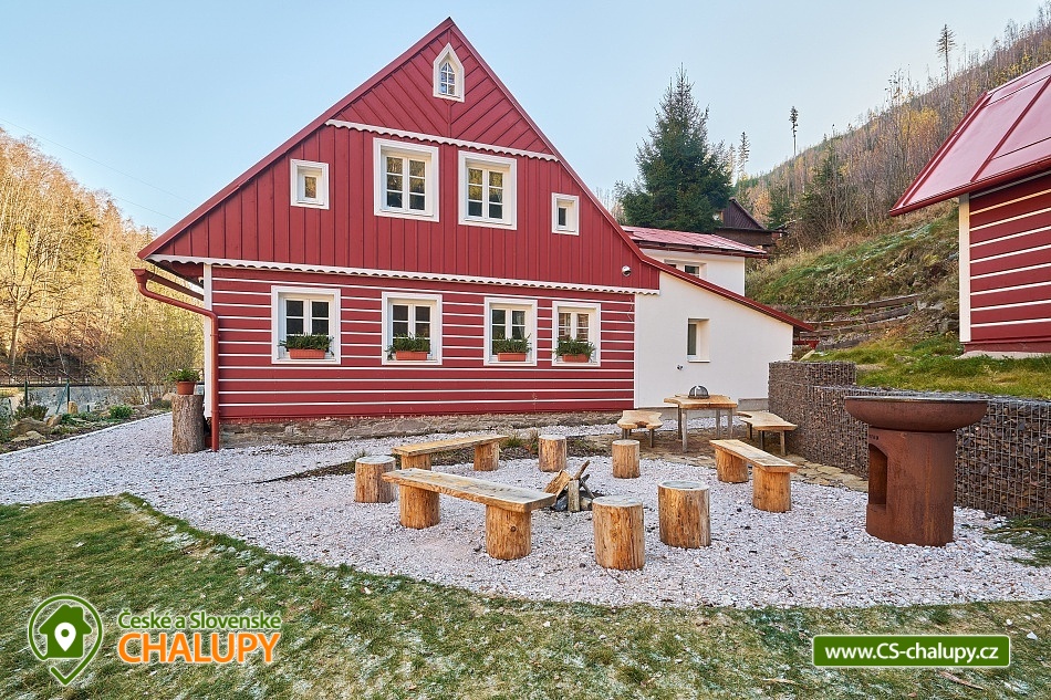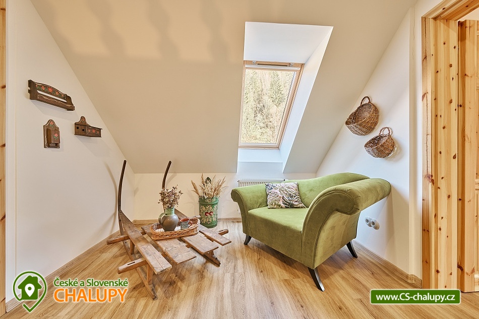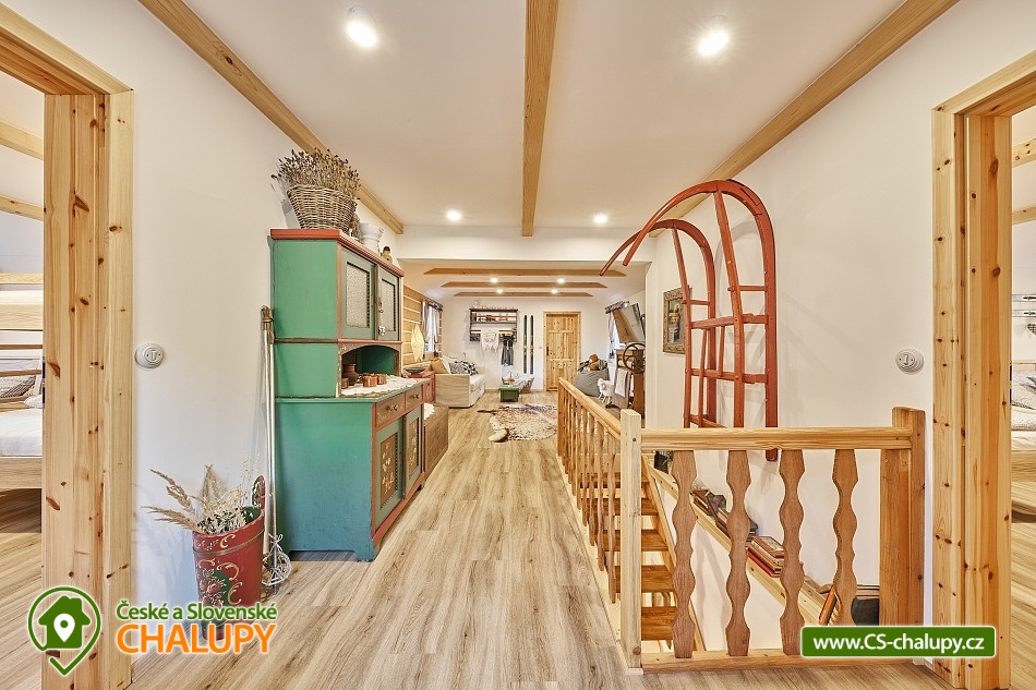 Comfortable log cabin with sauna and tiled stove Horní Maršov - Temný Důl. Rent a luxurious newly renovated cottage for up to 18 people located in the village of Horní Maršov - Temný Důl. The cottage has a fully equipped kitchen: oven, dishwasher, 4-burner ceramic hob, toaster, kettle, microwave, freezer and electric coffee maker. The living room has a TV with a tiled stove and a dining (social) table. On the ground floor there is also a room with 5 beds and a room with 1 double bed and 1 sofa bed. On the upper floor there is an open living room with TV, a room with 2 bunk beds, 1 French bed and 1 double bed. Furthermore, a room with 2 bunk beds, 1 French bed and 1 double bed. There is also a washing machine, dryer, high chair for children, cot and Wi-Fi internet. There are a total of 4 toilets and 2 bathrooms in the log cabin. There is a sauna with a cooling pool, outdoor seating and a fireplace at the cottage. In the area we recommend: SUMMER - Sněžka Cable Car - Pec pod Sněžkou, Černá hora Cable Car - Janské Lázně (hiking, scooters, children's amusement park), Relaxpark - Pec pod Sněžkou (bob-sledding track, Monkey park, slides, trampolines, pulley ride), Treetop Trail in Janské Lázně, Mladé Buky - family area for families with children, Dvůr Králové nad Labem ZOO, Adršpach and Teplice Rocks. WINTER - The largest ski area in the Czech Republic: Černá hora (+ sledding route) - Pec pod Sněžkou (+ bobsledding track) - Velká Úpa - Černý důl - Svoboda n. Úpa. Horní Malá Úpa (ice rink), Mladé Buky (bob-sled track) and the Krkonoše ski route for cross-country skiing enthusiasts. We look forward to seeing you at our place.