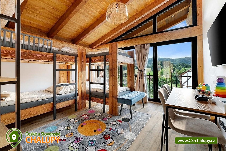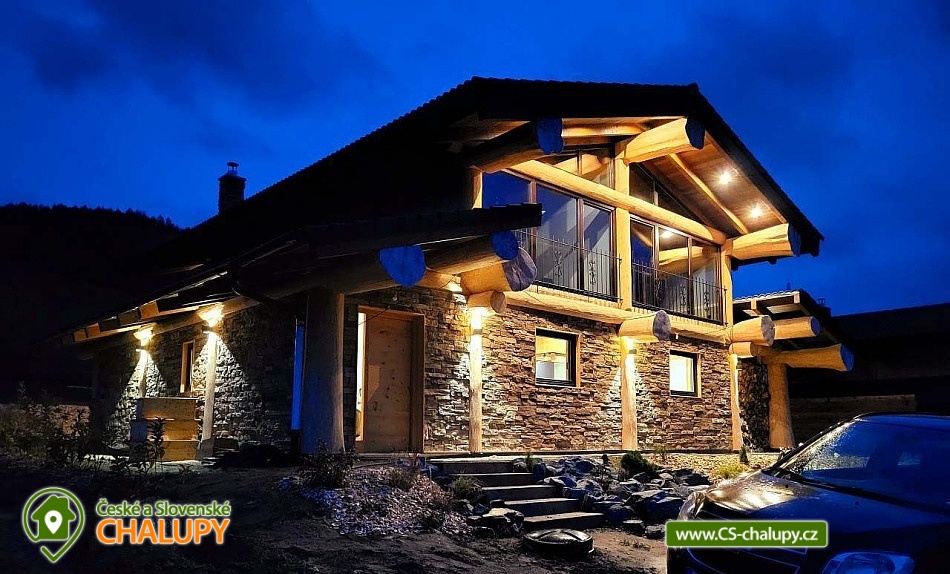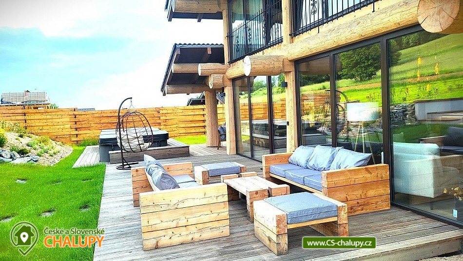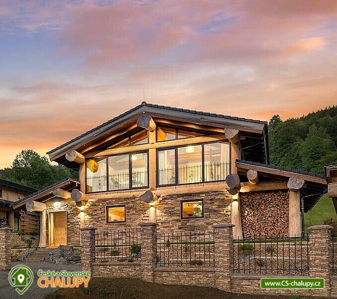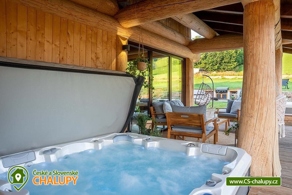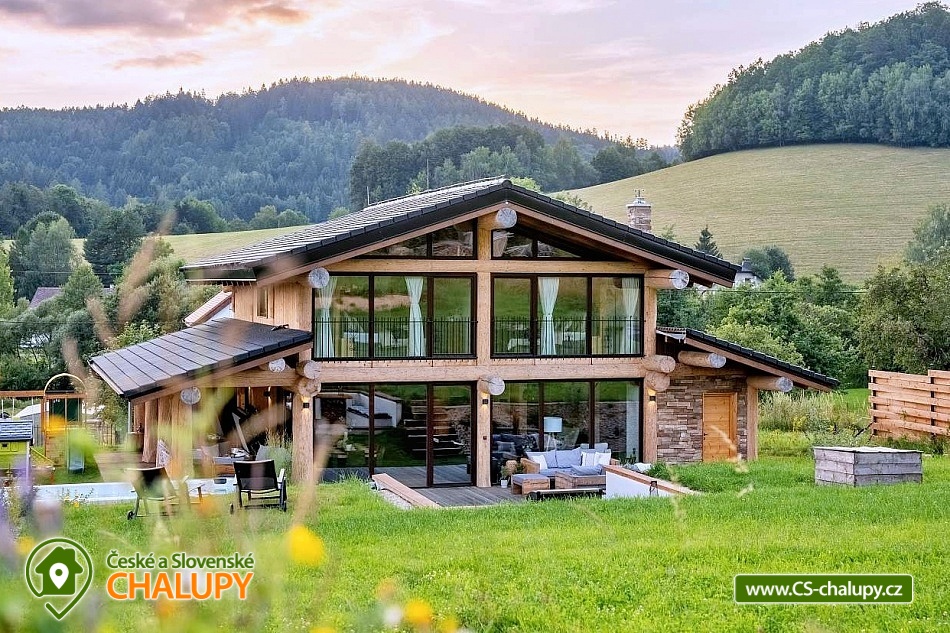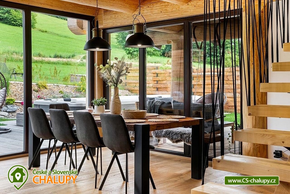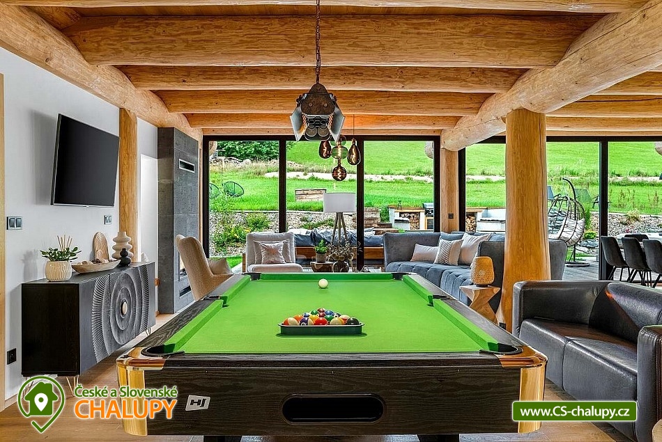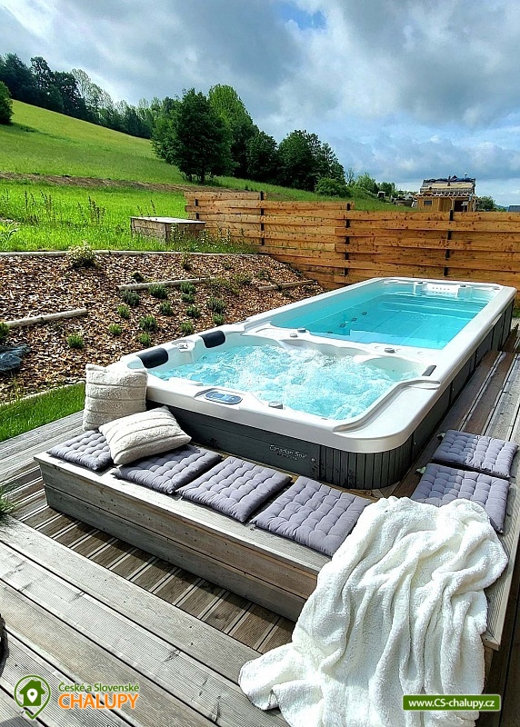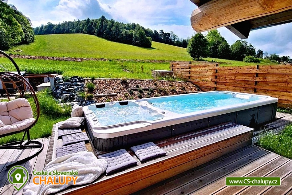 Wellness cabin Velké Losiny - Jeseníky Mountains - Finnish sauna, whirlpool and heated pool. Welcome to the wellness cabin, where the deepest swimming pool SWIM SPA Nautilus XXL for 7 people with countercurrent awaits you. In the beautiful landscape of the Jeseníky Mountains, in the popular destination of Velké Losiny, there is a newly built modern cabin, which is the ideal place for your next relaxing or sporting holiday. Imagine a mountain cabin smelling of wood, cozy, pleasing to the eye of every lover of modern design. Glass panes over two floors invite light and sunlight inside, offering a magical view of the surroundings. The Velké Losiny cabin offers accommodation for up to 10 people in 4 bedrooms. GROUND FLOOR: entrance hall with storage spaces (wardrobe, hangers, shoe rack), utility room for storing sports equipment, main living room with spacious kitchen with island, large dining table and seating for 10 people, two comfortable sofas for pleasant sitting by the fireplace, also a pool table and electronic darts for long winter evenings, so even in case of bad weather you will definitely not be bored with us. Upstairs there are 4 bedrooms, each with a glass gable which offers a magical view of the surroundings, 3 double bedrooms with a double bed, 1 quadruple bedroom. High-quality continental beds, anti-allergic blankets and storage space for your clothes are a matter of course. Upon agreement, we will lend you a cot, a bath tub, a potty. Heating is provided by a modern fireplace in the living room, underfloor heating throughout the building, heating ladders in the bathrooms, an electric ski boot dryer in the technical room. Excellent accessibility by car all year round, parking on the private fenced plot for 4 cars. After a challenging ski trip or a day trip, you will certainly appreciate the possibility of an outdoor Finnish sauna and relaxation in the jacuzzi, both as part of the spacious terrace surrounding the building in the back, with seating and a rocking chair, followed by a large illuminated fireplace with comfortable seating and a built-in grill. A magical place for all those looking for peace, quiet and fresh air. Accommodation suitable for families with children, meetings of friends, couples longing for romance and corporate teambuildings. The surroundings offer excellent skiing and cross-country skiing terrain. In summer, you can use a large number of cycling routes and hiking trails, sports activities and historical monuments. Swimming lovers will find their place in the popular thermal spa - Velké Losiny. Do you want to experience romantic moments, peace and quiet with the scent of wood, gain new energy and relax your mind? Then come to us, we look forward to seeing you.