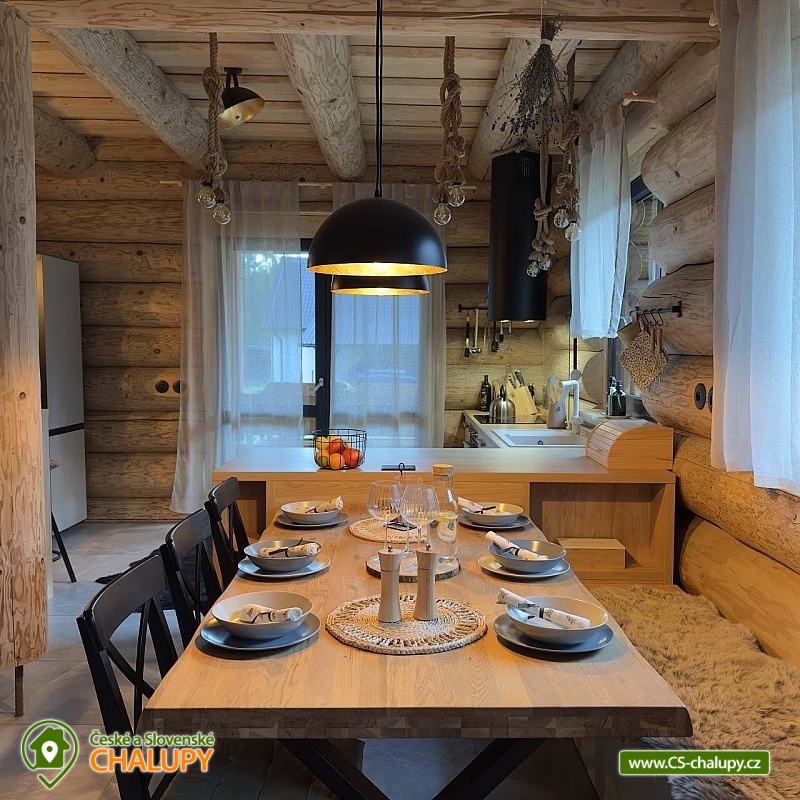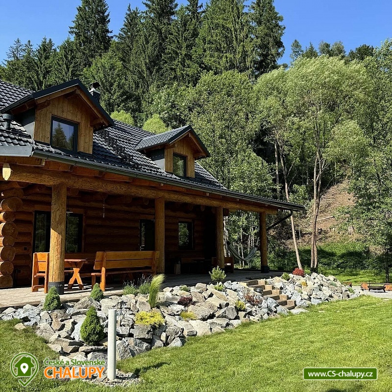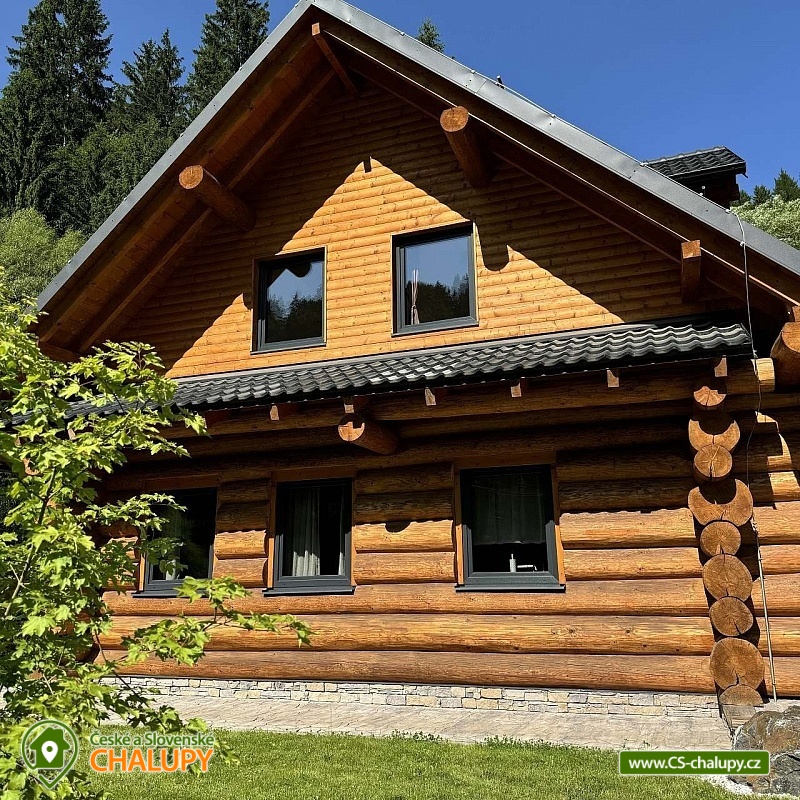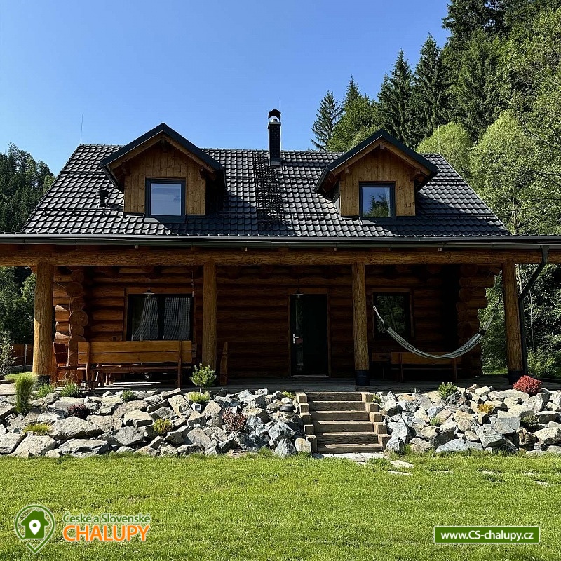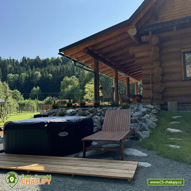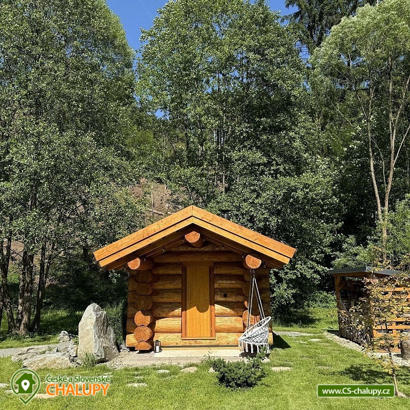 Log cabin with wellness (hot tub, sauna and hot tub) under Kozí hřbet in the foothills of the Jeseníky Mountains. The capacity of the cabin is up to 10 people in 3 bedrooms. Whether you are looking for a relaxing holiday or want to organize a celebration or a small family gathering, our log cabin will offer you facilities exactly according to your wishes. Its location makes it an ideal place for well-deserved rest, cycling trips, hiking, cross-country skiing or skiing. The log cabin provides accommodation for 10 people in 3 bedrooms: a four-bed bedroom (1x bunk bed, 1x double bed), a four-bed bedroom (1x double bed, 2x extra beds in the form of a pull-out bed) and a double bedroom (1x double bed). A cot is also available. There is also a fully equipped kitchenette (electric oven, induction hob, microwave, kettle, fridge, coffee maker, dishwasher and dishes), which is connected to the living room with a sofa, large dining table, fireplace and children's corner with toys. The sanitary facilities include a bathroom with a free-standing bathtub, spacious shower, sink and washing machine, as well as a separate toilet with a urinal on the ground floor. There is a second bathroom with a shower and toilet in the attic. The cabin is heated by underfloor heating and a fireplace. The property offers free WI-FI internet access. The cabin is surrounded by a garden with parking directly at the property (max. 5 cars). The garden includes an outdoor sauna for 6 people, a cooling barrel for 2 people, a covered terrace with seating, a fireplace, a grill and a hammock. During the summer season, a hot tub for 6 people is available. In the vicinity of the cabin there are opportunities for hiking, cycling, swimming, skiing, cross-country skiing, fishing and mushroom picking. Swimming options include: Žulová quarry, Vápenná quarry or Losiny thermal baths. In winter, nearby ski resorts are an advantage, for example: X-Park Františkov ski area, Lázeňský vrch ski area, Přemyslov ski area or Kareš ski area. Trips in the surrounding area include: Čertovy kameny, the lookout tower on Medvědí hora, Adrenalin Park Jeseníky, the Vincenz Priessnitz Trail and the Kamenné okno rock formation. We look forward to seeing you.