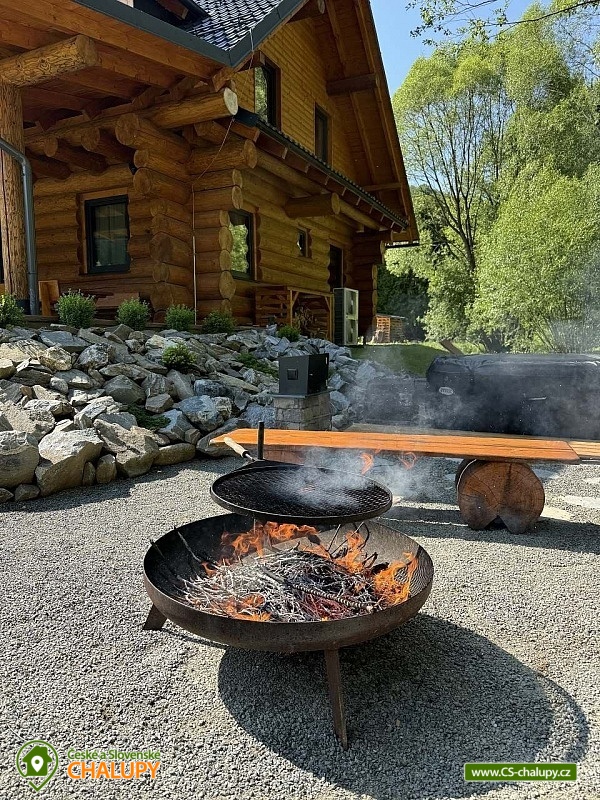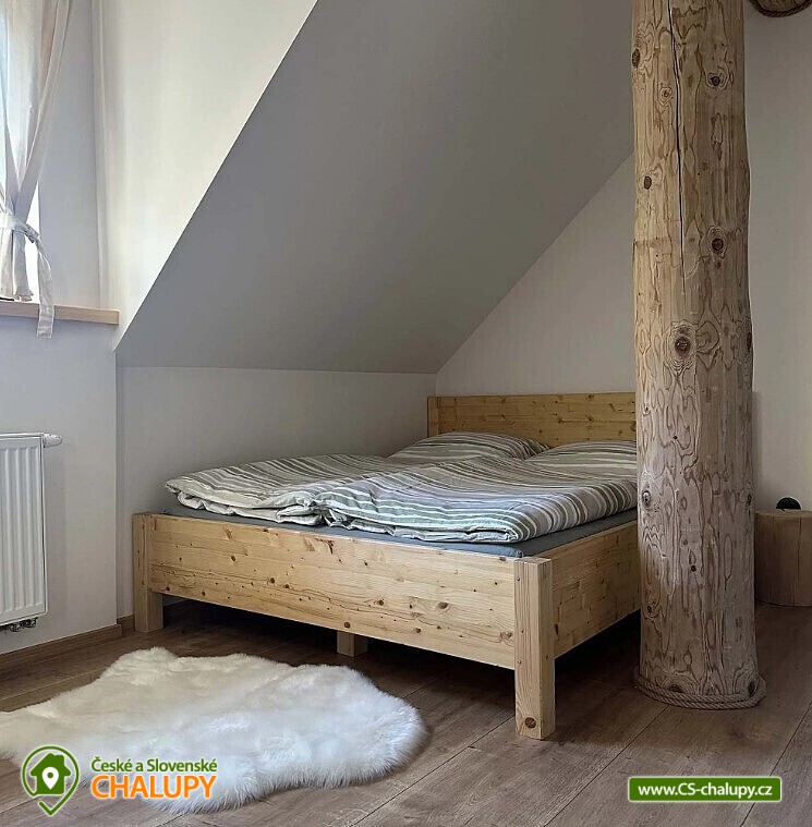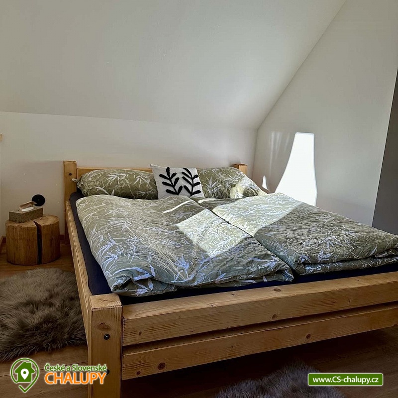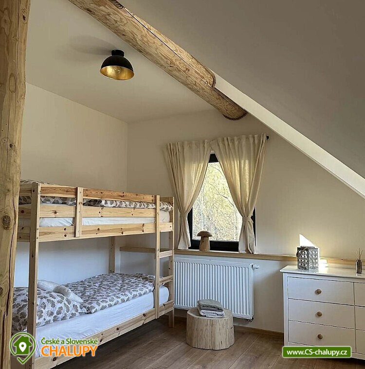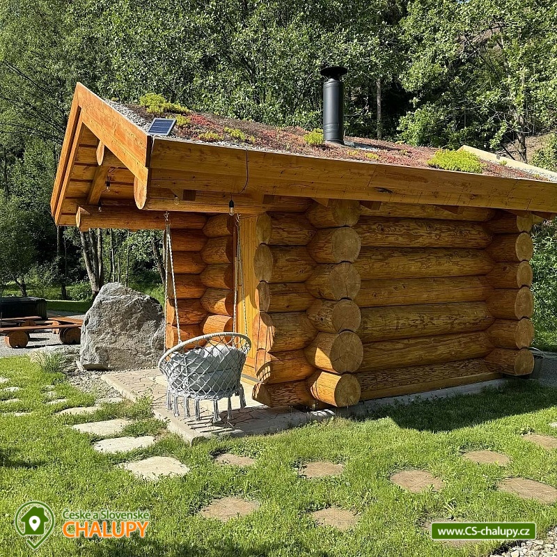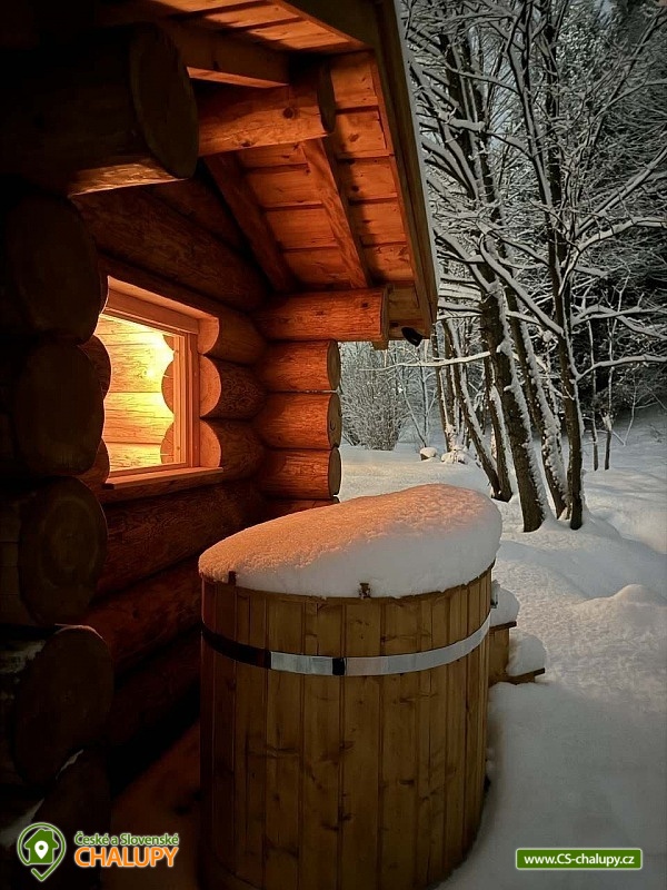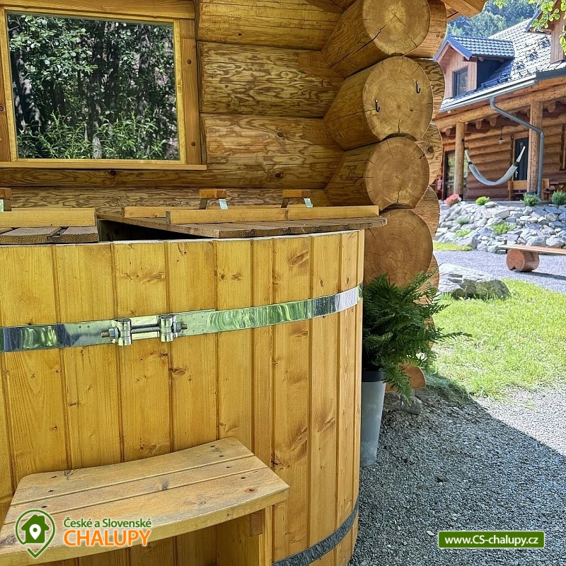 Log cabin with wellness (hot tub, sauna and hot tub) under Kozí hřbet in the foothills of the Jeseníky Mountains. The capacity of the cabin is up to 10 people in 3 bedrooms. Whether you are looking for a relaxing holiday or want to organize a celebration or a small family gathering, our log cabin will offer you facilities exactly according to your wishes. Its location makes it an ideal place for well-deserved rest, cycling trips, hiking, cross-country skiing or skiing. The log cabin provides accommodation for 10 people in 3 bedrooms: a four-bed bedroom (1x bunk bed, 1x double bed), a four-bed bedroom (1x double bed, 2x extra beds in the form of a pull-out bed) and a double bedroom (1x double bed). A cot is also available. There is also a fully equipped kitchenette (electric oven, induction hob, microwave, kettle, fridge, coffee maker, dishwasher and dishes), which is connected to the living room with a sofa, large dining table, fireplace and children's corner with toys. The sanitary facilities include a bathroom with a free-standing bathtub, spacious shower, sink and washing machine, as well as a separate toilet with a urinal on the ground floor. There is a second bathroom with a shower and toilet in the attic. The cabin is heated by underfloor heating and a fireplace. The property offers free WI-FI internet access. The cabin is surrounded by a garden with parking directly at the property (max. 5 cars). The garden includes an outdoor sauna for 6 people, a cooling barrel for 2 people, a covered terrace with seating, a fireplace, a grill and a hammock. During the summer season, a hot tub for 6 people is available. In the vicinity of the cabin there are opportunities for hiking, cycling, swimming, skiing, cross-country skiing, fishing and mushroom picking. Swimming options include: Žulová quarry, Vápenná quarry or Losiny thermal baths. In winter, nearby ski resorts are an advantage, for example: X-Park Františkov ski area, Lázeňský vrch ski area, Přemyslov ski area or Kareš ski area. Trips in the surrounding area include: Čertovy kameny, the lookout tower on Medvědí hora, Adrenalin Park Jeseníky, the Vincenz Priessnitz Trail and the Kamenné okno rock formation. We look forward to seeing you.