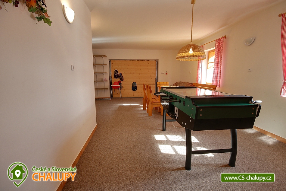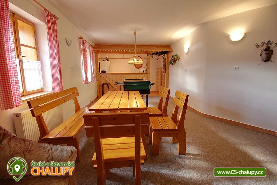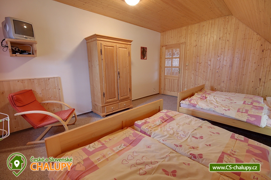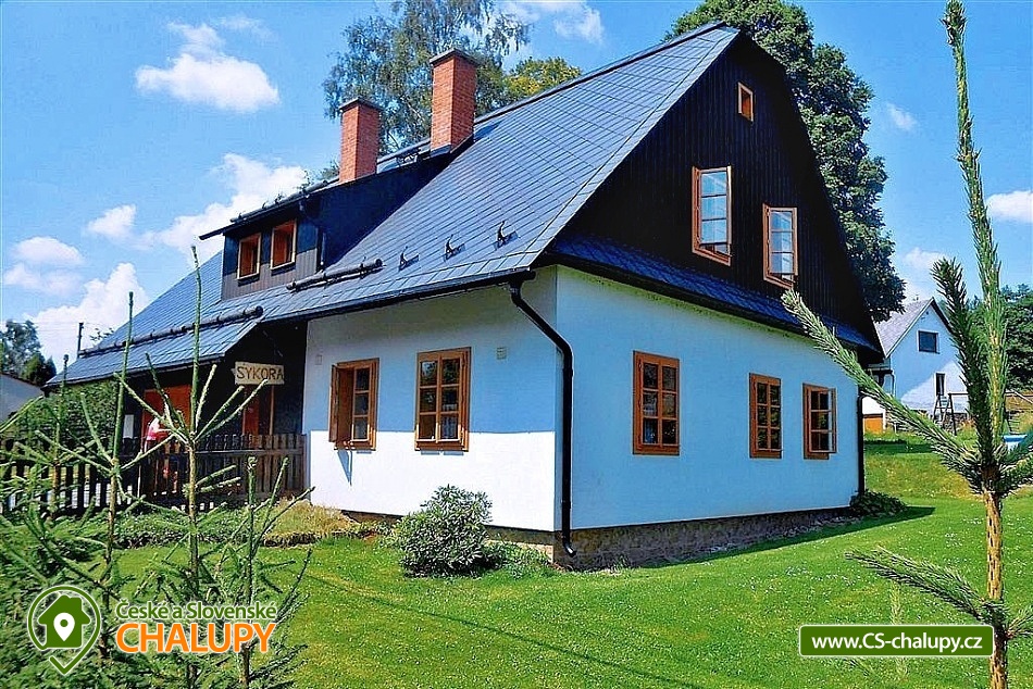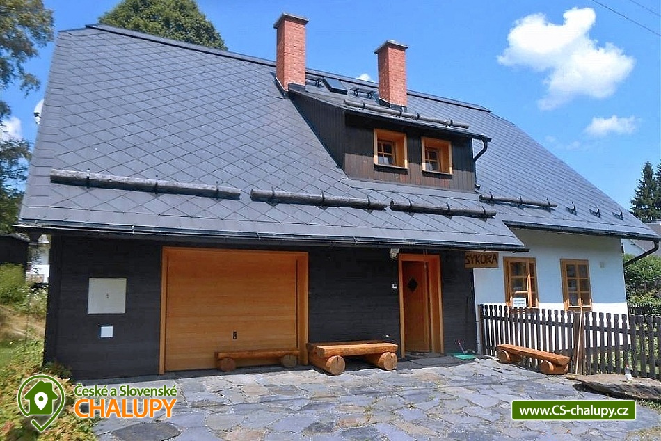 Sýkorova cottage - Suchá Rudná. Rent cottage Jeseníky, Praděd. Sýkorova cottage for rent Bruntál district. The comfortable Sýkorova cottage is located in the small village Suchá Rudná in the district of Bruntál in the Jeseníky Mountains at the foot of the Praděd Mountain. The cottage is in the middle, has a large garden and is in a beautiful valley surrounded by deep forests. On the ground floor in a hunting style of a furnished building there is a spacious lounge (sitting, bar with wine and fridge, CD player and table football), large living room (comfortable seat, large dining area, CD, TV / SAT, party games and wooden staircase to Floor) and fully equipped kitchen (refrigerator with freezer, electric oven, ceramic hob, kettle, microwave oven, mixer and complete dining service), there is a technical room with washing machine, dryer, iron and iron. Plank. On the ground floor there is also a bathroom with a toilet. On the floor of the cottage there are four completely identical bedrooms (in each bedroom 2 x double bed and TV / SAT) and large bathroom with toilet. Inside the cottage there is a lockable ski / bicycle. The property has a large 1500 m2 garden, an outdoor pool, an outdoor sitting area, a garden fireplace with all amenities, a piglet, a children's climbing frame, a swing, basketball basket and a well with drinking water. You can park directly at the property. The surrounding area is perfect for hiking, cycling, mushroom picking and winter sports.