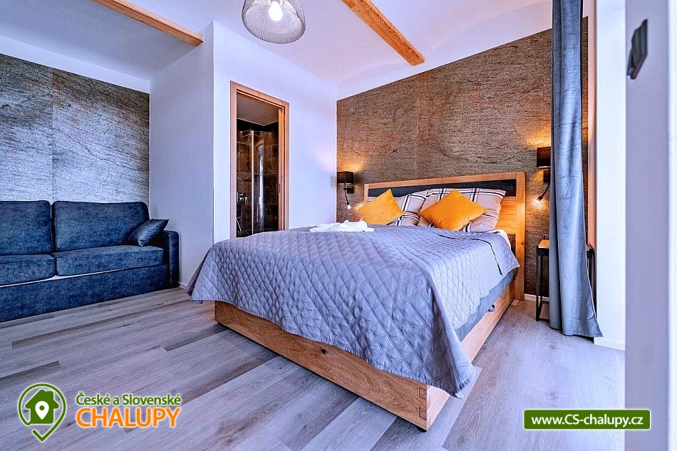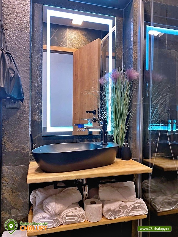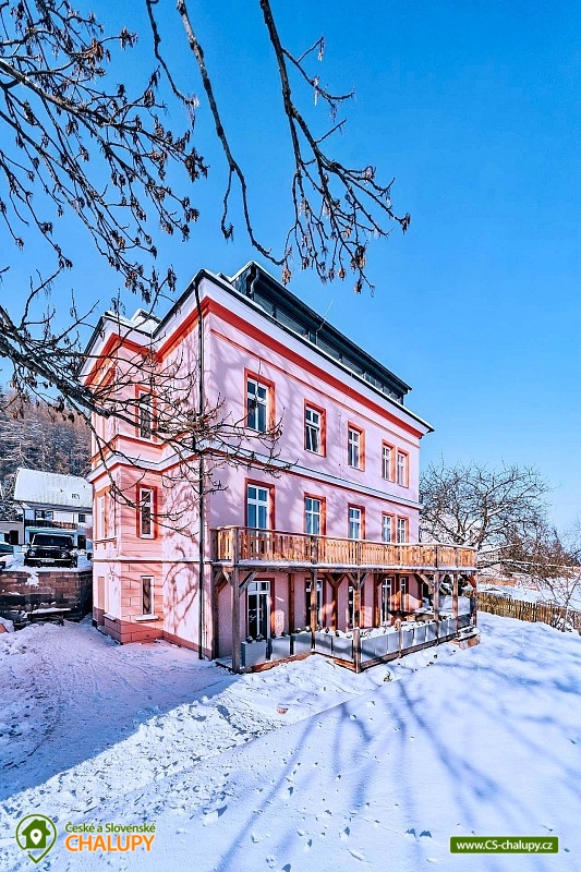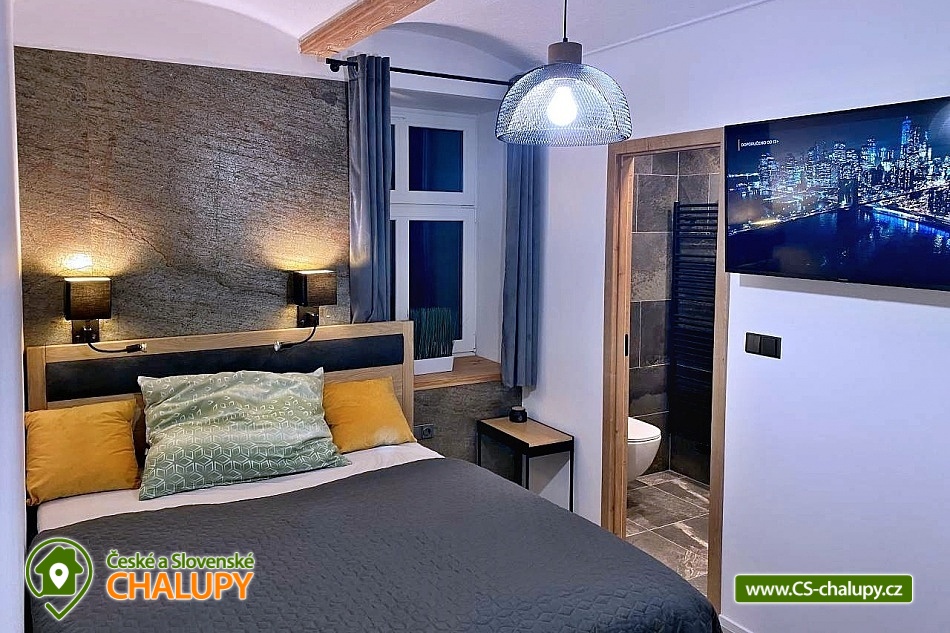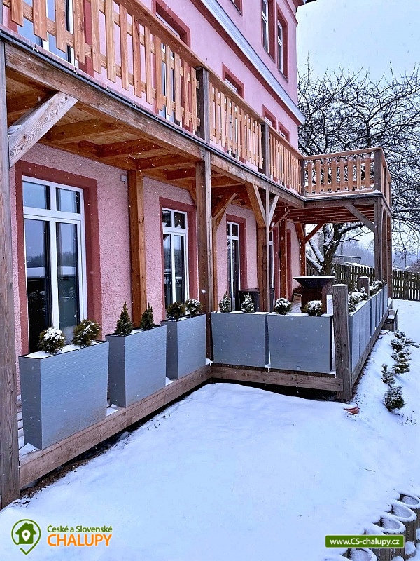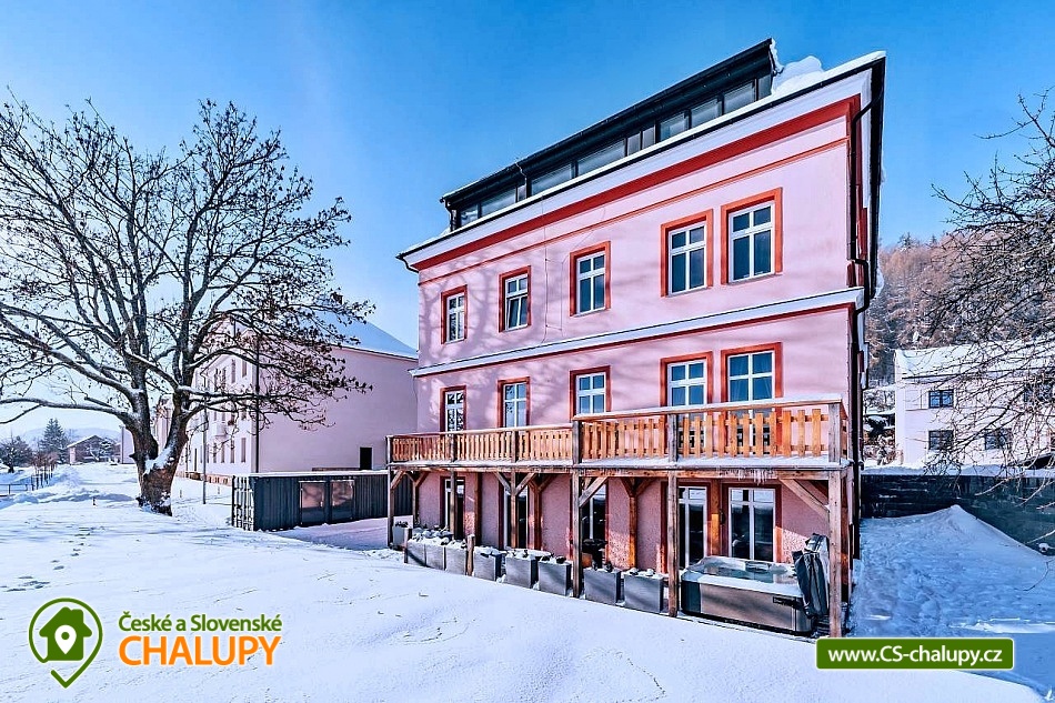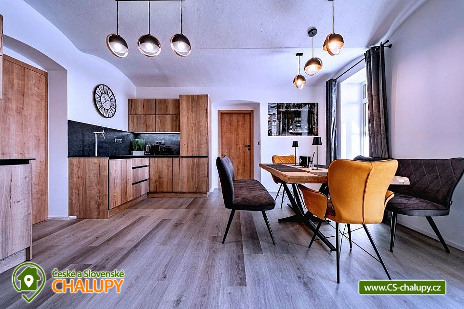 Apartment Horský Sklípek (own cinema + wine cellar with wine cellar and fireplace + outdoor terrace with Villeroy & Bochse hot tub and Ofyr grill) is always rented as a whole to 1 group, located in the village of Žacléř near Prkenného Dol in the Giant Mountains. It is an ideal place for relaxation and rest in the beautiful Krkonoše nature for families with children or a closed group. The apartment includes a cinema room with a large sofa bed, which is also used for sleeping. The movie theater has a professional projector with a widescreen screen, high-quality sound system and a comfortable sofa to make you feel like you are in a real cinema. The outdoor terrace is equipped with a Villeroy & Boch hot tub for 5 people. There is an outdoor seating area on the outdoor terrace with the renowned Ofyr grill. You can use the grill to grill your specialties or order quality flank steaks from a quality supplier. There is also a wine cellar with seating for 10 people with a wine cellar and a fireplace. Apartment Horský Sklípek provides accommodation for up to 10 people in 3 bedrooms. DESCRIPTION: Room 1 - double bed for 2 people + folding double bed for 2 people, bathroom with shower + WC, direct access to the terrace. Room 2 - double bed for 2 people + bunk bed for 2 people, bathroom with shower + toilet. Room 3 - large screen with professional projector, fully convertible sleeper sofa for 2 people, games console. Standard accommodation can accommodate 10 people. If you are interested in accommodating a larger number of people, a 4th room with a sofa bed (for 2 people) with a bathroom and toilet is possible after telephone arrangement. Social facilities: The first two rooms have their own bathroom + WC. In case of additional purchase of the fourth room, an additional bathroom with toilet is available. Heating: The entire building is centrally heated. The apartment has a fully equipped kitchen with a dining set for 10 people, with a kitchenette including a hob, oven, microwave, kettle, dishwasher, fridge, freezer, tap with beer cooler, Catler coffee machine with Nespresso, Tchibo, Nescafé Dolce capsules Gusto. There is also a dining chair for children. The Žacléřsko region is an ideal starting point for trips to the Czech and Polish sides of the Giant Mountains. On one side of the Krkonoše Mountains, on the other the Vraní Mountains and between them an open road to the Polish border. The natural diversity, historical monuments and tourist attractions of the region make Žacléřsk an ideal destination for one-day visits, weekend stays and longer holidays. The largest artillery fortress in the Czech Republic and one of the largest in Europe is located above Prkenný Dol on Stachelberg Hill. We look forward to seeing you here.