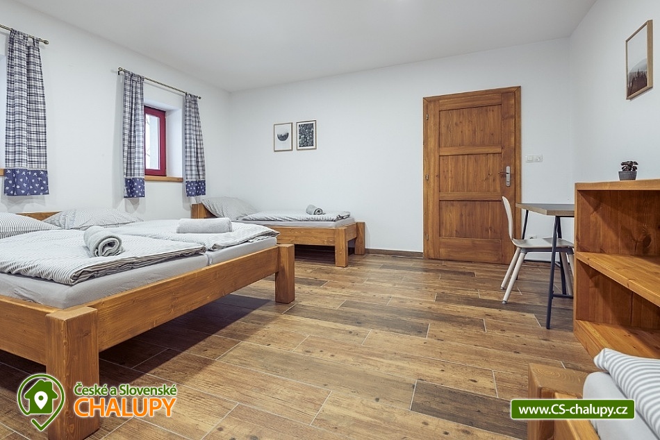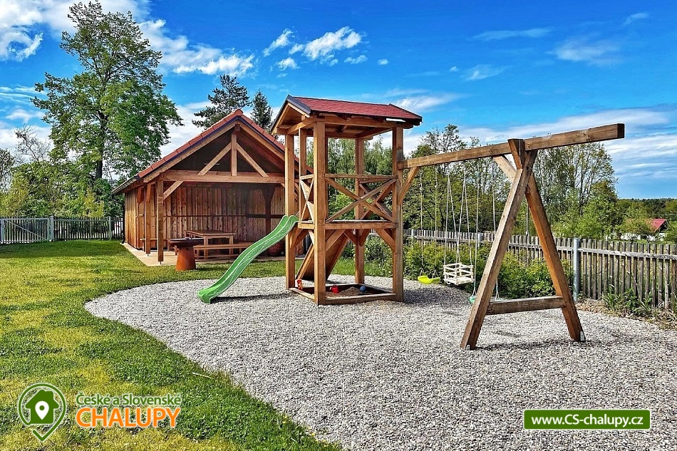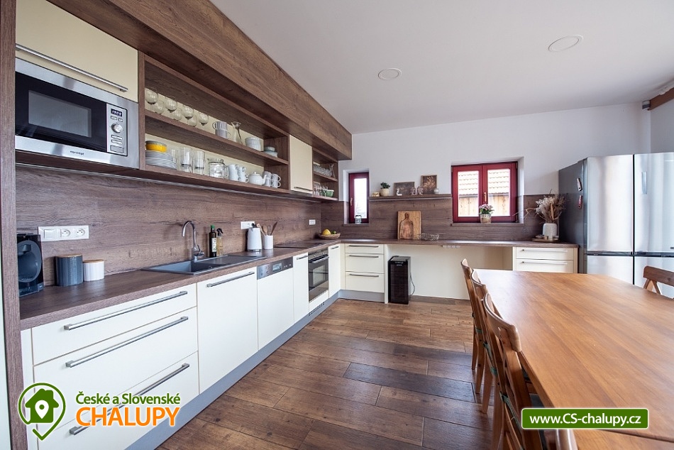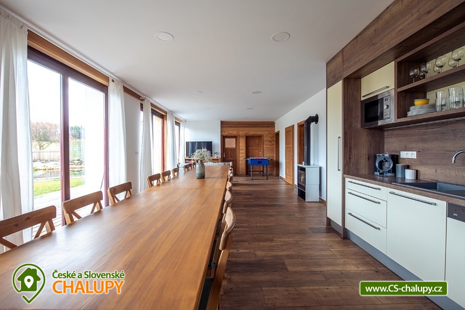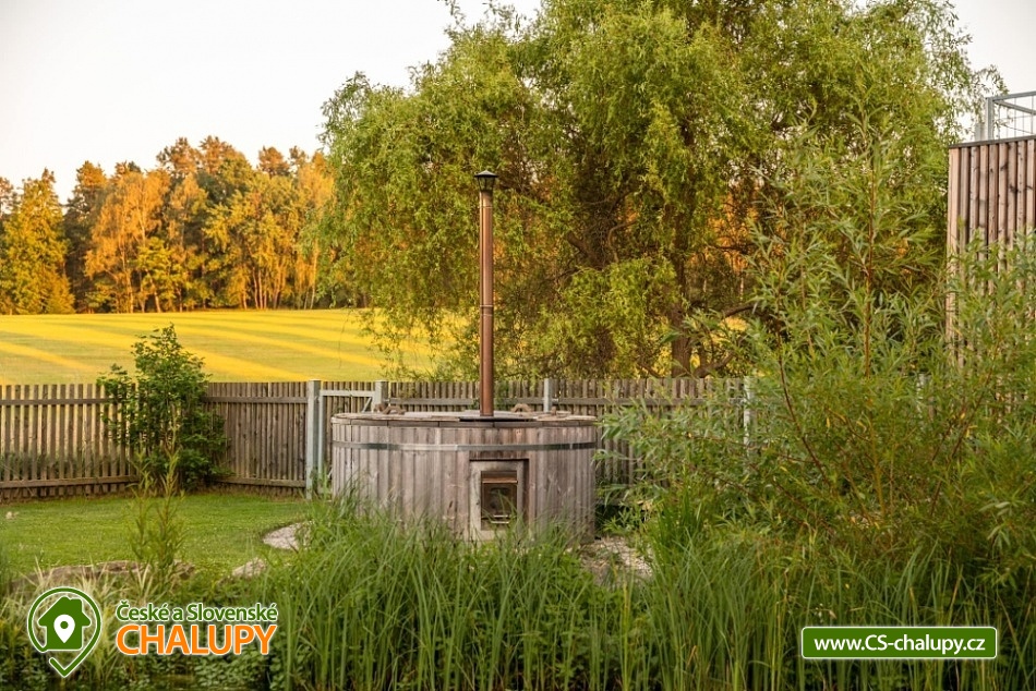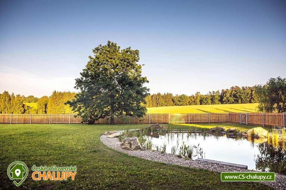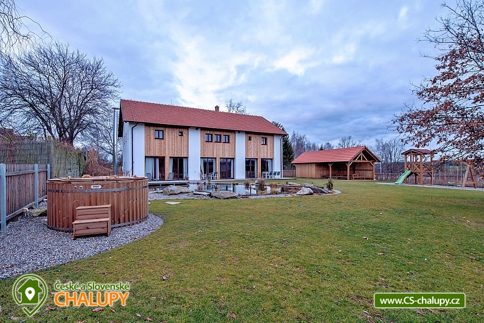 Wellness chalupa s koupacím jezírkem a venkovním bazénem SPA v krásném prostředí v oblasti Novohradských hor v jižních Čechách. Chalupa k pronajmutí poskytuje ubytování pro až 26 osob v 6 ložnicích. V chalupě se nachází 6 prostorných apartmánů s vlastním soc. zařízením. V přízemí jsou 2 ložnice, jedna se čtyřmi lůžky a jedna s pěti lůžky. V patře se nachází 4 ložnice, tři se čtyřmi lůžky a jedna s pěti lůžky. V každém apartmánu je jedna manželská postel a 2 - 3 jednolůžkové postele s lůžkovinami a ručníky. Dále TV - SAT, stůl se židlí a lampou, nočními stolky u postele. Přízemí: Ve velké obytné místnosti s přímým výhledem na přírodní jezírko a louku je TV - SAT, krbová kamna, stolní fotbal, jídelními stoly s 26-ti židlemi a prostorná kuchyně (plně vybavený kuchyňský kout: sklokeramická deska, elektrická trouba, mikrovlnná trouba, velká americká lednice s mrazákem, myčka, rychlovarná konvice, kávovar (Dolce Gusto), toastovač a sendvičovač, výčepní zařízení, dostatek veškerého kuchyňského nádobí.. ). Samostatná místnost s finskou saunou a sprchovým koutem. Patro: Na patře jsou dva menší plně vybavené kuchyňské kouty (sklokeramická deska, el. trouba, mikrovlnná trouba, myčka, rychlovarná konvice, kávovar, velká americká lednice, dvě menší ledničky jako součást kuchyně) a jídelní stůl. WI - FI připojení k internetu v celém objektu. Exteriér: Oplocený pozemek, přírodní koupací jezírko 100 m2,vířivka, zastřešené venkovní posezení, venkovní gril (na dřevěné uhlí), zahradní nábytek, dětský koutek, uzamykatelný přístřešek na uskladnění kol nebo lyží. V objektu se nachází 6 koupelen. Všechny apartmány mají vlastní koupelnu se sprchovým koutem a toaletou. V přízemí je navíc jedna společná toaleta v předsíni a sprcha u sauny. Ze společenské místnosti je kouzelný výhled na zahradu, louku a les. Vytápění chalupy: Tepelné čerpadlo - v celém objektu je podlahové vytápění. Možnost si snadno regulovat teplotu v každém pokoji samostatně. V každé koupelně je umístěn žebříkový radiátor. Parkování u objektu s dostatečným počtem parkovacích míst. V okolí doporučujeme: Nejbližší koupaliště Horní Stropnice 2 km, vodní areál Gmünd 25 km (svět koupání: skalní solný bazén, sportovní sladkovodní bazén, dětský krytý i venkovní bazén, saunový svět: achátová, křišťálová, ametystová), rybník 500 m. Turistika a cykloturistika v jižních Čechách. Výlety do okolí: klášter Zlatá Koruna, Český Krumlov (UNESCO) - množství kulturních a společenských akcí, hrad, otočné divadlo, návštěva CHKO Novohradské hory - Žofínský prales, Terčino údolí, rozhledna na Kraví hoře, tvrz Žumberk, Nové Hrady, v okolí prameny s léčivou vodou, prameniště Pohorského potoka, Trocnov (památník Jana Žižky), Rožmberk nad Vltavou, České Velenice, Gmünd, celodenní výlety do Rakouska.