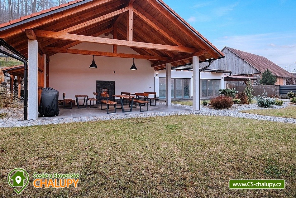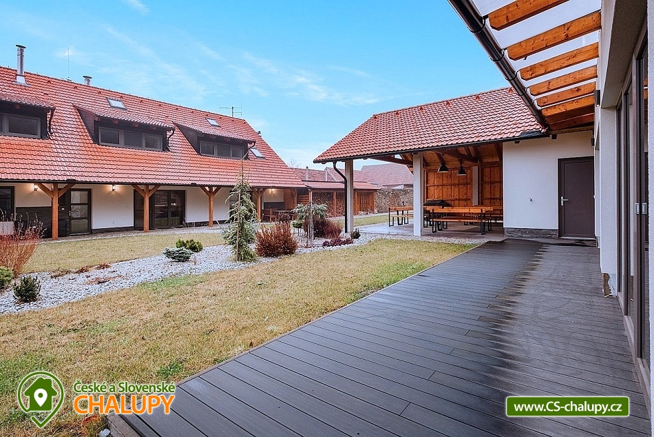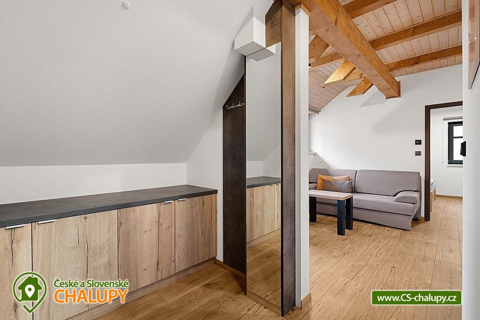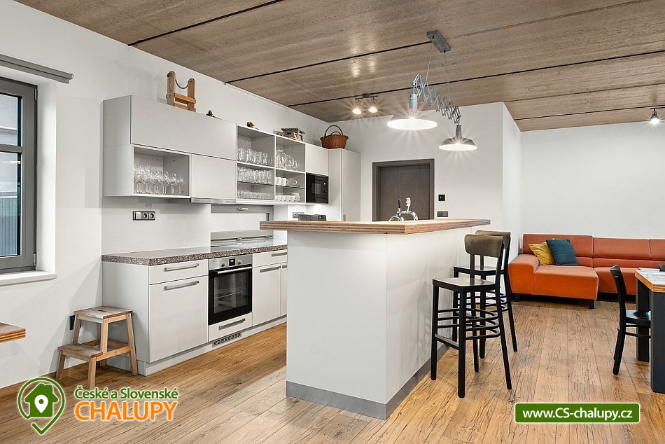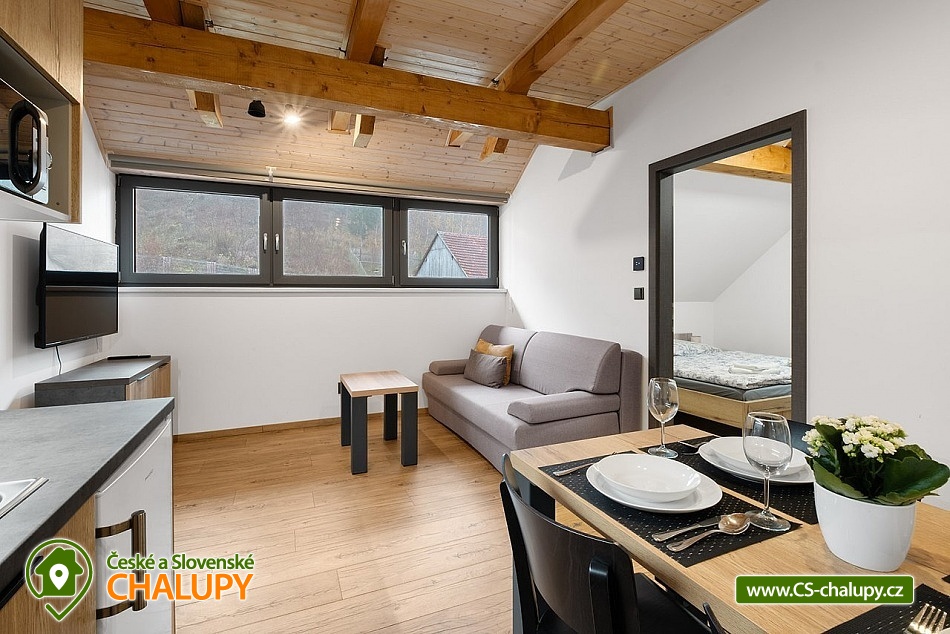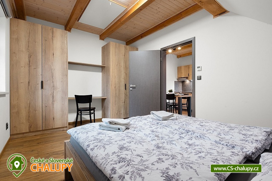 Wellness cottage with an indoor pool near the Oslava and Dalešické dam nature park, Vysočina region. There is a heated indoor saltwater pool, a wood-fired sauna and an outdoor jacuzzi. There is also a terrace with a barbecue and for children there are football goals and a ping-pong table. The cottage can accommodate up to 16 people (8 beds + 8 extra beds) in 4 apartments. DESCRIPTION: APARTMENTS: Comfortable apartments with their own fully equipped kitchen, modern bathroom and comfortable double bed. A sofa bed offers flexibility for additional guests or family. Another spacious sofa is located in the living room. TV, dining table + 4 chairs. Equipped kitchen - electric kettle, microwave, hob, fridge with freezer, toaster. Separate bathroom with shower and toilet. Towels and bed linen. COMMON ROOM: Equipped kitchen - electric kettle, microwave, hob, fridge with freezer, electric oven, toaster, contact grill, dishwasher, coffee maker, bar with tap equipment. Sanitary facilities, fireplace, wifi, TV, couch, tables and chairs. OUTDOOR AREA: covered terrace with garden furniture, grill. Football goals, ping-pong table available. Outdoor jacuzzi. BUILDING WITH SWIMMING POOL: heated saltwater pool, changing room, wood-fired sauna, showers, sanitary facilities, relaxation room with sun loungers. Nearby: Jinošov Game Reserve, Mohelenská Hadcová Steppe, Dalešická Dam, Oslava Nature Park, Šikland, Velké Meziříčí Chateau, Budišov and Valeč, Jaroměřice Chateau Park, Sedlce Waterfalls, Velká Skála and Templštějn Ruins, Studánka u Jakub. Lookout towers: Fajtův kopec, Wilsonova skála, Pekelný kopec and Babylon. We look forward to seeing you at our place.