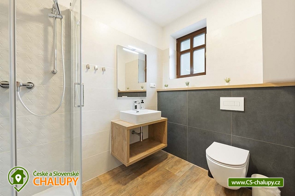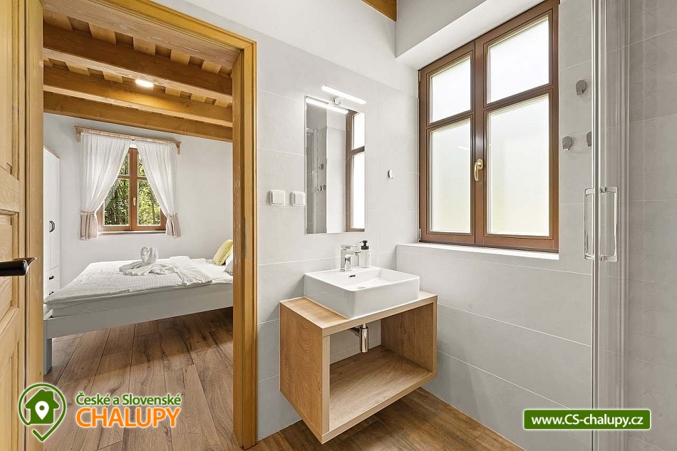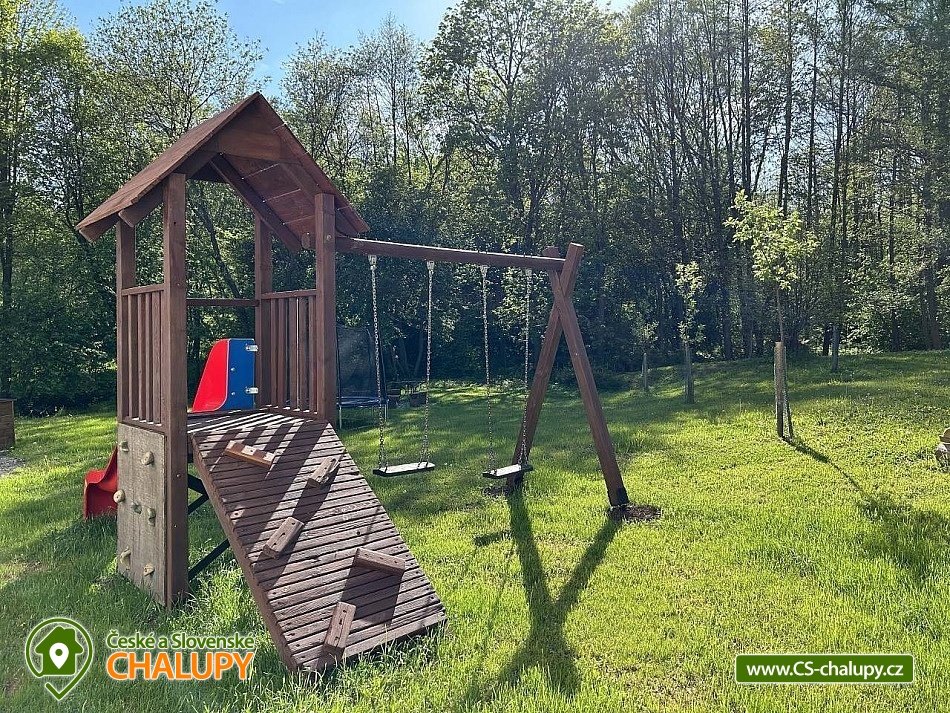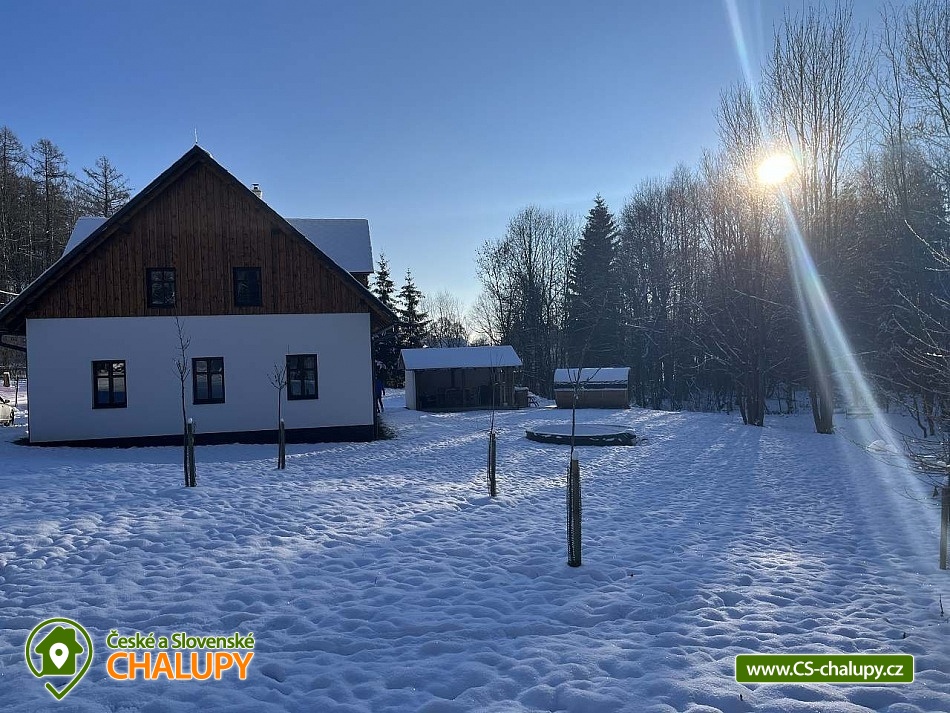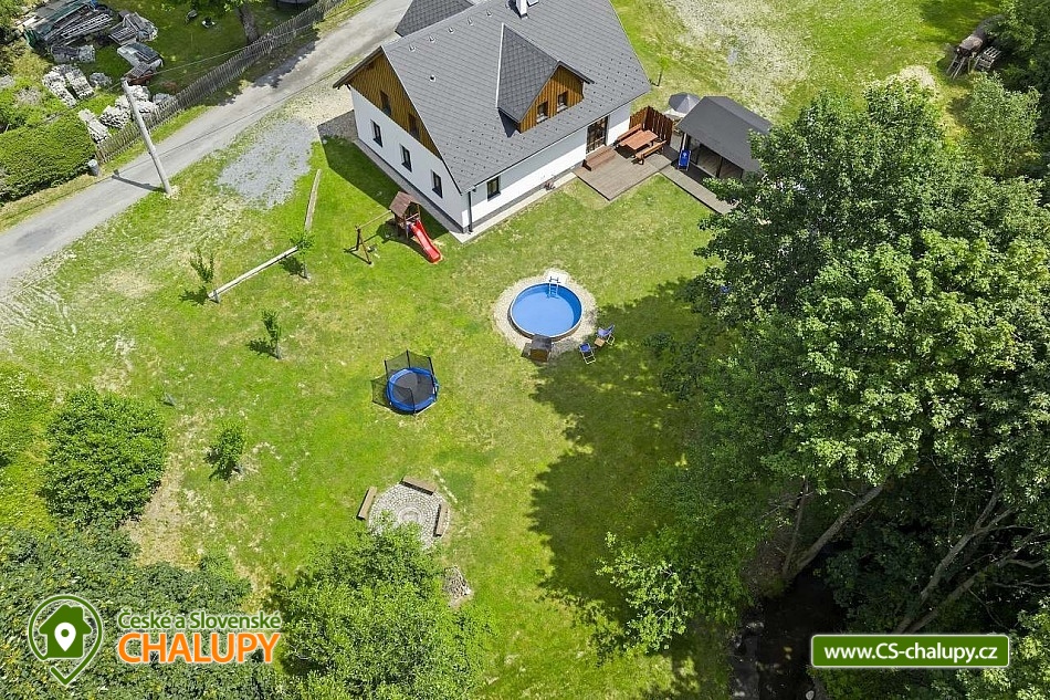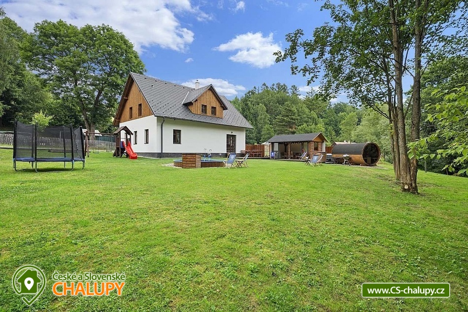 Wellness cottage with a swimming pool and tiled stove is located in the Jeseníky Protected Area near the Karlov area, the village of Dolní Moravice. The cottage can accommodate up to 12 people in 5 bedrooms. The cottage is surrounded by beautiful nature with clean mountain air and offers above-standard accommodation. The Moravice stream flows through the property, which complements the magical atmosphere of the place. There is a hot tub (for up to 5 people) and a panoramic wooden sauna with a view of nature. To cool down, there is a cooling barrel or a pool in the Moravice stream. DESCRIPTION - Ground floor: hallway, common room with tiled stove and kitchen (lying behind the stove), ski room with shoe dryers for 12 pairs, room no. 1 with a double bed, bathroom with shower and toilet, separate toilet. Floor: room no. 2 with double bed, room no. 3 with double bed, bathroom with shower and toilet, room no. 4 with double bed and single bed, room no. 5 with double bed and single bed, bathroom with shower and toilet. The property has: 3 x bathroom with shower and 4 x toilet. The common room with kitchen and seating area is generously sized for a larger number of people. The kitchen is fully equipped with appliances (hob, oven, microwave, dishwasher, refrigerator, freezer, kettle, automatic coffee maker). Heating is provided by a tiled stove and underfloor heating. In the garden there are children's climbing frames, a summer pool and a covered seating area. Parking on the property by the cottage. Surroundings: The cycle path runs directly around the cottage and you can reach all interesting places in the Jeseníky Mountains. Downhill enthusiasts can reach the Bikepark Kopřivná in about 20 minutes by bike. In Karlov pod Pradědem you will also find an in-line track. In winter, the main attraction are the ski resorts: SKi Aréna Karlov 4 km, Ski Čerťák 4 km, Ski Kopřivná 6 km. There are cross-country skiing trails near the cottage, from which you can reach the entire Jeseníky Mountains. We look forward to seeing you there.