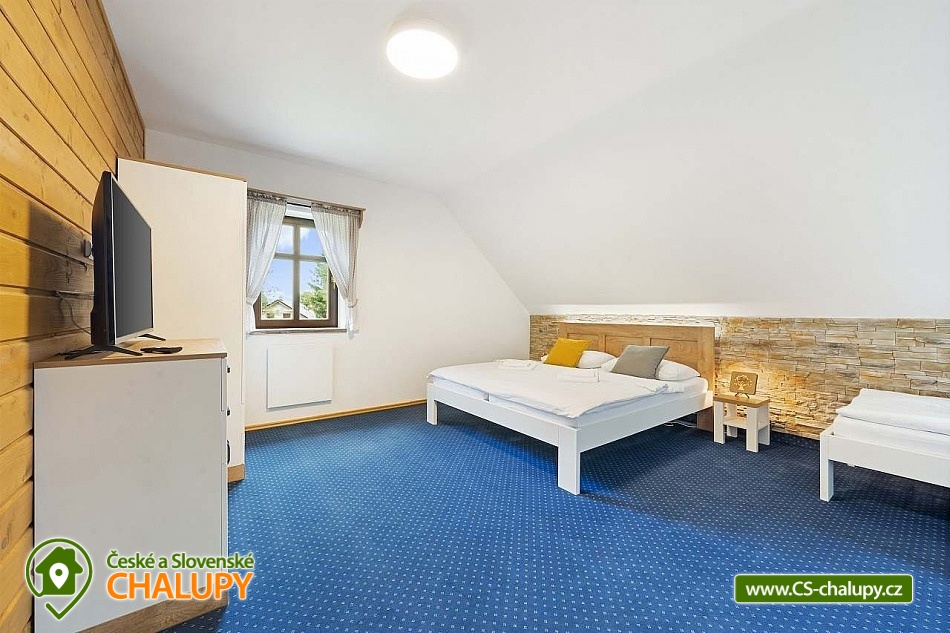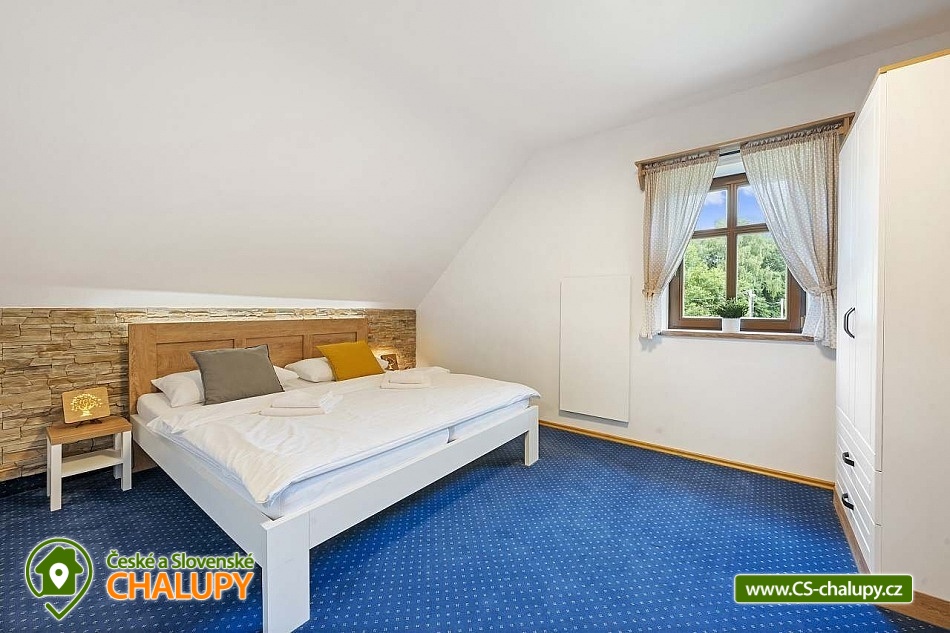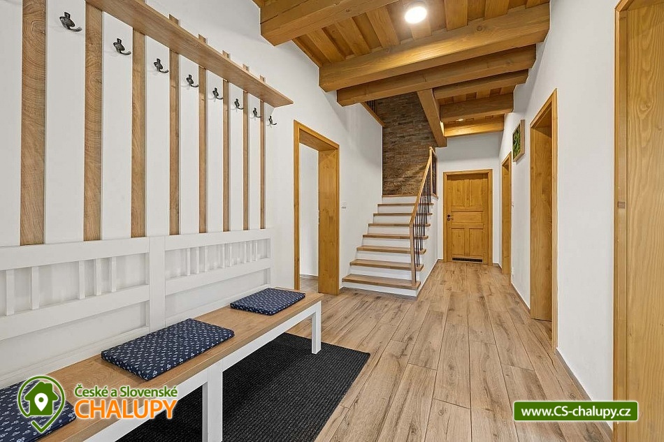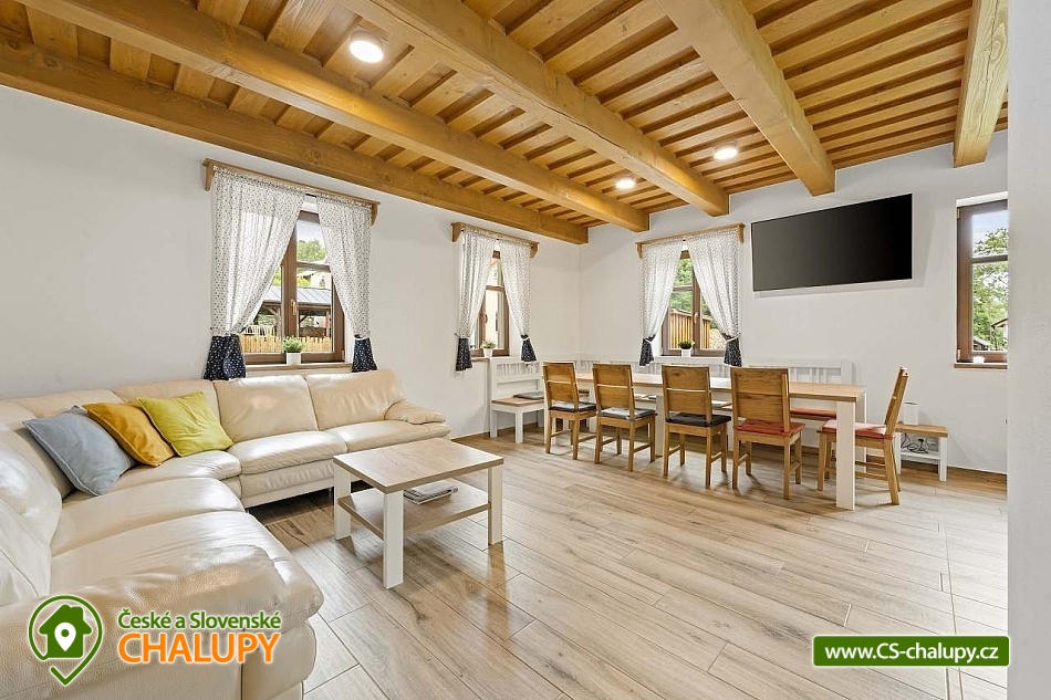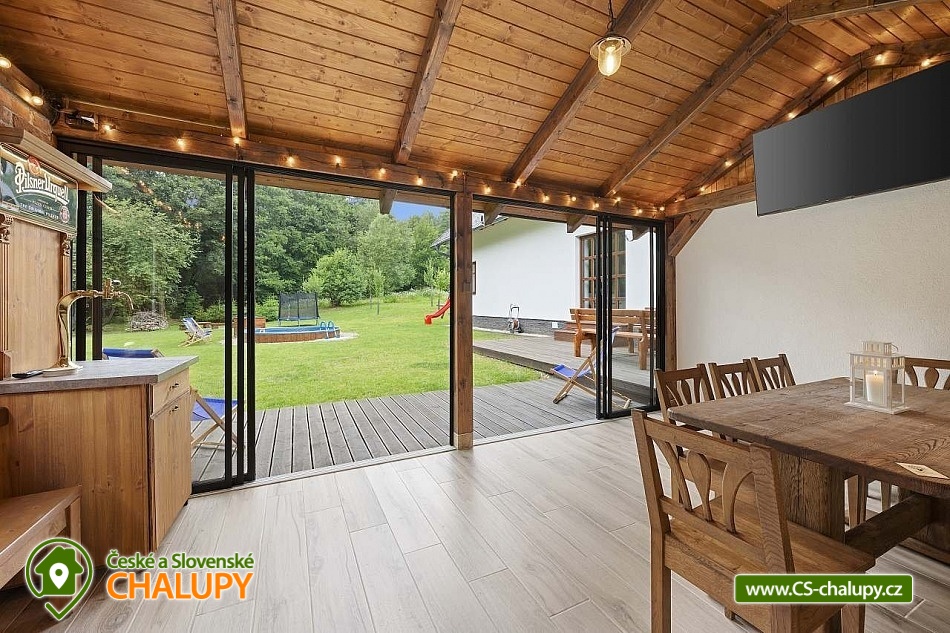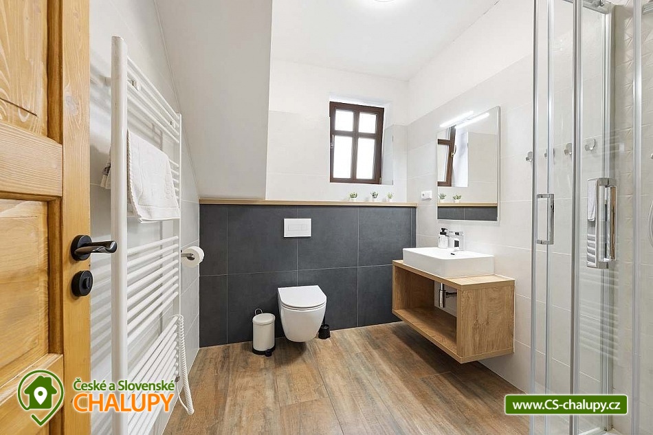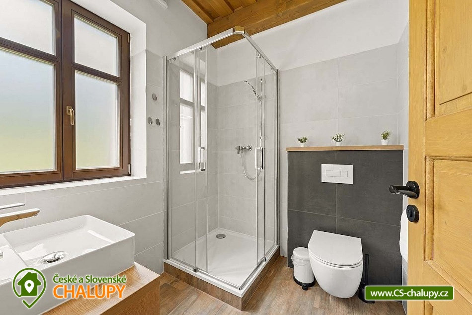 Wellness cottage with a swimming pool and tiled stove is located in the Jeseníky Protected Area near the Karlov area, the village of Dolní Moravice. The cottage can accommodate up to 12 people in 5 bedrooms. The cottage is surrounded by beautiful nature with clean mountain air and offers above-standard accommodation. The Moravice stream flows through the property, which complements the magical atmosphere of the place. There is a hot tub (for up to 5 people) and a panoramic wooden sauna with a view of nature. To cool down, there is a cooling barrel or a pool in the Moravice stream. DESCRIPTION - Ground floor: hallway, common room with tiled stove and kitchen (lying behind the stove), ski room with shoe dryers for 12 pairs, room no. 1 with a double bed, bathroom with shower and toilet, separate toilet. Floor: room no. 2 with double bed, room no. 3 with double bed, bathroom with shower and toilet, room no. 4 with double bed and single bed, room no. 5 with double bed and single bed, bathroom with shower and toilet. The property has: 3 x bathroom with shower and 4 x toilet. The common room with kitchen and seating area is generously sized for a larger number of people. The kitchen is fully equipped with appliances (hob, oven, microwave, dishwasher, refrigerator, freezer, kettle, automatic coffee maker). Heating is provided by a tiled stove and underfloor heating. In the garden there are children's climbing frames, a summer pool and a covered seating area. Parking on the property by the cottage. Surroundings: The cycle path runs directly around the cottage and you can reach all interesting places in the Jeseníky Mountains. Downhill enthusiasts can reach the Bikepark Kopřivná in about 20 minutes by bike. In Karlov pod Pradědem you will also find an in-line track. In winter, the main attraction are the ski resorts: SKi Aréna Karlov 4 km, Ski Čerťák 4 km, Ski Kopřivná 6 km. There are cross-country skiing trails near the cottage, from which you can reach the entire Jeseníky Mountains. We look forward to seeing you there.
