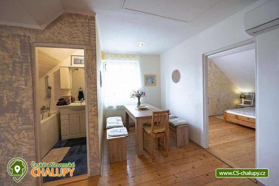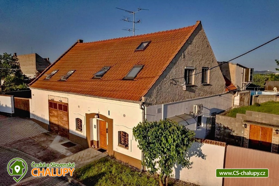 Cottage with wellness and two swimming pools (outdoor + indoor pool) in South Moravia - located near Pálava, the Novomlýnská reservoir and the city of Mikulov on the outskirts of the popular wine village of Březí in the Břeclav district - the region is known for its warm climate, vines and the beauty of the surrounding nature. The cottage for rent provides accommodation for up to 16 people in 6 bedrooms. We offer you cozy accommodation all year round - ideal for a larger group of friends, families, acquaintances or simply for those who like to enjoy comfort, well-being and relaxation DESCRIPTION: Large dining room connected to the kitchenette, living room with TV, board games, magazines and books. 2x bedroom with double bed, 3x room with double bed + single bed, separate toilet, bathroom with bathtub, bathroom with toilet and shower, terrace. When renting for more than 13 people, there is another apartment with its own bathroom, kitchenette with dining table, double bed + single bed, sofa and TV. Meals on your own or in a nearby restaurant - The kitchen is fully equipped (hotplate, hot air electric oven, kettle, fridge with freezer, glasses, dishes and cutlery, etc.). Other cottage equipment: air conditioning, outdoor grill, fireplace, outdoor pool from 15.6. to 15.9., year-round indoor pool heated to 33 degrees + sauna available. Bathroom facilities: Separate toilet, bathroom with bathtub + bathroom with toilet and shower. By the indoor wellness pool - bathroom with toilet and shower. Heating: Electric. Free parking in the enclosed garden right next to the house. The picturesque landscape around you will entice you to wander around the area, whether on the aforementioned bikes or on your own. There is no shortage of romantic walks, hiking, cycling trails, exploring attractions, monuments or sports activities. The National Nature Reserve Tabulová, Stolová hora, Turold Nature Reserve, Mikulov Castle, Na Turoldu Caves, Dietrichsteinská hrobka or Wake Merkur will be of interest. You will also experience pleasant moments at the Březí Swimming Pool, Mikulov, in Aqualand Moravia and at Křivý jezero. We look forward to seeing you there.