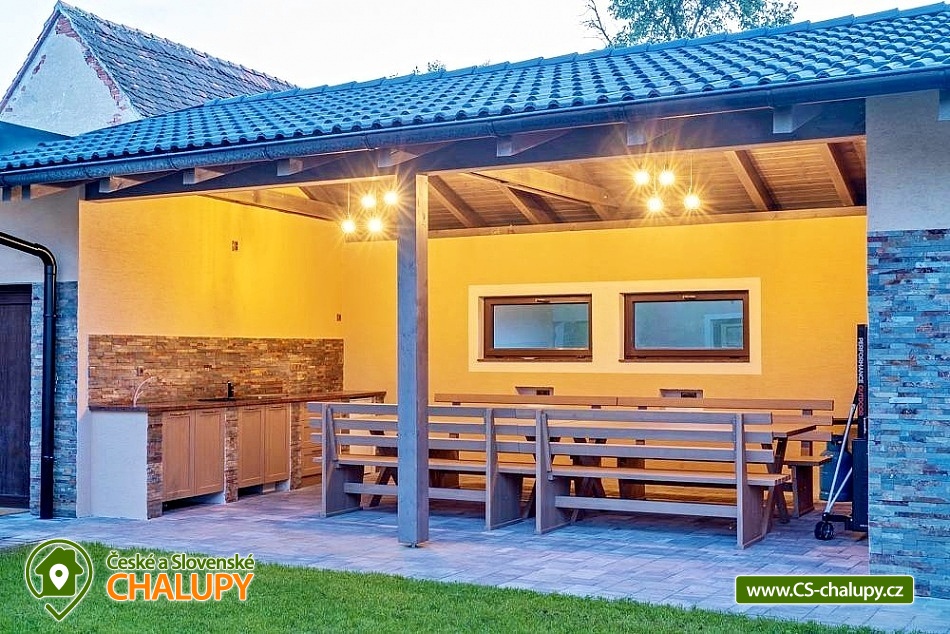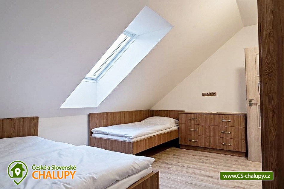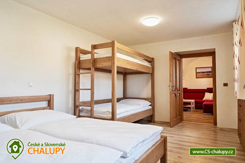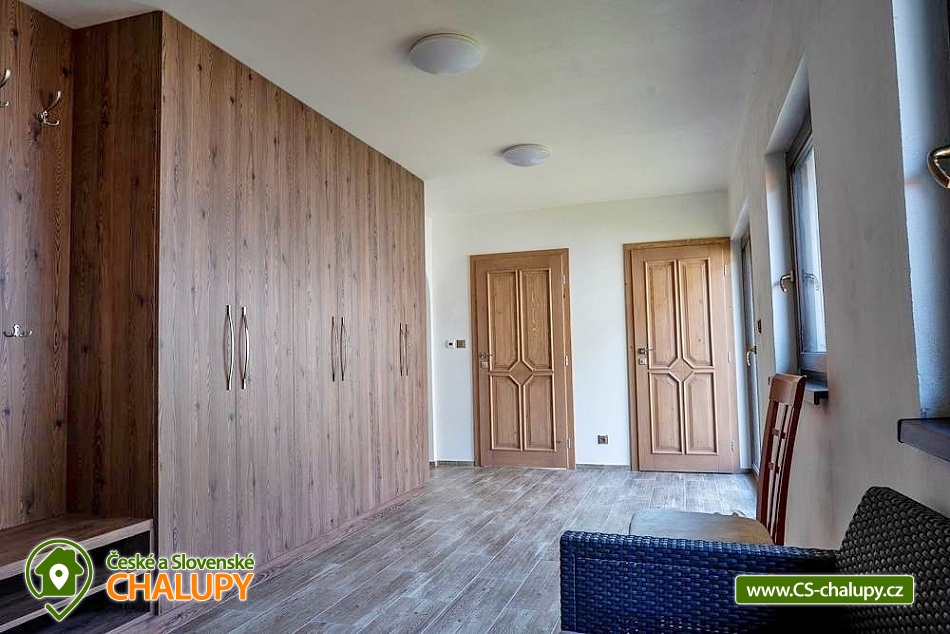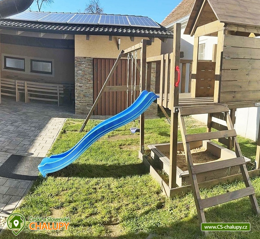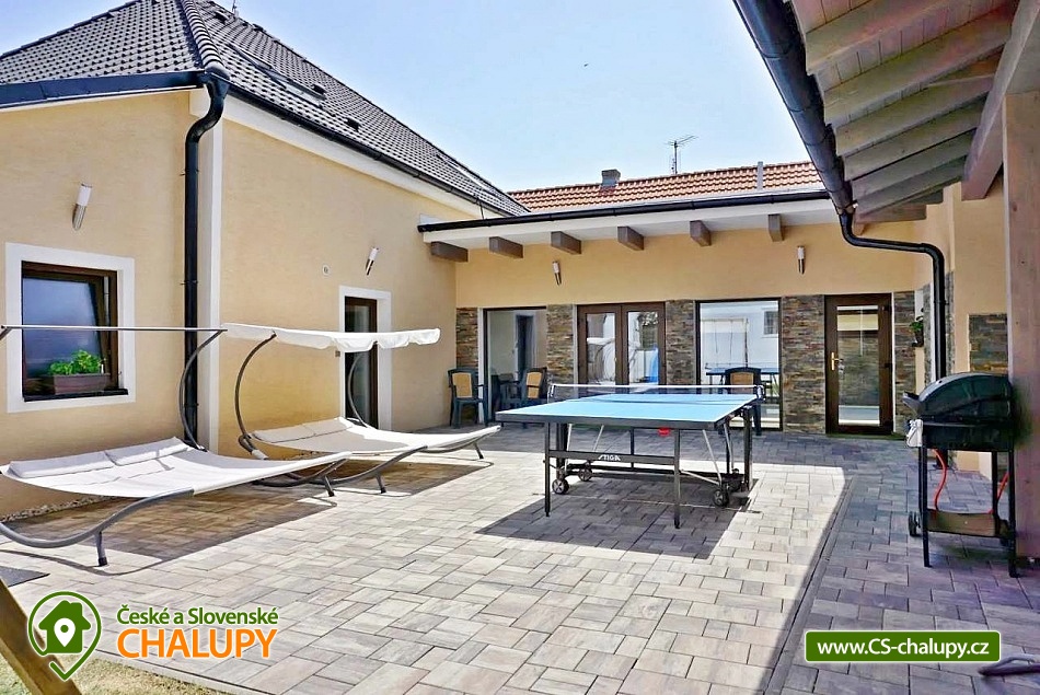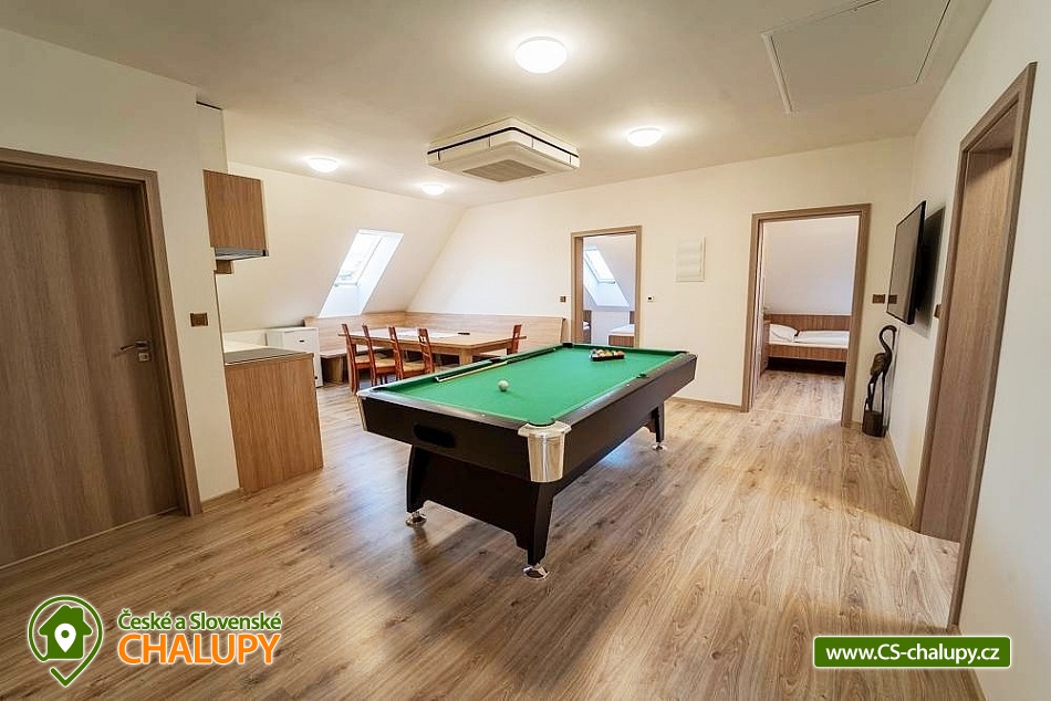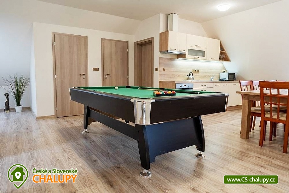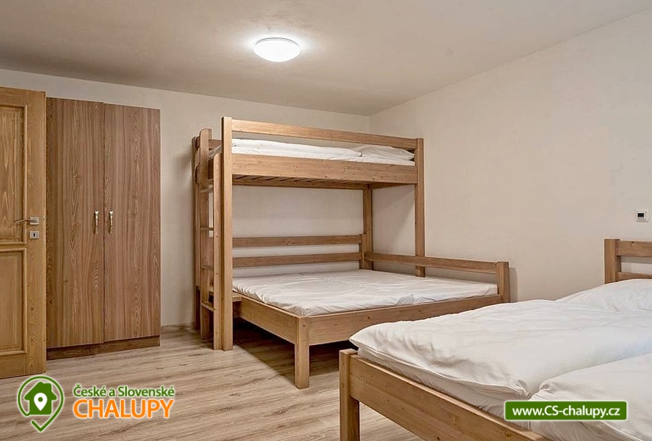 The modernly furnished cottage with wellness and indoor pool is located in the center of the picturesque village of Police in the Vysočina region and offers comfortable accommodation for 18 people in 5 bedrooms. The cottage is an ideal place for family holidays and quiet recreational stays, but is not intended for organizing large celebrations. You can look forward to a year-round heated saltwater pool and a Finnish sauna for perfect relaxation. On the ground floor there are two cozy bedrooms, one with 4 beds (1 double bed and 1 bunk bed) and the other with 5 beds (2 double beds and 1 bunk bed for 1 person). Upstairs there are three separate 3-bed bedrooms (1 double bed and 1 single bed). On the ground floor there is a spacious living room with a sofa bed, coffee table and SMART TV for social moments. A children's corner and a dining area are loosely connected to the living room. In the next room you will find a fully equipped kitchen (induction hob, electric oven, two fridges with freezer compartments, dishwasher, microwave, kettle and dishes). The sanitary facilities include a bathroom with a shower, washing machine, dryer, two sinks and a separate toilet. The ground floor also includes a wellness area with a year-round indoor heated saltwater pool (8 × 3 × 1.6 m), a Finnish sauna for 6 people (with Bluetooth for listening to music), shower, sink and separate toilet. There is also a small relaxation area for moments of relaxation. Upstairs there is a spacious equipped kitchen (hob, electric oven, fridge, dishwasher, microwave, kettle and dishes) with a dining area, SMART TV and billiards. The sanitary facilities include a bathroom with a bathtub, two sinks and a separate toilet. Heating is provided by electric underfloor heating, in the upper common room there is the possibility of heating with air conditioning and in the bathrooms there is an electric heating ladder. Free WiFi internet connection is available throughout the property (strong WiFi, 2x transmitter). The cottage is surrounded by a fenced garden with a partially grassed area. You can spend your free time in a cozy roofed pergola with seating and a garden kitchen, which is equipped with a refrigerator, water supply, tap equipment, beer cooler and grill. You can relax on two large garden loungers with a roof. There is an outdoor ping-pong table and darts. The little ones will appreciate the children's playground with a sandbox, slide and swings. A small garage is used for storing bicycles. Parking is available directly at the property. Hiking, cycling, swimming, mushroom picking and fishing are possible in the area around the cottage. Nearby are tennis courts, a riding stable and a playground. Swimming options include: Bítovská zátoka, Biotope Jemnice, Nimpšov swimming pool, Hrachovec pond, Dolní Modletický pond, Vranovská dam, Plichťák dam, Moravské Budějovice swimming pool, etc. Trips in the surrounding area are attractive: Police Castle, Jemnice with a beautiful square, the historic town of Telč, Stanovice, Valtínov lookout tower located in Czech Canada, Bítov Zoo, Vranovská dam or Podyjí NP. Staying at the cottage is also attractive in winter, when a traditional Christmas Eve sheep parade takes place in Police, in which people ring bells, sing carols and then punch, svařák and tea are poured by the Christmas tree on the square. We look forward to seeing you.