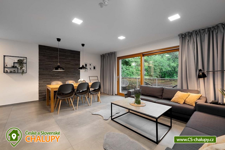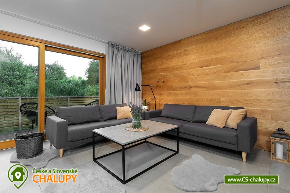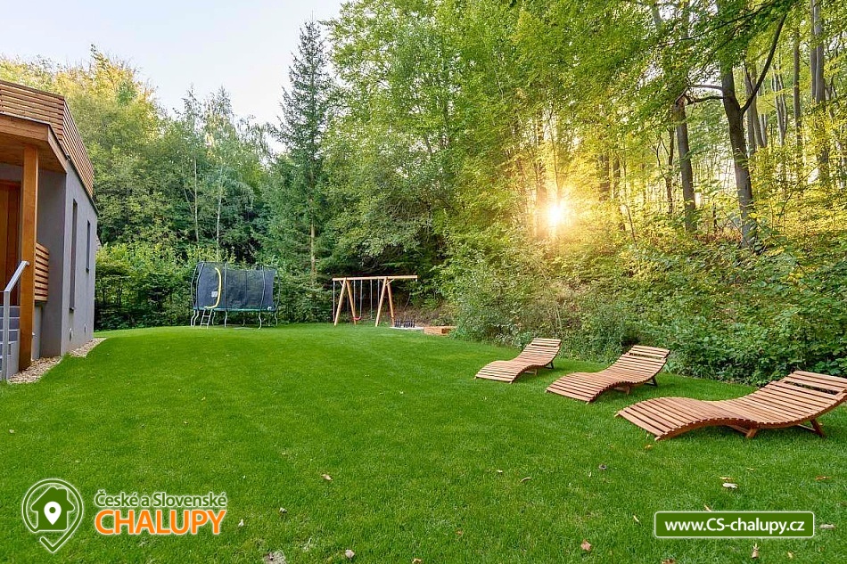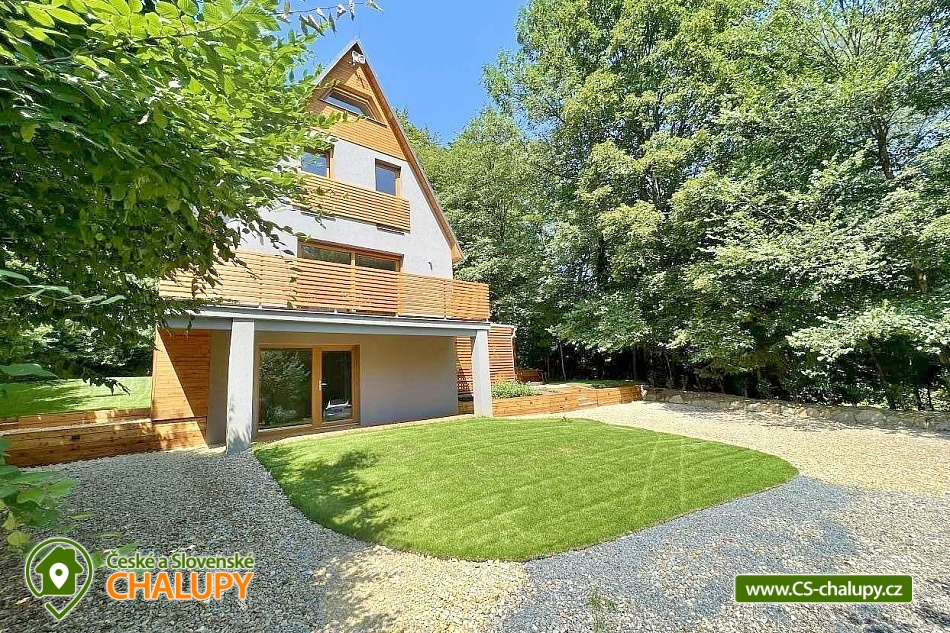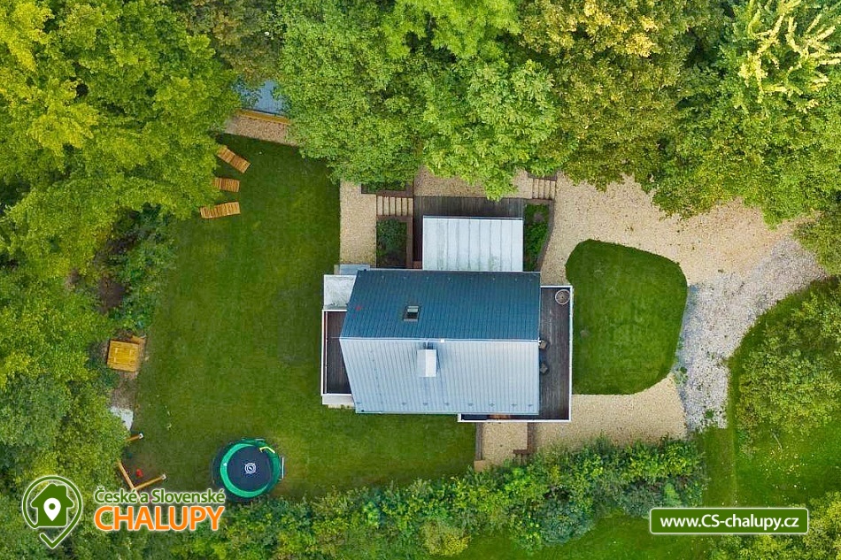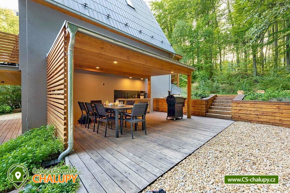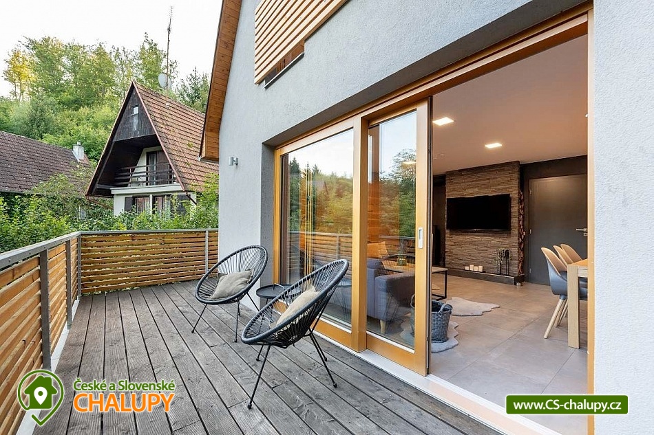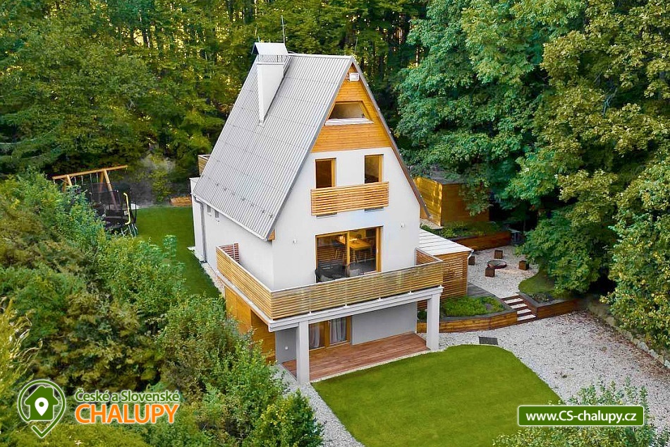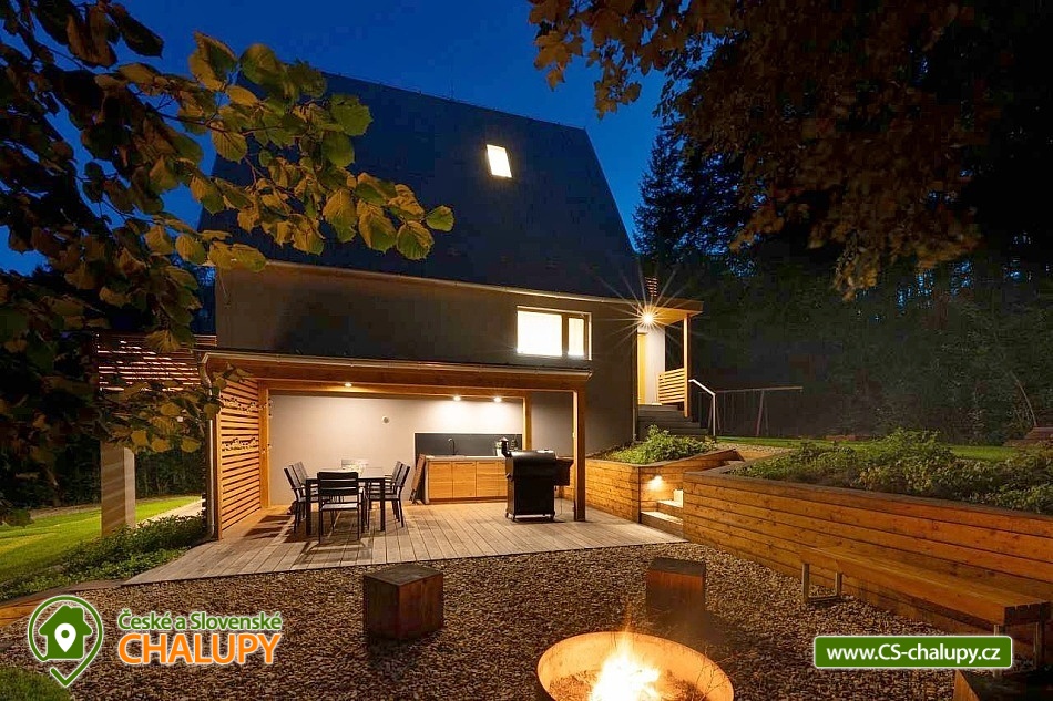 Wellness Chalet Moel, surrounded by a forest, is located near the village of Březová in the beautiful nature of the White Karpaty Protected Area, semi-secluded by a stream and near two ponds. You can look forward to modern equipment with the ability to control many functions of the house via mobile using the Loxone smart home system, as well as relaxing in the Finnish sauna or hot tub or relaxing on a deckchair in the garden. The luxuriously furnished Chata Moel offers accommodation for 9 people, a total of 8 fixed beds are available in four double bedrooms and one extra bed with a sofa bed. The first three bedrooms are located on the second floor - bedroom No. 1 (double bed), bedroom No. 2 (two single beds), bedroom No. 3 (two single beds and a terrace with a view of the forest). Bedroom No. 4 (double bed) is located in the attic. On the ground floor in the clubhouse there is a sofa bed with a 120 cm wide mattress (suitable for one adult or two children). Shared moments can be spent in the living room located upstairs. The room includes a fireplace stove, a sofa set, a dining table, a large-screen smart TV with Netflix and the possibility of mirroring from a laptop/phone and an Apple HomePod Mini. Guests have the option to control lights, heating, water heating and other functions using a mobile app or a tablet in the living room. WIFI internet connection is available throughout the building. Adjacent to the living room is a fully equipped kitchen (refrigerator - 1x main fridge and 1x smaller fridge in the bar on the ground floor, microwave, oven, Dolce Gusto coffee machine - capsules available free of charge, induction hob and toaster). From the living room you can also enter a spacious outdoor terrace with seating and a view of the surrounding nature. Moments of relaxation await you on the ground floor in the wellness area, there is a Finnish sauna and a whirlpool for 4 people. You can relax in the clubhouse on a spacious sofa by the fireplace. The social facilities include one separate toilet on the ground floor and a shower in the wellness area. On the first floor, there is a main bathroom with a spacious shower and a separate toilet. A hairdryer is available. Heating is provided by fireplaces located in the clubhouse on the ground floor and in the living room, as well as floor heating in the wellness area, bathroom and WC, as well as electric direct heaters in all rooms. A grassy garden stretches around the cottage. Part of the outdoor space is a pergola with an outdoor kitchen, seating for 8 people, and an automatic wood pellet grill. There is a fireplace. In the evening, the garden is pleasantly illuminated and thanks to this you can enjoy your time together even after dark. Children can look forward to the trampoline, swings and sandpit. Outdoor skittles are also available. And you can lie on the grass on a wooden deckchair. From the garden, a path leads directly into the beech forest, where it is possible to connect to local hiking trails. You can park directly at the building. There are 5 parking spaces available. In the surroundings of the cottage, hiking, cycling, swimming, mushroom picking, fishing and skiing are possible. Swimming options include, for example: Zelená voda lake, Nivnická Riviera swimming pool, Starý Hrozenkov swimming pool, Uherský Brod - Delfín water park, Uherský brod swimming pool, Bojkovice swimming pool, etc. There is a small stream right next to the cottage, which is a great attraction especially for children. In winter, you can ski on Velké Lopeník or Velké Javorine. The Lookout on Velké Lopeník, the highest mountain of the White Carpathians - Velká Javořina 970 m.a.s.l., the Nový Světlov castle in Bojkovice, the Luhačovice spa, the Strážnice wine region, Uherský Brod, Uherské Hradiště or beyond the borders in Slovakia the towns of Trenčín or Trenčianské Teplice are alluring for trips in the area. We look forward to seeing you here.