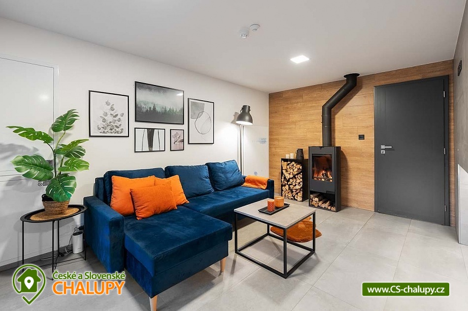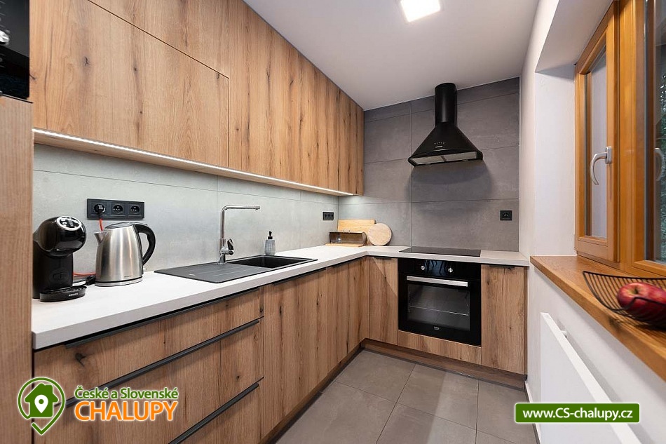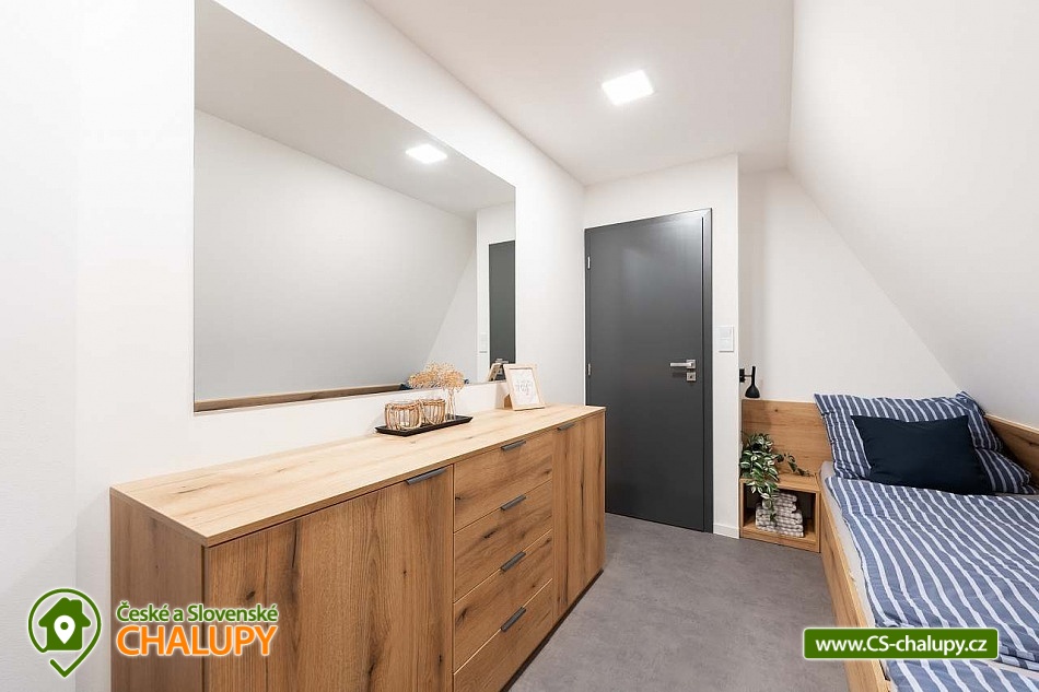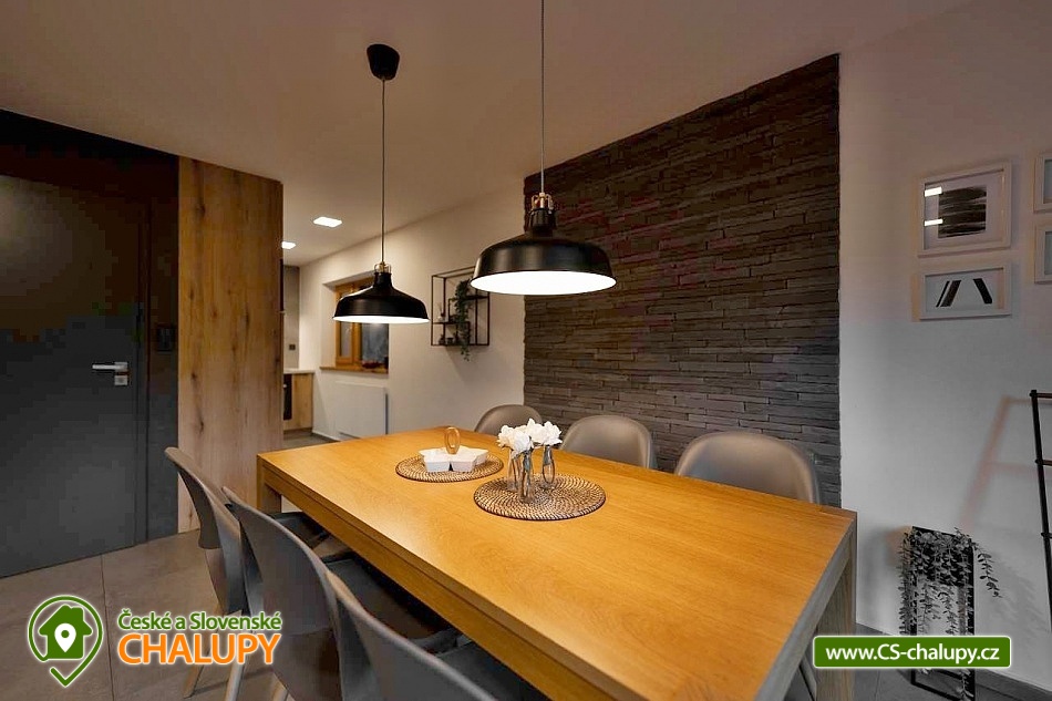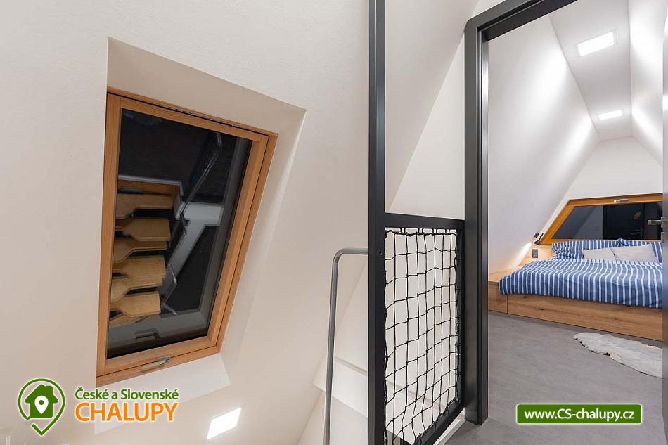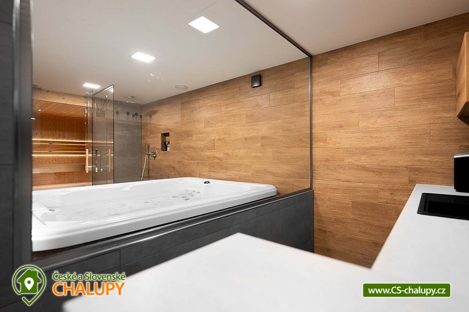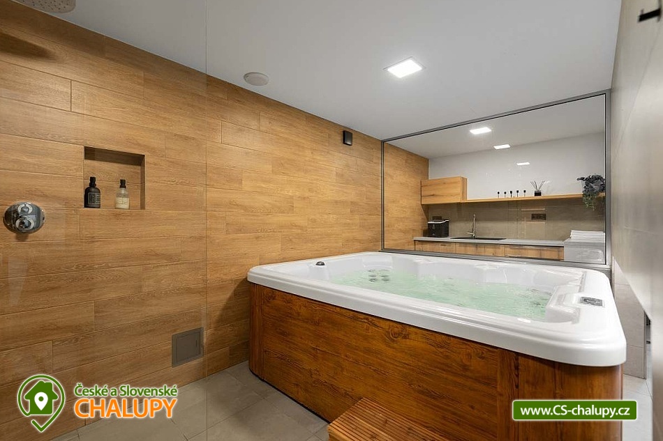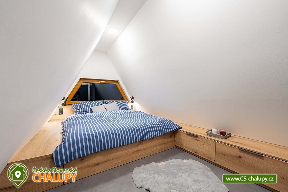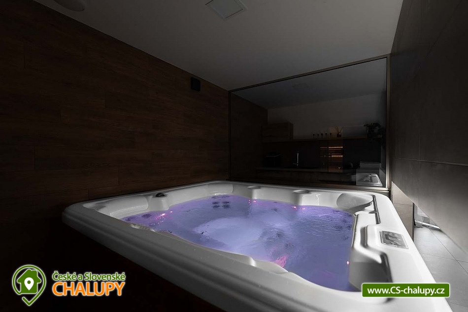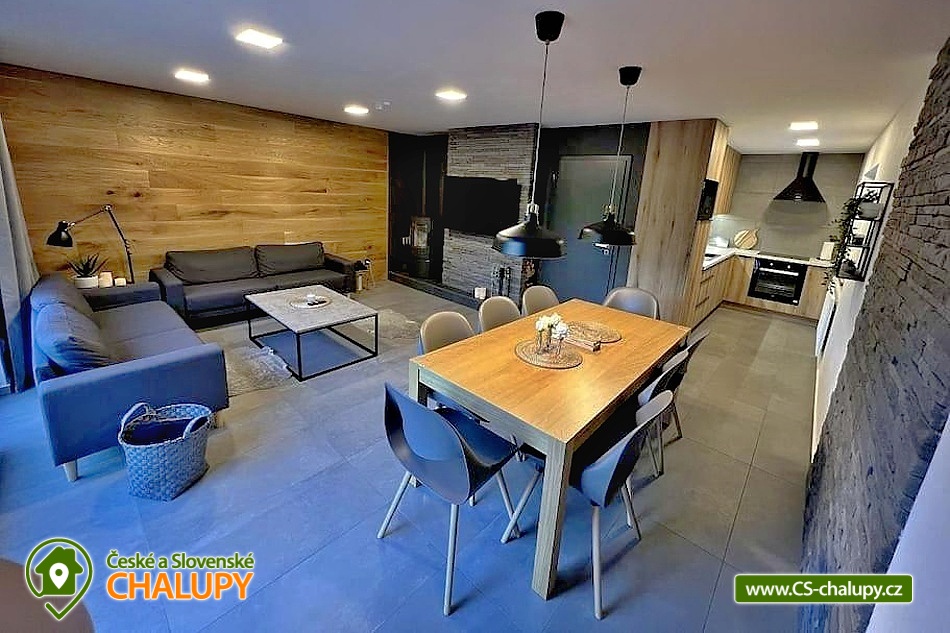 Wellness Chalet Moel, surrounded by a forest, is located near the village of Březová in the beautiful nature of the White Karpaty Protected Area, semi-secluded by a stream and near two ponds. You can look forward to modern equipment with the ability to control many functions of the house via mobile using the Loxone smart home system, as well as relaxing in the Finnish sauna or hot tub or relaxing on a deckchair in the garden. The luxuriously furnished Chata Moel offers accommodation for 9 people, a total of 8 fixed beds are available in four double bedrooms and one extra bed with a sofa bed. The first three bedrooms are located on the second floor - bedroom No. 1 (double bed), bedroom No. 2 (two single beds), bedroom No. 3 (two single beds and a terrace with a view of the forest). Bedroom No. 4 (double bed) is located in the attic. On the ground floor in the clubhouse there is a sofa bed with a 120 cm wide mattress (suitable for one adult or two children). Shared moments can be spent in the living room located upstairs. The room includes a fireplace stove, a sofa set, a dining table, a large-screen smart TV with Netflix and the possibility of mirroring from a laptop/phone and an Apple HomePod Mini. Guests have the option to control lights, heating, water heating and other functions using a mobile app or a tablet in the living room. WIFI internet connection is available throughout the building. Adjacent to the living room is a fully equipped kitchen (refrigerator - 1x main fridge and 1x smaller fridge in the bar on the ground floor, microwave, oven, Dolce Gusto coffee machine - capsules available free of charge, induction hob and toaster). From the living room you can also enter a spacious outdoor terrace with seating and a view of the surrounding nature. Moments of relaxation await you on the ground floor in the wellness area, there is a Finnish sauna and a whirlpool for 4 people. You can relax in the clubhouse on a spacious sofa by the fireplace. The social facilities include one separate toilet on the ground floor and a shower in the wellness area. On the first floor, there is a main bathroom with a spacious shower and a separate toilet. A hairdryer is available. Heating is provided by fireplaces located in the clubhouse on the ground floor and in the living room, as well as floor heating in the wellness area, bathroom and WC, as well as electric direct heaters in all rooms. A grassy garden stretches around the cottage. Part of the outdoor space is a pergola with an outdoor kitchen, seating for 8 people, and an automatic wood pellet grill. There is a fireplace. In the evening, the garden is pleasantly illuminated and thanks to this you can enjoy your time together even after dark. Children can look forward to the trampoline, swings and sandpit. Outdoor skittles are also available. And you can lie on the grass on a wooden deckchair. From the garden, a path leads directly into the beech forest, where it is possible to connect to local hiking trails. You can park directly at the building. There are 5 parking spaces available. In the surroundings of the cottage, hiking, cycling, swimming, mushroom picking, fishing and skiing are possible. Swimming options include, for example: Zelená voda lake, Nivnická Riviera swimming pool, Starý Hrozenkov swimming pool, Uherský Brod - Delfín water park, Uherský brod swimming pool, Bojkovice swimming pool, etc. There is a small stream right next to the cottage, which is a great attraction especially for children. In winter, you can ski on Velké Lopeník or Velké Javorine. The Lookout on Velké Lopeník, the highest mountain of the White Carpathians - Velká Javořina 970 m.a.s.l., the Nový Světlov castle in Bojkovice, the Luhačovice spa, the Strážnice wine region, Uherský Brod, Uherské Hradiště or beyond the borders in Slovakia the towns of Trenčín or Trenčianské Teplice are alluring for trips in the area. We look forward to seeing you here.