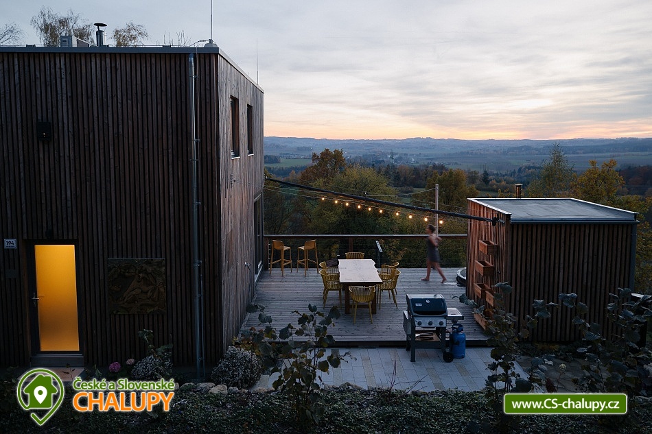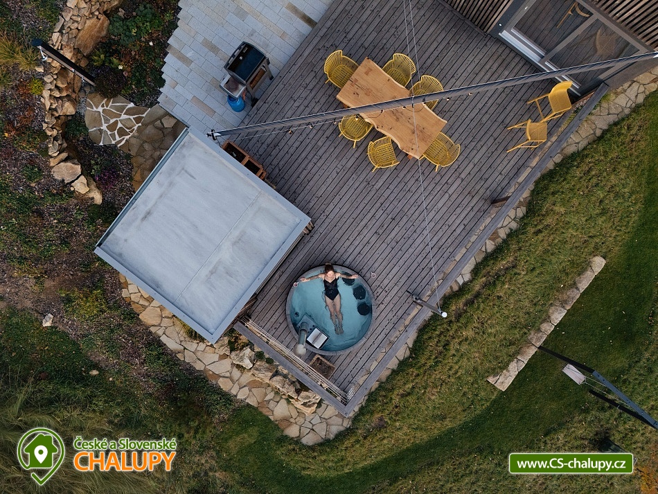 „Luxusní chata se saunou, hot tub a terasou s nádhernými výhledy.“